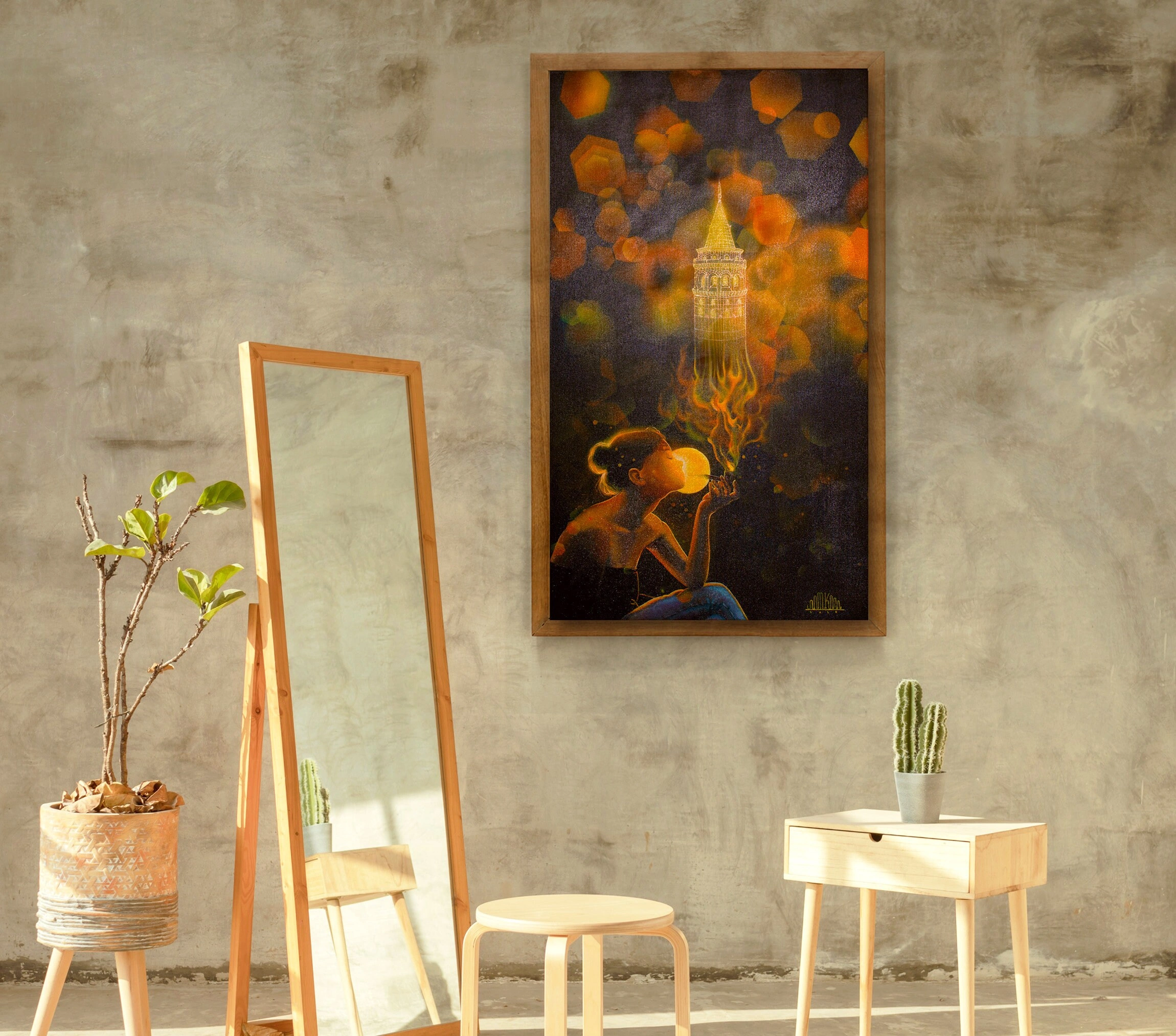 Galata Kulesi'ni merkeze alan İstanbul temalı kanvas tablo, şehre bir bakış atarken genç kız figürünün ardındaki muhteşem bir gün batımını yakalıyor. Galata Kulesi'nin turuncu ve koyu kahve tonlarının zıtlık yaratan dengesi, dingin bir atmosfer yaratıyor. Yağlı boya tablonun detayları, onu her eve sofistike bir hava getirecek eşsiz bir başyapıt haline getiriyor. Her iç ve dış tasarım unsuruna mükemmel bir şekilde uyacak bu tuval eser ambiyansınızda şıklık ararken aynı zamanda da biraz heyecan katmanın harika bir yolu. Galata İstanbul tablosunu duvarlarınızda sergilediğinizde evinize nasıl yeni bir güzellik ve zarafet getirdiğini hemen fark edeceksiniz. Sıra dışı tasarımıyla tüm sanatseverler için mükemmel bir ev hediyesi seçeneği bu eseri alın ve tüm odalarda keyfini sürün.
