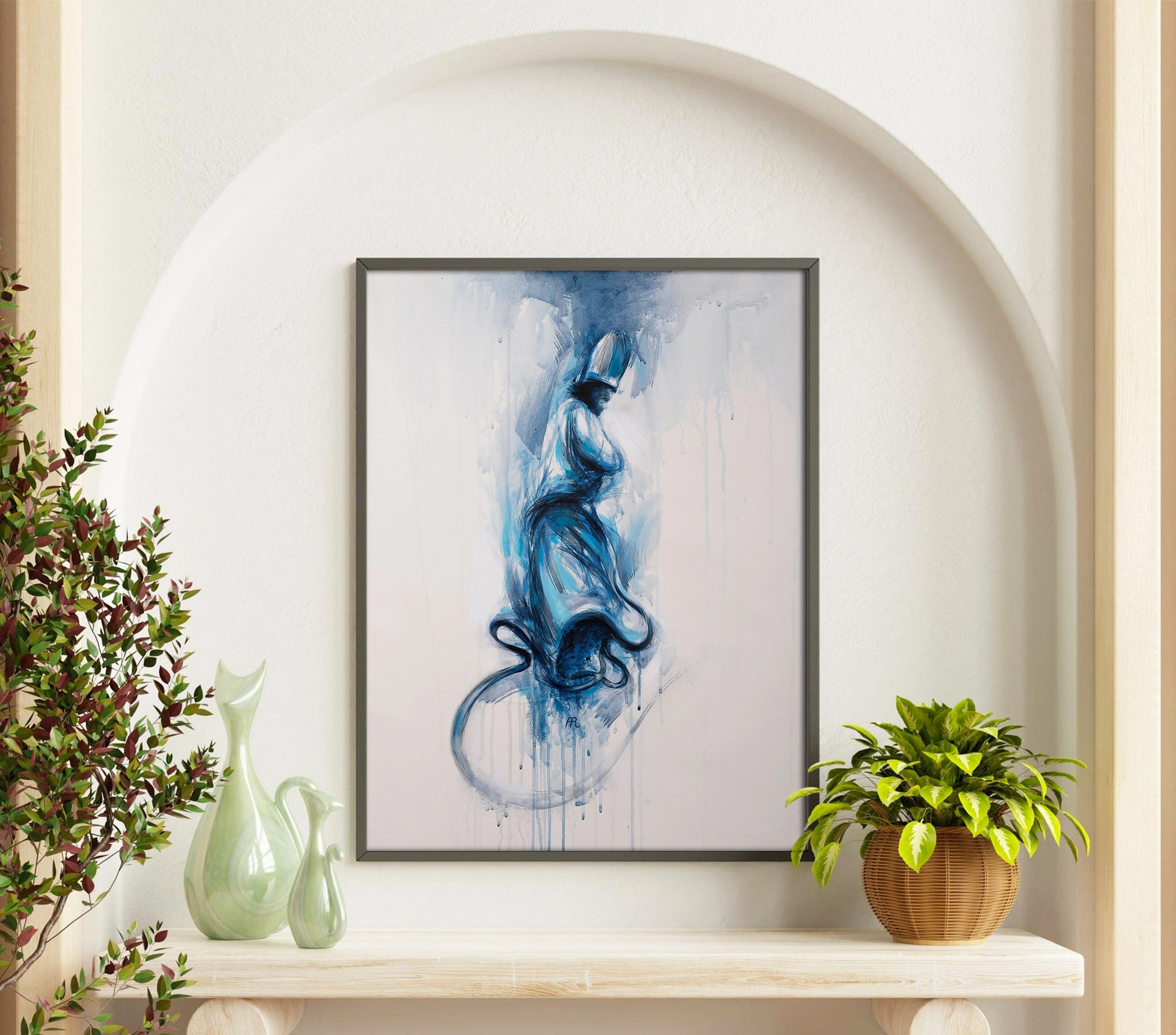 Duvarlarınızı canlandırmak için mükemmel bir sanat eseri arıyorsanız, bu soyut semazen portresi tam da arağınız eser olacak. Mavi ve beyaz tonlardaki çarpıcı semazen figürü adeta tuvalden fırlayarak yaşam alanlarınıza renk katacak. Bu göz alıcı tuval sanatı, Sufi maneviyatının tüm güzelliğini yakalıyor. Mavi İslam sanatı, bir derviş semazenin zarif yapısını dumanlı tam seçilemeyen bir figür olarak tasvir ediyor. Bu Sufi İslam sanatının her detayı, mavi dumanların girift gölgelemesinden, modern tasarıma kadar etkileyici görünüyor. Mavi soyut derviş portresi, duvarlarınıza dingin bir atmosfer katacak. Bu güzel semazen tablo, Sufizm ideolojisinin maneviyatını kutlamanın harika bir yoludur. Oturma odaları, salonlar, mutfaklar ve ofisler için idealdir. Eserin güzelliğine hayran kalırken, aynı zamanda manevi mesajının da tadını çıkarabilirsiniz. Bu semazen modern İslam sanatı, kesinlikle duvarlarınıza tazeleyici bir kültür dokunuşu katacak.
