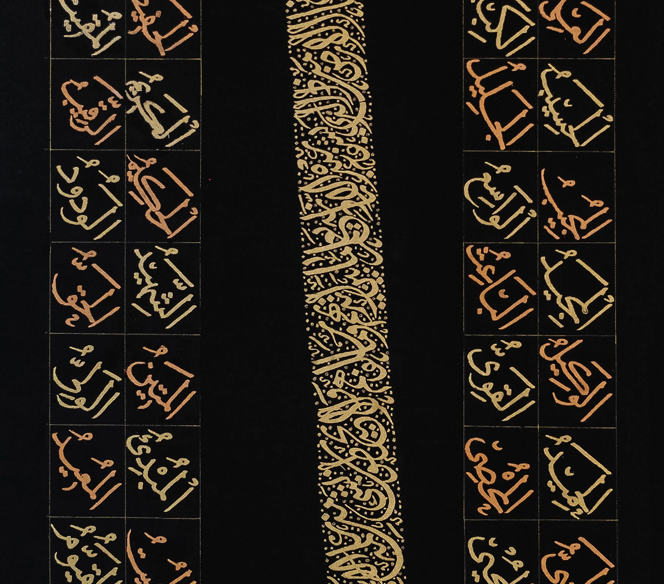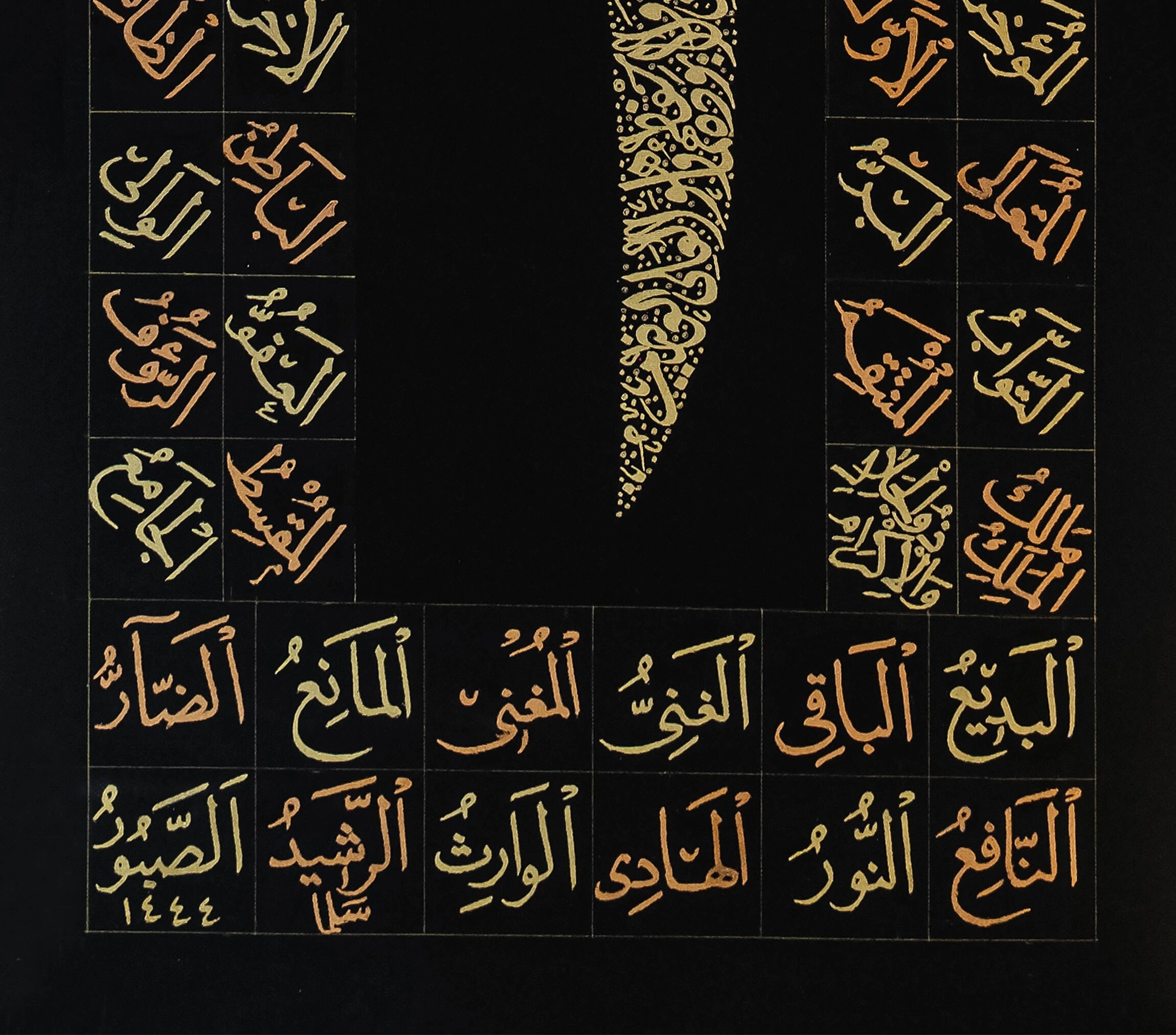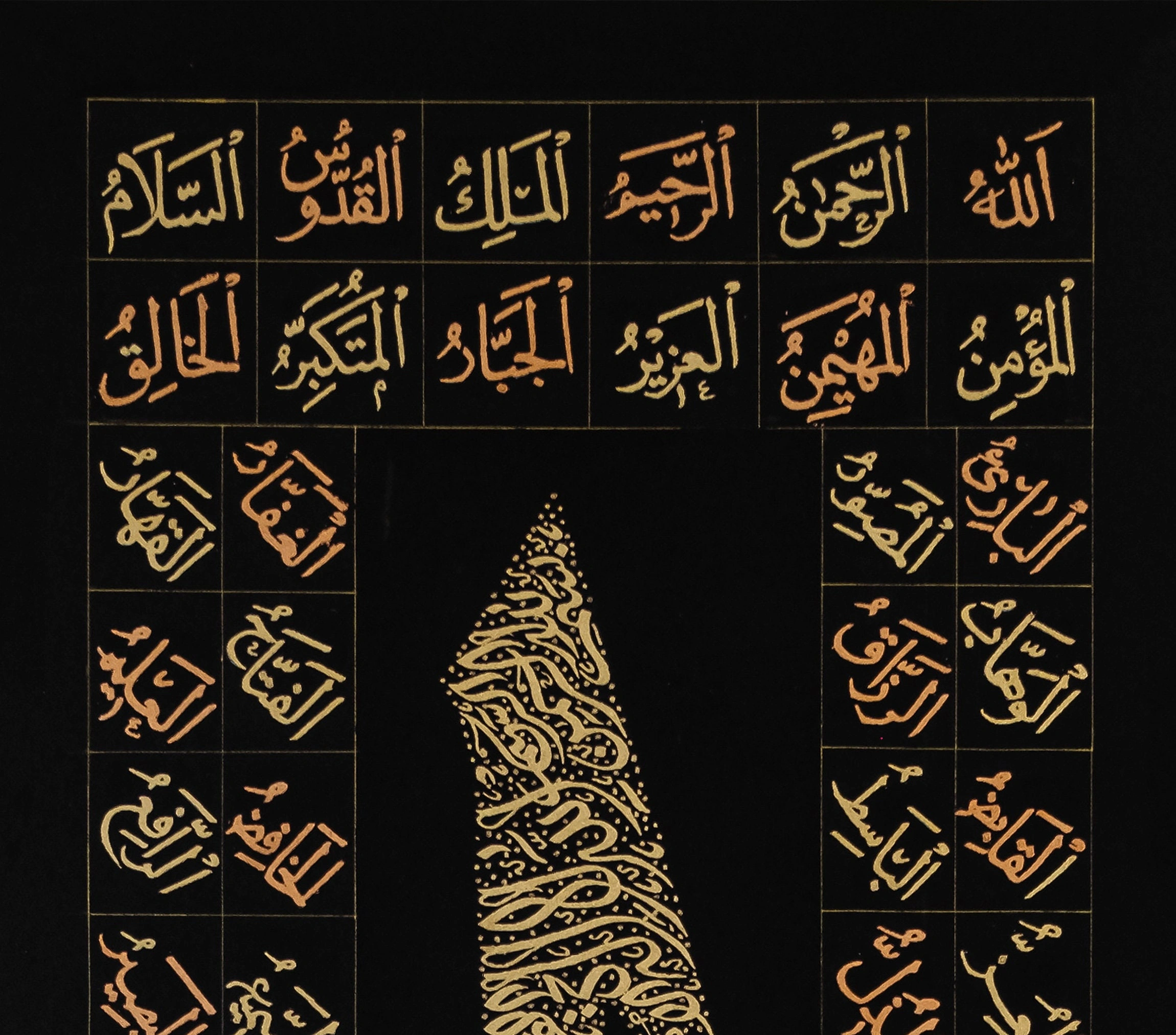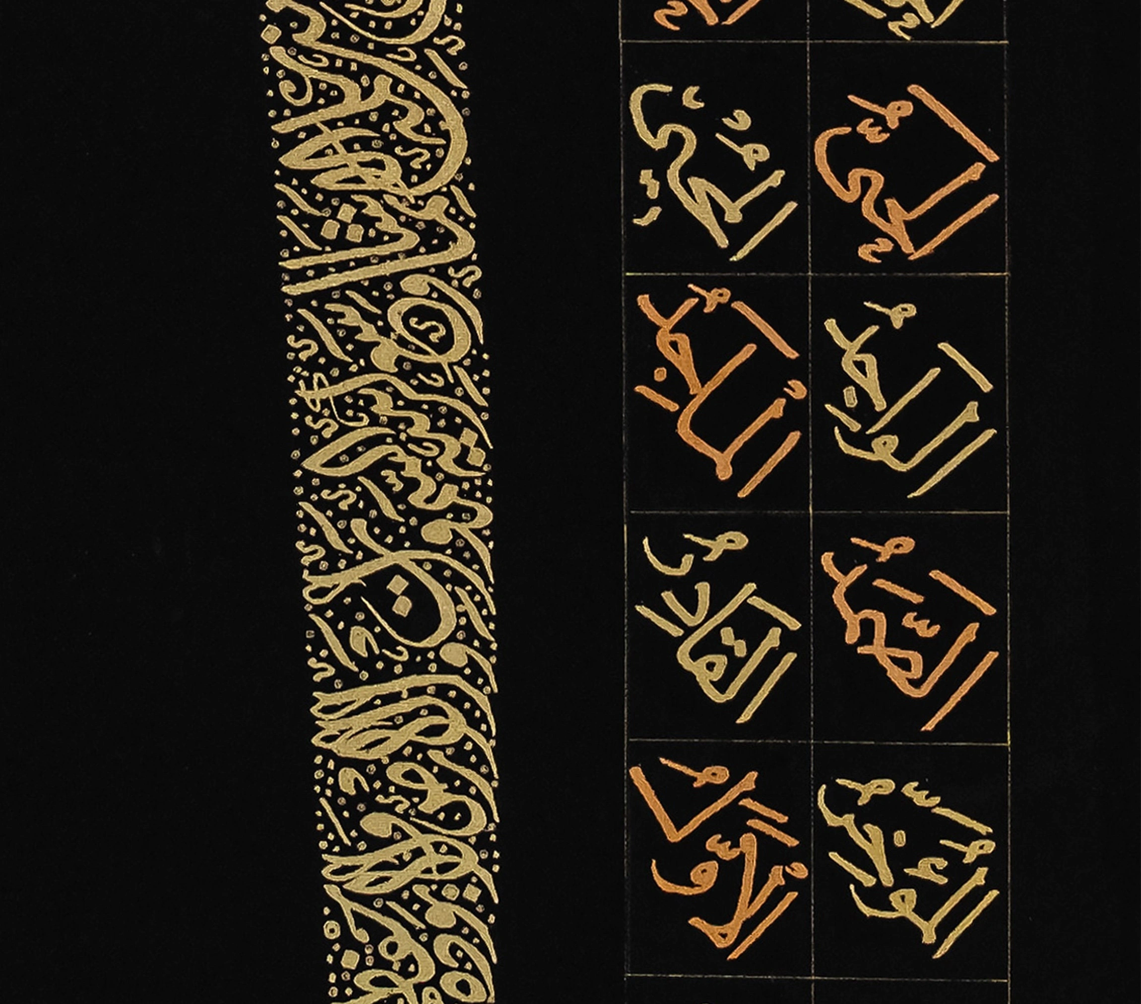 Tuval üzerine el yazması altın varak süslemeli Elif Ayetel Kürsi siyah kanvas tablo, evinizin harika görünmesini sağlamak ve her duvara zarif bir hava katmak için özenle üretilmiştir. Bu şık sanat eseri, hassasiyetle ve ayrıntılara gösterilen özenle tamamen elde yapılmış olup, her duvara modern bir dokunuş katacaktır. En kaliteli sanat malzemeleriyle yapılmış Elif Ayetel Kürsi İslami hat eserinde, siyah renkli tuval üzerine işlenen altın renkli Elif Ayetel Kürsi, duvarlarınıza hayat verecek ve her odayı daha güzel ve çekici hale getirecek.