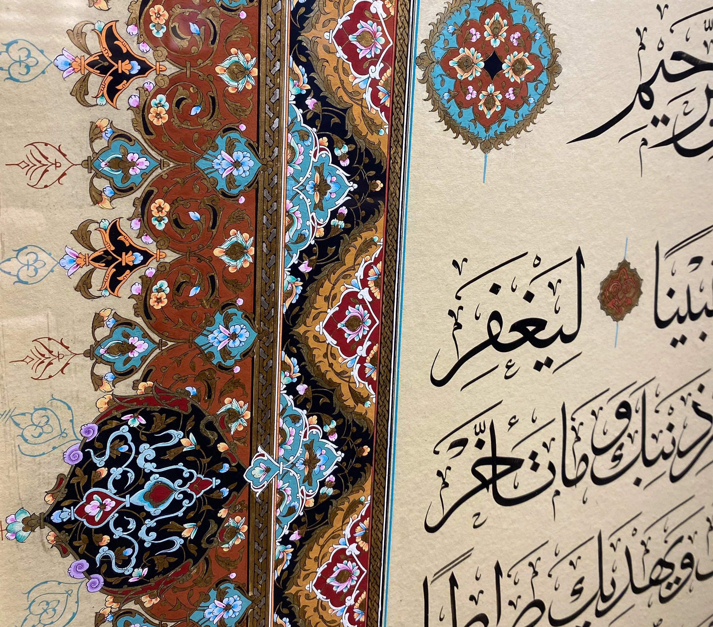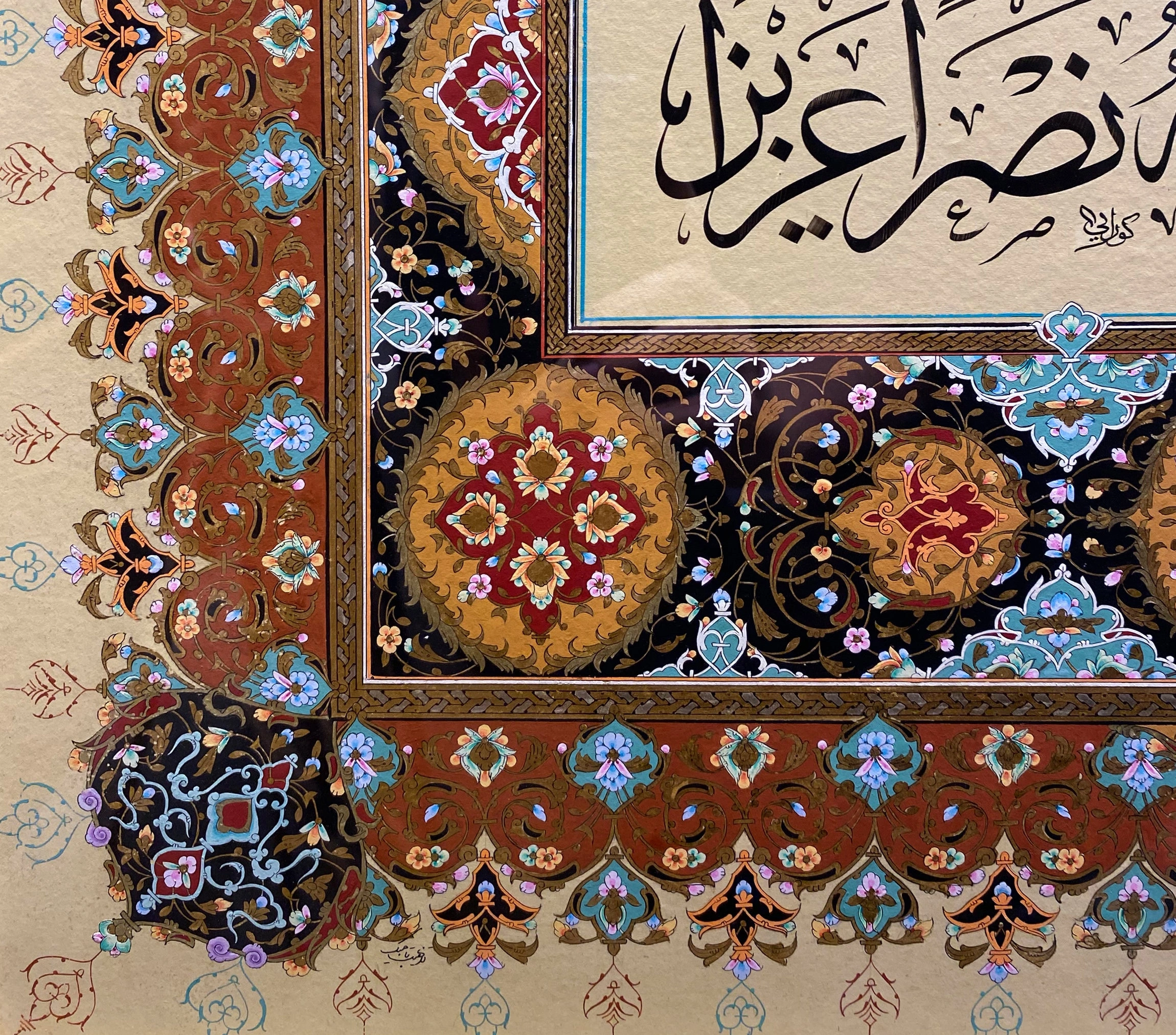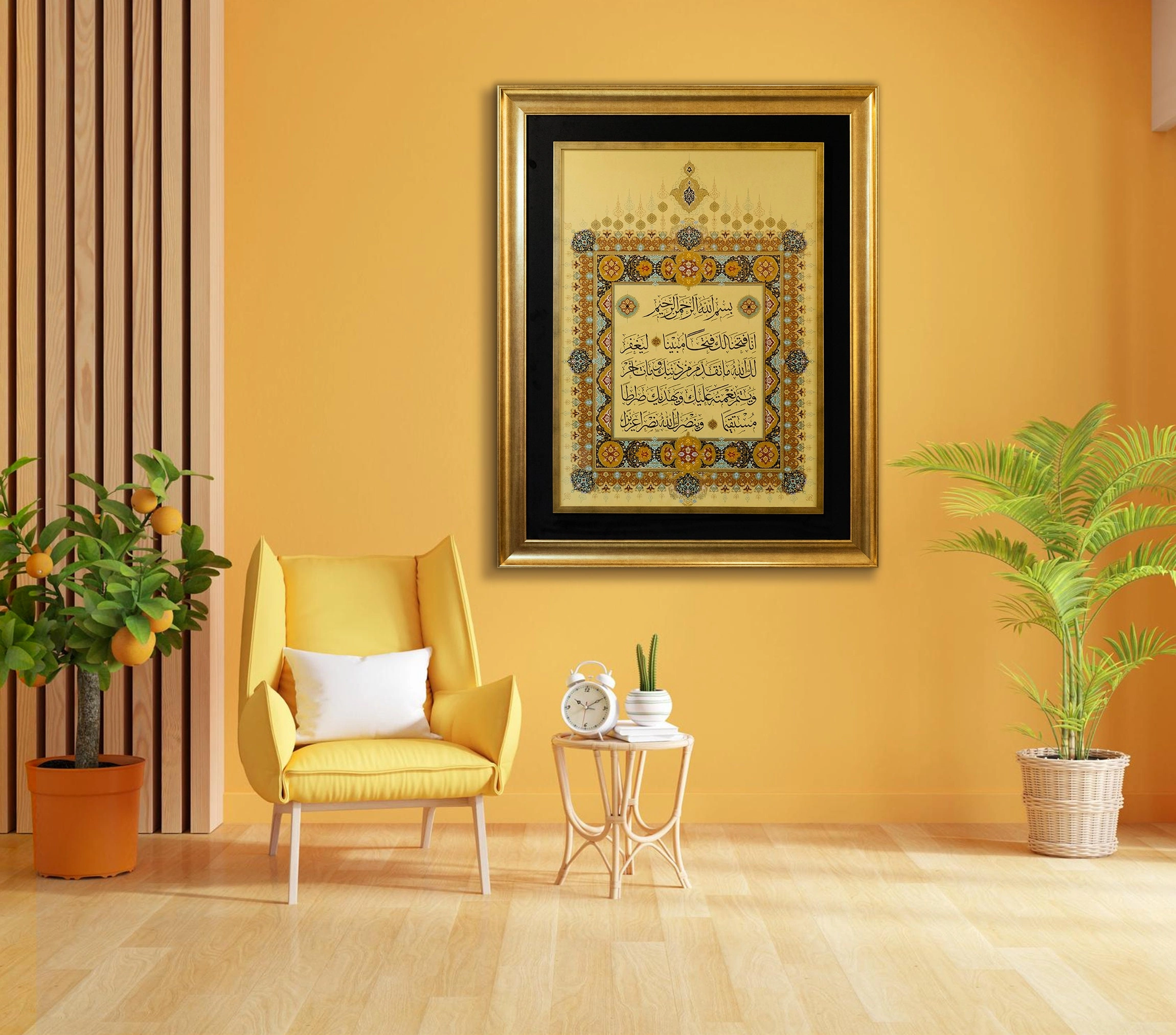 • El Yazması Fetih Suresi Lüks İslami Hat Tablo 24 Ayar Gerçek Altın Tezhip İşlemeli Çerçeveli Fetih Suresi İslami Hat Tablo