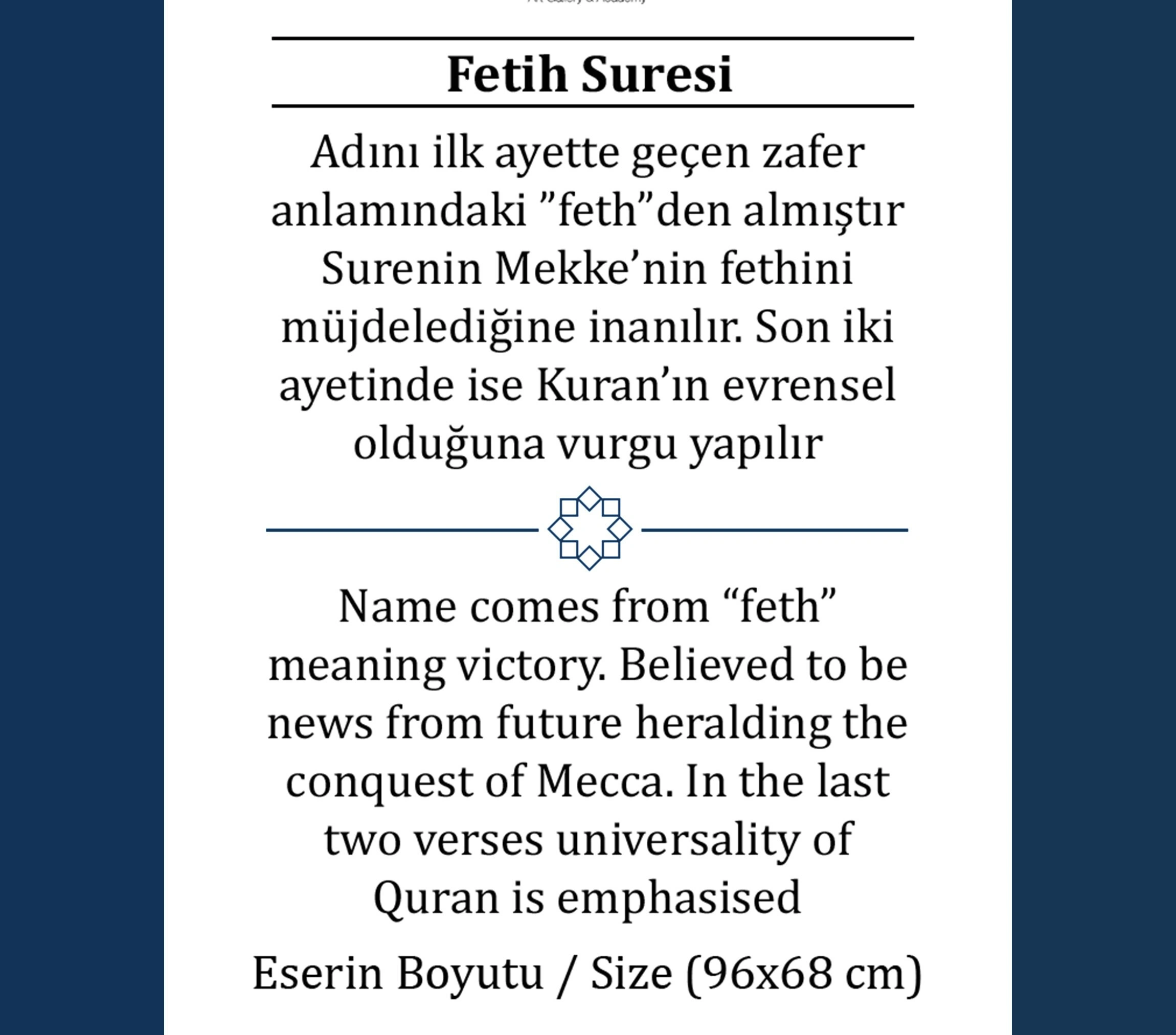 El Yazması Fetih Kürsi arka planındaki ustalıkla işlenen tezhip çalışmasında kullanılan gerçek altın süslemeleri ve altın rengiyle harika bir zıtlık yaratan siyah kadife dokusuyla, bu göz alıcı eser çerçeveli ve sergilenmeye hazır. Fetih Suresi tezhip ve hat eseri, evine güzellik ve maneviyat katmak isteyen herkes için mükemmel bir seçimdir. Dikkatle elde yazılmış ince ayrıntılara ve tasarıma, her misafirin hayran kalacağından emin olabilirsiniz. Kuran'ın ikinci suresinden gelen bu ayet, gerçekten İslam inancının güzelliğini ve gücünü özetliyor. Gösterişli çerçevesiyle ve dikkat çeken renkleriyle aldığınız an sergilemeye hazır olacak bu Fetih Suresi tablosu doğal kağıt üzerine elde yazılmıştır. Tasarımda kullanılan canlı ve her mekana uyum sağlayacak renkler güçlü bir enerji oluşturuyor. Kusursuz ayrıntıları bakan herkesi büyüleyen büyüleyici bir atmosfer yaratıyor. Bu enfes sanat eseri, biri yapımında gerçek altın kullanılan tezhip işlemi, diğeri ise kaligrafi sanatı için iki yetenekli zanaatkar tarafından 6 ayda el işçiliği ile yapılmıştır. Bu el yapımı cam çerçeveli İslami duvar sanatını diğerlerinden ayıran, el yapımı olmasına rağmen neredeyse kusursuz ve çarpıcı tasarımıdır. Fetih Suresi tezhip süslemeli hat sanatı, iç ya da dış mekan dekorasyonunuzu güzelleştirirken manevi yönünüzü de göstermenin harika bir yoludur. Evinize anlamlı ve güçlü bir sanat eseri getirmek için bu harika fırsatı kaçırmayın.