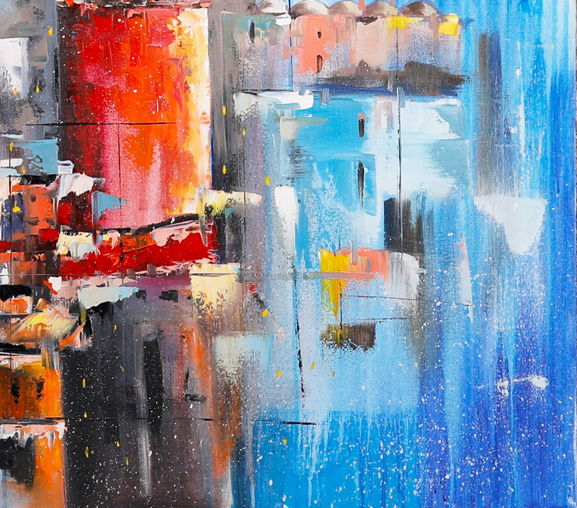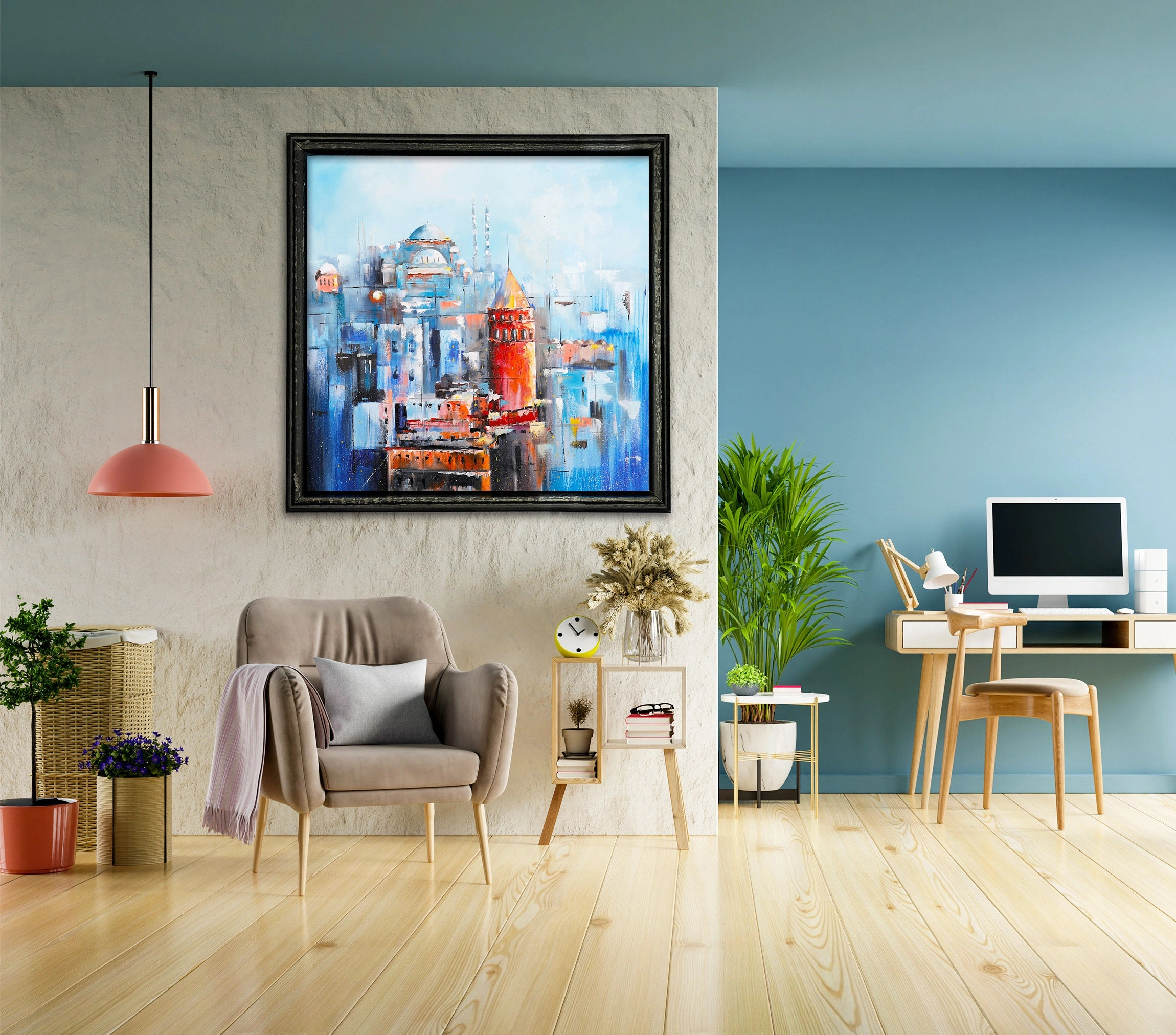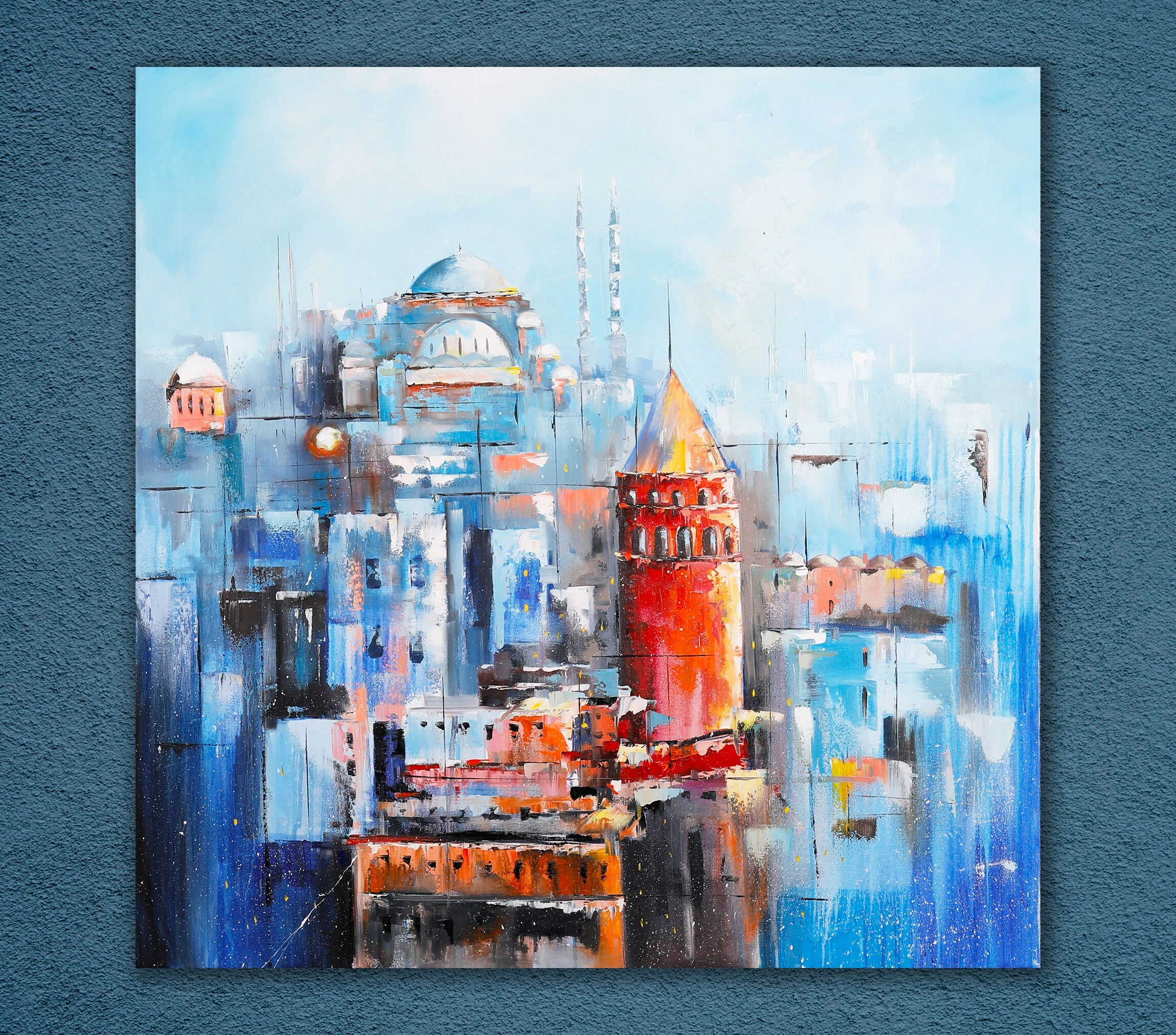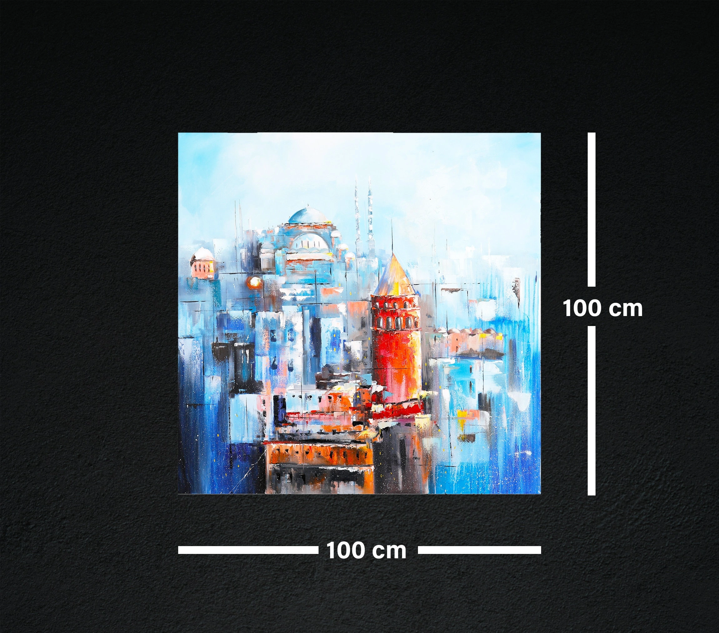 • Galata Kulesi İstanbul Kanvas Tablo Tuval Üzeri Yağlı Boya Tarihi Yarımada Manzarası İstanbul Resmi Kırmızı Mavi Tuval Eser