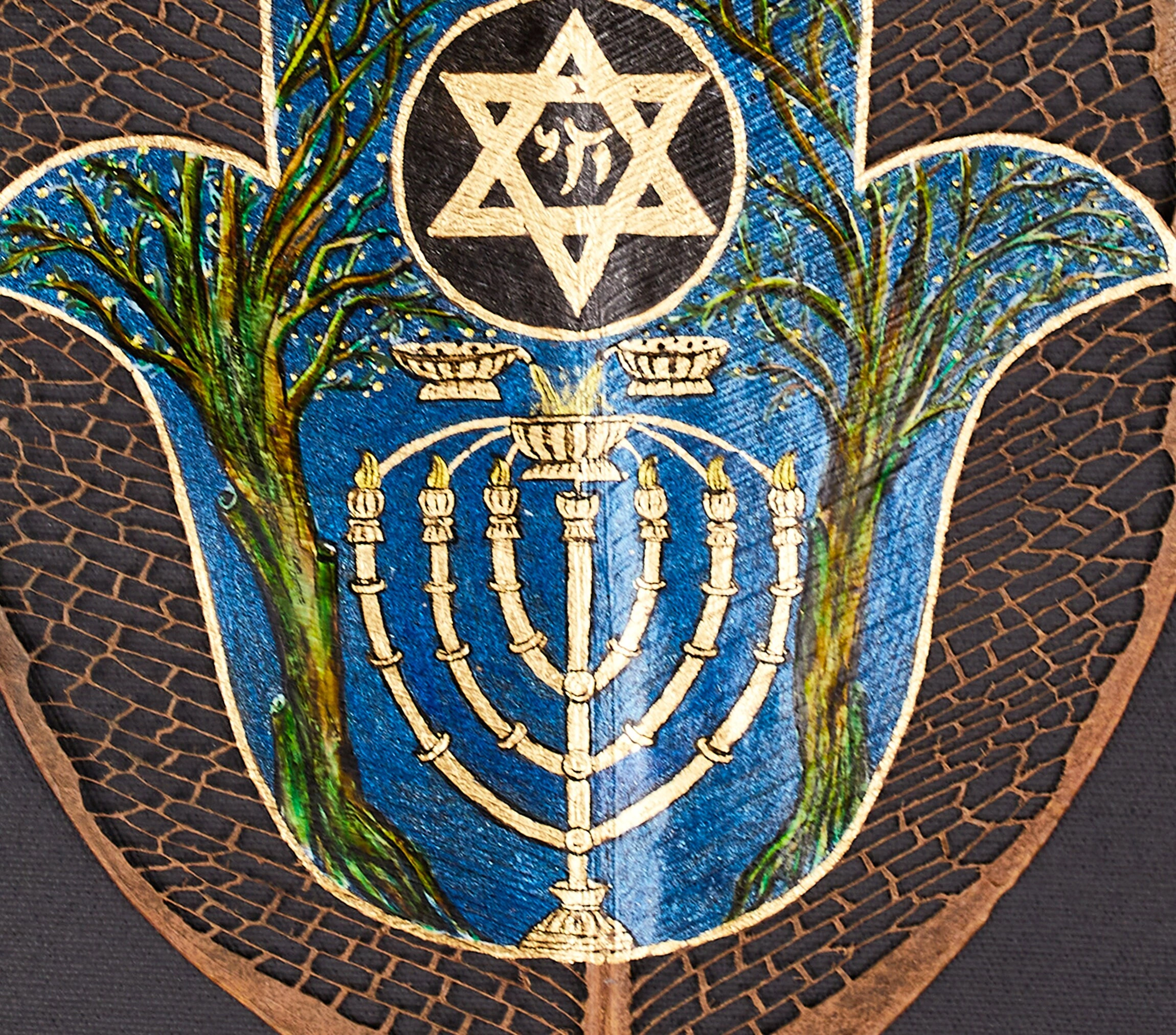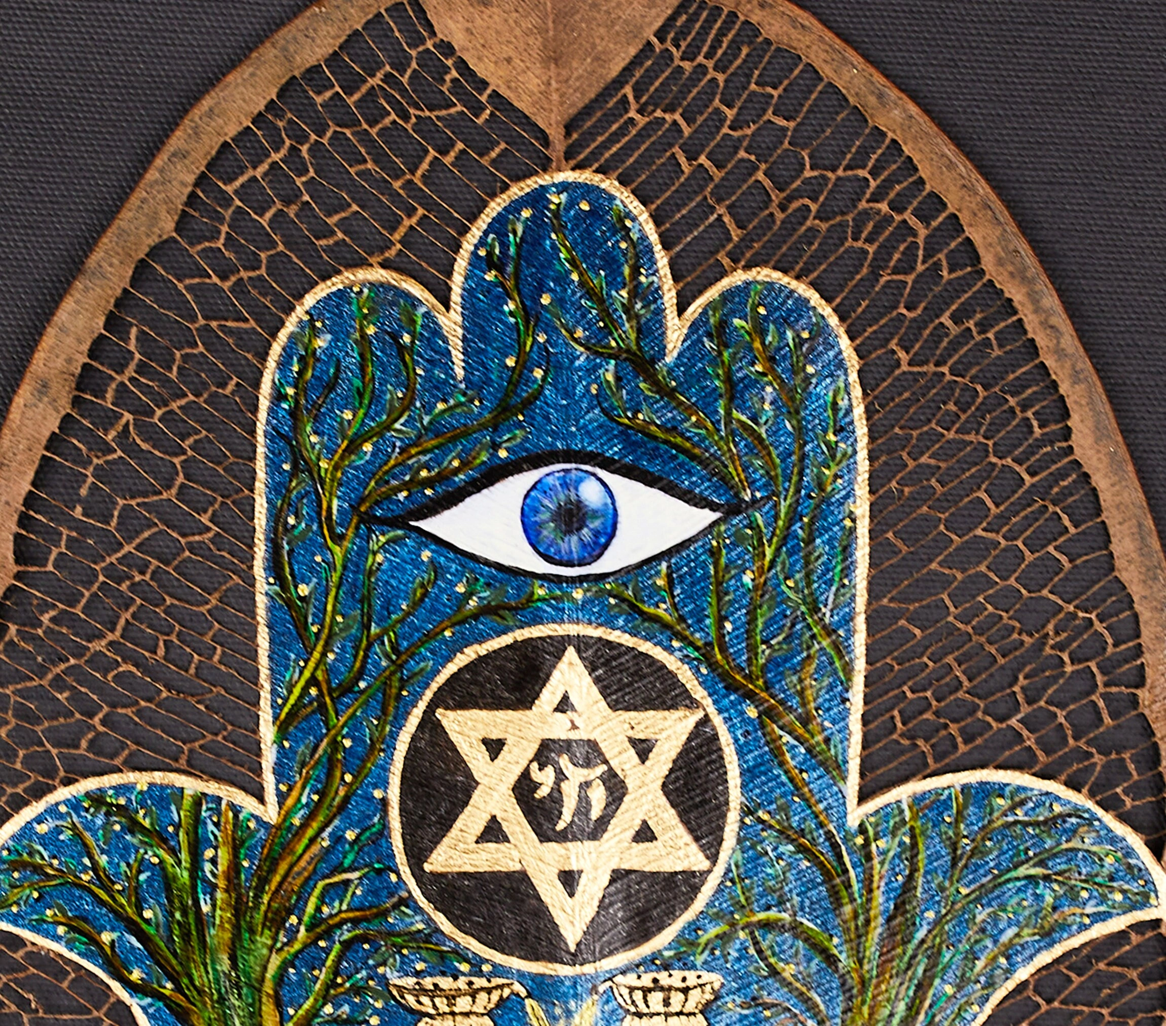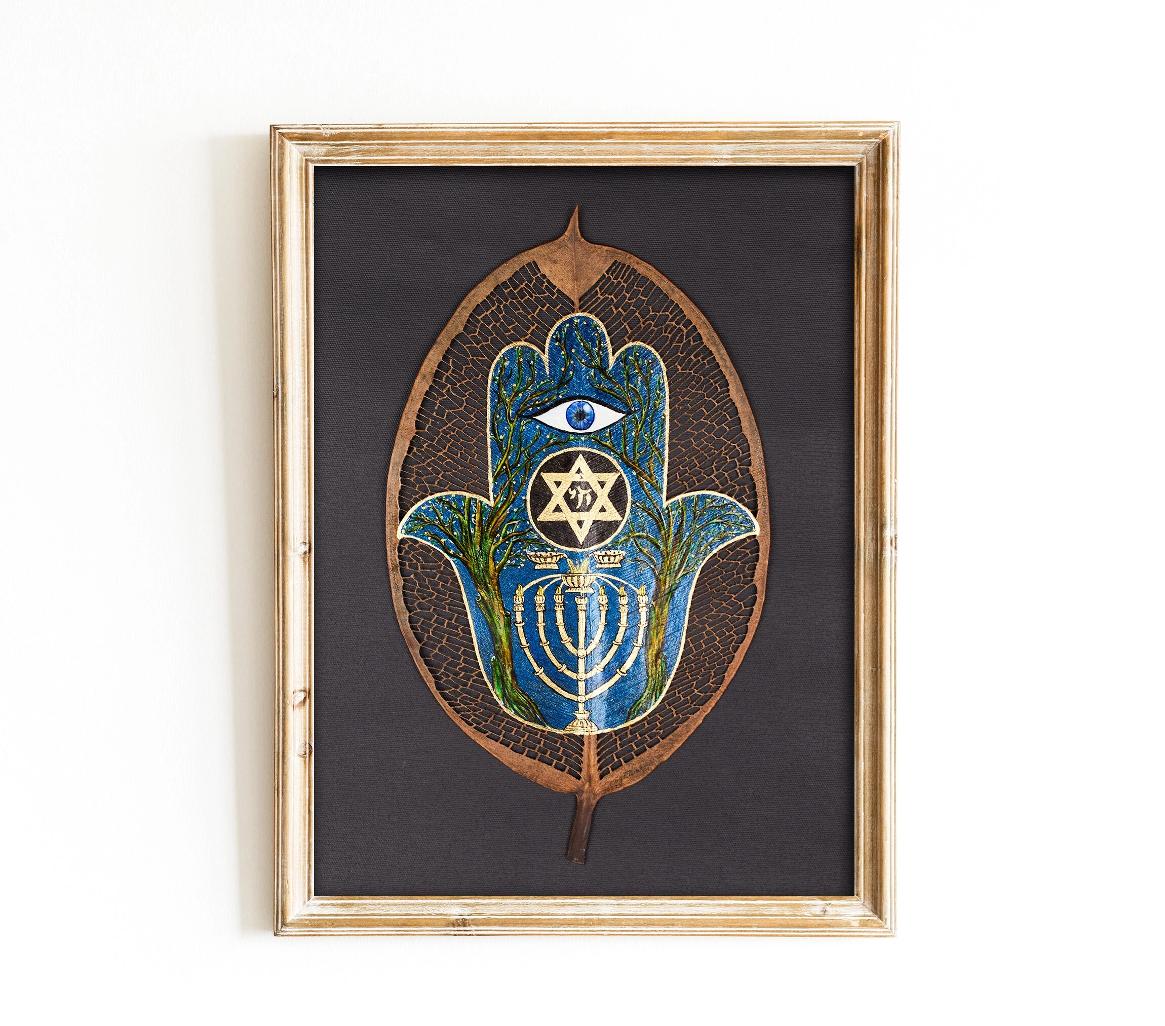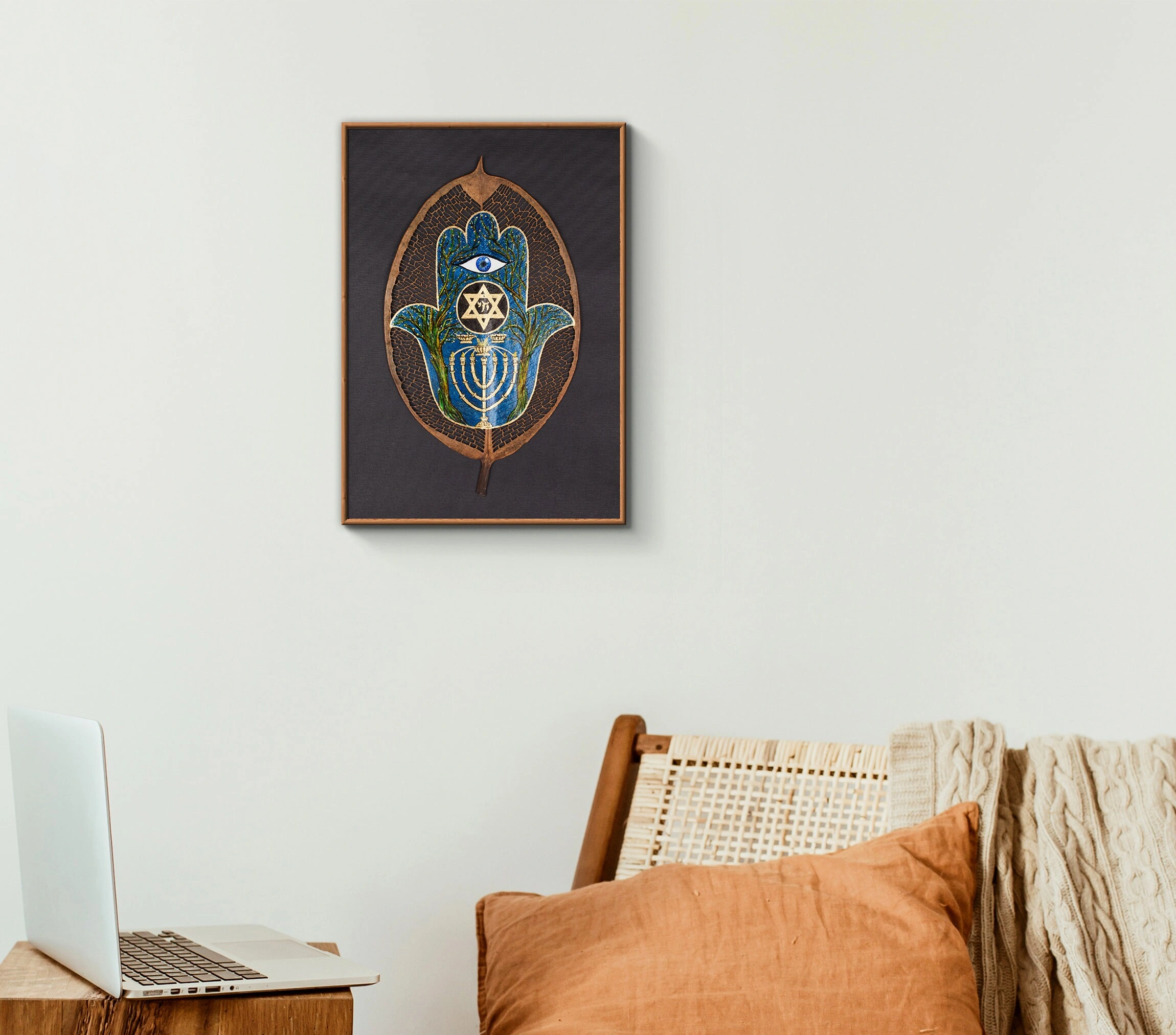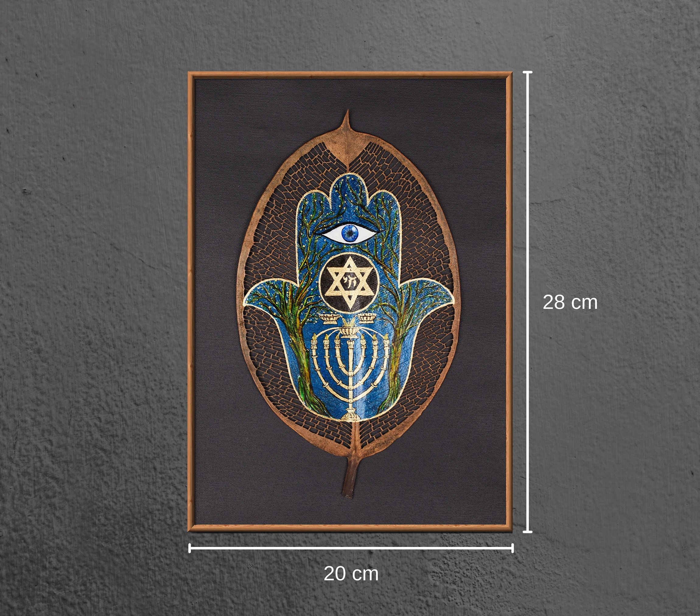 • Fatma'nın Eli Yaprak Sanatı Kauçuk Yaprağı Üzerine Hamsa Eli Motifli Minyatür Sanatı Din Temalı Ev Hediyesi Duvar Dekoru