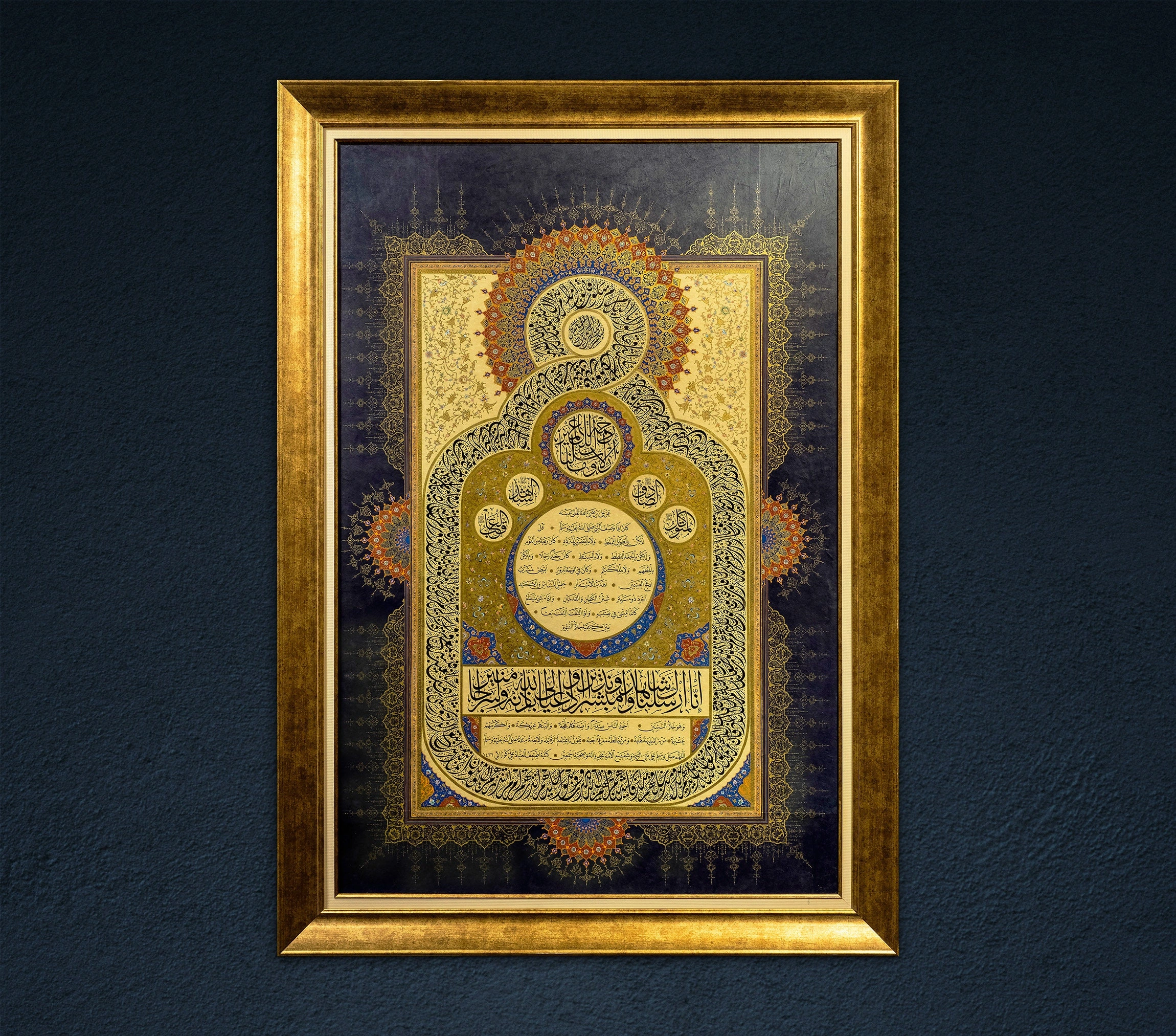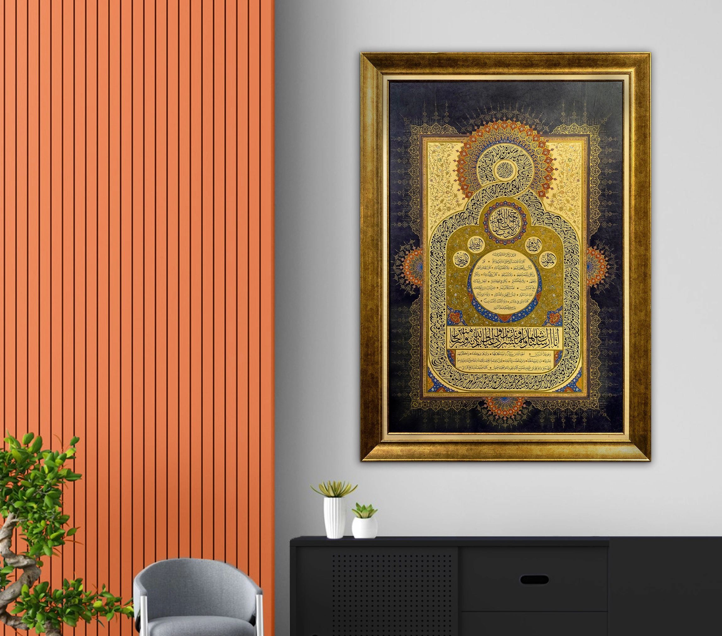 Hilye-i Şerif ve Yasin Suresi'nin yazılı olduğu, siyah ve altın renklerin zıtlığıyla göz alan ve tezhip çalışmasında gerçek altın kullanılan bu değerli İslami hat sanatı oldukça şık bir eser. Hilye-i Şerif ve Yasin Suresi İslami hat ve tezhip sanatı çarpıcı tasarımıyla yaşam alanınıza hayat katacak. Klasik İslami hat tasarımı ve özenle seçilen renkleri her oturma odasını, ofis duvarlarını ya da otel gibi dış mekan dekorasyonlarını daha şık ve zarif gösterecek. El yazması Yasin Suresi ve Hilye neredeyse kusursuz ve muntazam bir hat sanatıyla yazılmış bu duvar dekoru, evinize bir zarafet havası getirecek. Bu özel İslami duvar sanatı gerçek sanat severler ve hat ve tezhip sanatı aşıkları için harika bir seçimdir. Bu muhteşem İslami hat duvar sanatı her ambiyansa çarpıcı son dokunuşu ekleyin
