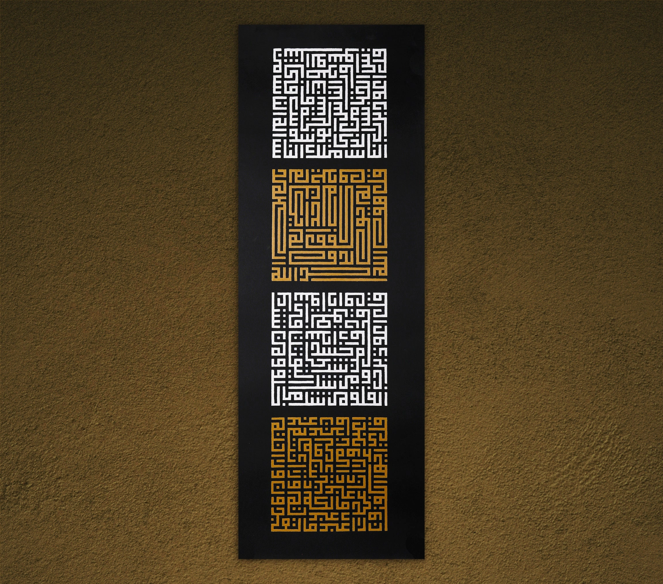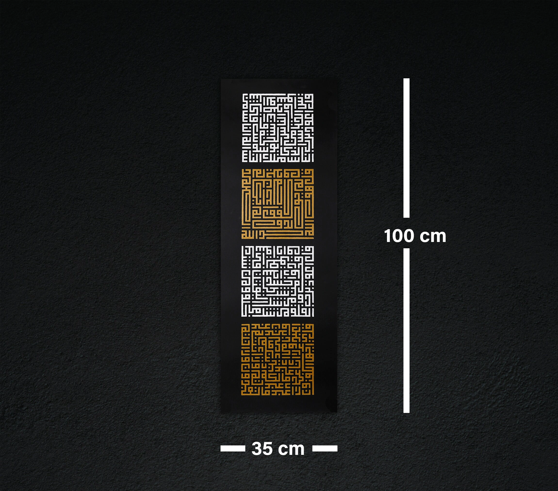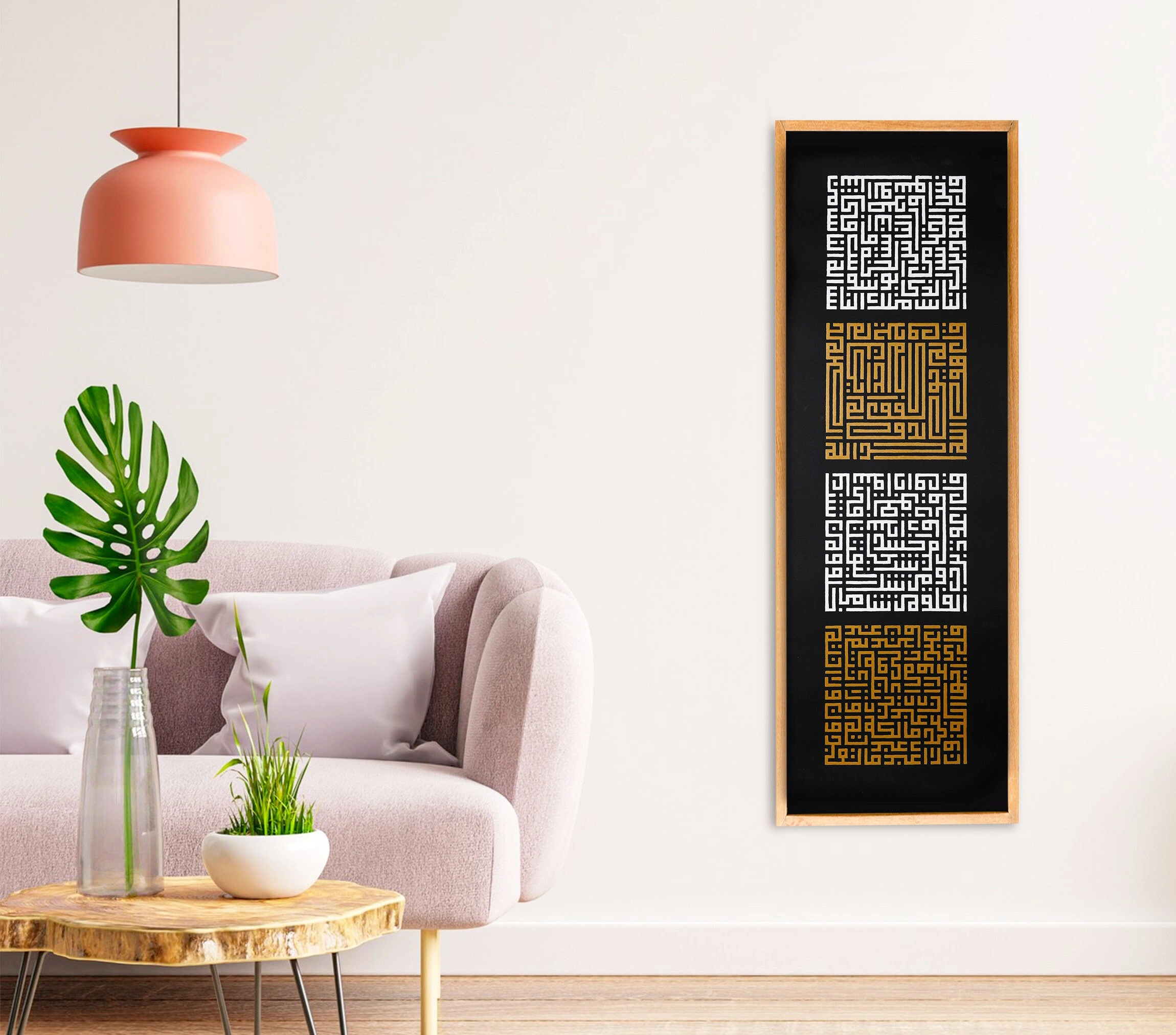Siyah tuval üzerine kufi tarzında el yazması koruyucu sureler olan İhlas Suresi, Felak Suresi, Nas Suresi ve Kafirun Suresi. 4 Kul olarak da bilinen bu güçlü surelerin yer aldığı kanvas tablo çarpıcı tasarımıyla evinize İslami bir dokunuş katmanın mükemmel bir yoludur. Başka hiçbir yerde bulamayacağınız bir sanat eseri olan bu klasik kufi kaligrafi tablosunda evinizin güzel görünmesini sağlamak için canlı renkler ve altın varak kullanılmıştır. 4 Kul kufi kanvas tablo, iman gücünün bir hatırlatıcısıdır. Modern tasarımı ve renklerin zıtlığı onu evinizin herhangi bir duvarını kolayca süsleyebilecek benzersiz bir dekor parçası haline getiriyor. Oturma odasına, salon veya ofis alanına asın, bu büyüleyici sanat eseri size her gün inancın gücünü hatırlatacak. Duvarlarınıza muhteşem bir İslami güzellik dokunuşu eklemek için şimdi alın.