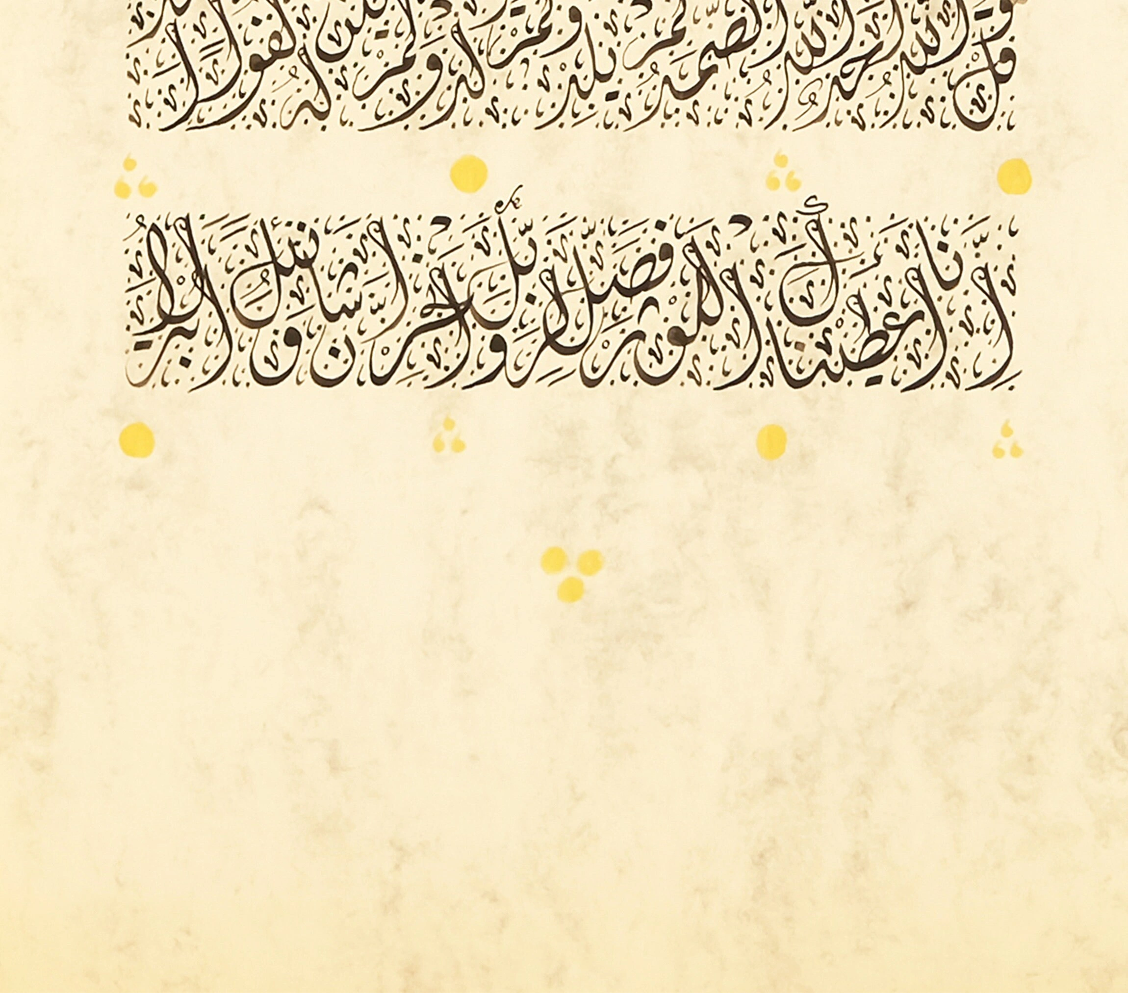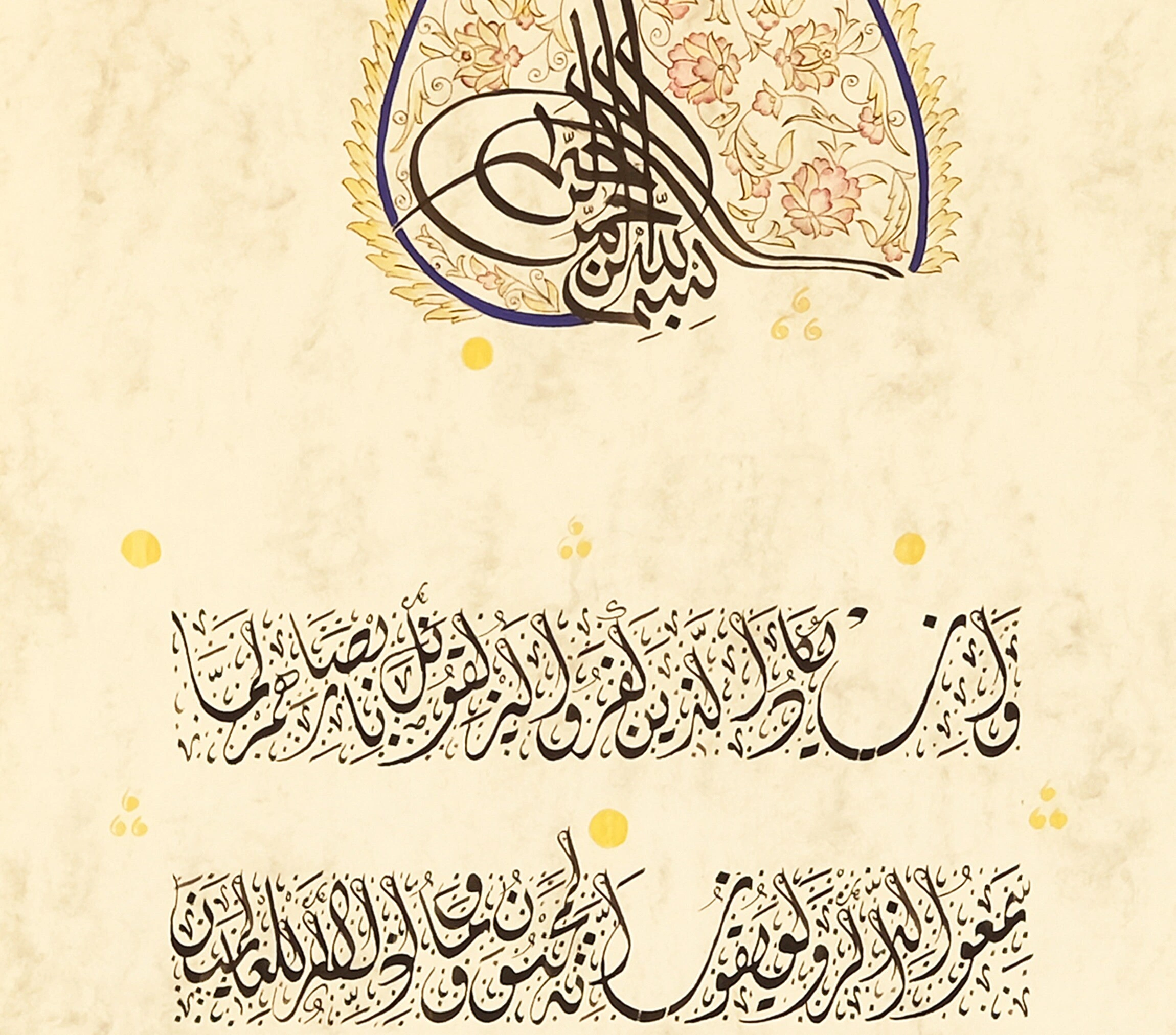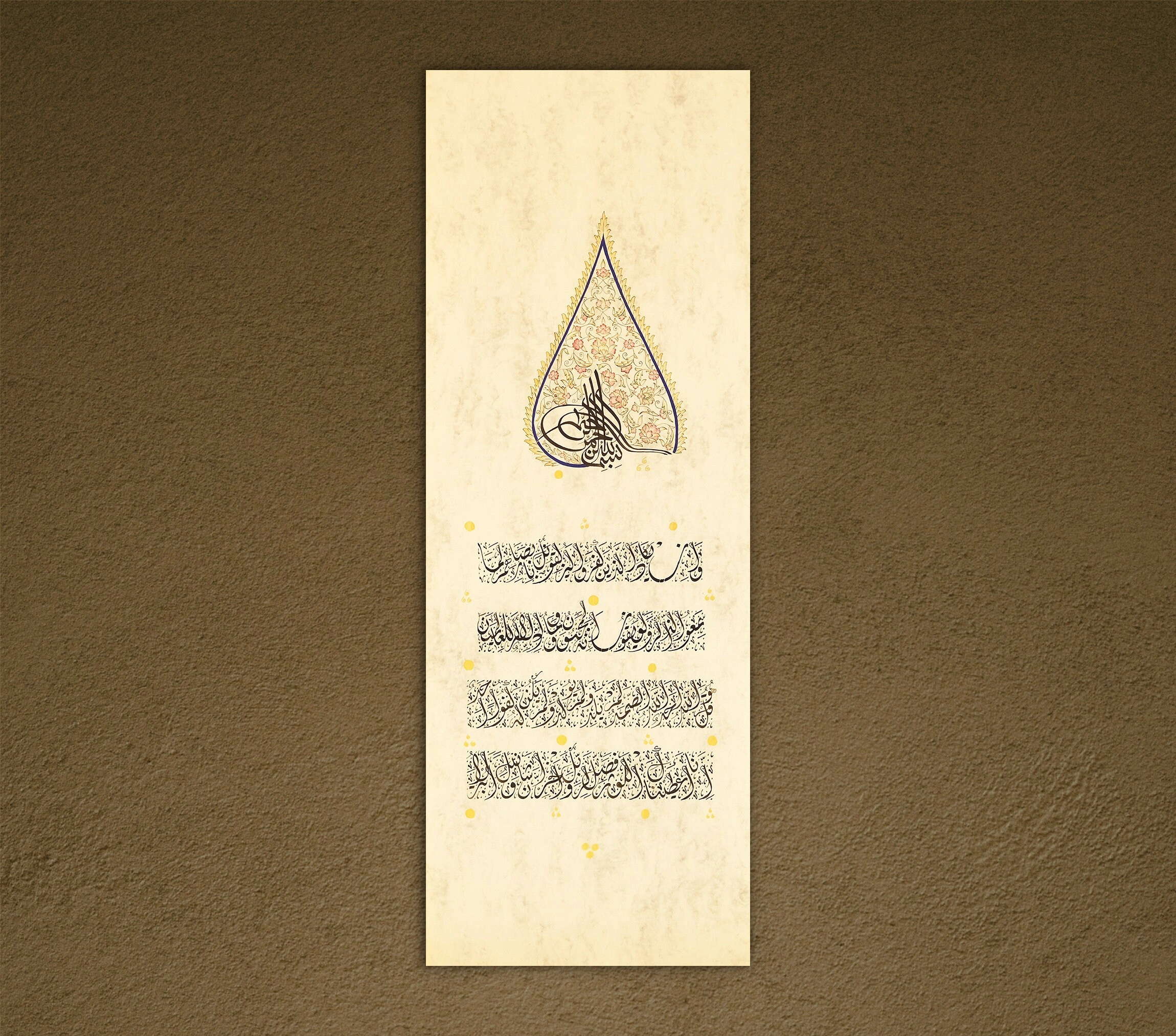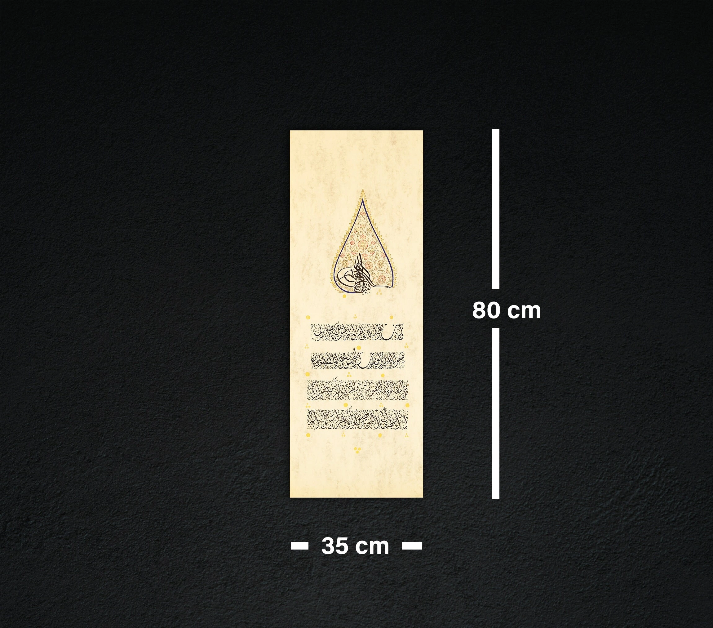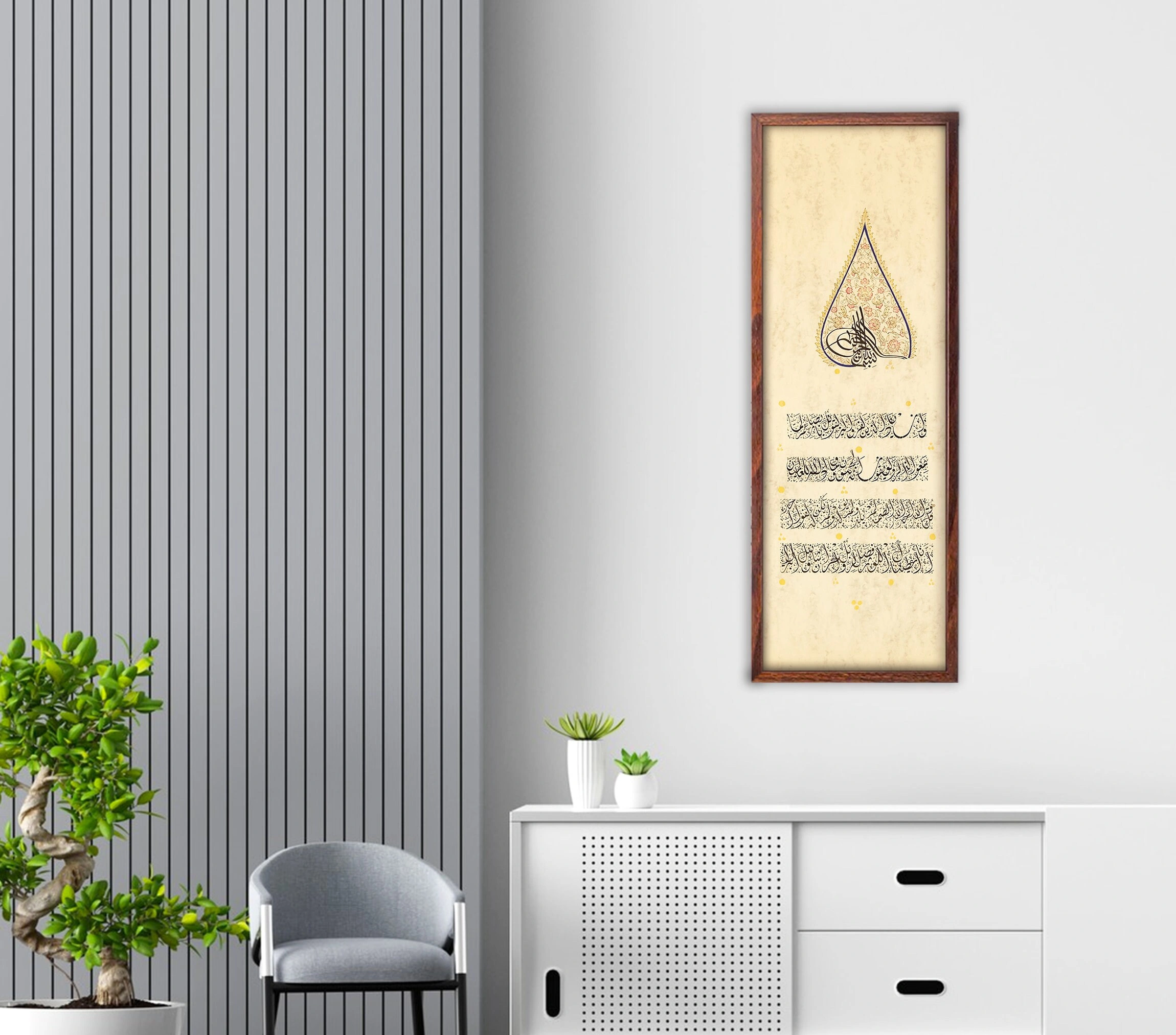 İnce aharlı doğal kağıt üzerine elde yazılan İhlas Suresi ve Nazar Ayeti ve çevresindeki ustaca işlenmiş tezhip çalışması bu eseri göz alıcı bir hale getiriyor. İhlas suresi ve nazar ayeti her odaya zarif bir İslami dokunuş eklemenin mükemmel bir yoludur. Açık renkli doğal kağıt üzerine el işçiliğiyle üretilmiştir ve göz alıcı renkler, aslına sadık tasarım kesinlikle her odayı müthiş bir alana çevirecektir. Boş bir duvarı anlamlı bir el yazması hat sanatıyla doldurmak veya bir odaya dinginlik katmak istiyorsanız, bu duvar sanatı sizin için doğru seçim olacaktır.