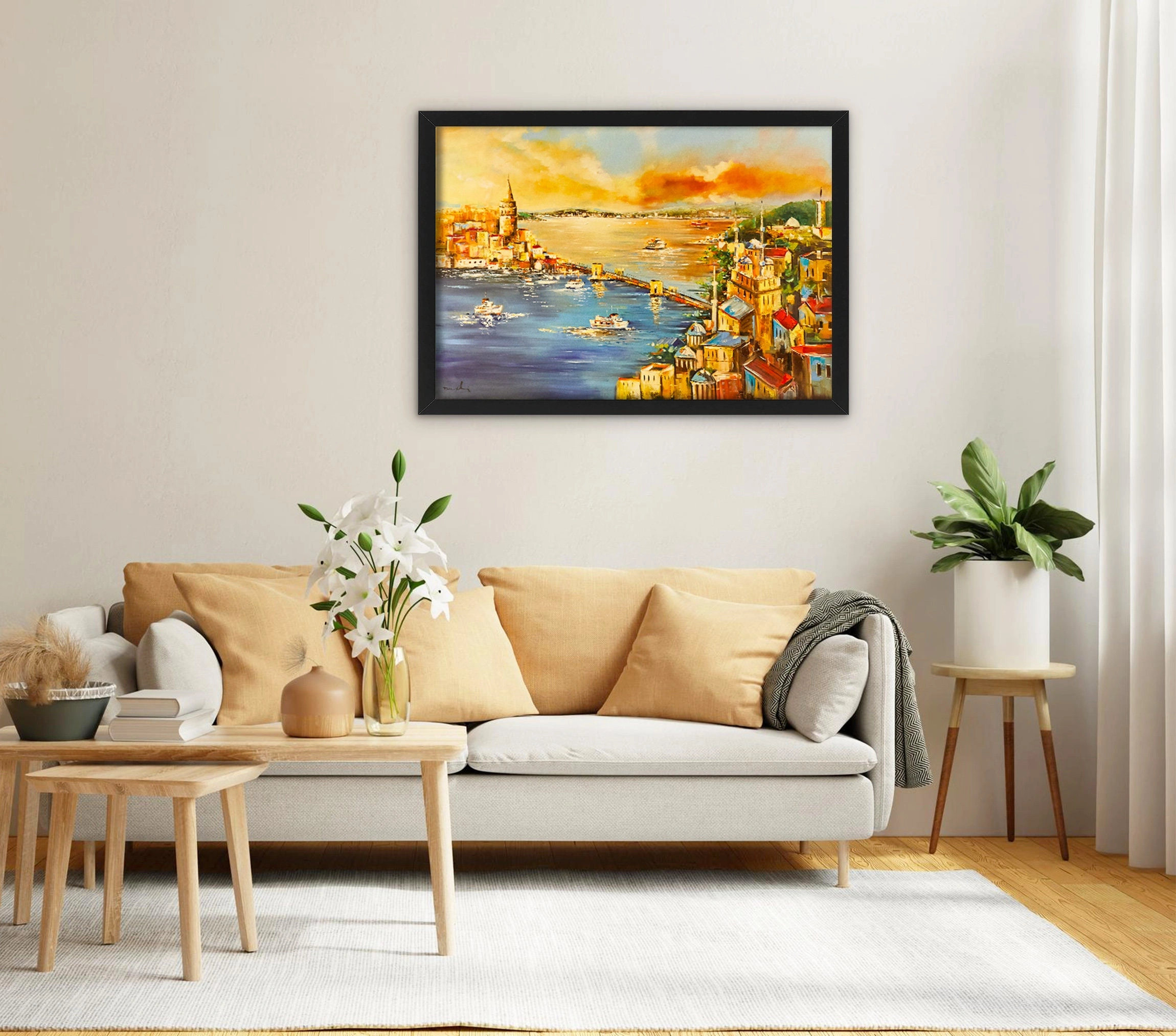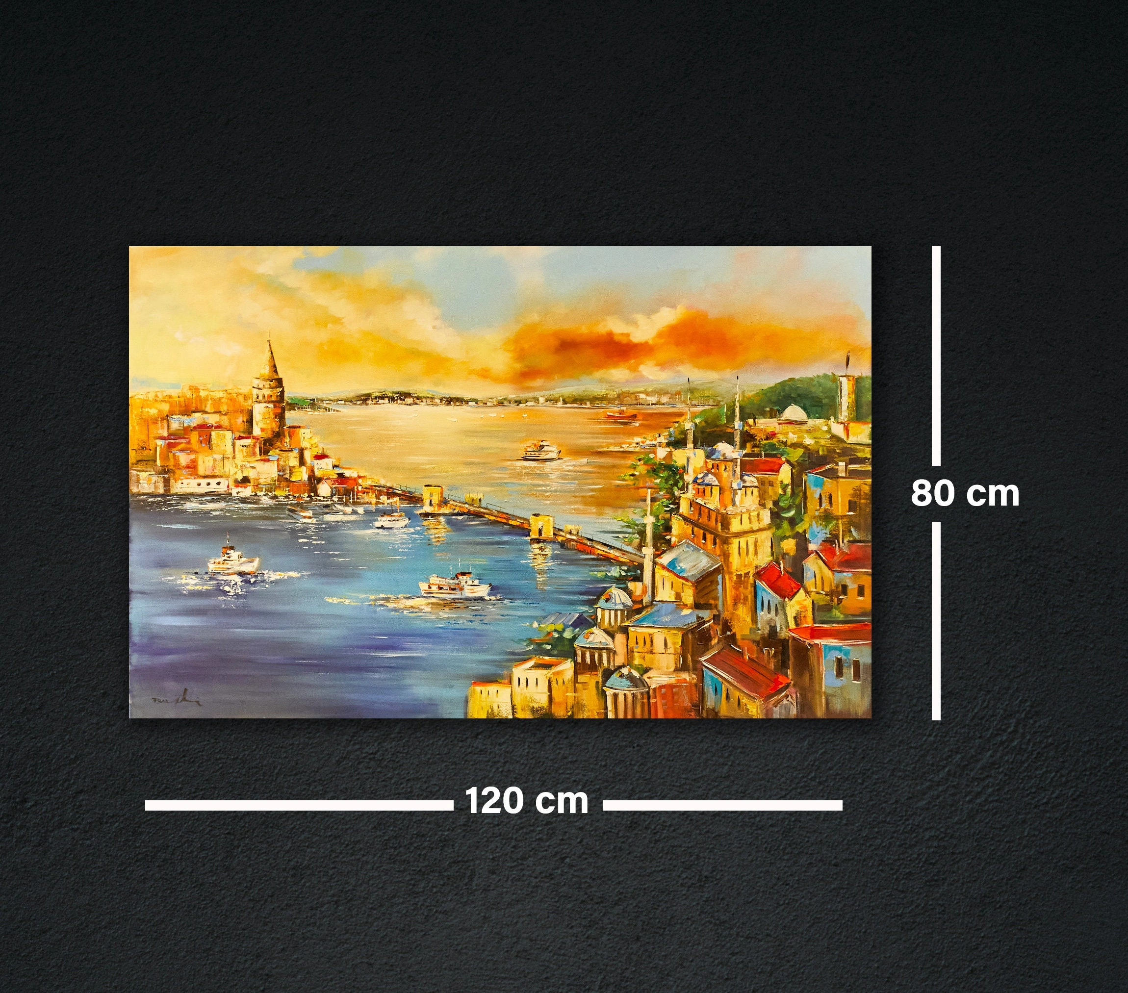 İstanbul Tarihi Yarımada manzaralı yağlı boya tablo, sizi zamanda geriye götürüp mimarisiyle nefes kesen bu muhteşem şehrin güzelliğine götürecek. Türünün tek örneği olan İstanbul manzara tablosu, ev dekorunuza güzel hisler ve inkar edilemez bir çekicilik getirmenin doğru yoludur. Bu eserde ağırlıklı kullanılan sıcak tonlardaki renklerin her odayı canlandıracağı ve de sakinleştirici bir atmosfer getireceği kesin. El yapımı orijinal tablo, İstanbul'un tarihi merkezinin zarif bir temsilidir. Dikkat çekici bu İstanbul şehir manzaralı eser, şehrin kültürüne saygı göstermenin harika bir yoludur. İster oturma odanızda, isterseniz mutfak duvarlarınızda ya da salonunuzda gururla sergilensin, odak noktası görkemli Galata Kulesi olan bu İstanbul tablosu, hiç şüphesiz her odayı pırıltıyla dolduracak.
