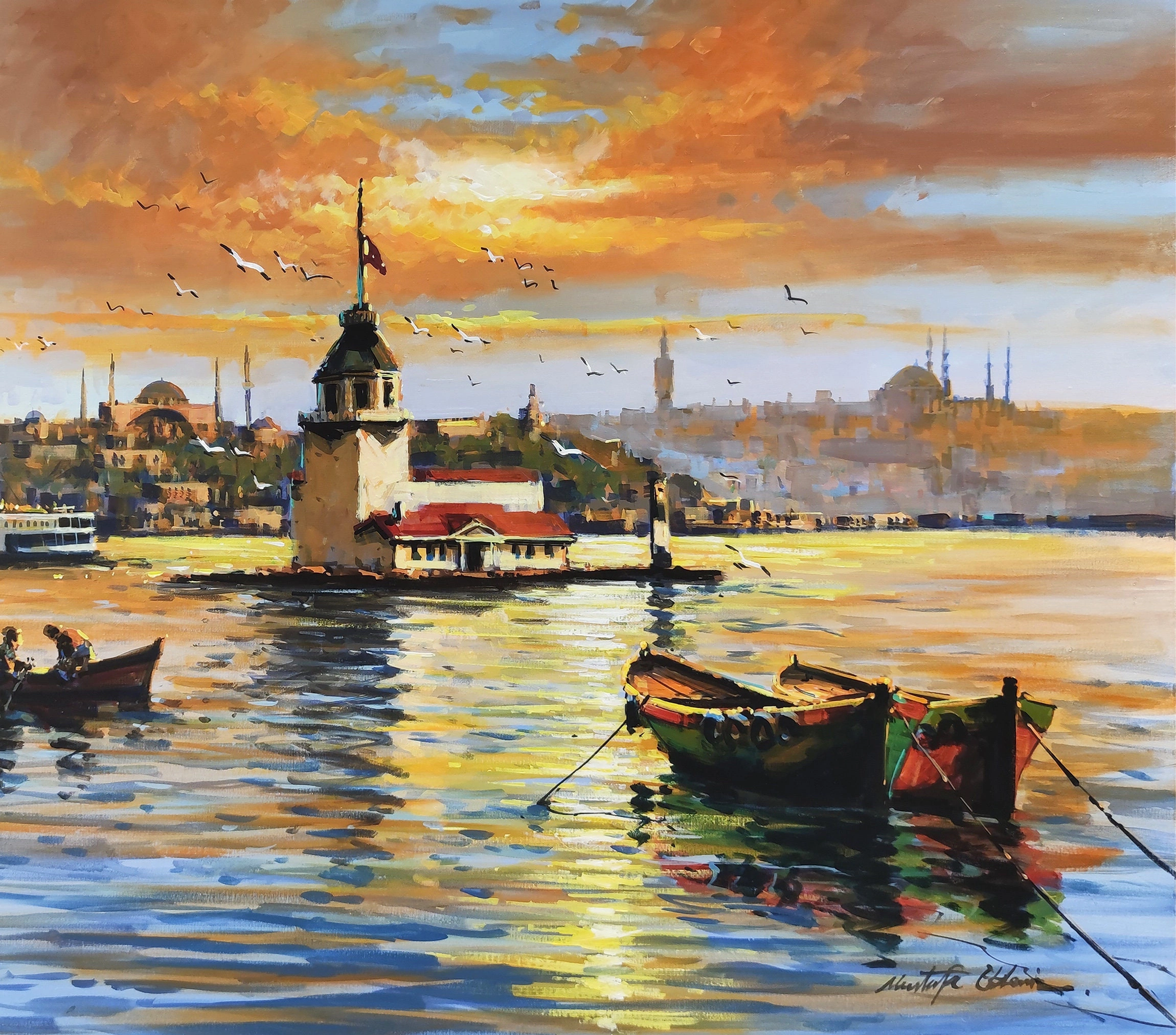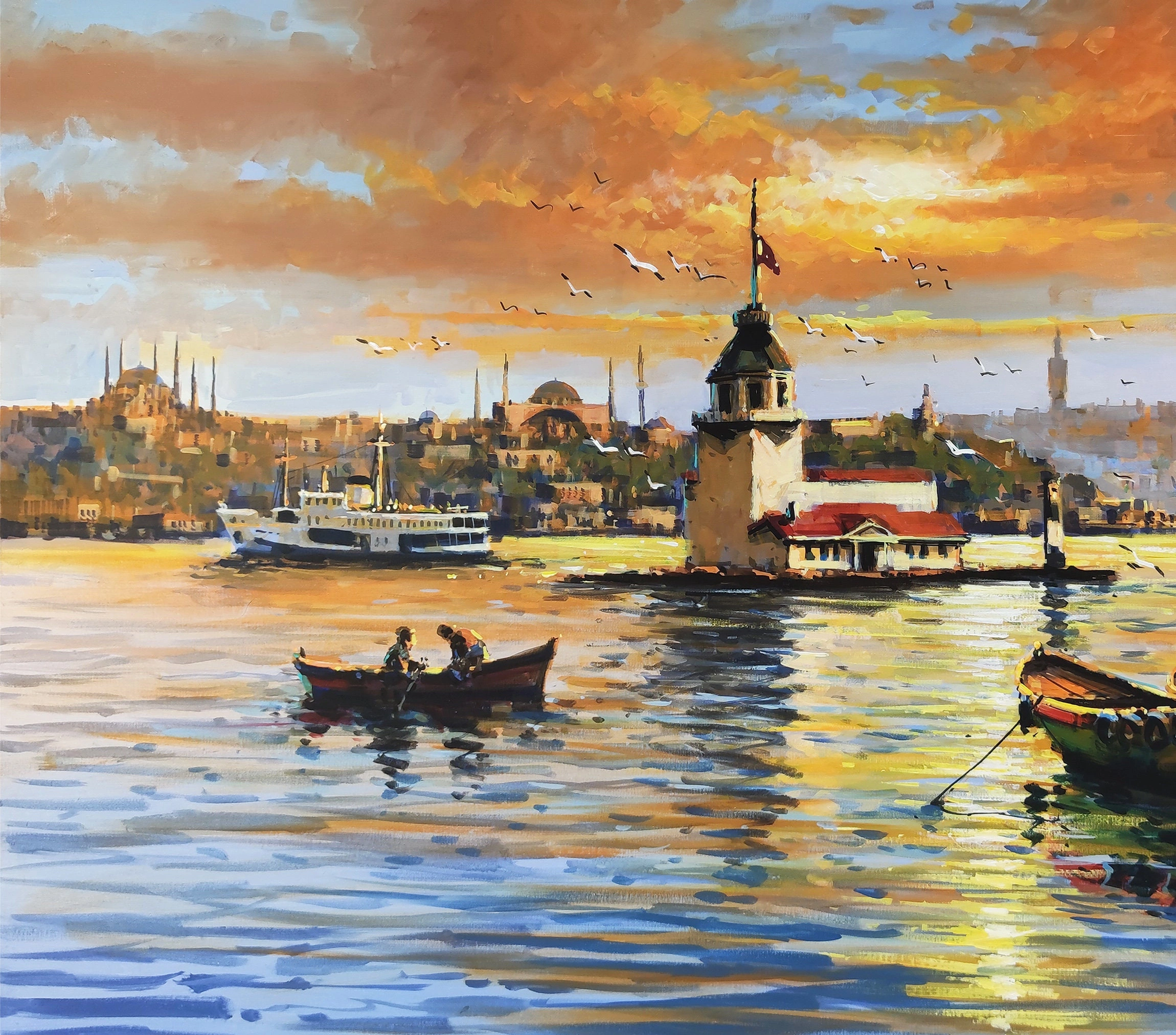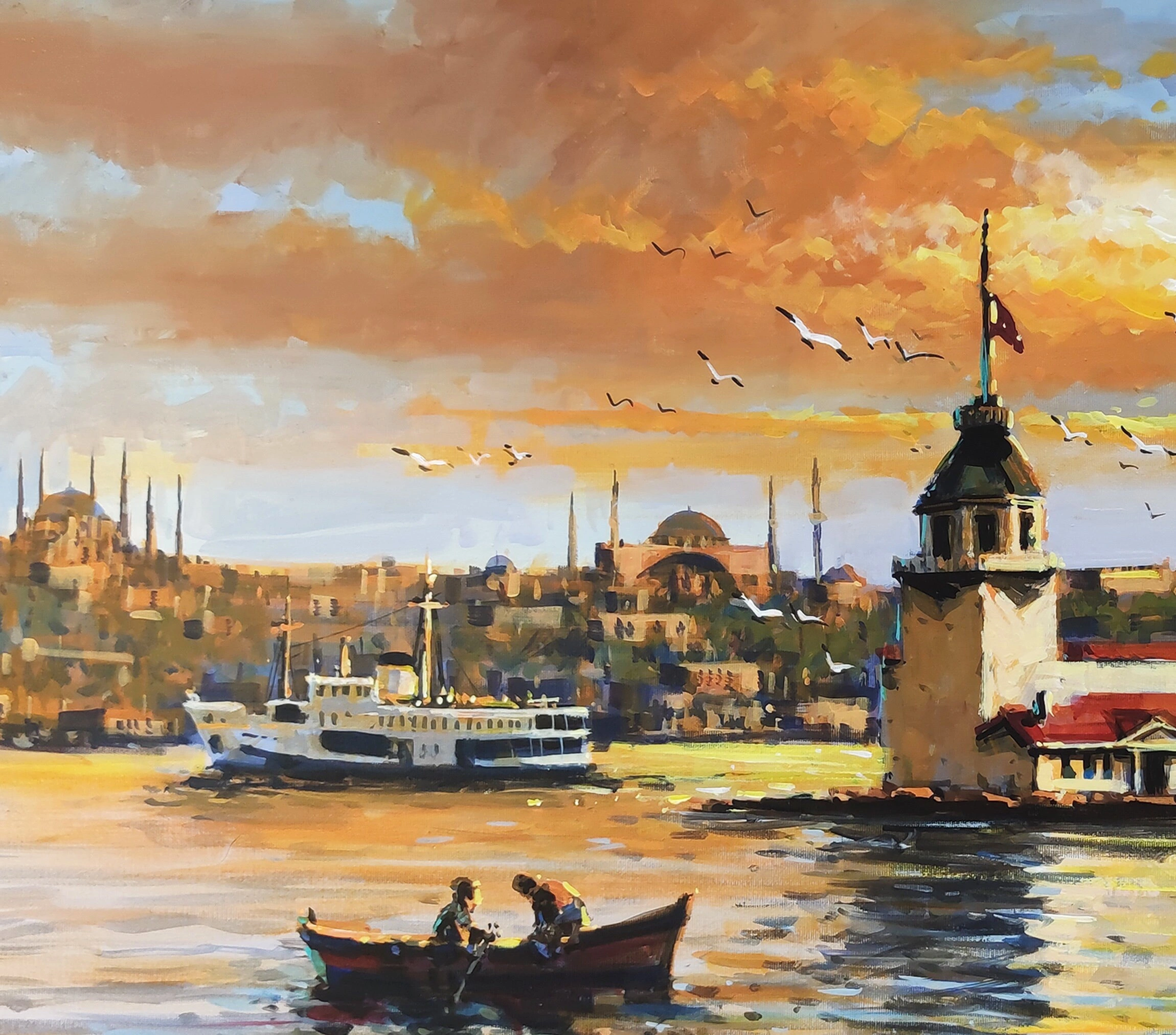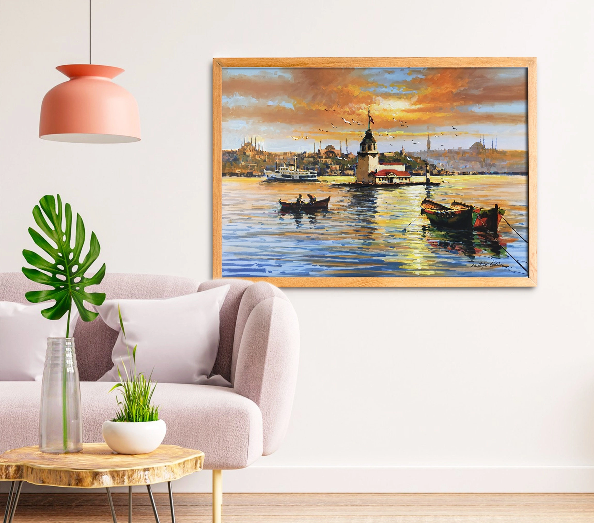 Tuval üzerine yağlıboya Kız Kulesi İstanbul tablosu, dünyanın en güzel şehirlerinden biri olarak uzun ve zengin bir tarihe sahip İstanbul'un ikonik sembollerinin şık bir tasvirini yapıyor. İstanbul Boğazı'nın kıyısında yer alan Kız Kulesi, Bizans döneminden beri şehrin simgesi olmuştur. Kız Kulesi İstanbul tuval sanatı, yapının ve çevresinin görüntüsünü yakalayan canlı renklerle bu görkemli anıta bir bakış sunuyor. İstanbul Boğazı manzarası kanvas tablo, bulunduğu her ortamı aydınlatacaktır. Cesur maviler ve zıtlık yaratan beyazlar, bu şık parçayı dekorunuzun geri kalanından farklı kılacaktır. Oturma odanıza, mutfağınıza veya koridorunuza asmayı seçin, her odanın odak noktası haline gelecektir. Aynı zamanda İstanbul manzarası resmi, bu muhteşem yapının güzelliğini ve dinginliğini yakalamaktadır. Uzakta, parıldayan deniz ve gökyüzü fonunda Kız Kulesi gururla duran görkemli bir kale gibi görünüyor. Bu eşsiz dekorun evinizde değerli bir hazine olacağından emin olabilirsiniz! Kız Kulesi duvar süsleme sanatı ile güzel İstanbul şehrinden bir parçayı evinize getirebileceksiniz.