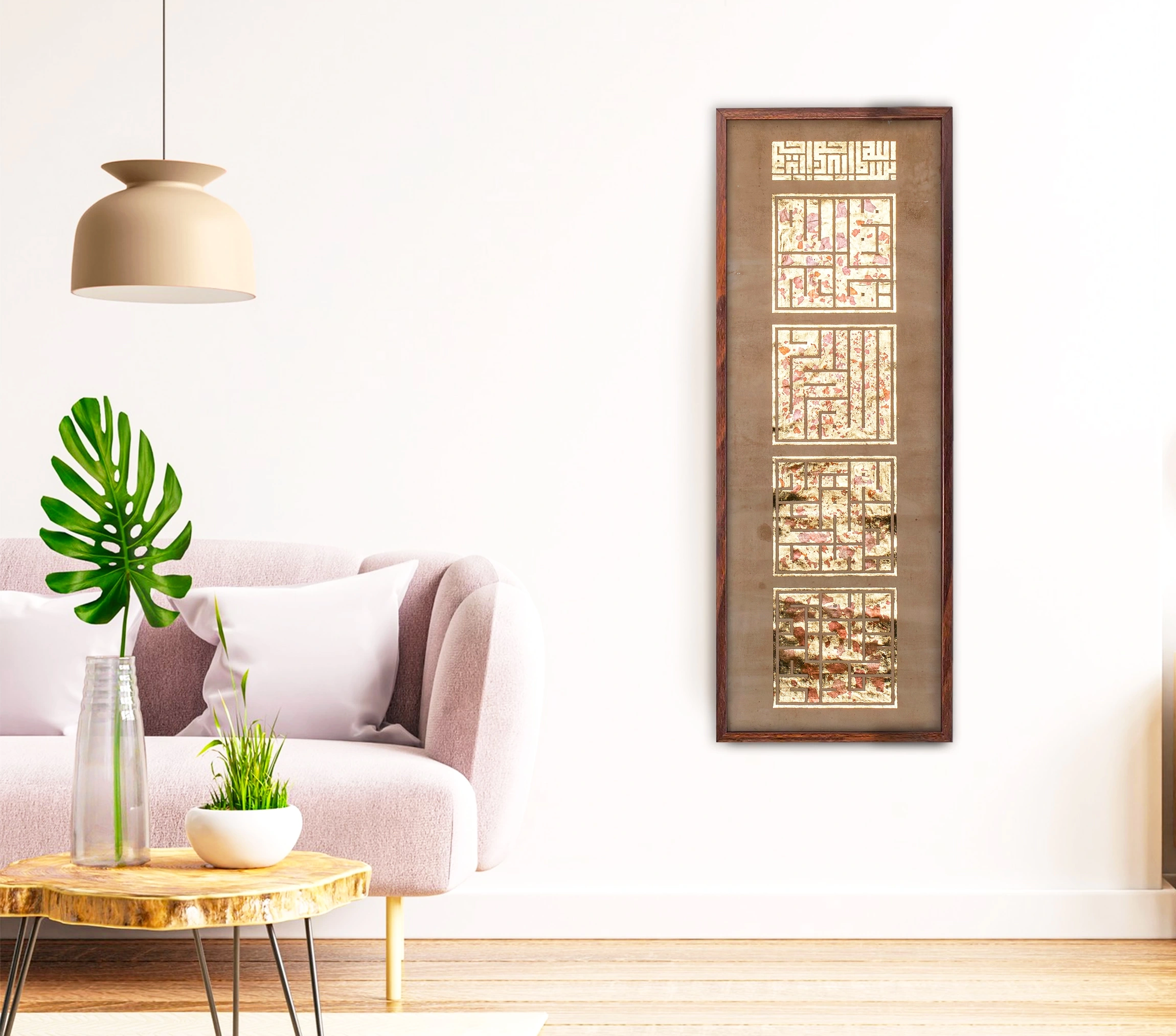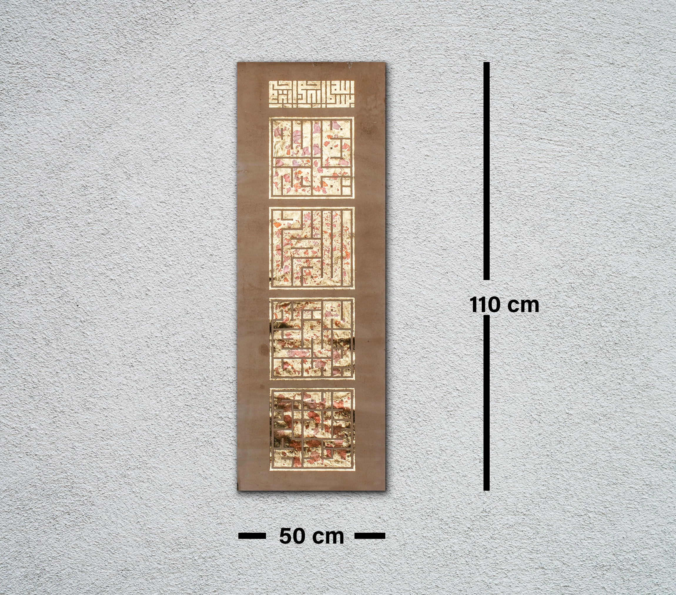 Kahverengi ve altın tonlarının eşsiz uyumu, iç dekorunuza göz alıcı bir katkı sağlarken, ambiyansınızın çekiciliğine de katkıda bulunur. Her alanda göz alıcı parlak altın renklerine sahip bu İslami kaligrafi eserinin her kalem darbesi evinize veya ofisinize bir denge duygusu getirecek. Duvarlarınızı anlamlı bir hat sanatıyla doldurmak ya da yaşam alanınıza dinginlik katmak istiyorsanız, İhlas Suresi Kufi hat sanatı tablo doğru seçimdir.