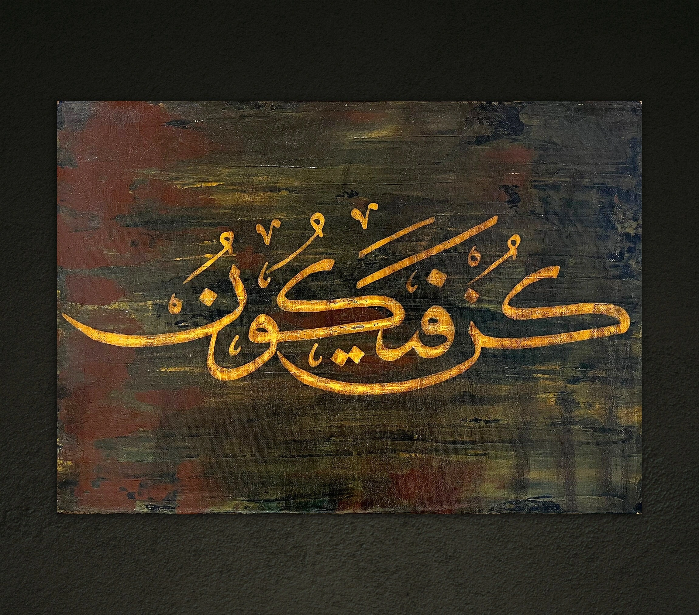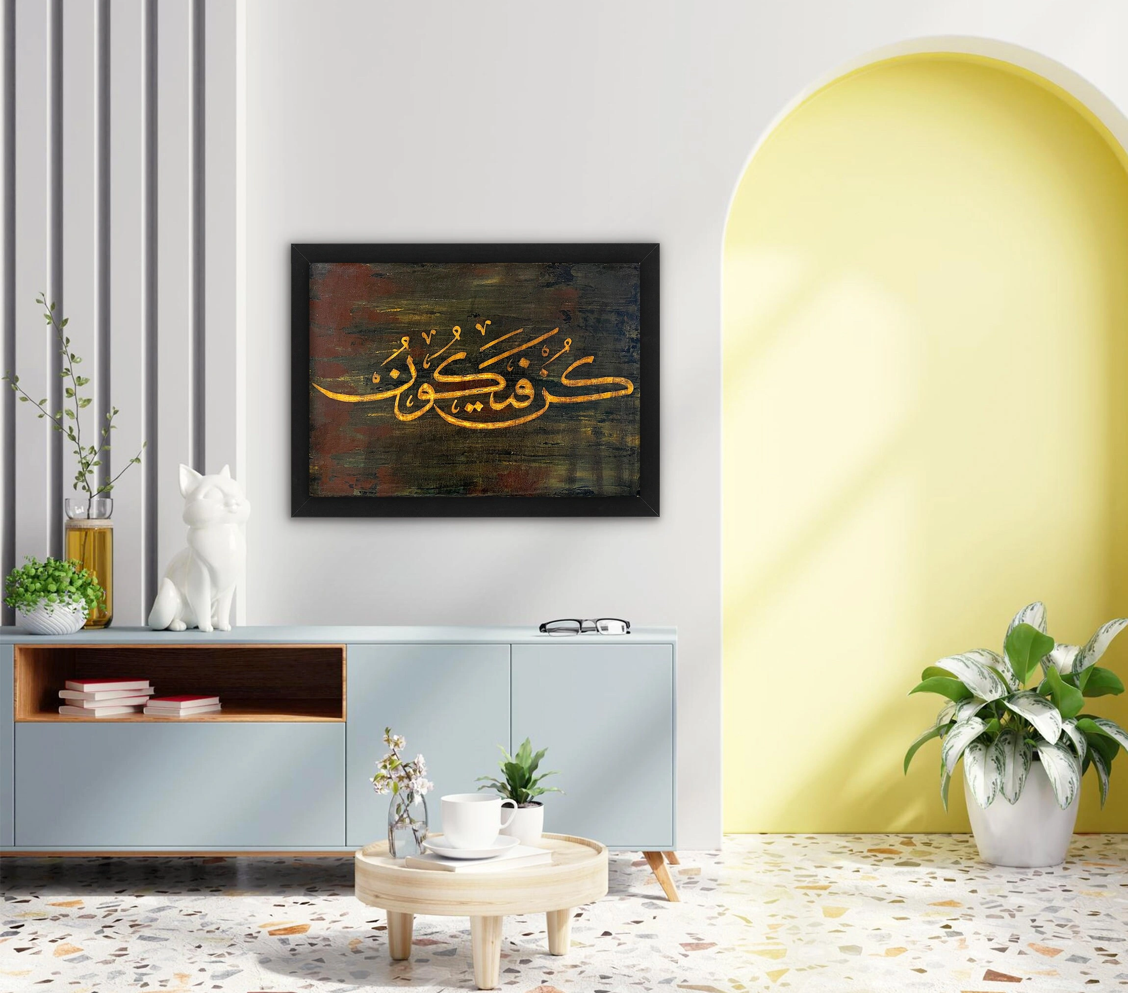 Tuval üzerine akrilik el yazması Kun Fe Yekun İslami hat tablosu, sade ancak göz alıcı tasarımıyla evinize hoş bir dokunuş katacak. Ambiyansınızı canlandırmak için anlamlı ve güçlü bir Arapça hat eseri arıyorsanız, bu el yapımı Kunfeyekun kanvas tablo yeterli olacaktır. Haki ve turuncu tonlarındaki bu eşsiz Arapça kaligrafi el yazması her eve mükemmel bir ek olacaktır. İster bir hediye olsun, isterse İslami bir ev dekor stili için olsun Kun Fe Yekun'un alanınızı güvence altına alan gücünü hissedeceksiniz.