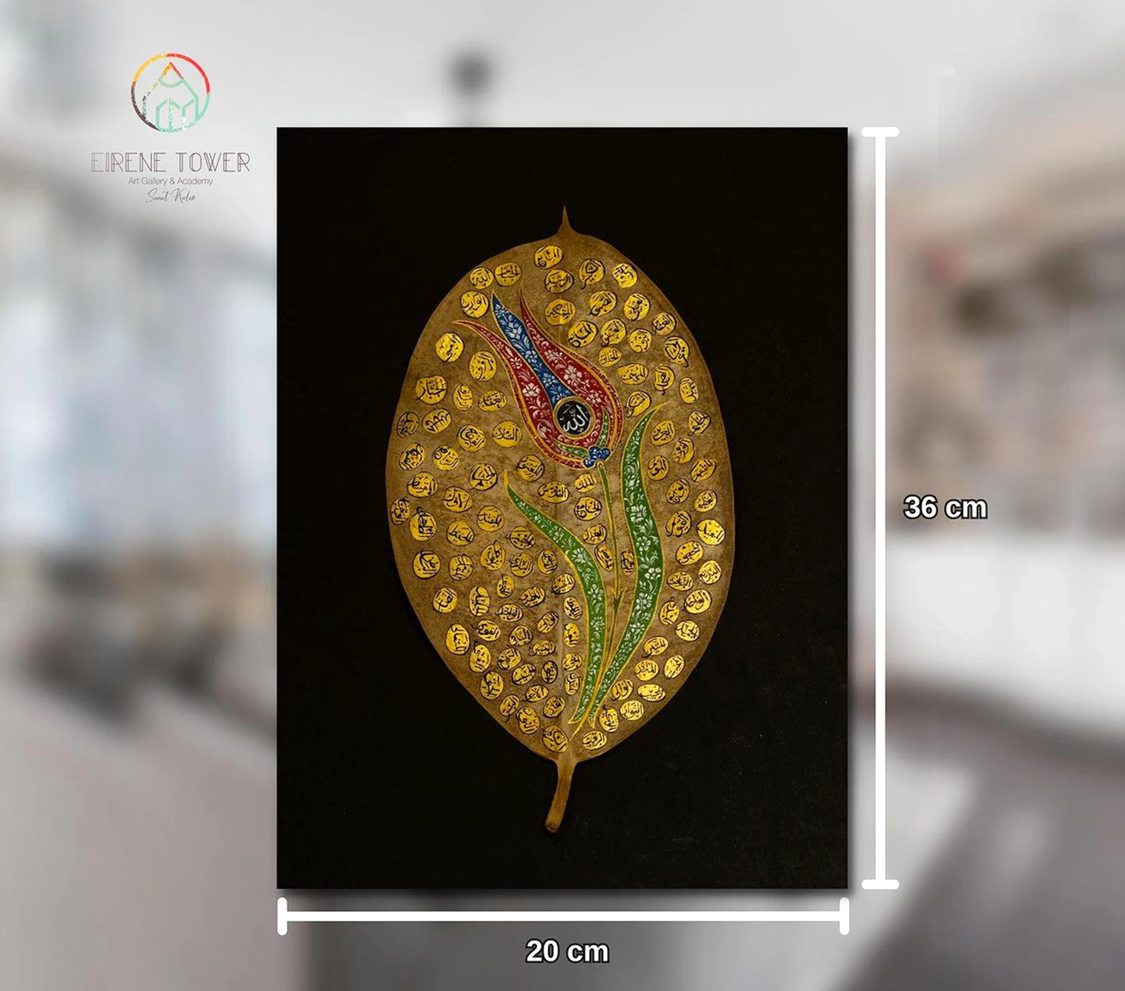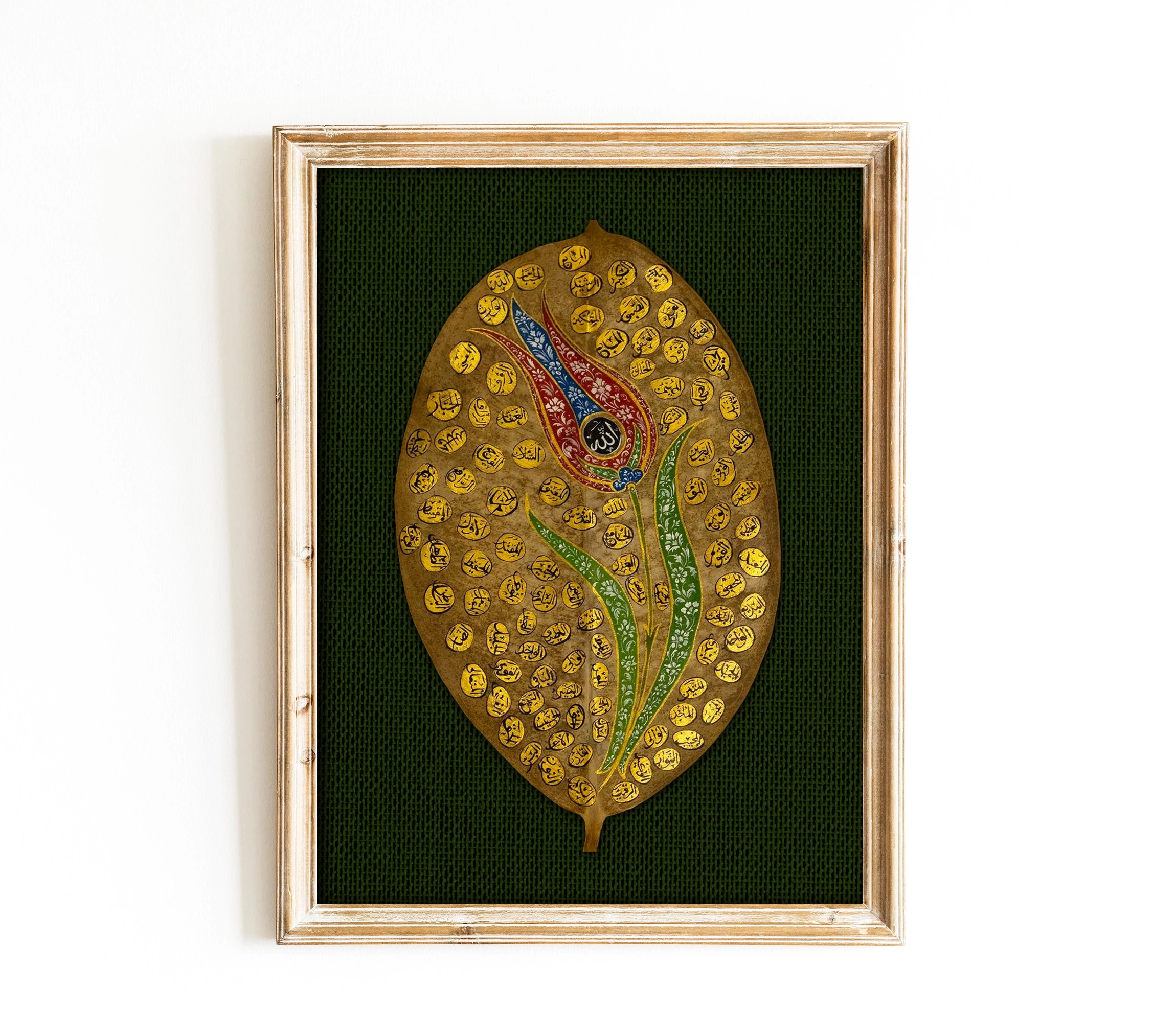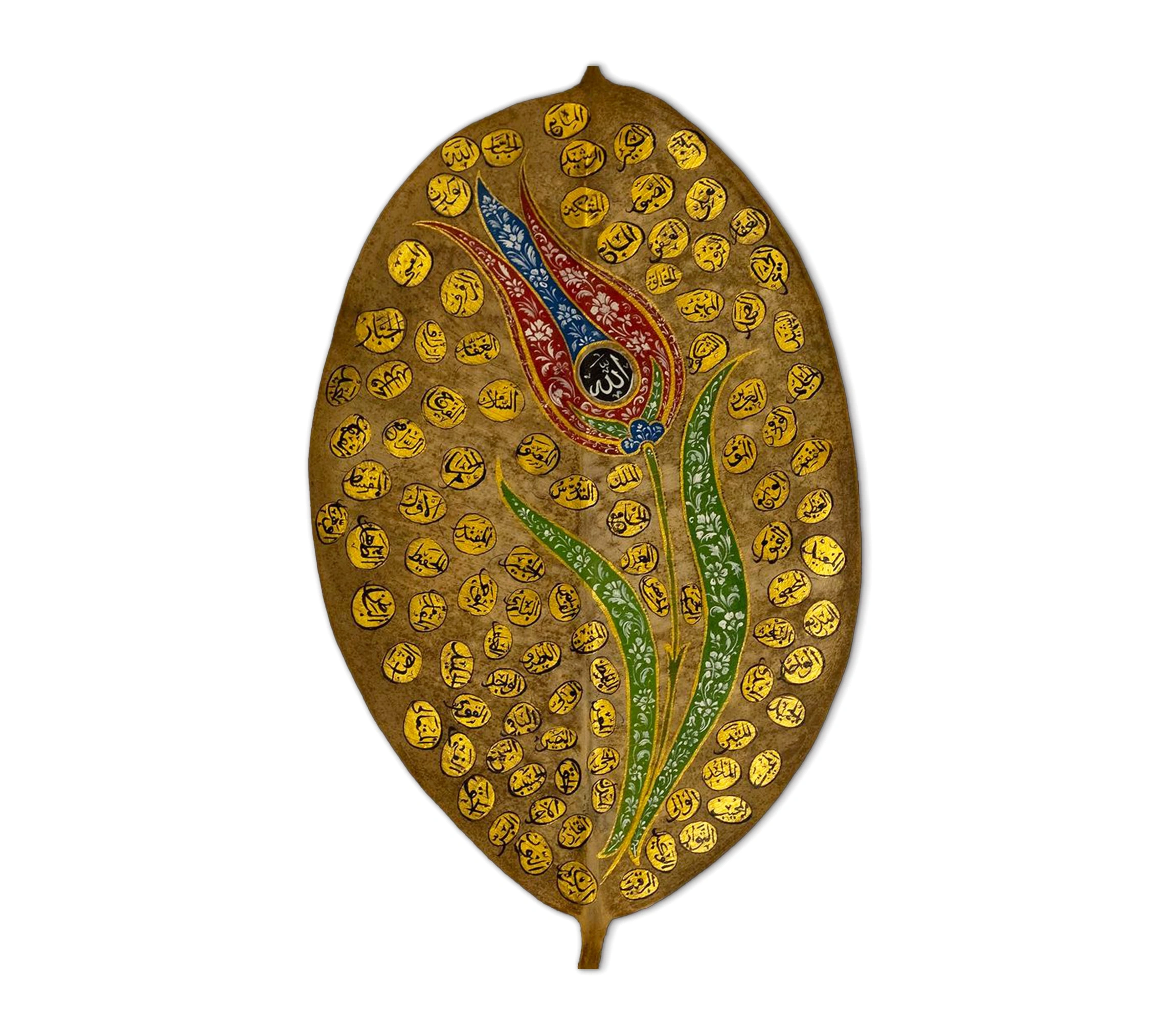 Zarif lale figürü tasarımıyla el yazması benzersiz Esma Ül Hüsna yaprak sanatı, her eve ilahi ve benzersiz hisler eklemek için mükemmel seçimdir. Allah'ın 99 İsmi'nin yazılı olduğu Esma Ül Hüsna yaprak sanatı usta bir işçilik gerektiren incelikli tasarımı ve altın renklerdeki dikkat çekici görseliyle sofistike bir İslami duvar dekorudur.