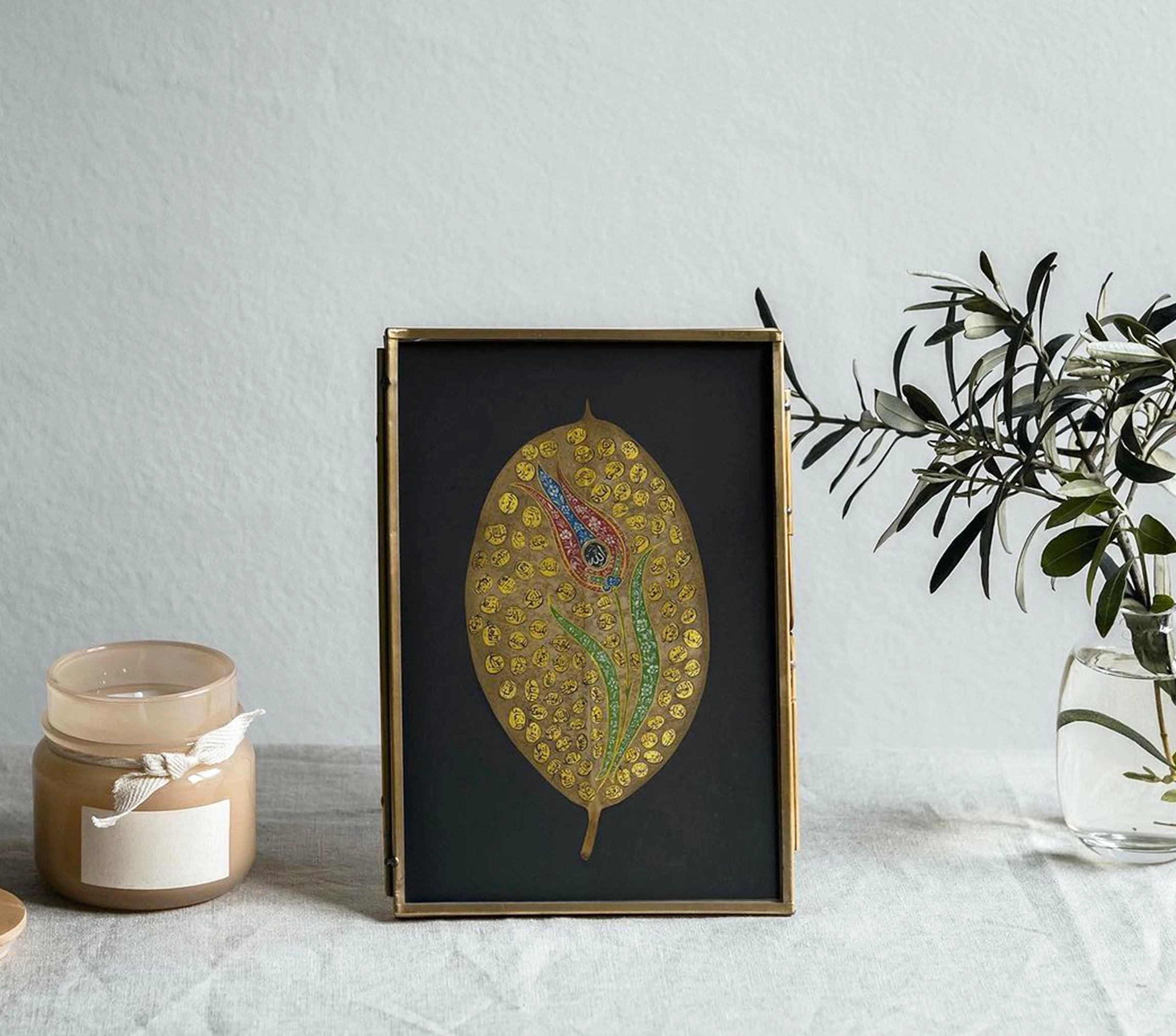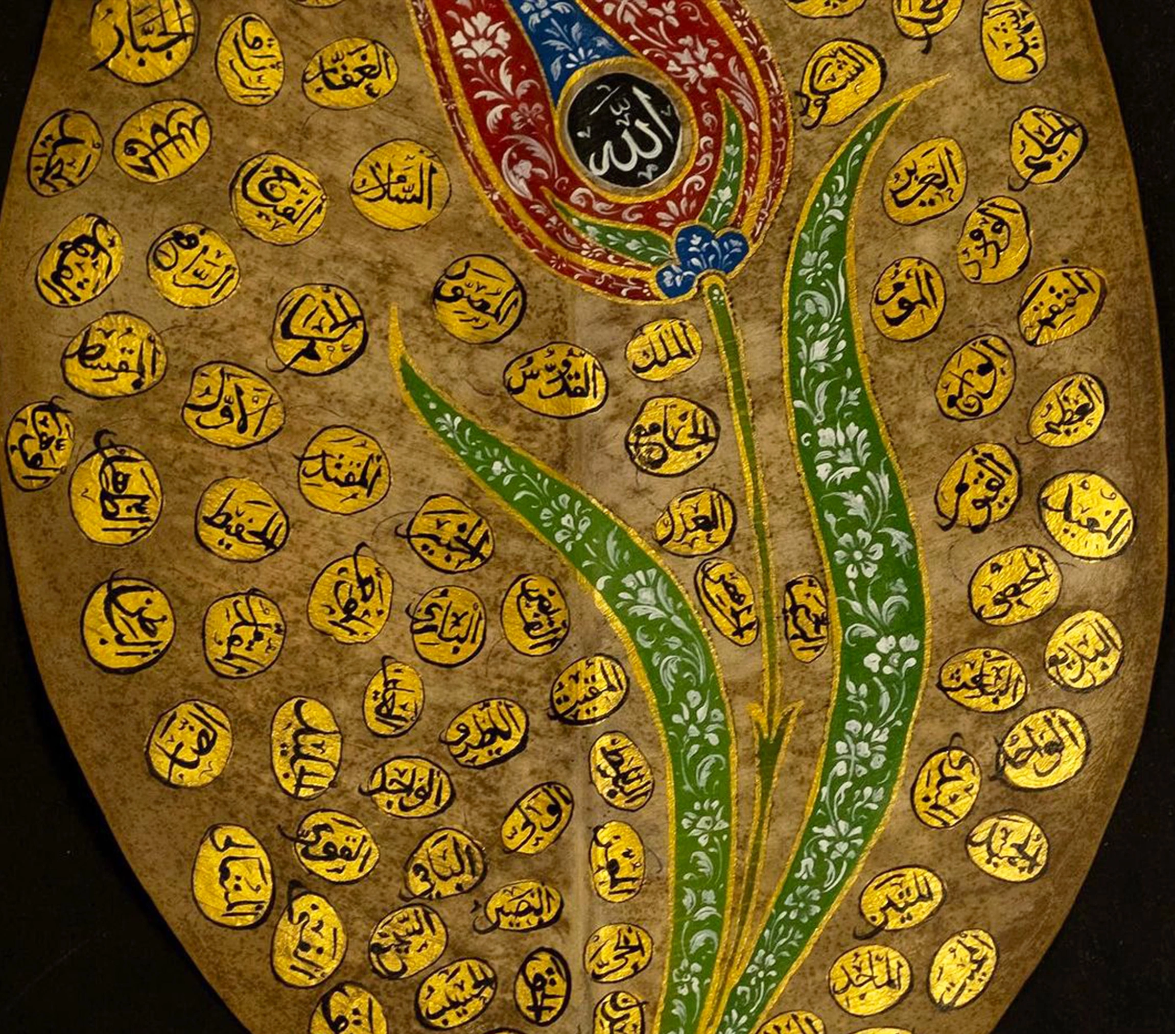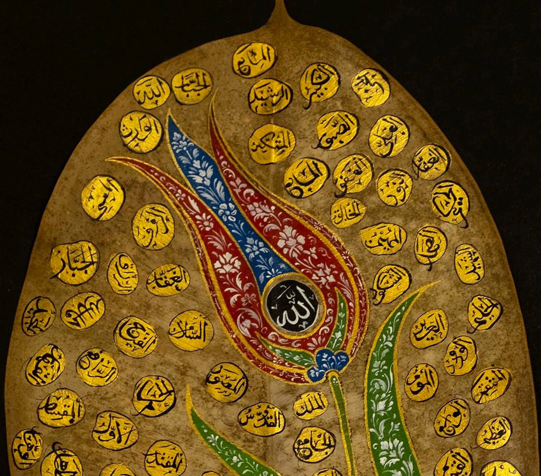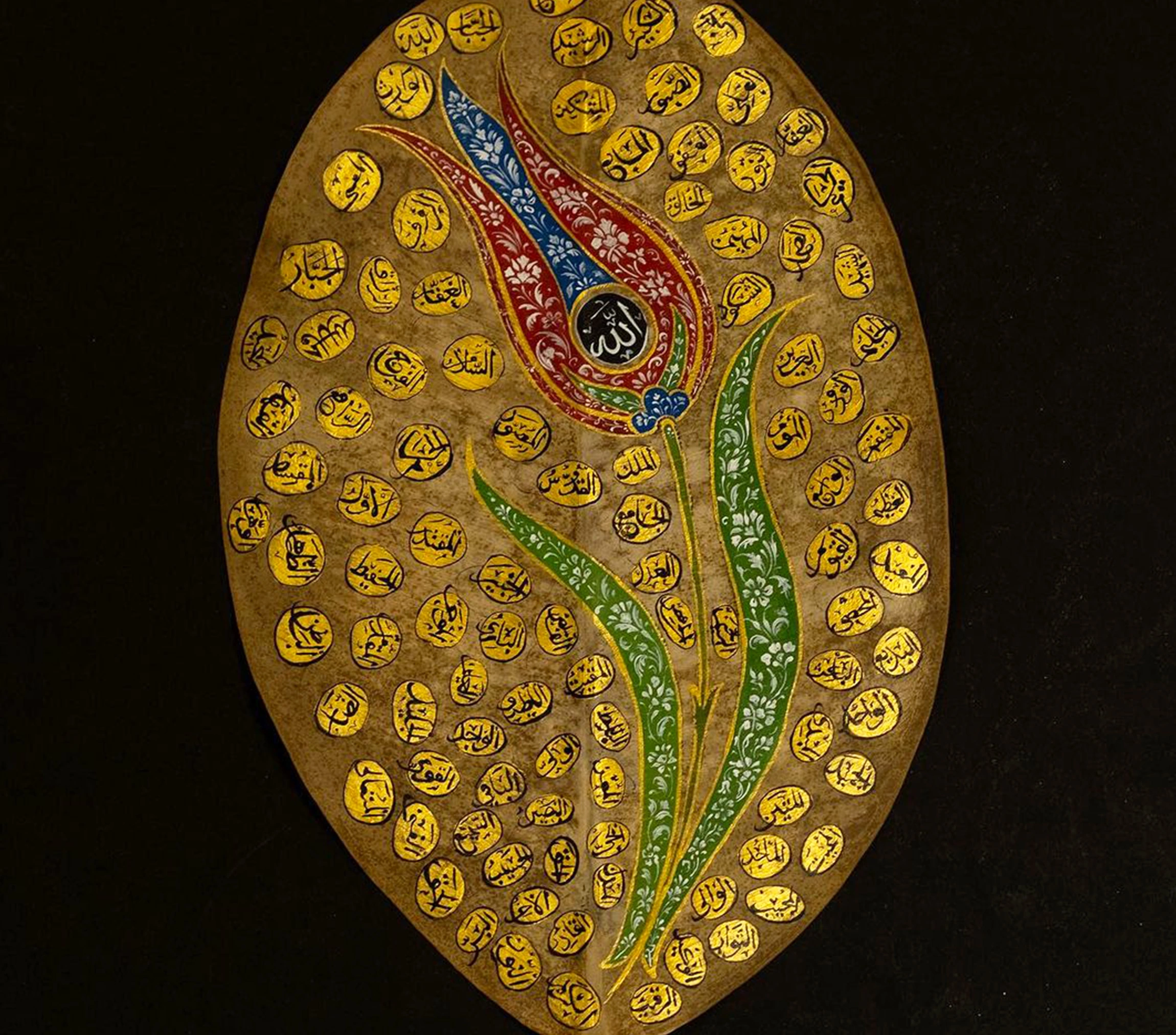 Zarif lale figürü tasarımıyla el yazması benzersiz Esma Ül Hüsna yaprak sanatı, her eve ilahi ve benzersiz hisler eklemek için mükemmel seçimdir. Allah'ın 99 İsmi'nin yazılı olduğu Esma Ül Hüsna yaprak sanatı usta bir işçilik gerektiren incelikli tasarımı ve altın renklerdeki dikkat çekici görseliyle sofistike bir İslami duvar dekorudur.