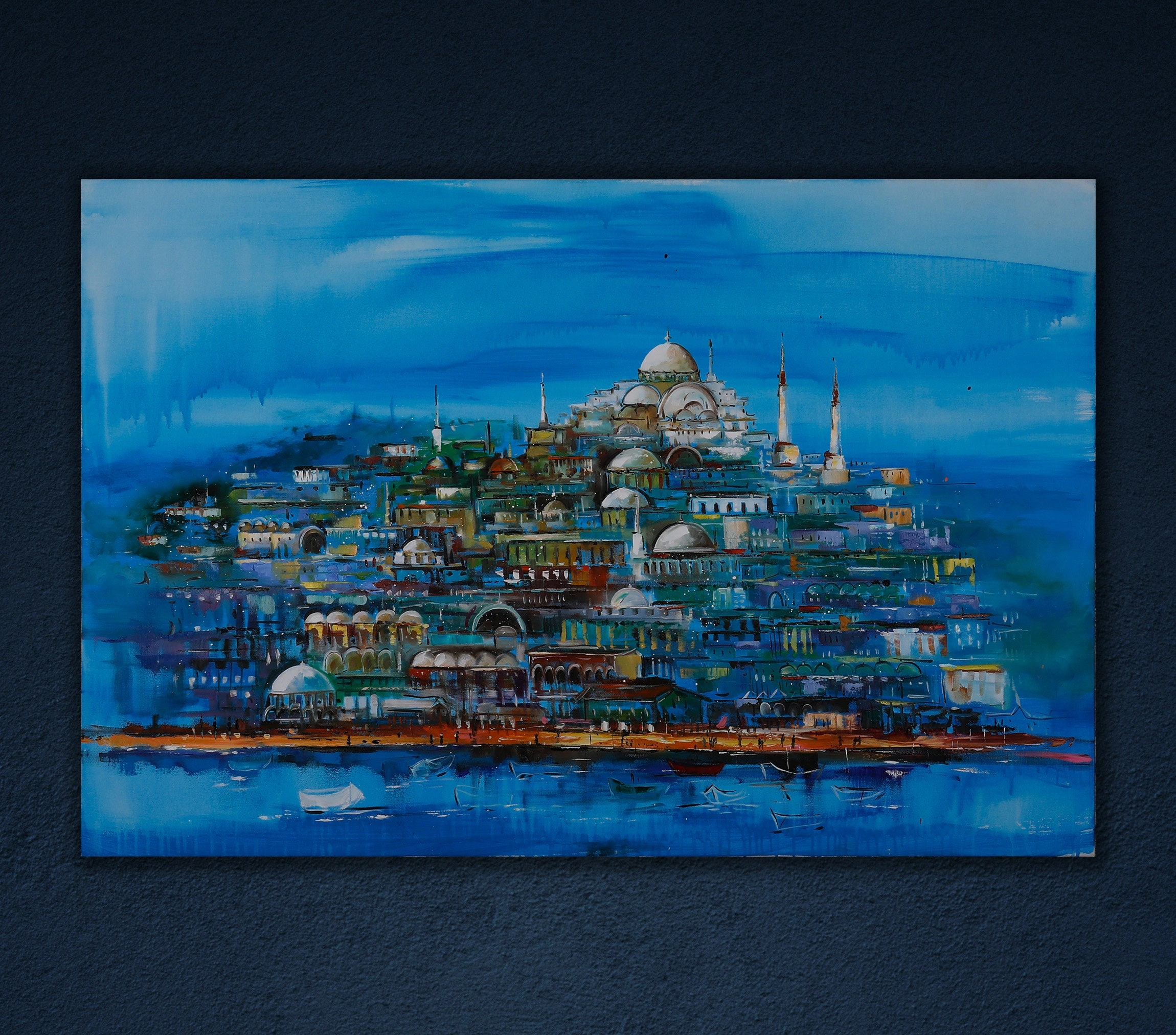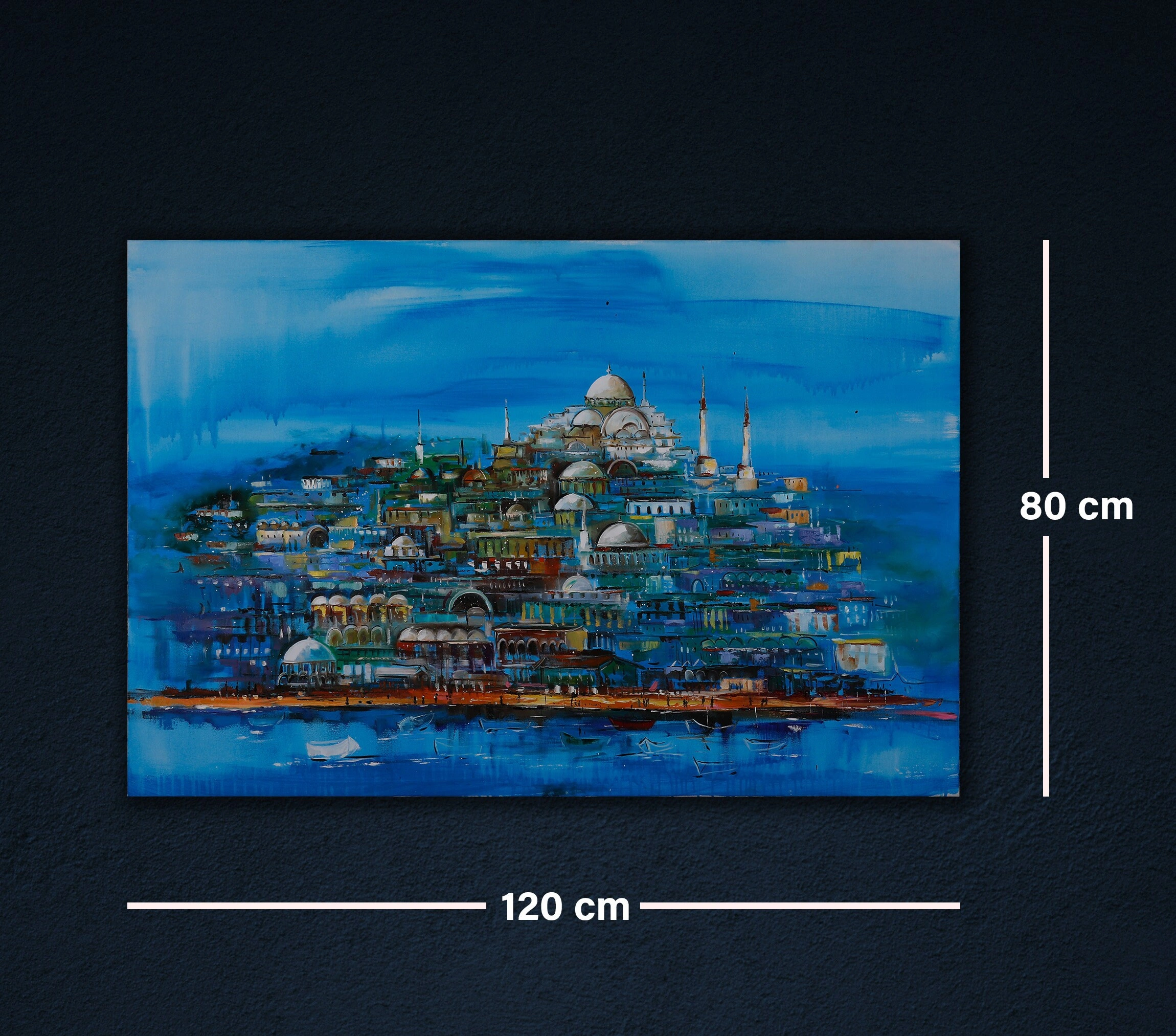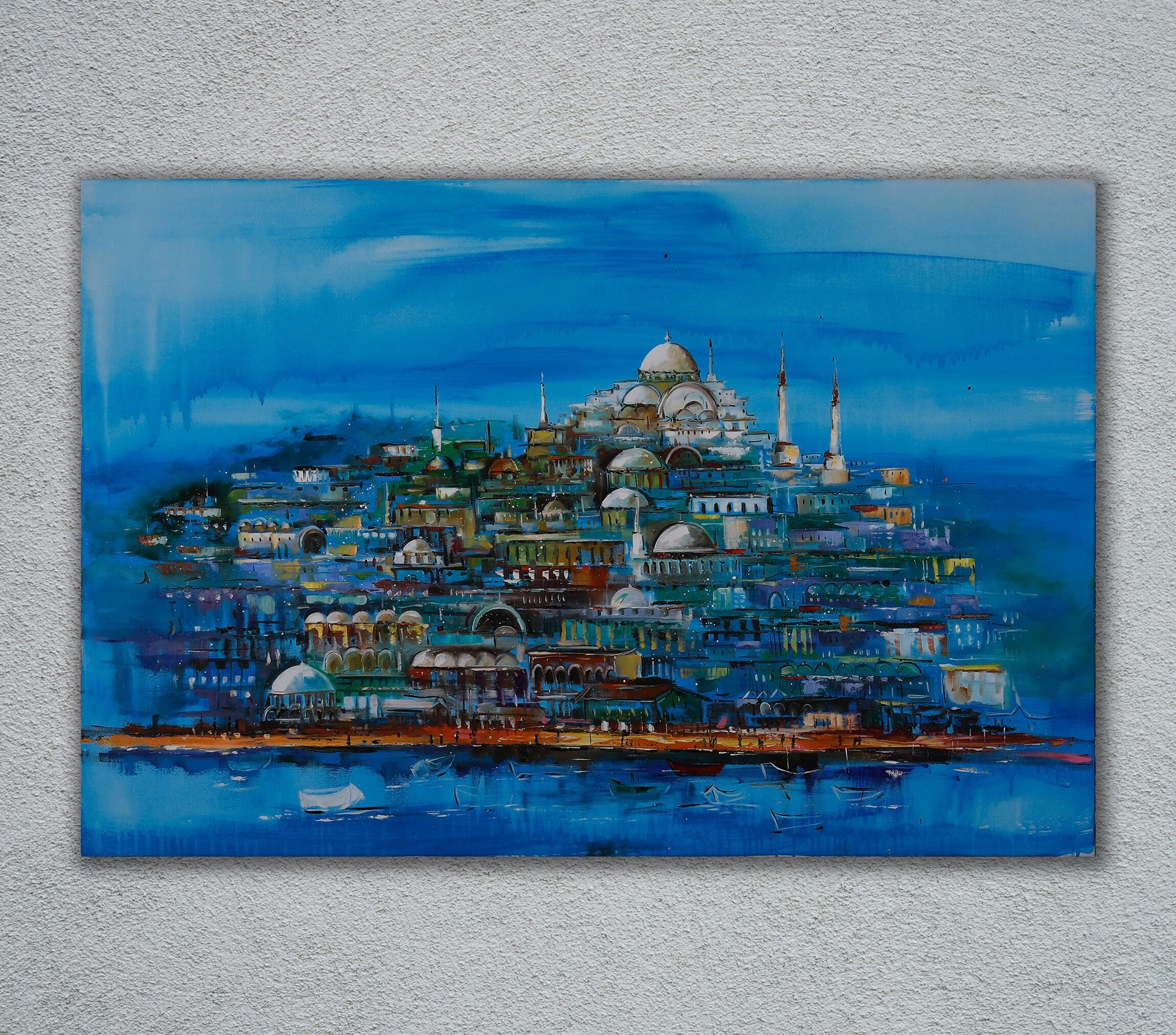 • Mavi İstanbul Kolajı Tuval Üzeri Yağlı Boya Tarihi Yarımada Manzaralı Mavi Kanvas Tablo İstanbul Galata Kulesi Resmi İstanbul Manzarası Mavi Tuval Eser