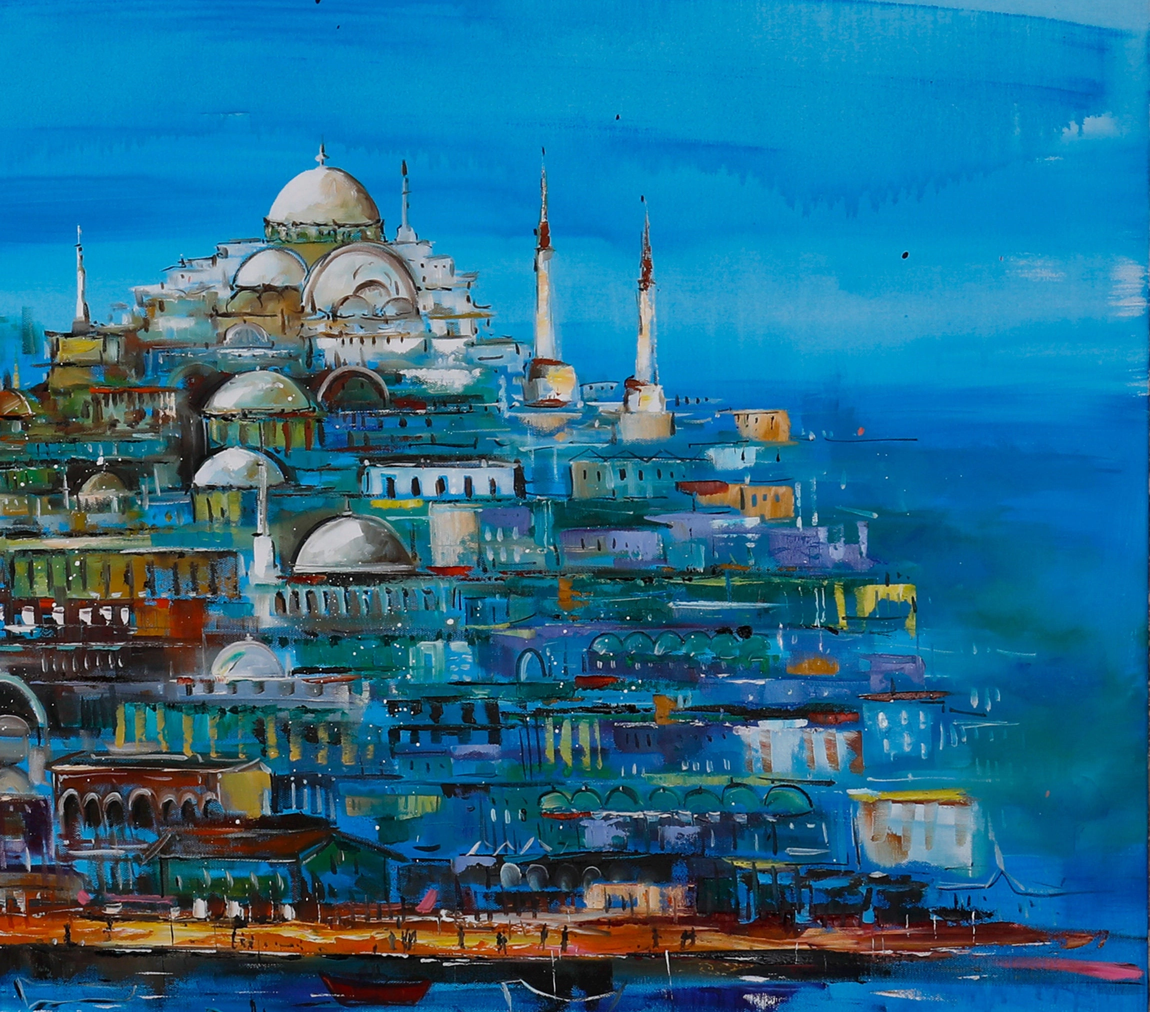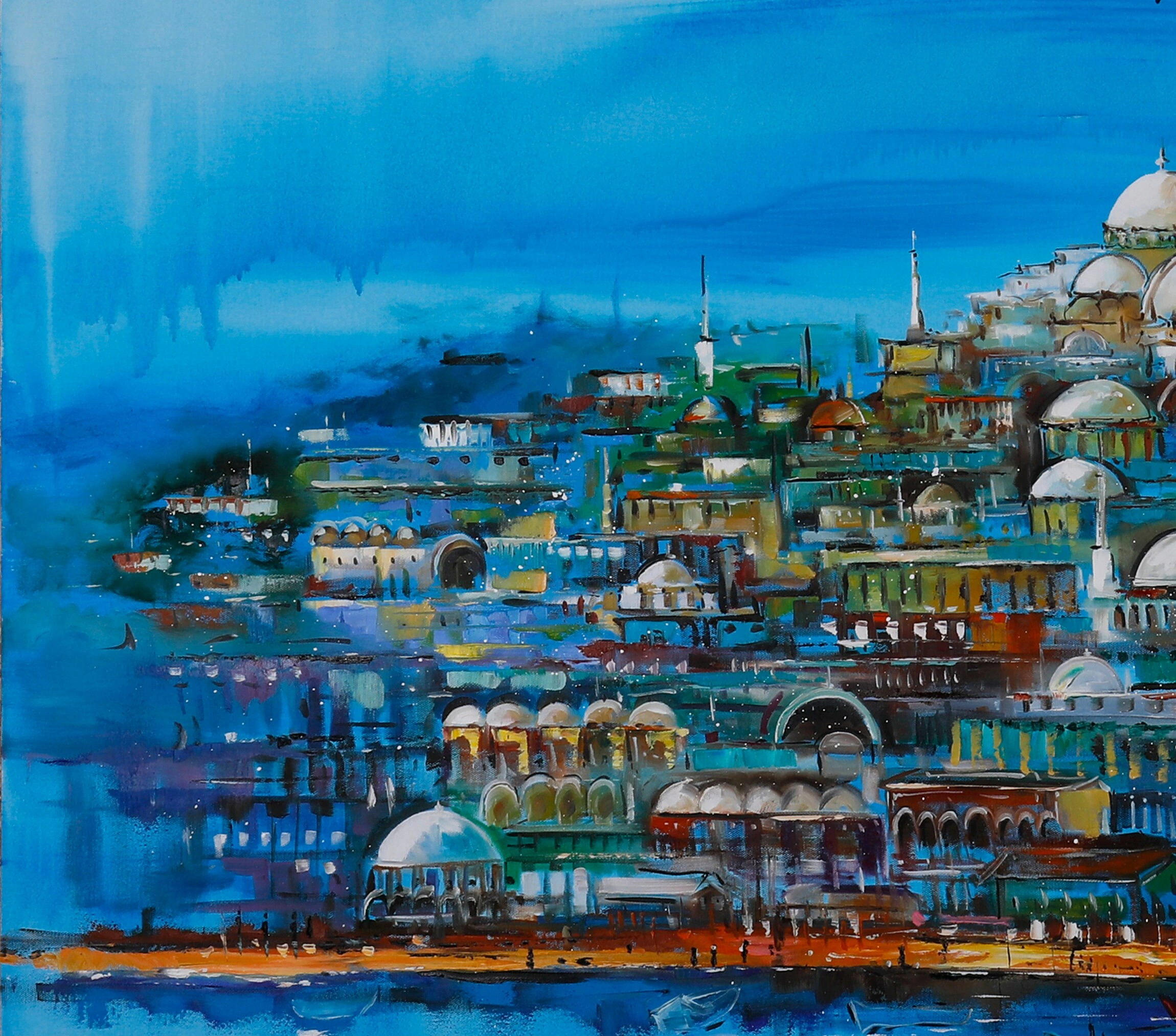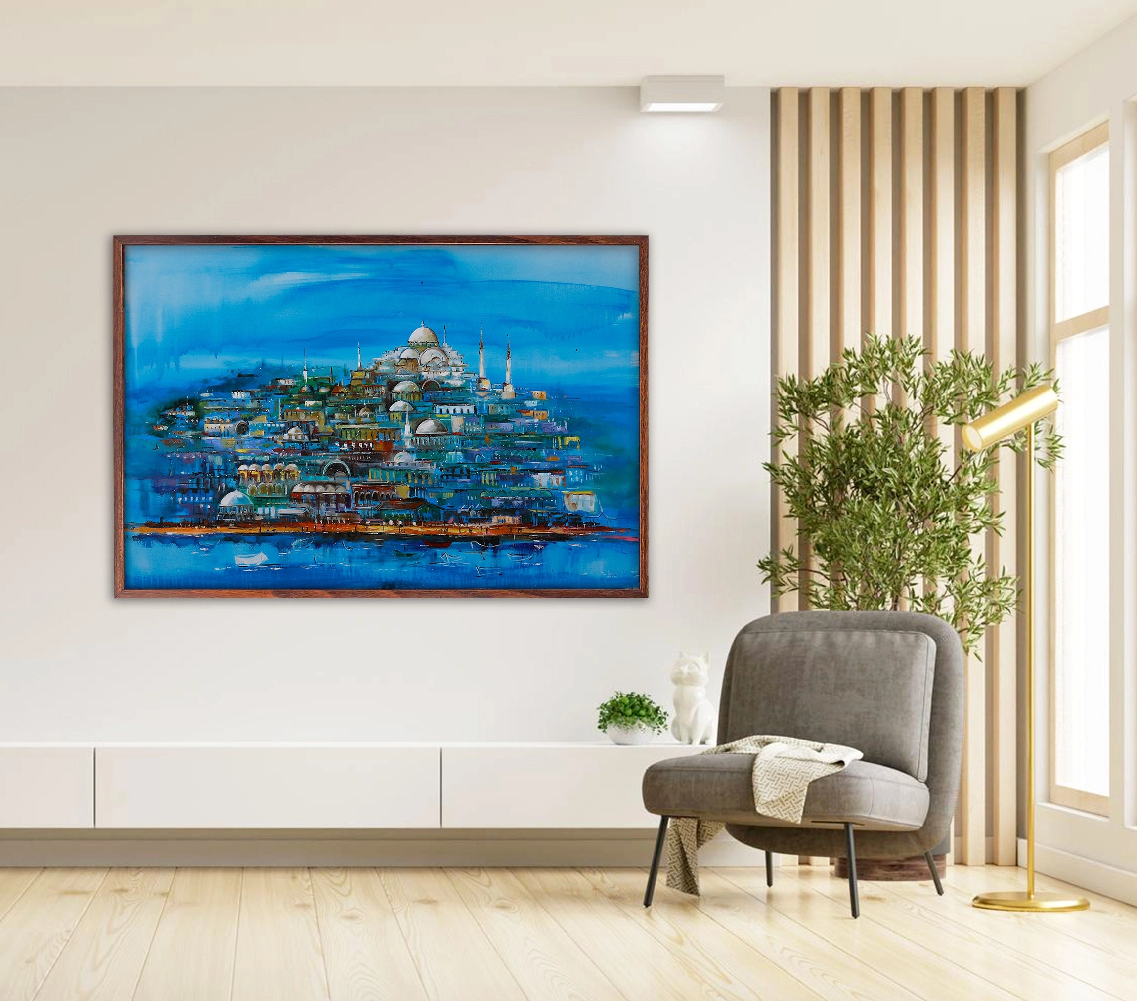 • Mavi İstanbul Kolajı Tuval Üzeri Yağlı Boya Tarihi Yarımada Manzaralı Mavi Kanvas Tablo İstanbul Galata Kulesi Resmi İstanbul Manzarası Mavi Tuval Eser