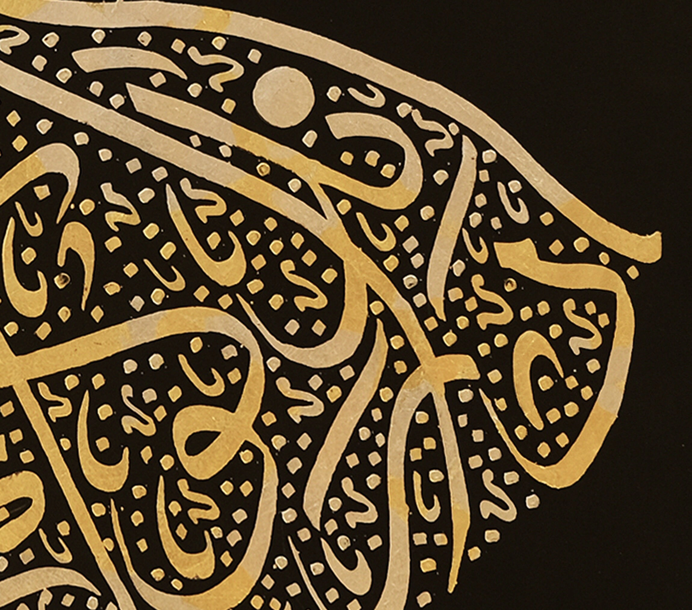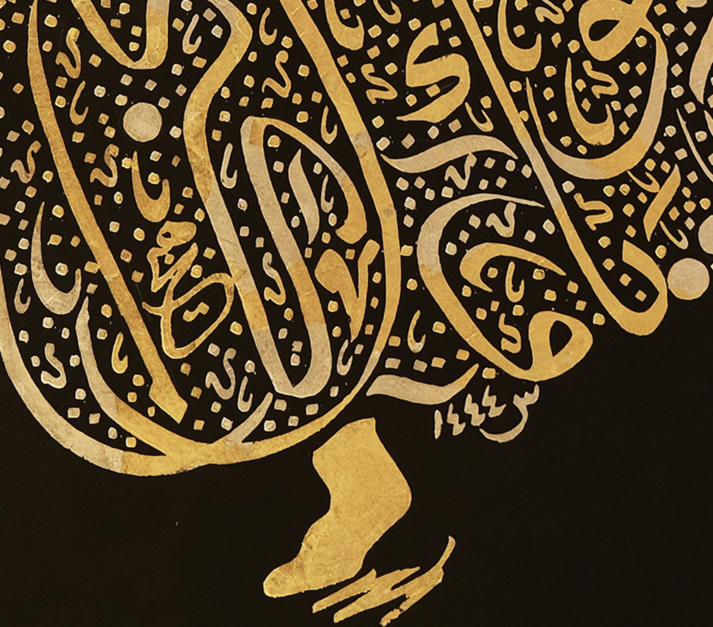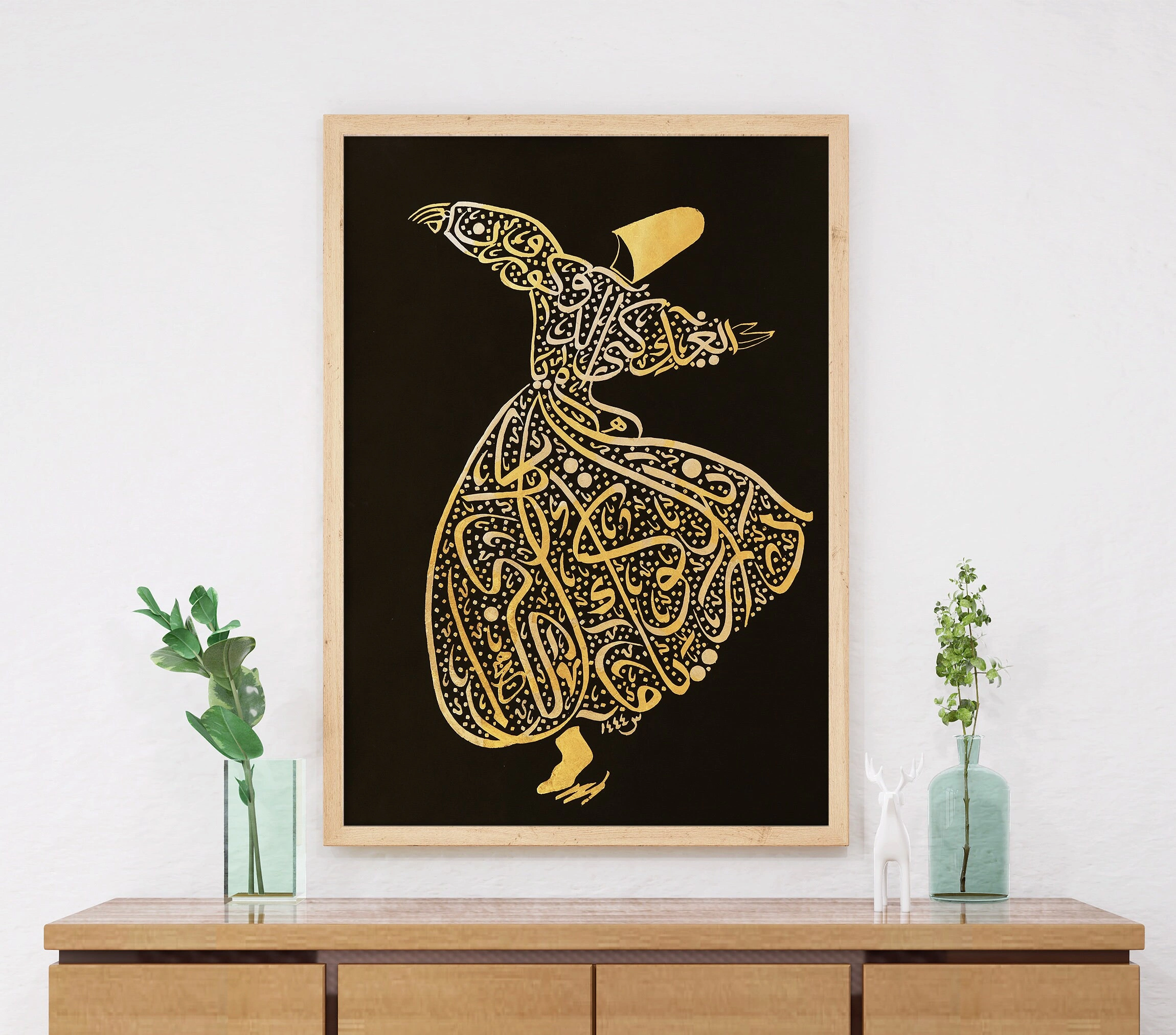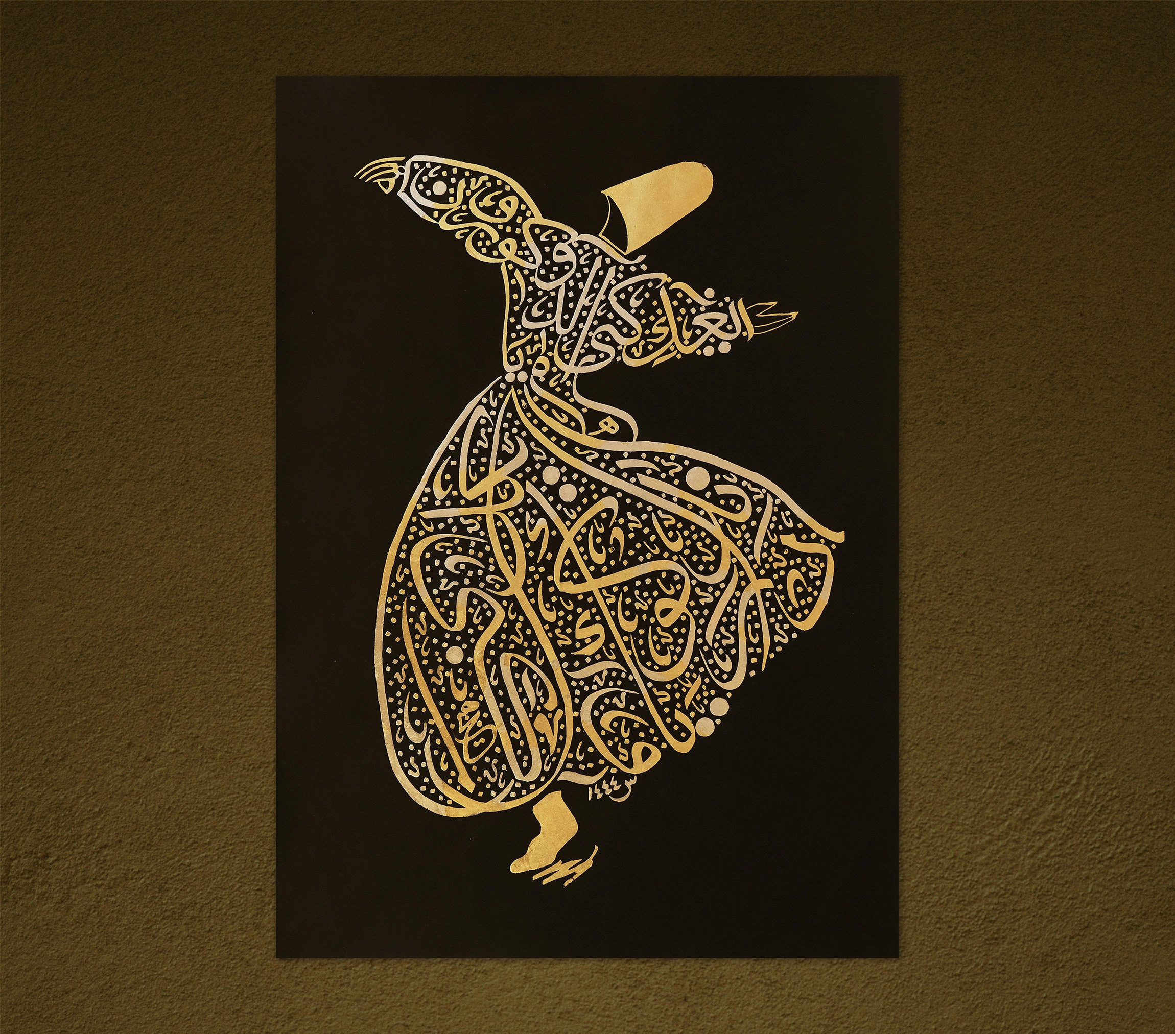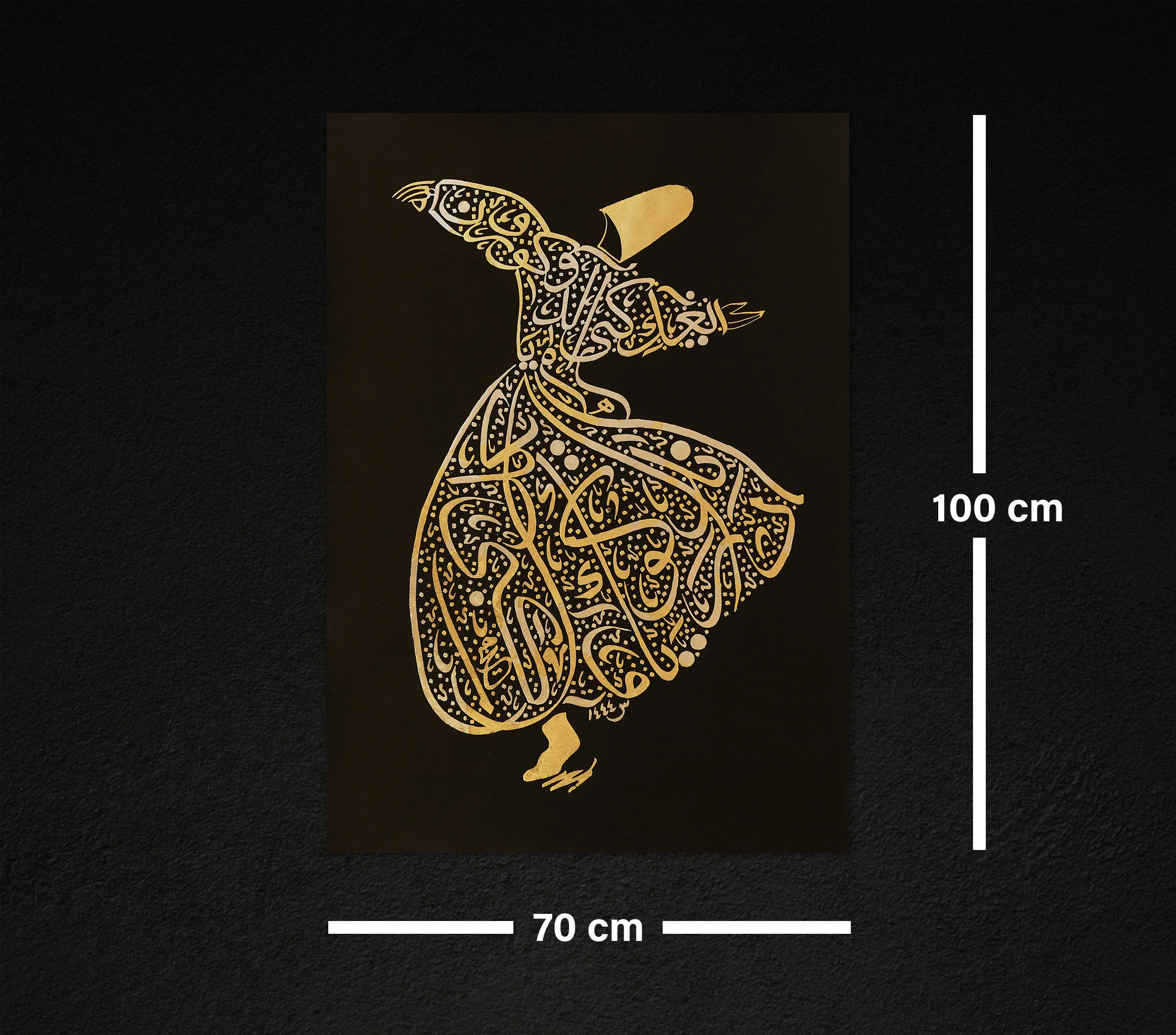 Merkezinde bulunan derviş, İslam'da somutlaşan ve yüzyıllarca süren kültür ve maneviyatın güzelliğini ve gizemini hatırlatıyor. Lüks dokusu ile bu altın İslami hat sanatı, her odaya sofistike bir dokunuş katacak. Bu zarif eserin zerafet ve güzelliğinin kendi yolculuğunuza ilham vermesine ve İslam ile bağınızı derinleştirmesine izin verin.
