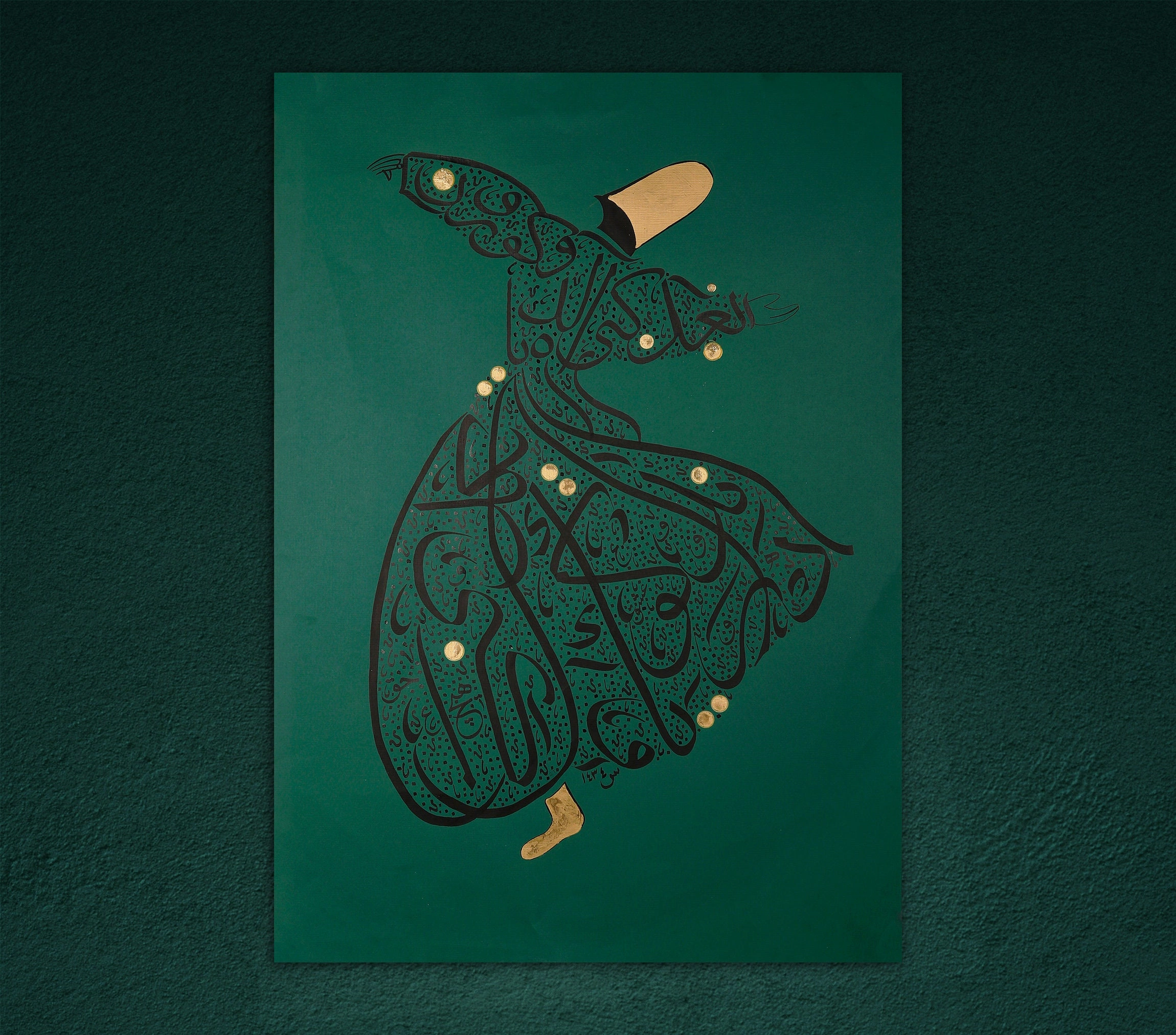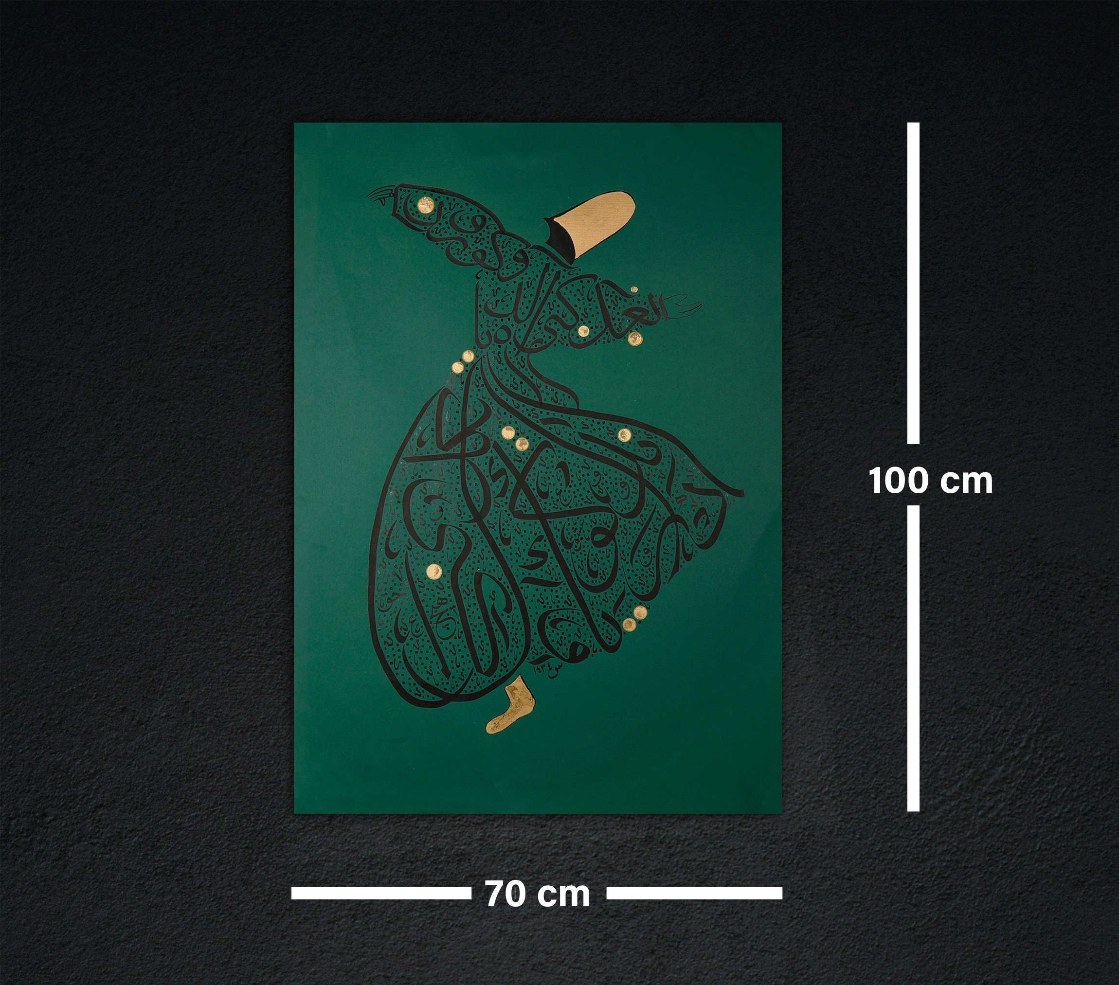 Mevlana Semazen Figürü Yeşil Hat Tablo 70x100 cm