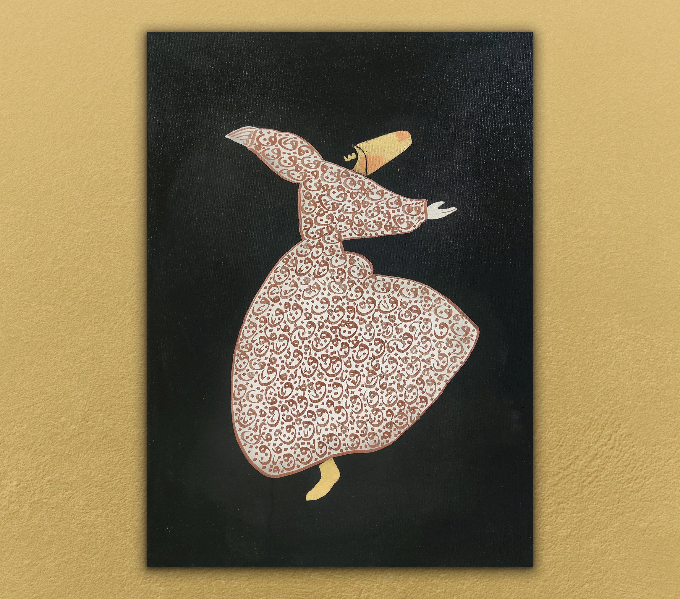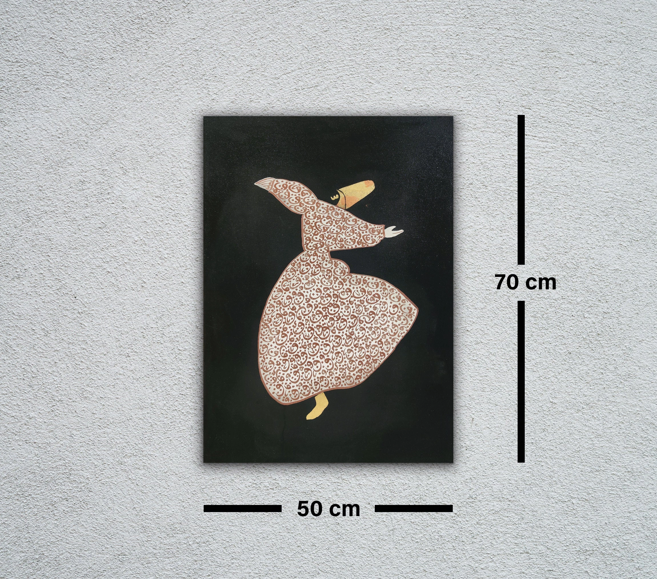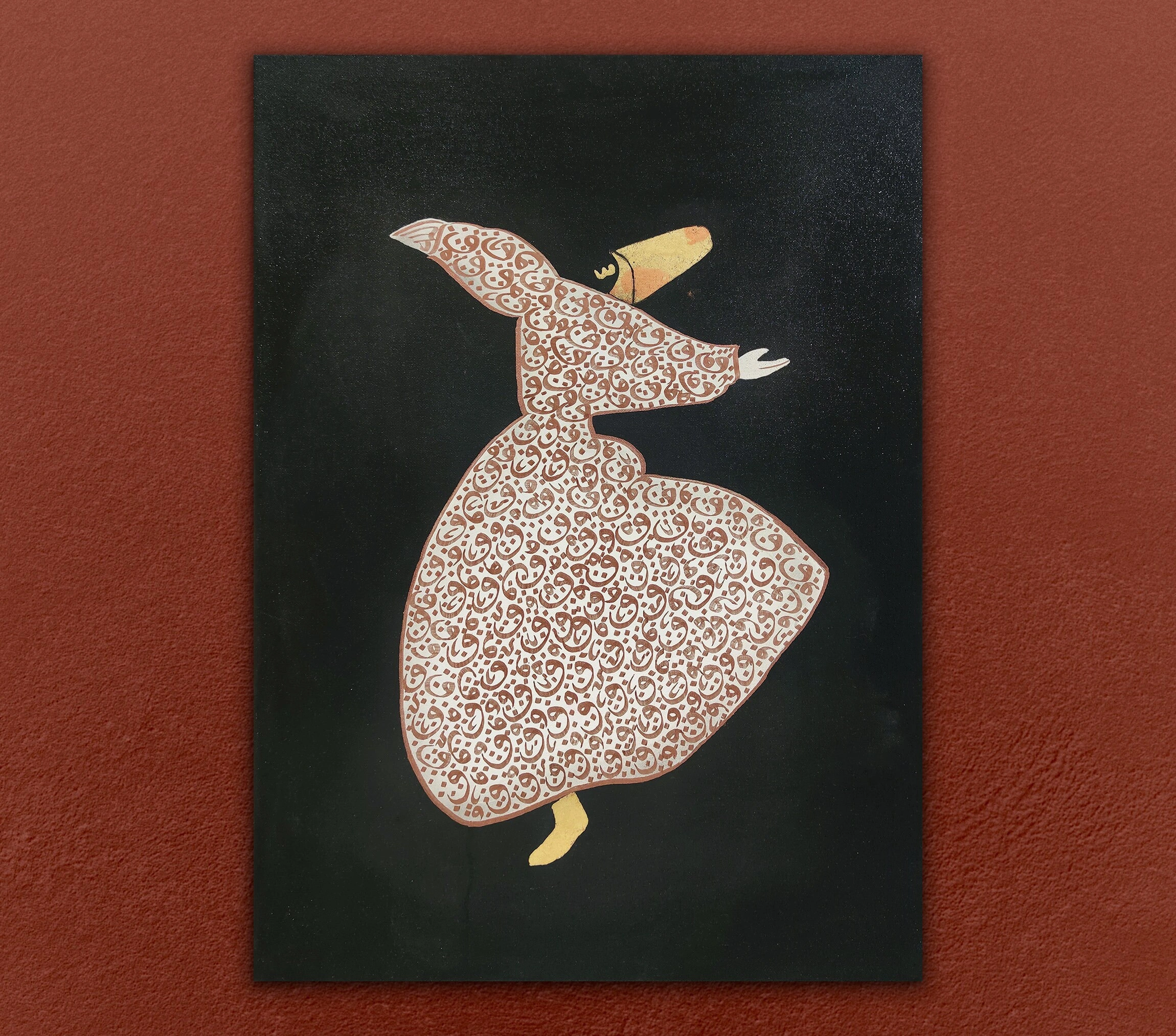 • Mevlana Semazen İslami Kaligrafi Tablo Doğal Kağıt Üzerine İs Mürekkebi ve Akrilik Arapça El Yazması İslami Hat Beyaz Kırmızı Derviş Duvar Dekoru