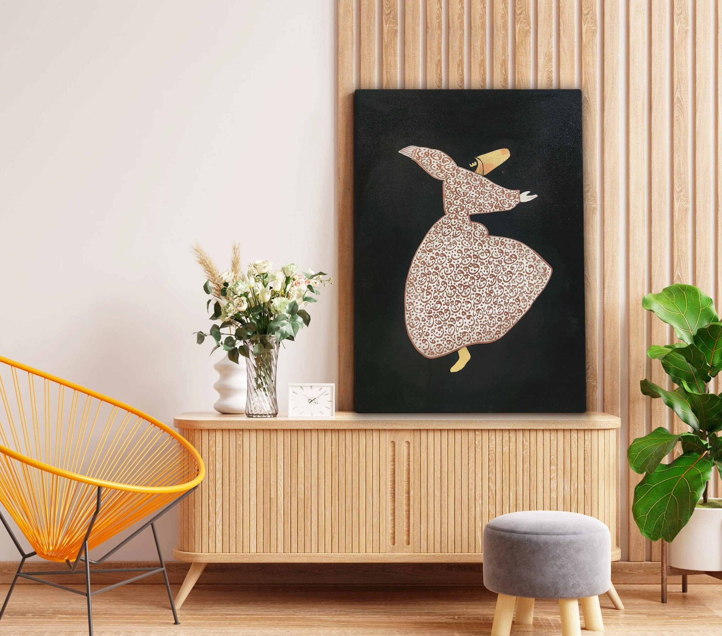 Doğal kağıt üzerine Mevlana semazen figürünün içine akrilik mürekkeple el yazması Vav işlenen bu özel eser, manevi yolculuğun zarif bir hatırlatıcısı olarak klasik ve modern dokunuşların bir karışımını bir araya getiriyor. Geleneksel Türk sanatından ve Osmanlı'nın süsleme sanatlarından ilham alan bu göz alıcı semazen eseri, harika bir sohbet başlatıcı olacak. Göz kamaştırıcı ince işçiliği ve kusursuz İslami hat yazımıyla, detaylı desenlerin arka planla yarattığı kontrast, bu güzel parçanın zeminini oluşturuyor. Merkezinde bulunan Mevlana derviş figürü, İslam'da somutlaşan ve yüzyıllarca süren kültür ve maneviyatın güzelliğini ve gizemini hatırlatıyor. Lüks dokusu ile bu beyaz ve kırmızı tonlardaki Arapça kaligrafi hat eser, her odaya sofistike bir dokunuş katacak. Bu zarif eserin zarafet ve güzelliğinin kendi yolculuğunuza ilham vermesine ve İslam ile bağınızı derinleştirmesine izin verin.