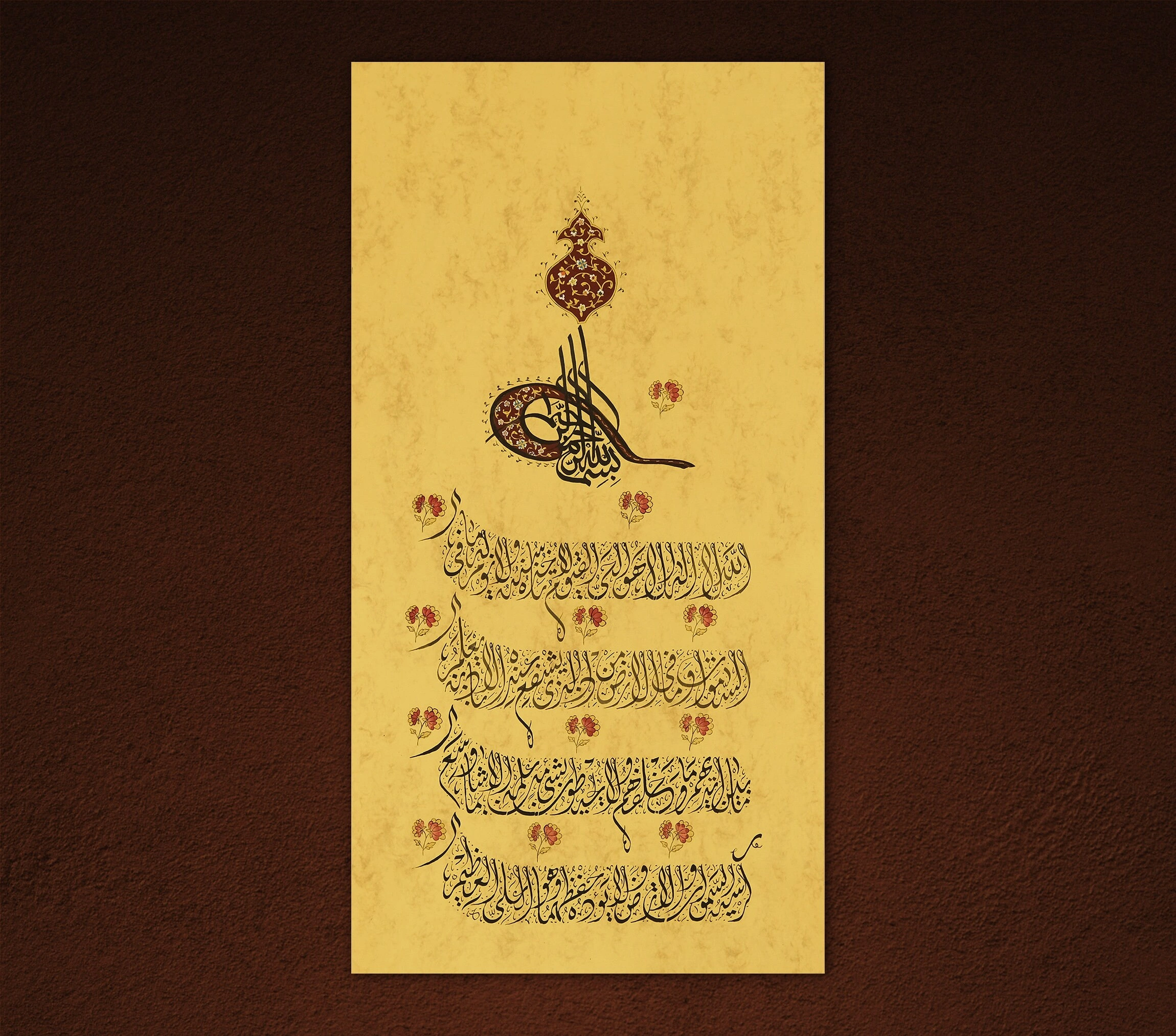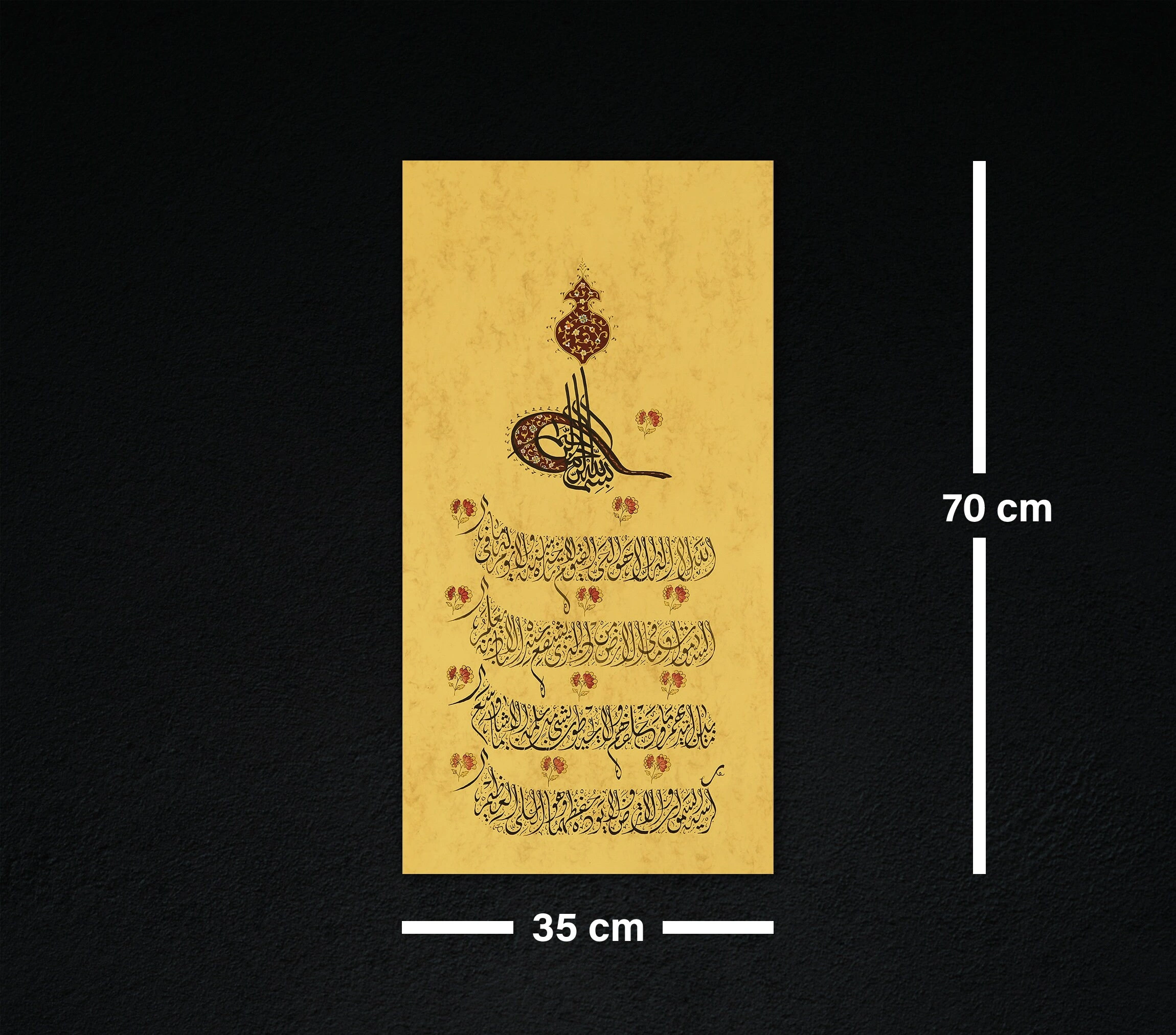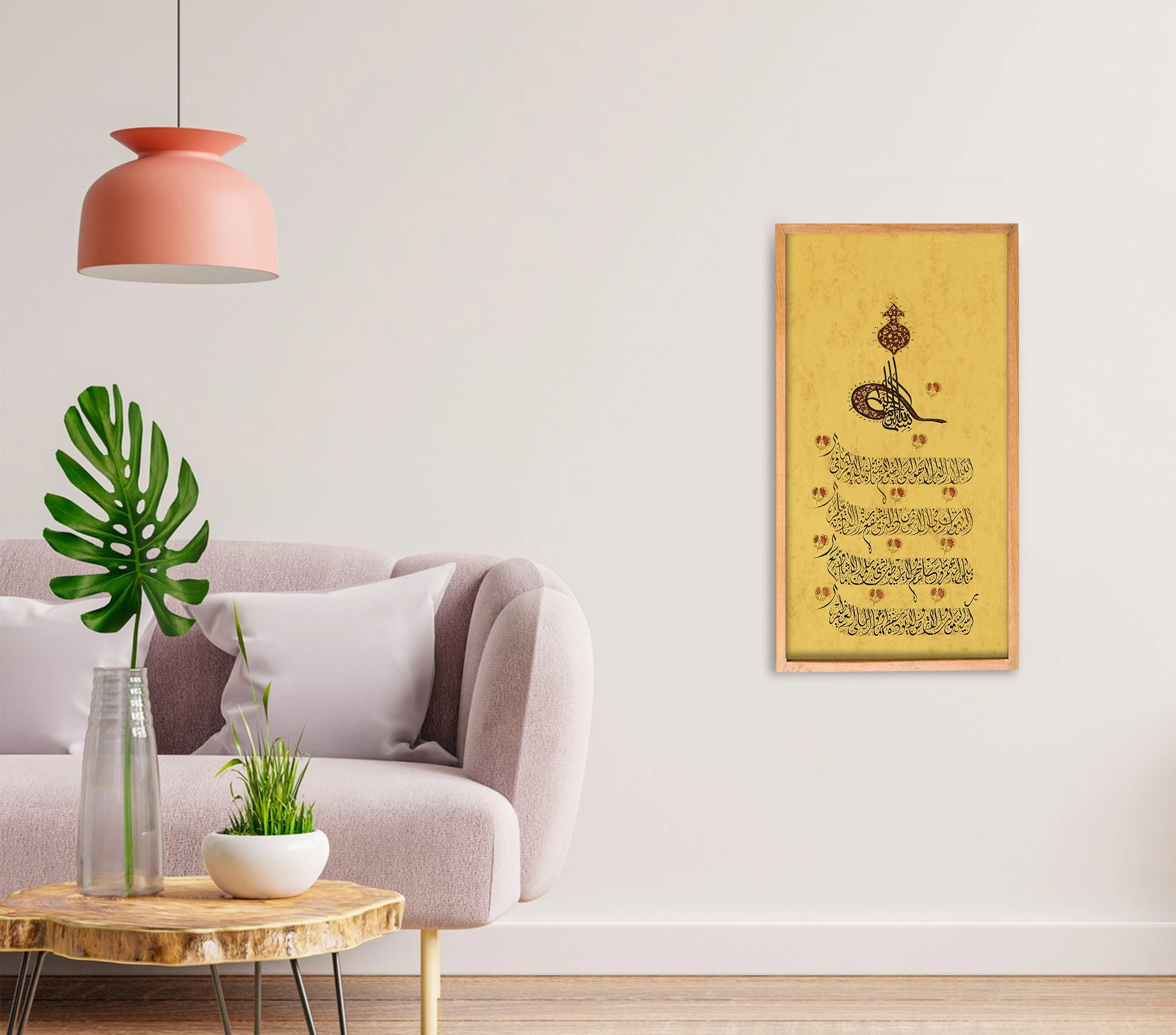 El Yazması Osmanlı fermanı, aharlı doğal kağıt üzerine is mürekkebiyle yazılan ve tezhip çalışması işlenen ev ve ofis dekorasyonunuza zarafet katacak doğru bir seçimdir. Osmanlı tarzında İslami hat sanatıyla elde yazılmış olan bu dekoratif tablo, evinizin her odasına gösterişli bir güzellik katabilen bir sanat yapıtıdır. El yazması Osmanlı fermanı ince ayrıntılarla ve geleneksel Arapça kaligrafiyle süslenmiş yüksek kaliteli malzemelerden el işçiliğiyle imal edilmiştir. Bu zarif sanat eseri, aharlanmış doğal ince kağıt üzerine is mürekkebi ve akrilik mürekkep kullanılarak yazılmış, tezhipinde ise altın varak kullanılan Osmanlı İmparatorluğu'nun fermanlarından esinlenmiştir. Kağıt üzerindeki ince ayrıntılara sahip İslami metni mükemmel bir şekilde yakalayan bu el yazması Osmanlı fermanı gerçekten de lüks bir görünüme sahip. Oldukça ince olan, doğal ve eskitilmiş kağıt aslına sadık olup metnin zarif görünümünü korurken öne çıkmasını sağlar. Bu göz alıcı vintage belge, Müslüman temalı dekorunuza bir sıcak ve zengin bir dokunuş katacak. Osmanlı döneminin ihtişamlı ve zamansız bir hatırası olarak salona, şömine üzerine, ya da oturma odanıza asın. Tarih tutkunuzu ve kökenlerinizi kendinize hatırlatmak için çalışma odanızın veya kütüphanenizin rafına koyun. Ayrıca tüm bunların yanında hayranlık uyandıran bir sanat eseri olarak da tadını çıkartabilirsiniz. Nasıl sergilemeyi seçerseniz seçin, el yazması Osmanlı Fermanı her eve gerekli mükemmel bir dokunuş olacaktır.