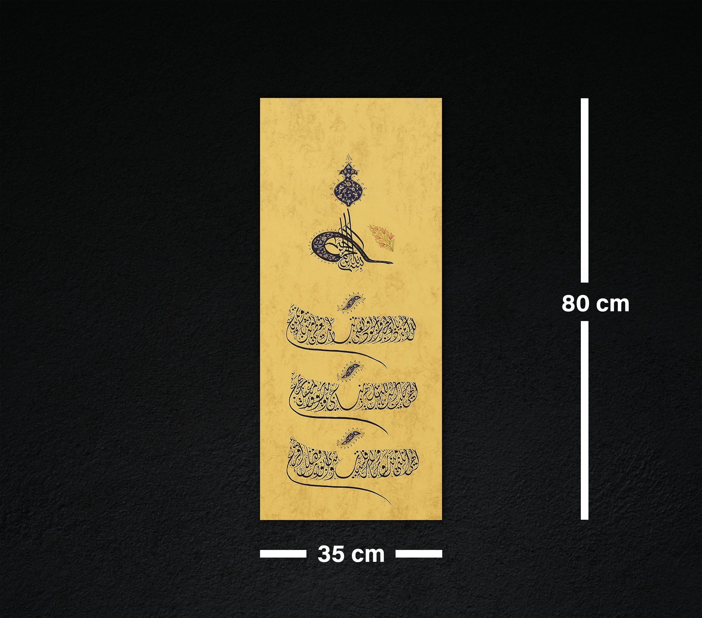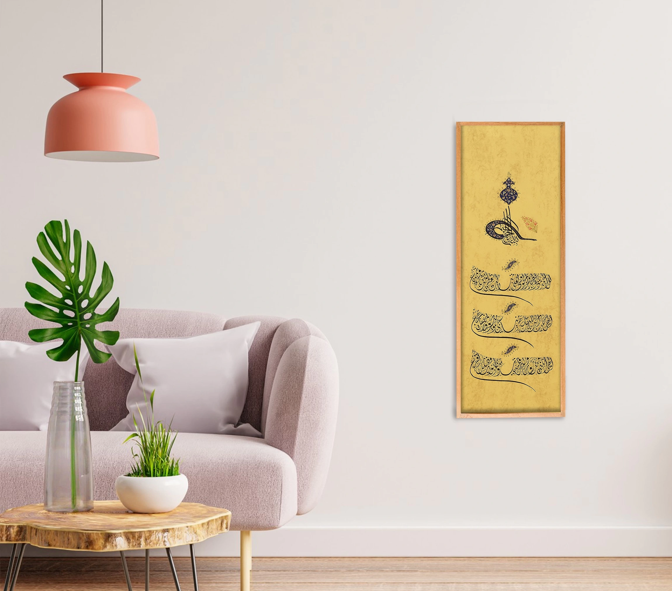 Osmanlı fermanı formundaki el yazması ayet, sergilendiği her alana sofistike bir dokunuş katarak, sadece inanç ve maneviyatın bir sembolü olmakla kalmaz, aynı zamanda inançlarımızı ve bu dünyadaki yerimizi de hatırlatır. El yazması Ayet İslami kaligrafi tablo gerçekten de benzersizdir ve her odaya özel bir zarafet ve incelik dokunuşu getirir. Zamana meydan okuyan tasarımı ve güçlü bir inanç hatırlatıcısı olmasıyla kesinlikle bir sohbet başlatıcı olacak ve her eve huzur getirecek.