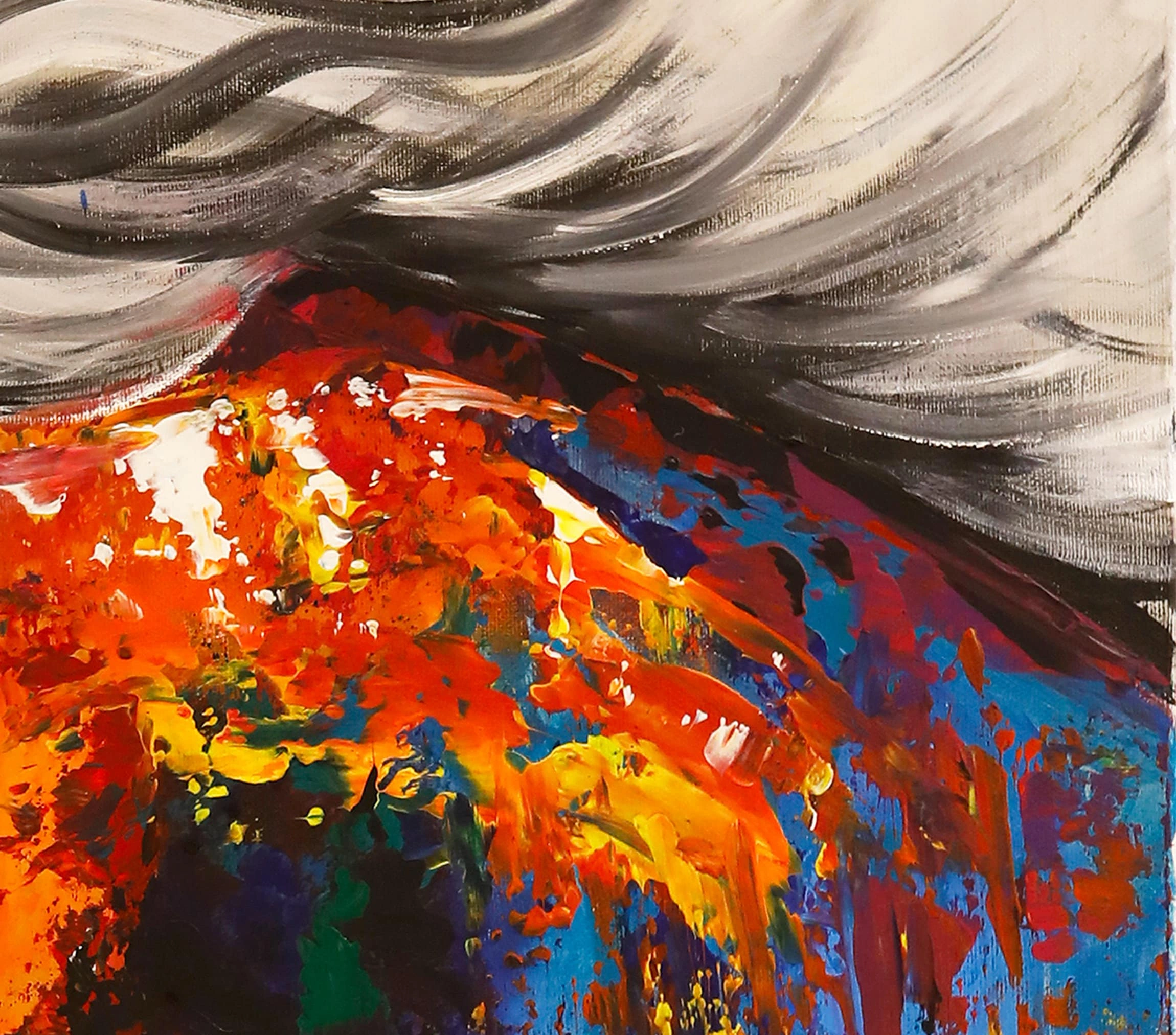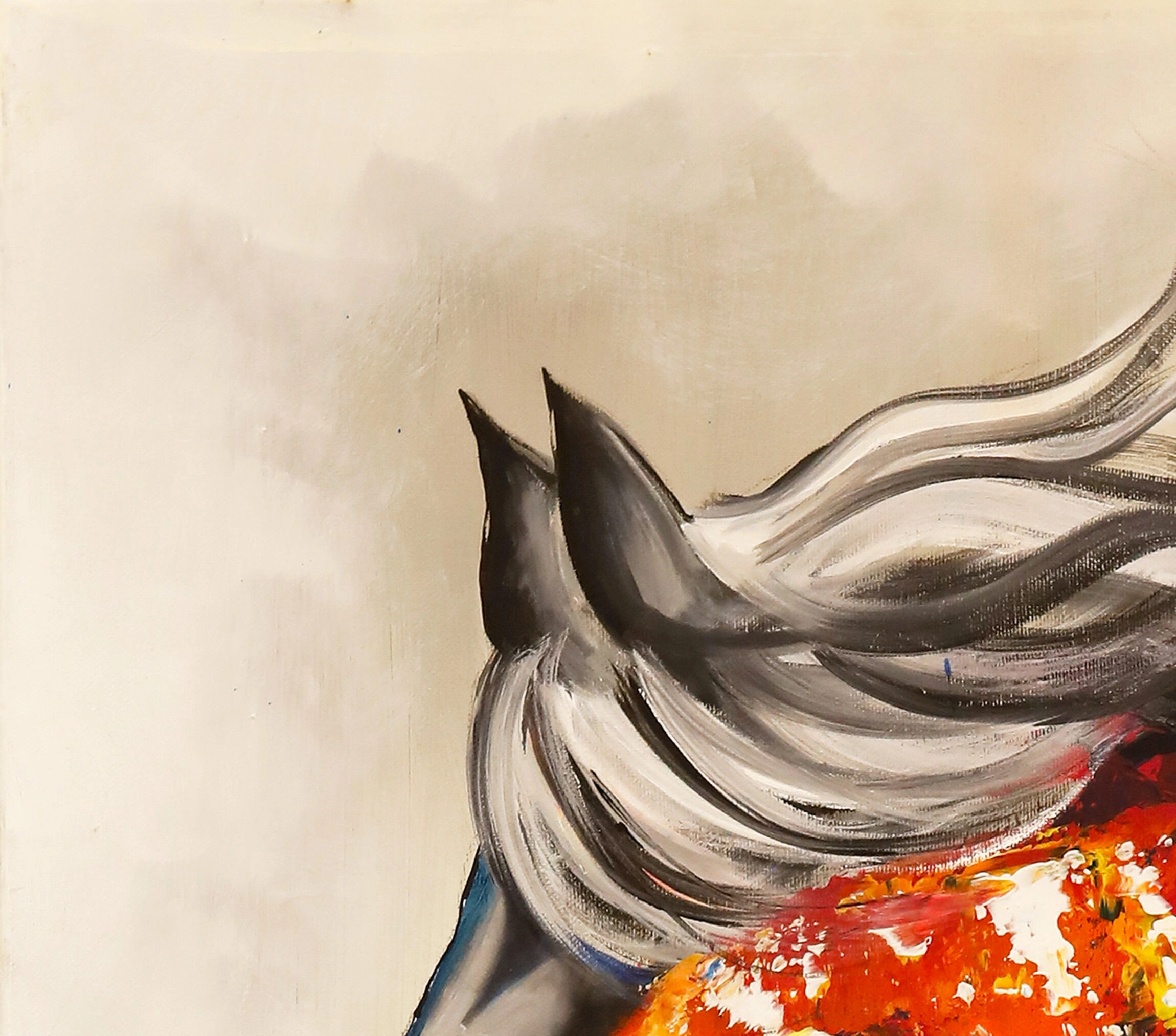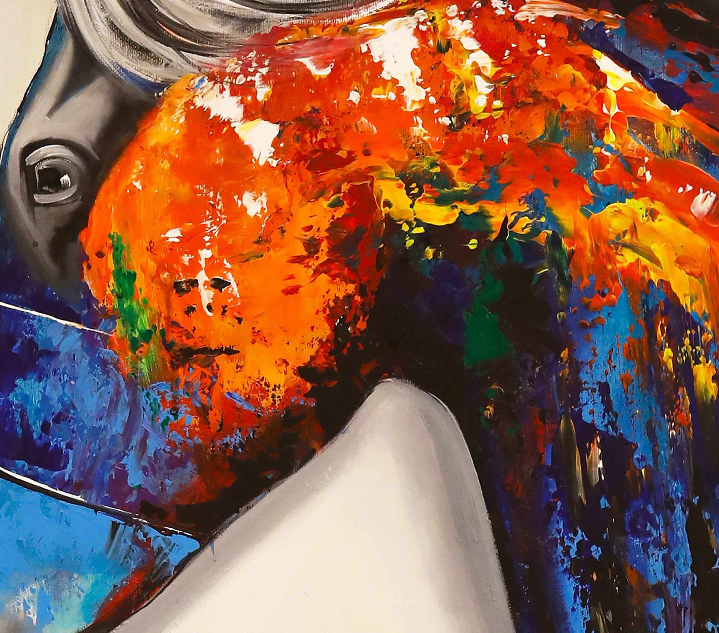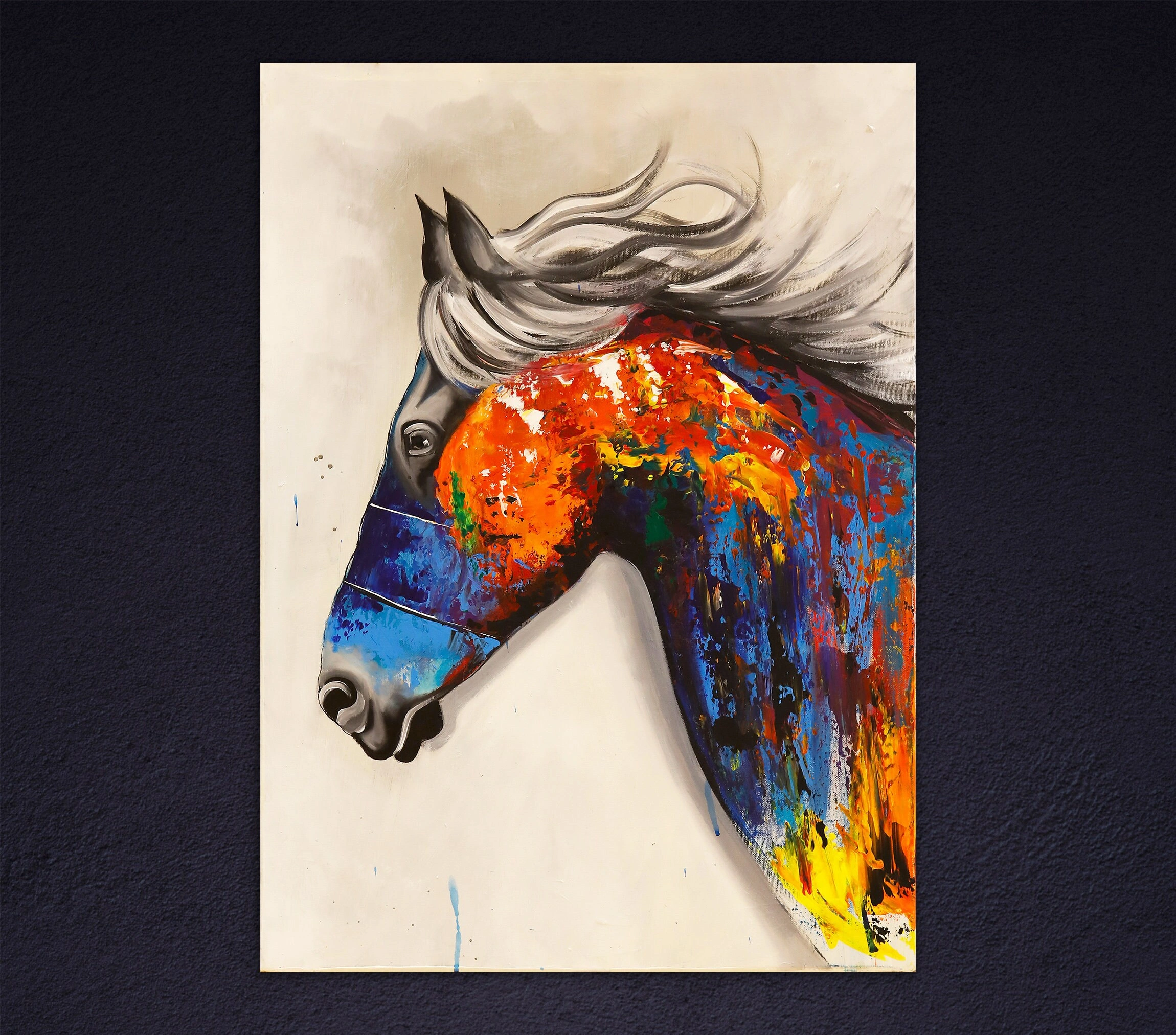 Tuval üzerine yağlı boya renkli at kanvas tablonun canlı ve büyülü dünyası, yaratıcı ruhunuzun yükselmesini sağlayacak. Bu olağanüstü renkli at resminin gökkuşağınu andıran uyum içinde harmanlanmış renkleri kırmızı, mavi, turuncu ve sarının eşsiz tonlarıyla ön plana çıkıyor. Bu at tablosu, yüksek kaliteli yağlı boyalarla elde boyanmış canlı renkleriyle atın güzelliğini tüm görkemiyle yakalar. Güçlü fırça darbeleri ve ayrıntılı işçiliği ile bu tablo zamansız bir değere sahip. Bu eser hem estetik açıdan hoş hem de sohbet başlatan bir eserdir. Bu eşsiz at portresi, izleyicileri kendine çeken ve atların görkemli güzelliği üzerinde düşünmelerini sağlayan göz alıcı bir kaliteye sahiptir. Oturma odanıza, çocuk odanıza veya mutfağınıza asın bu renkli at tablosu, her eve mükemmel bir katkıdır.