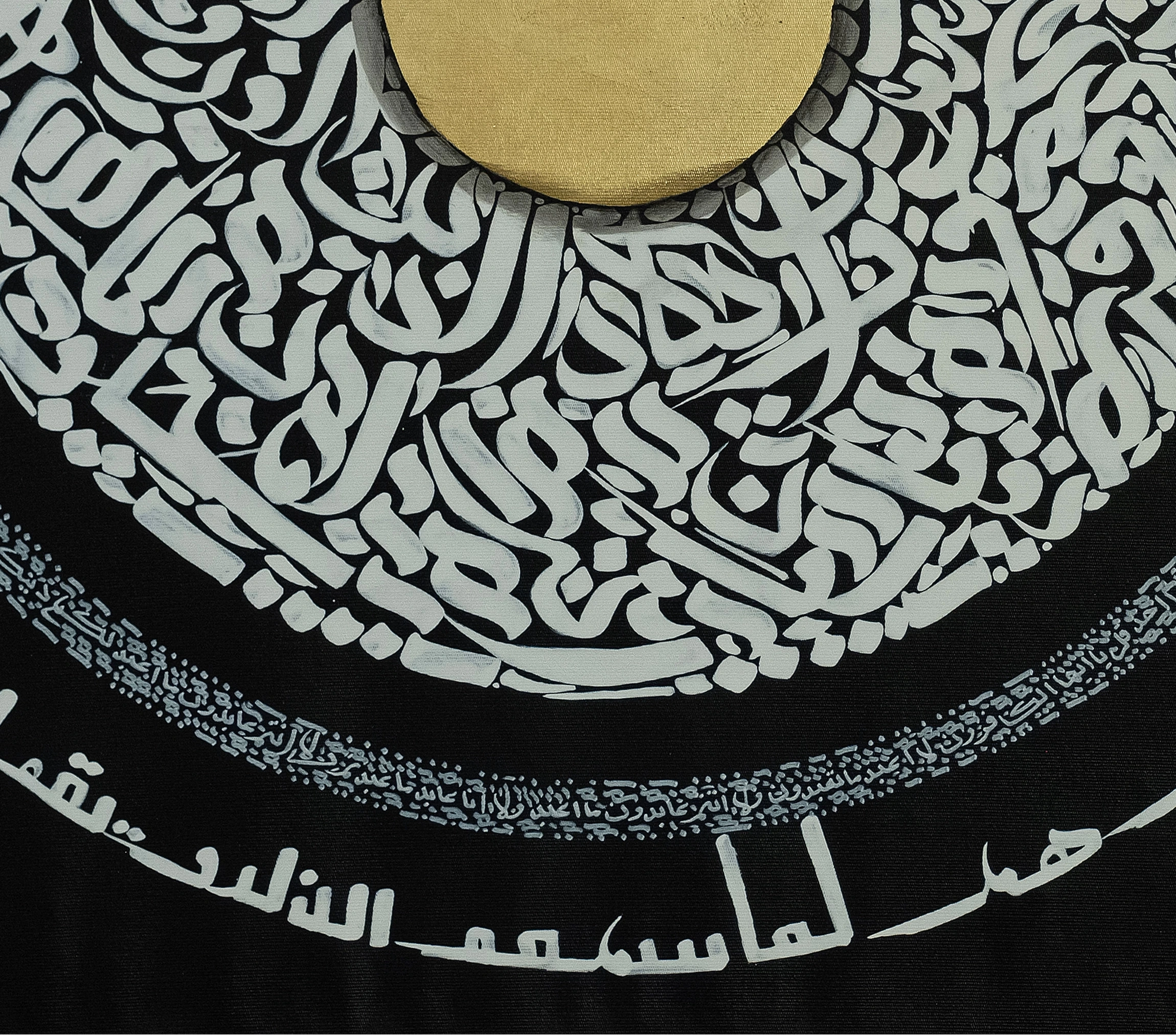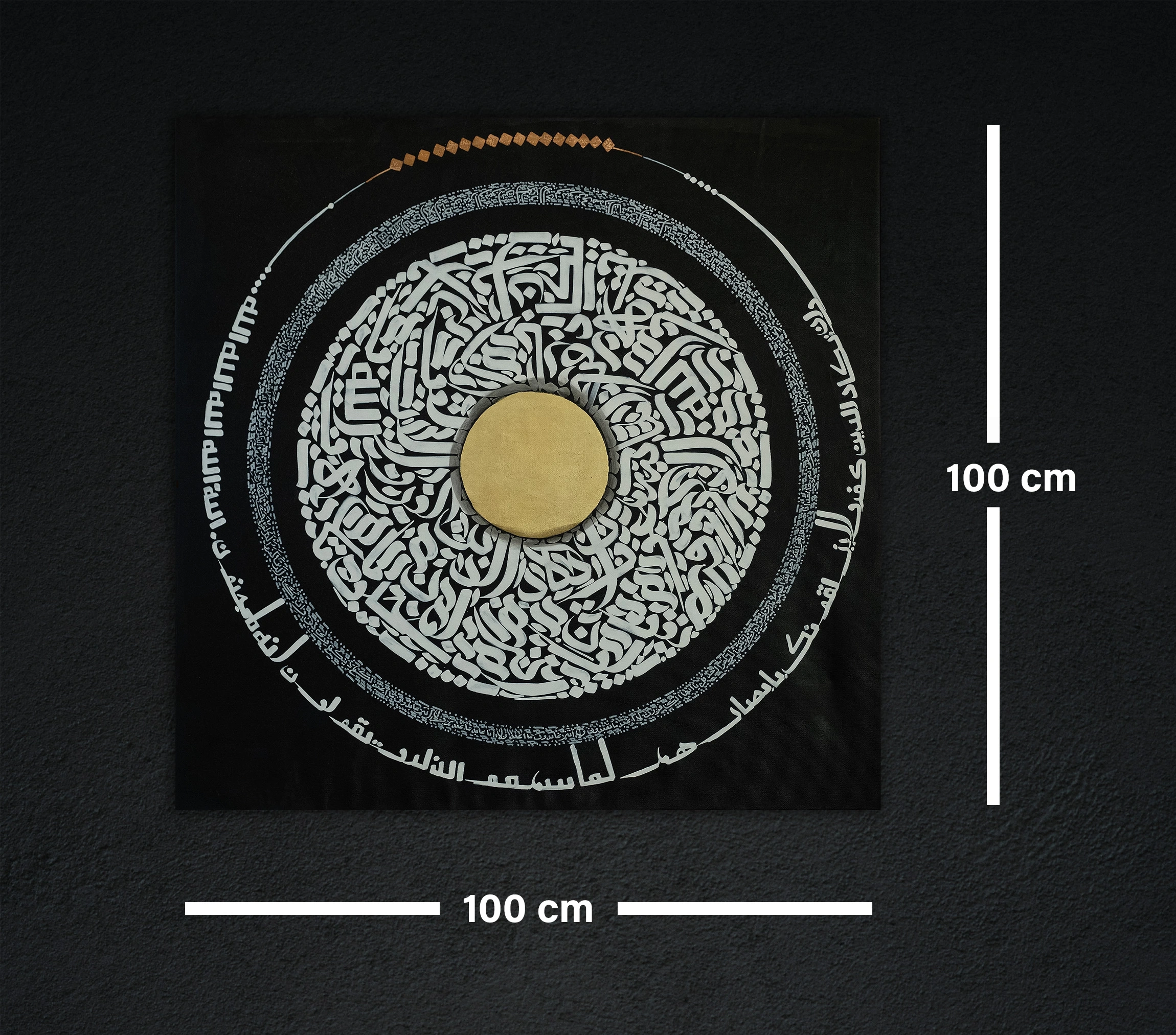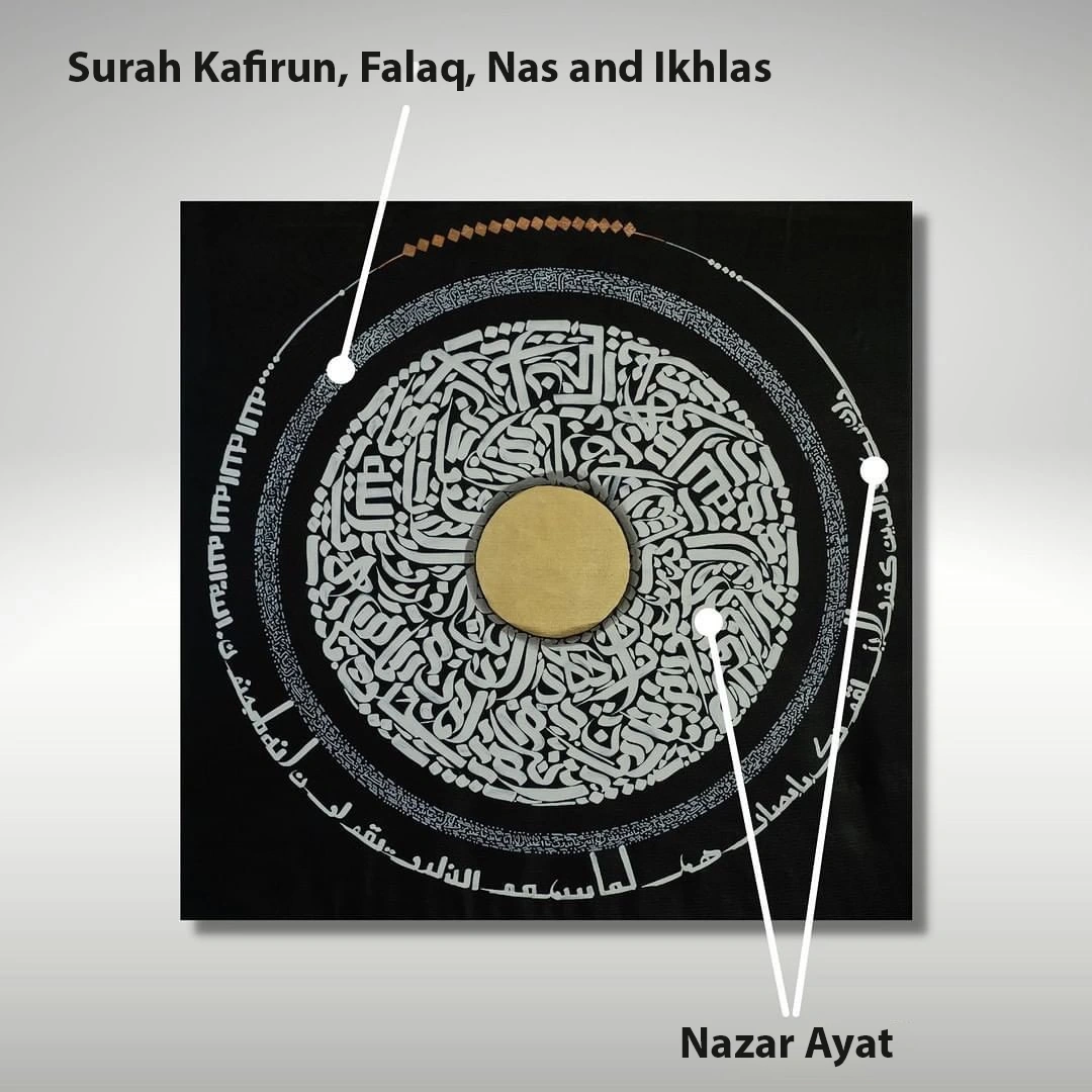 This modern Islamic calligraphy canvas art features the 4 protective surahs known as the 4 Quls and Ayatul Nazar, all hand written in a modern circular pattern.