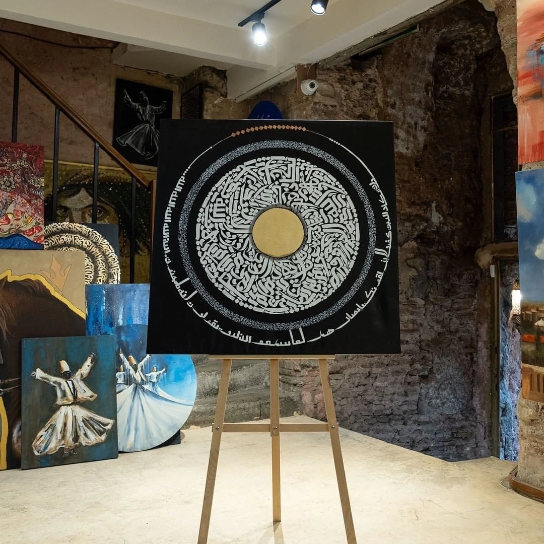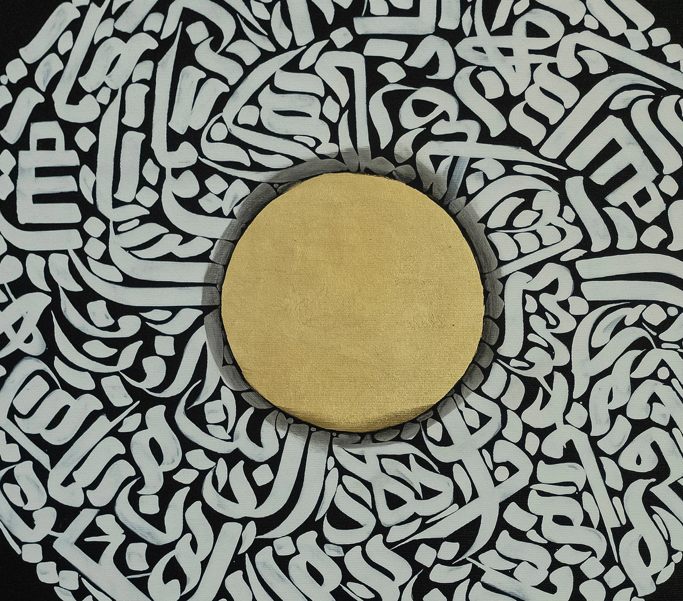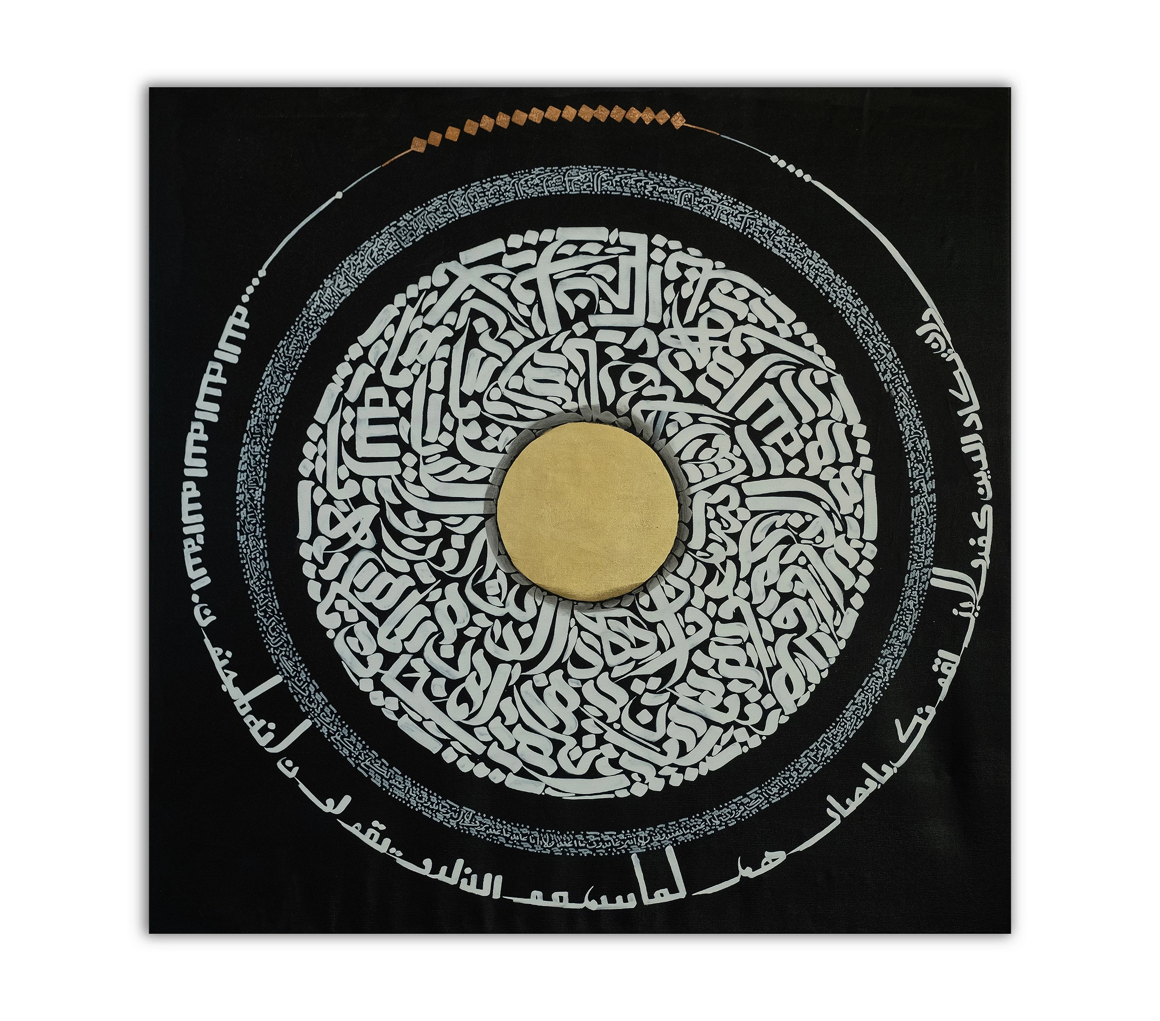This modern Islamic calligraphy canvas art features the 4 protective surahs known as the 4 Quls and Ayatul Nazar, all hand written in a modern circular pattern.