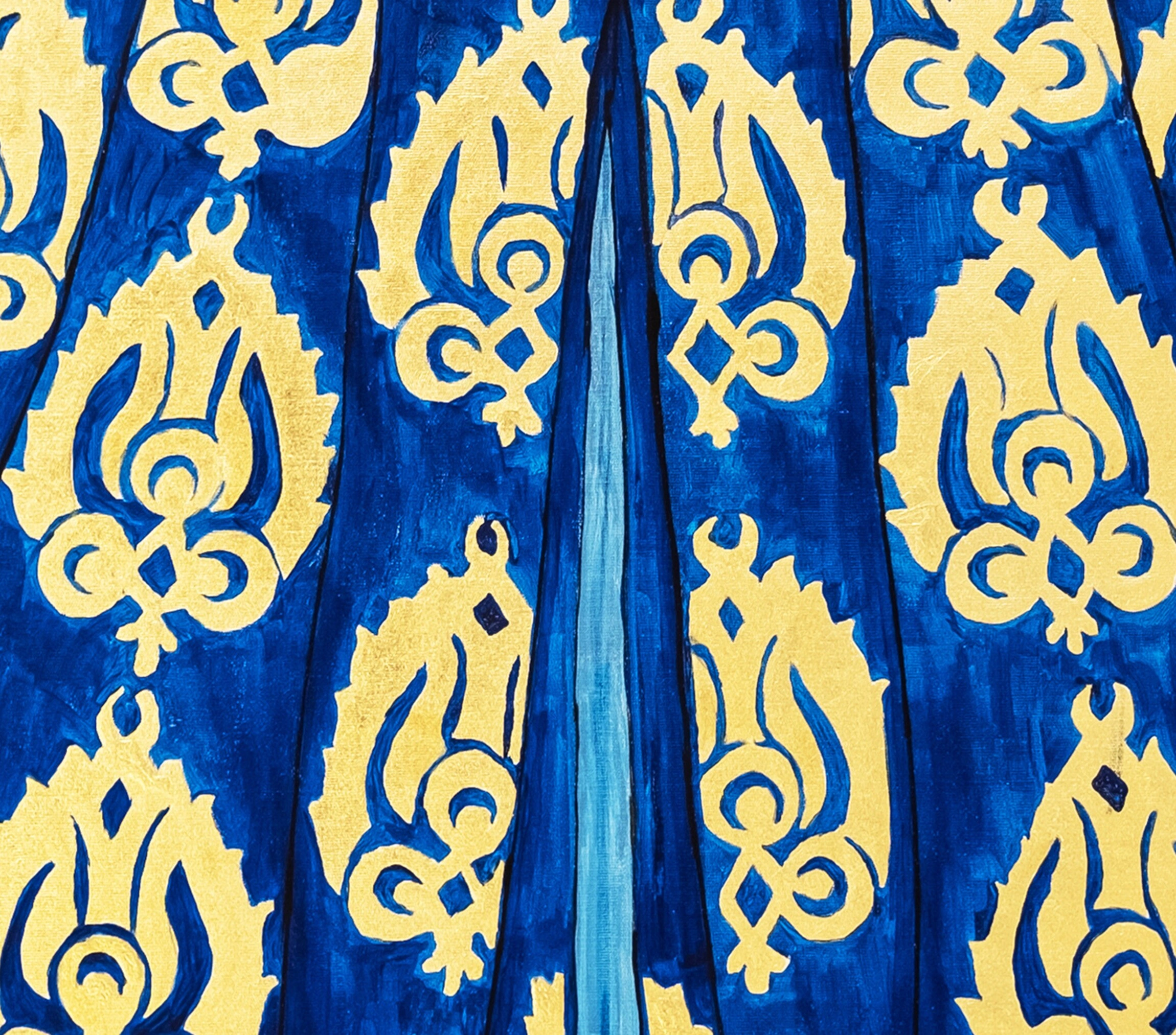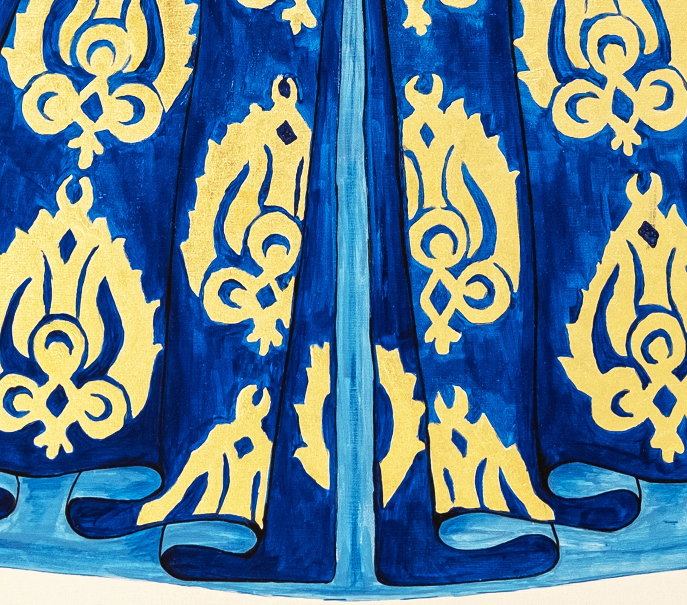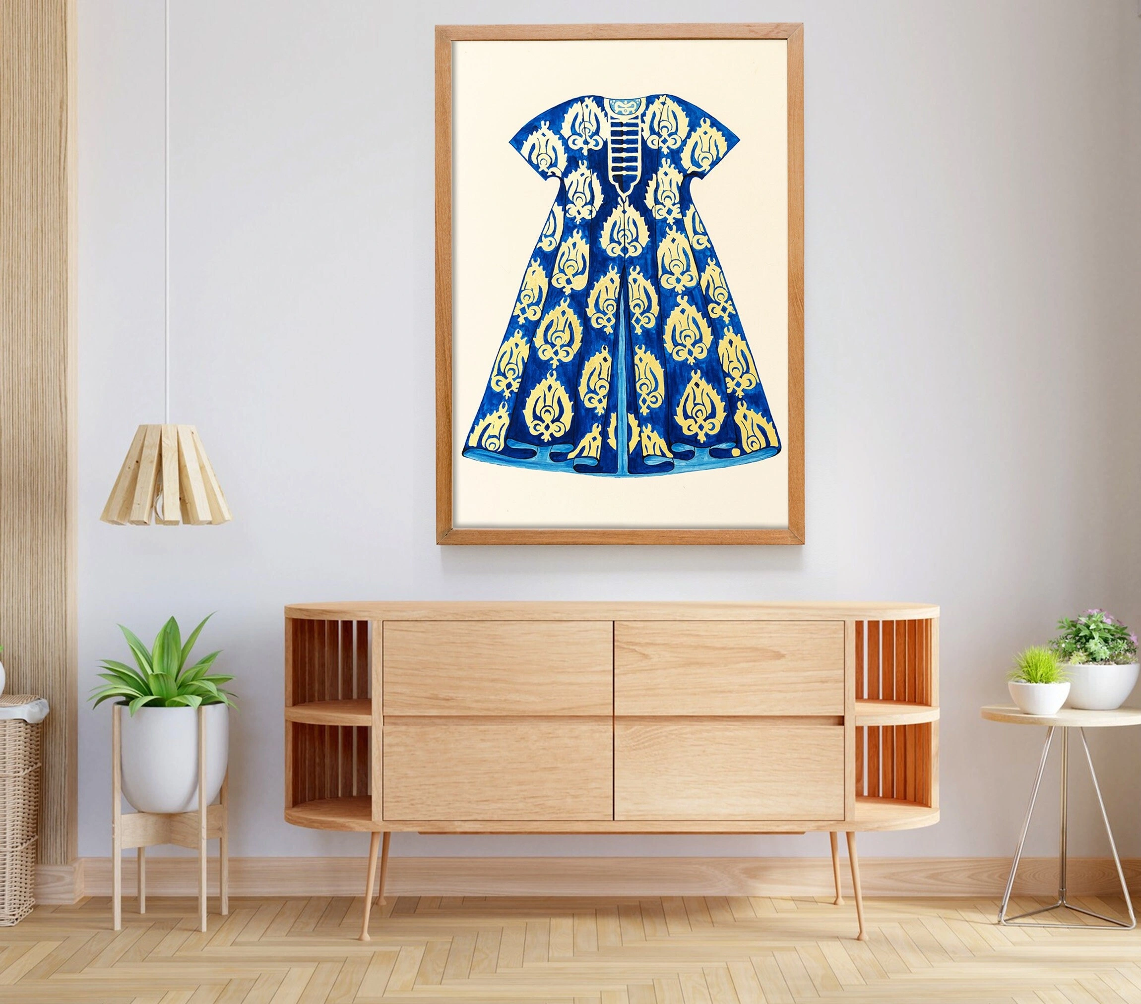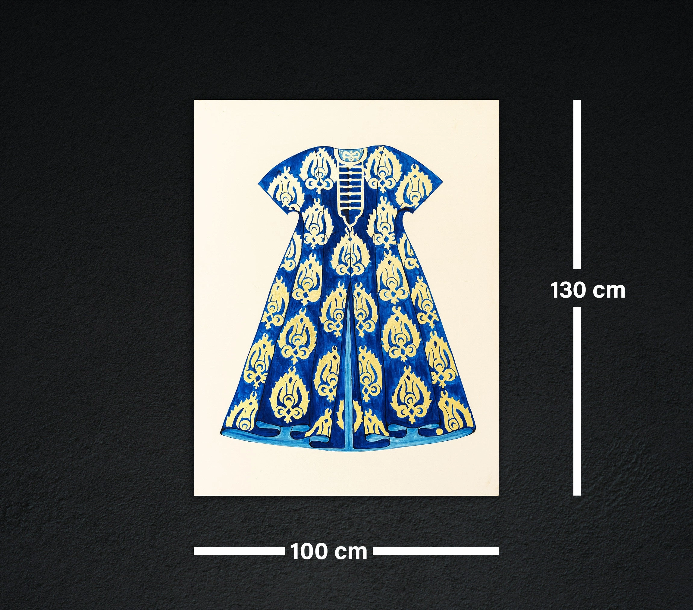 Kaliteli tuval üzerine altın varak işlemeleriyle süslenmiş mavi Osmanlı kaftanı tablosu, evinize özel bir zarafet getirecek bir sanat eseridir Çarpıcı mavi renkli Osmanlı padişah kaftanı, eseri sergilediğiniz duvarlarınızda tüm konuklarınızın bakışlarını üzerinde toplayacak. Ayrıntılara büyük özen gösterilerek elde üretilen olan bu altın işlemeli mavi sultan kaftan duvar sanatı, gerçekten de türünün tek örneğidir. Osmanlı kaftanı tablosu, klasik Osmanlı kıyafetlerine canlı bir yorum katıyor. Yüzyıllar boyunca bu giyim tarzı geleneksel Osmanlı dolaplarının bir parçası olmuştur. Şimdi ise benzersiz ve göz alıcı bir görünüm katmak için yeniden yorumlandı. Mavi Osmanlı kaftanı kanvas tablo tamamen elde boyanmıştır. Canlı altın renkli çiçek işlemeleri ve ince detaylarıyla bu nefes kesen kıyafet, ev dekorasyonunuza zarif bir tarz katmayı vaat ediyor.