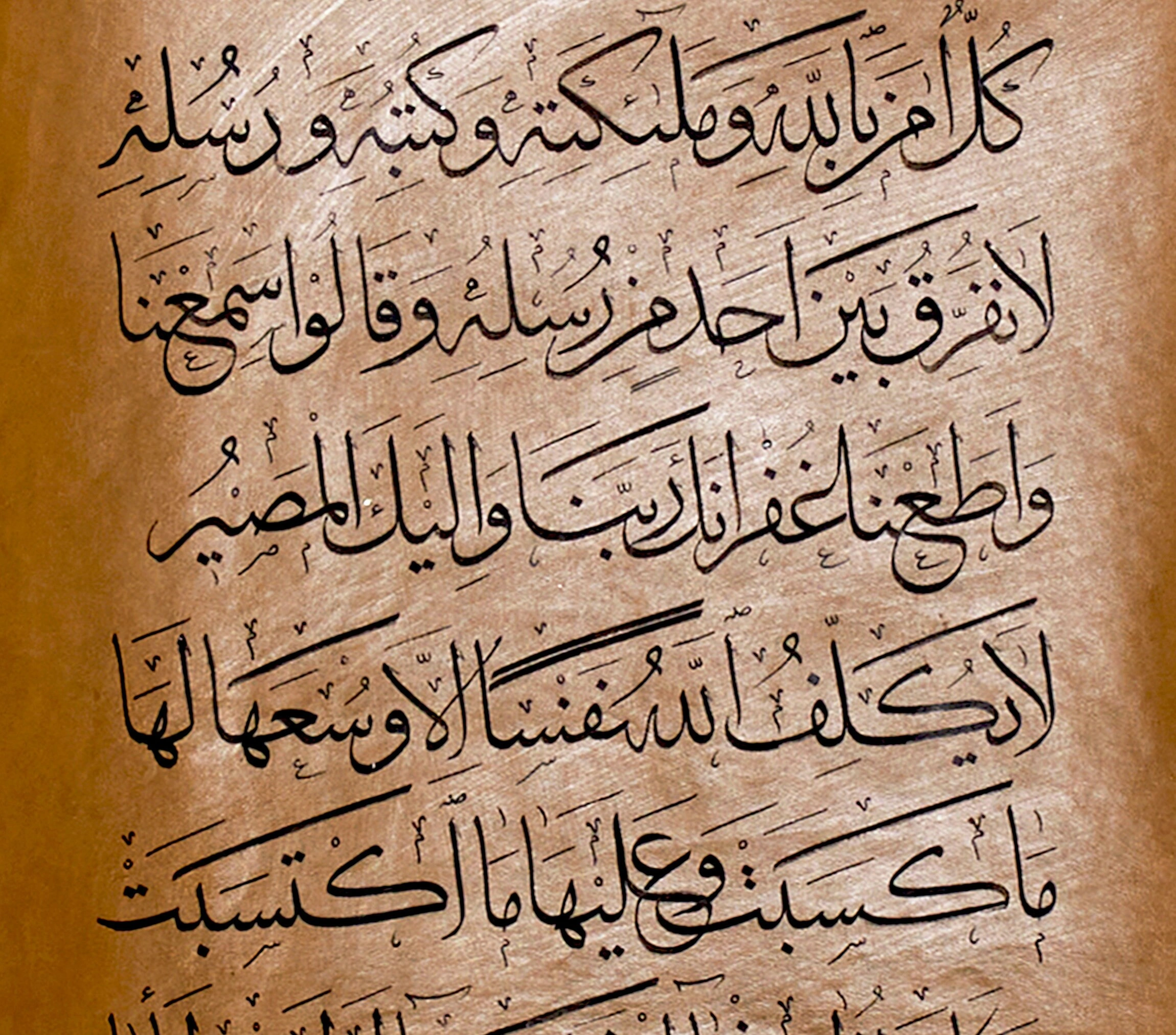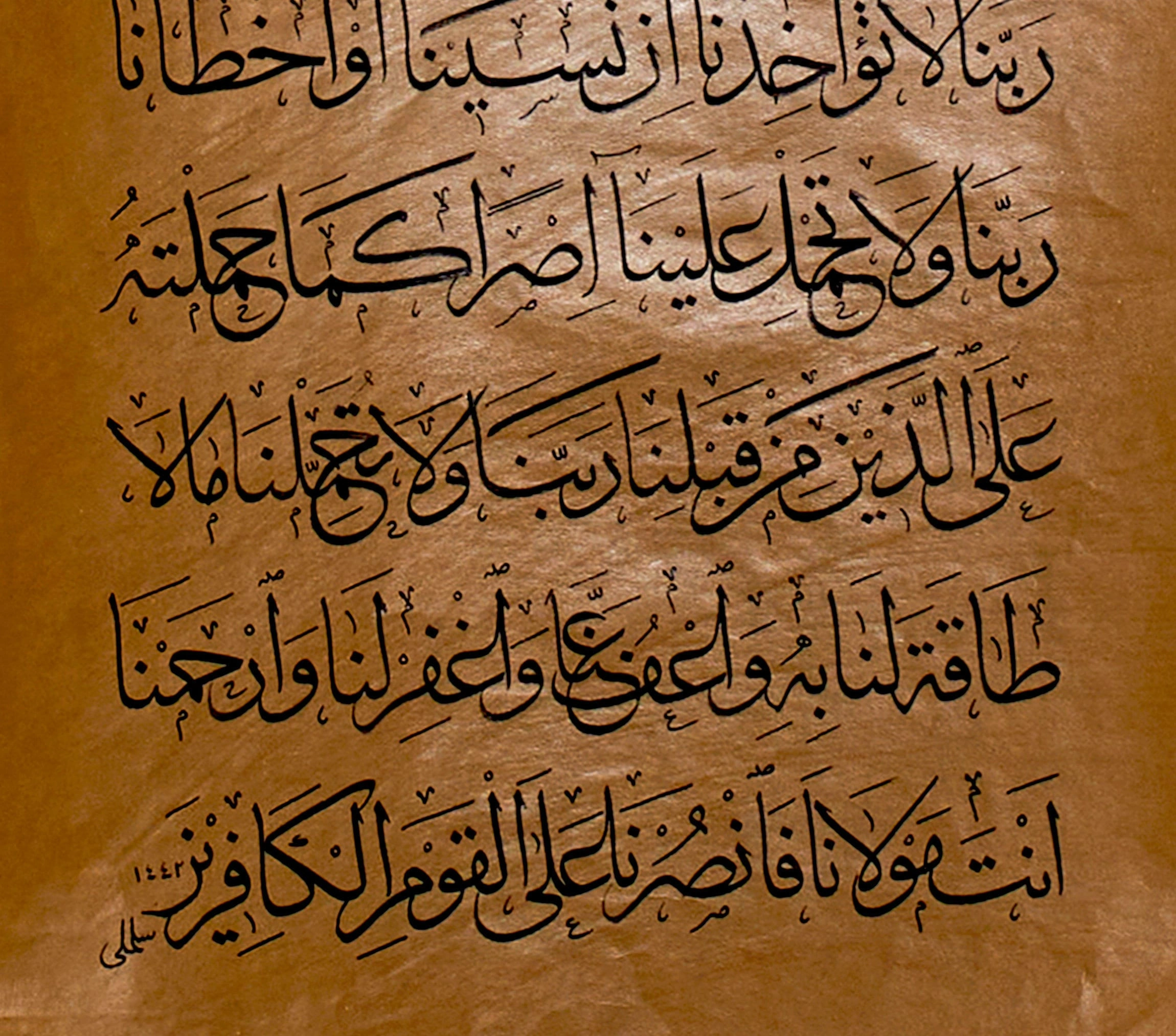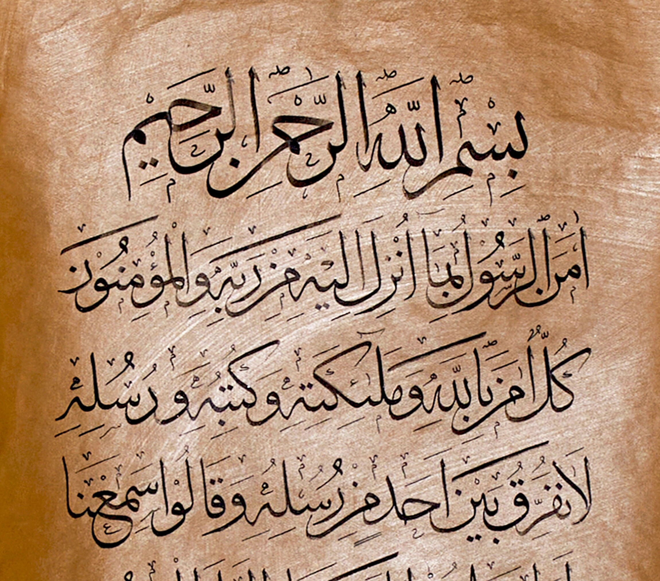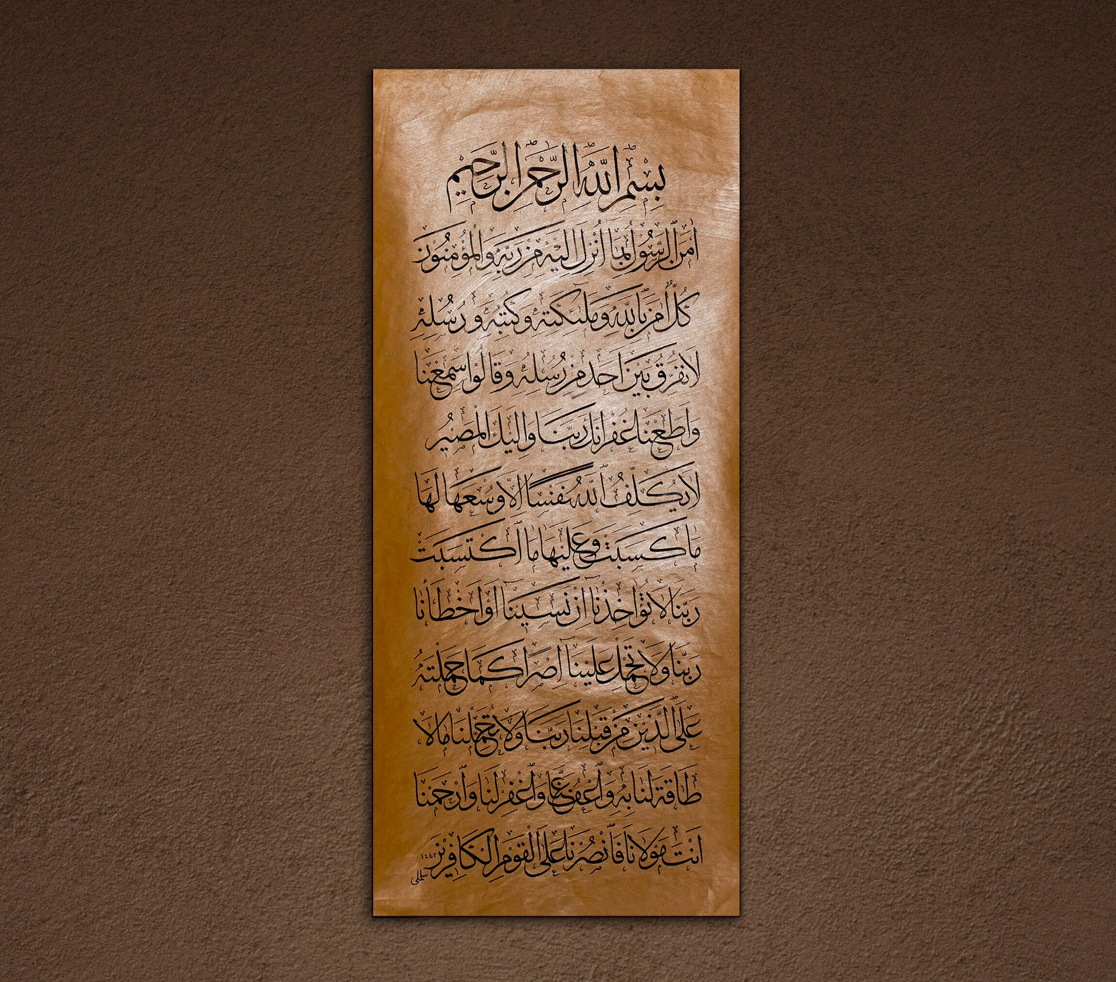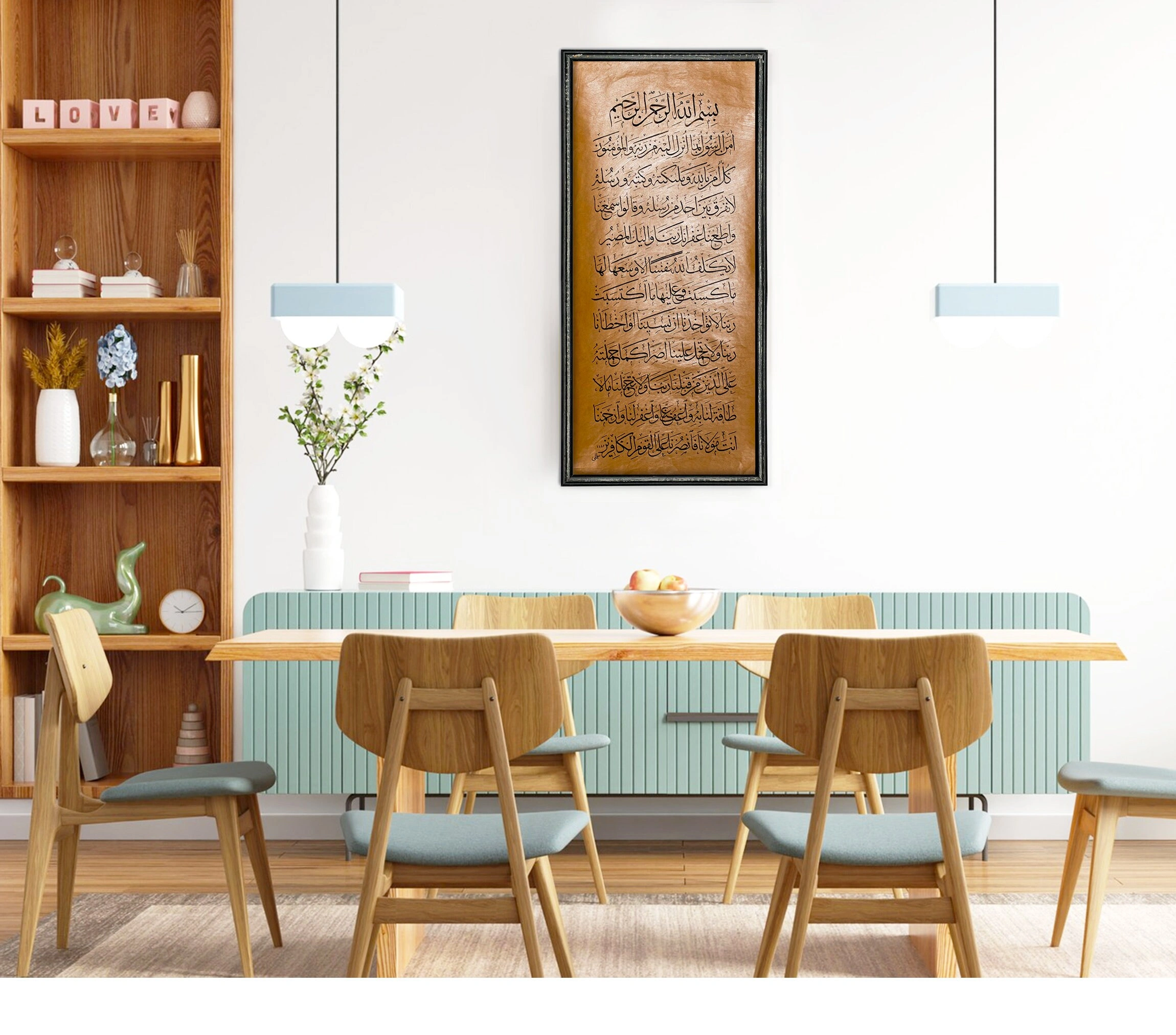 El Yapımı hint kağıdı üzerine is mürekkebiyle yazılmış Amenarresulu Suresi el yazması misafirlerinizi hayran bırakacak zarif bir eserdir. Klasik Arapça kaligrafi hat sanatıyla süslenmiş bu otantik İslami el yazması, sade tasarımıyla dikkat çeken ve üzerinde Amenarresulu Suresi'nin yazdığı ince işçilik ürünü bir eserdir. Yazımda kullanılan is mürekkebi rengin canlılığı ve kağıdın dokusuyla eşsiz bir görünüme sahiptir. Amenarresulu Suresi'nin güçlü mesajının yazıldığı eserde adeta her harfin başlı başına bir sanat eseri olduğunu söylemek yanlış olmayacaktır. Bu sofistike hat eseri, zamansız sözlerin güzelliğini hatırlatıyor. Özenle hazırlanmış bu İslami hat el yazması eser, detaylara gösterilen öneme, el yapımı özel hint kağıdından, siyah vurgularına kadar her unsurda, etkileyici bir İslami sanat yaratmak için özenle tasarlanmıştır. Bu çekici İslami eser, evinize ilahi bir huzur ve zarafet dokunuşu getirerek her odayı kutsal bir alana dönüştürme özelliğiyle, evinizin hayranlık uyandıran değerli bir parçası olacaktır.