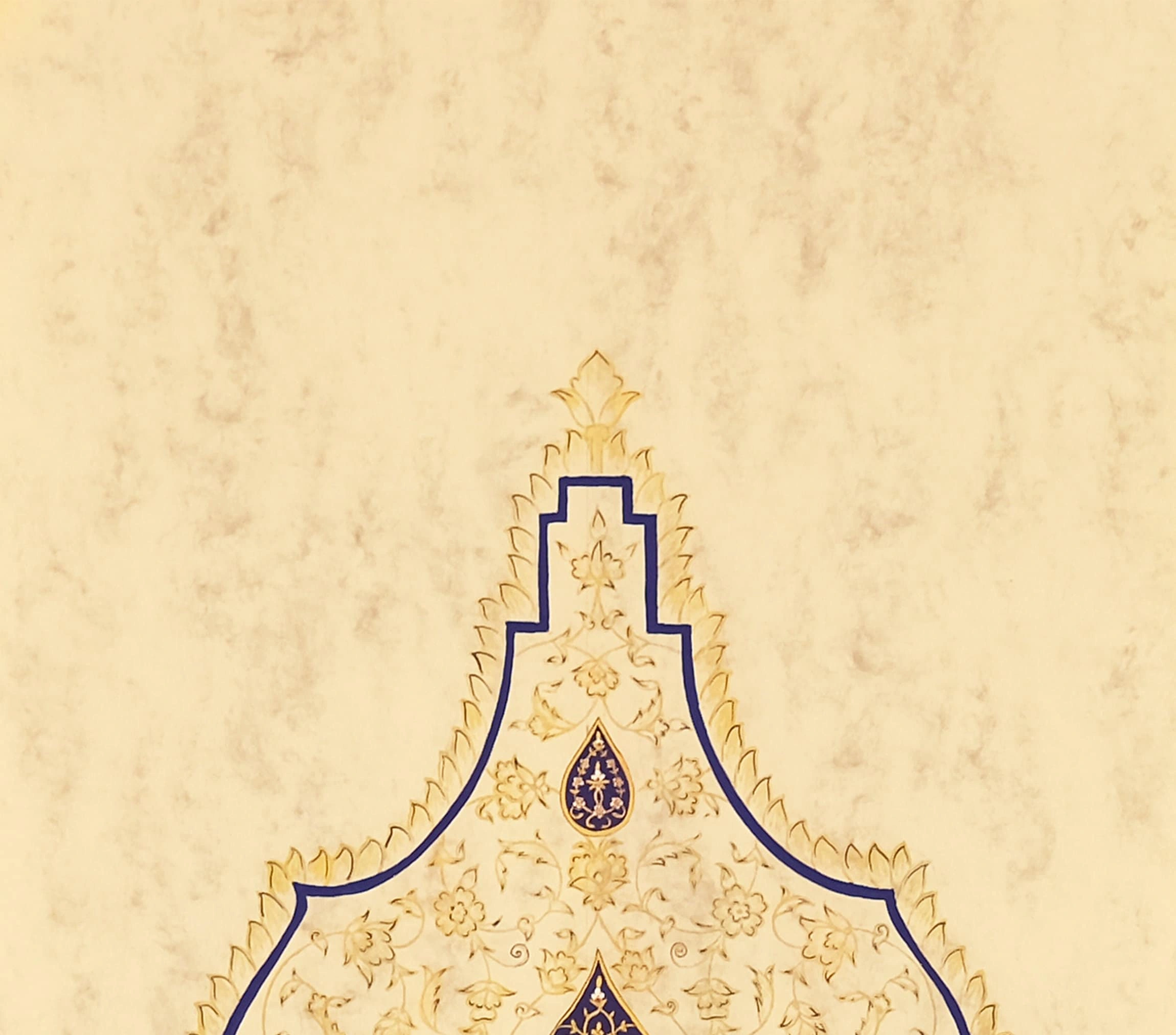 This beautiful Ayatul Kursi illumination art has been hand crafted to perfection by a master calligrapher, using traditional techniques. Every intricate detail of the verse has been carefully considered, with impeccable precision and delicate pen strokes forming a work of art on its own. Finished off with beautiful golden and navy blue embroideries and gold floral motifs on the background this illuminated wall art will truly be a focal point in any living area.