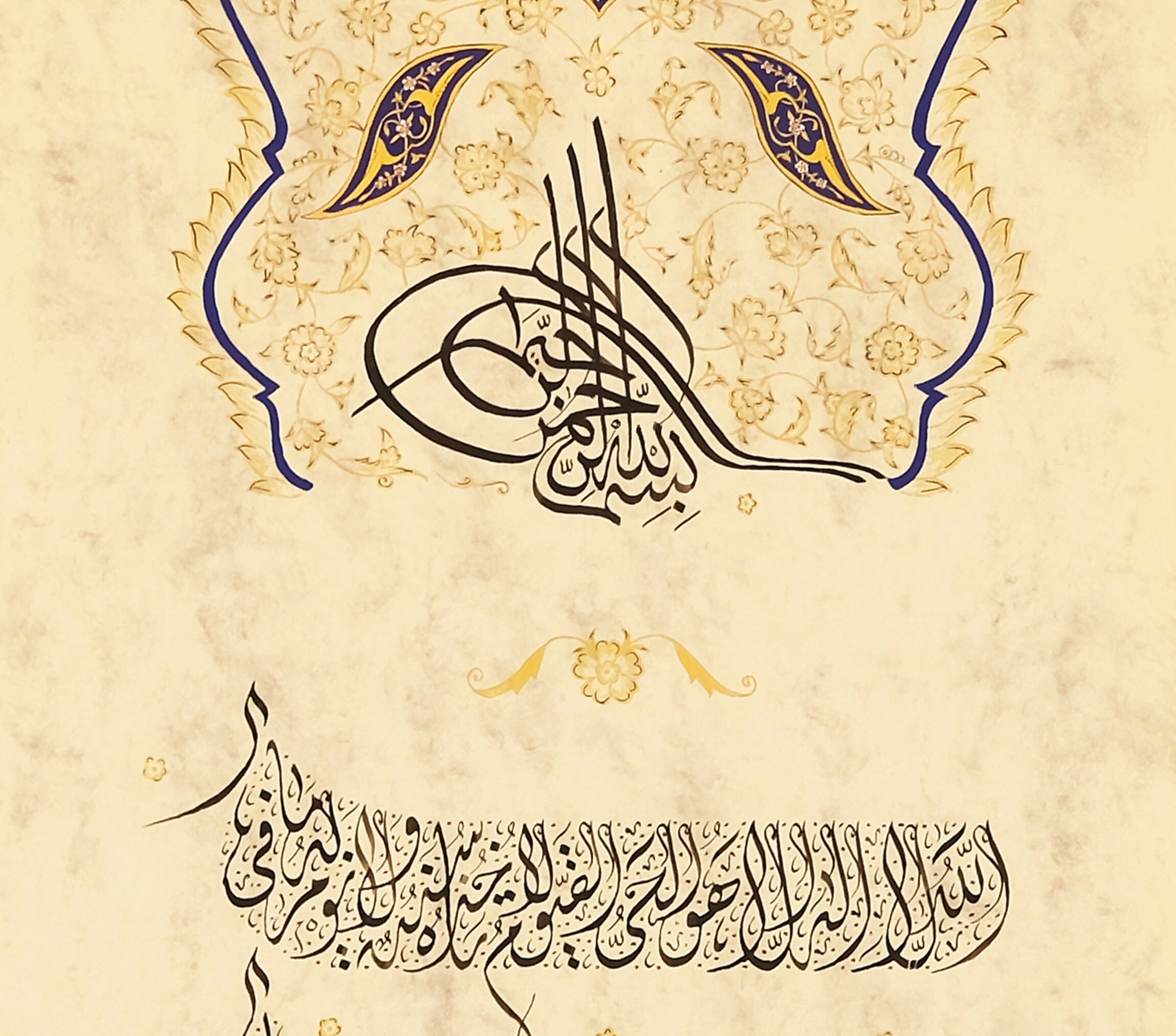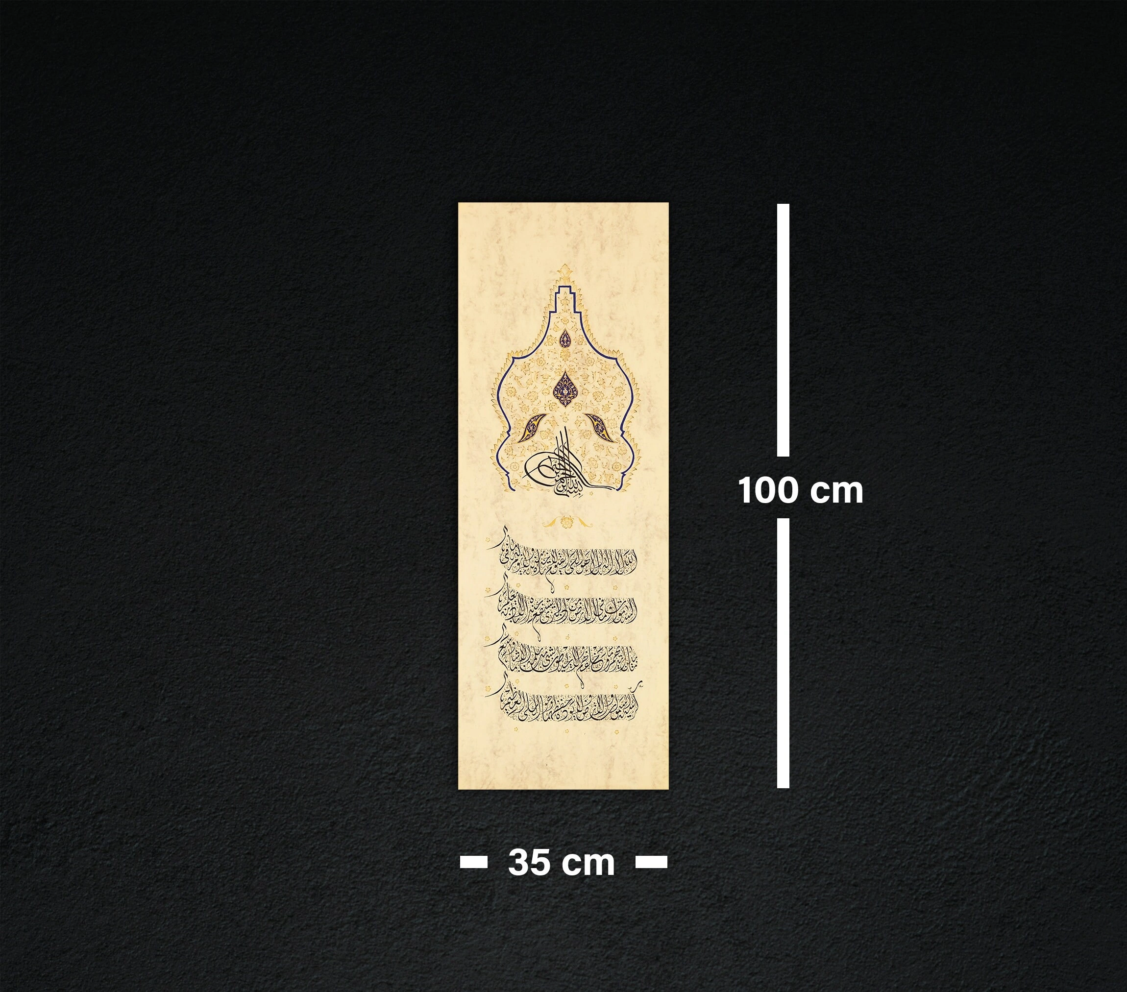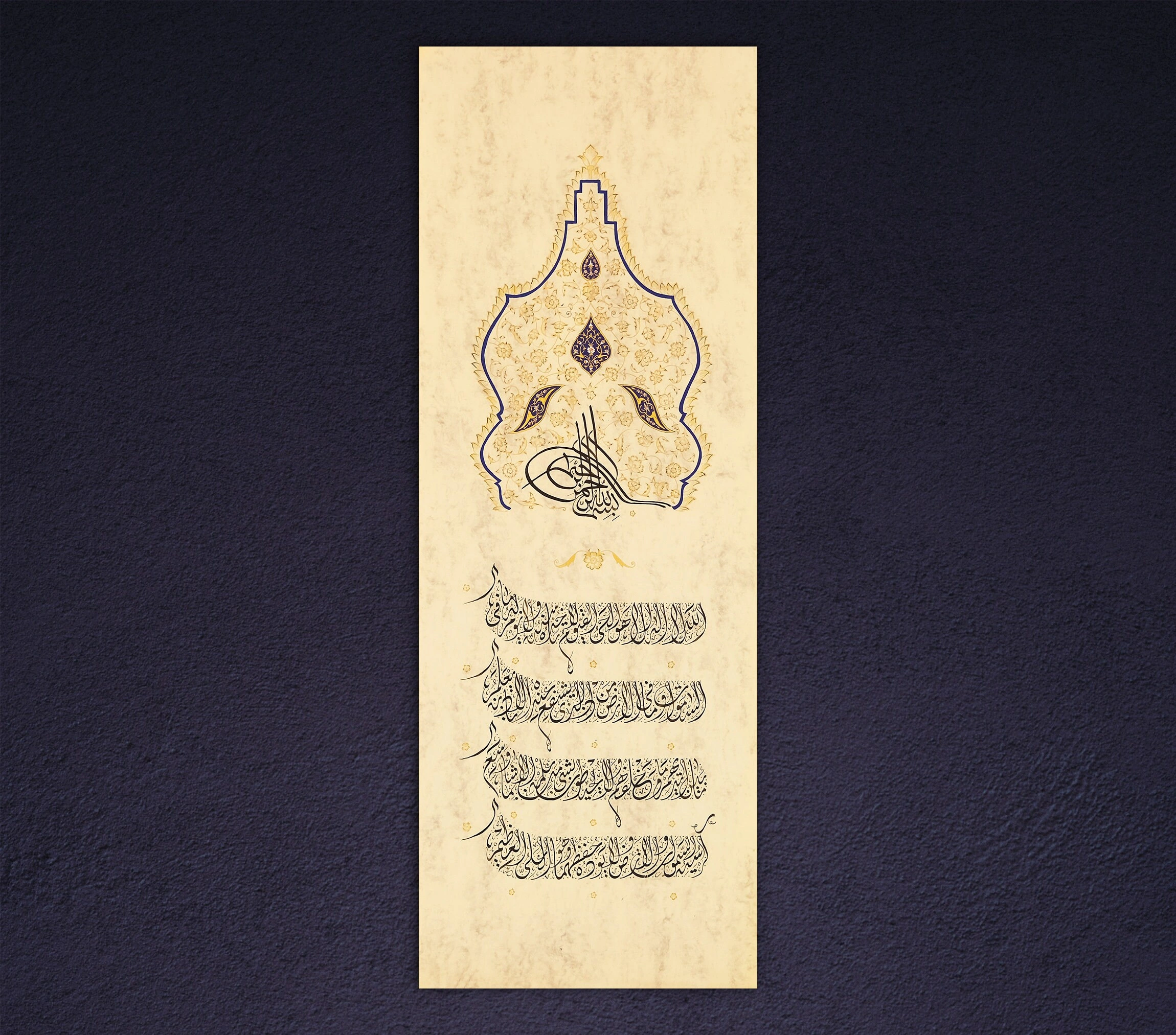Magnificent Ayatul Kursi illumination art is a unique Islamic wall art and a religious heritage that is sure to take pride of place in any Islamic home decoration or collection. This calligraphy scripture, completely handwritten in an exquisite detailing on thin and natural paper, is the 255th ayat of Surah Baqarah which is one of the most important and meaningful verses of the Qur'an.