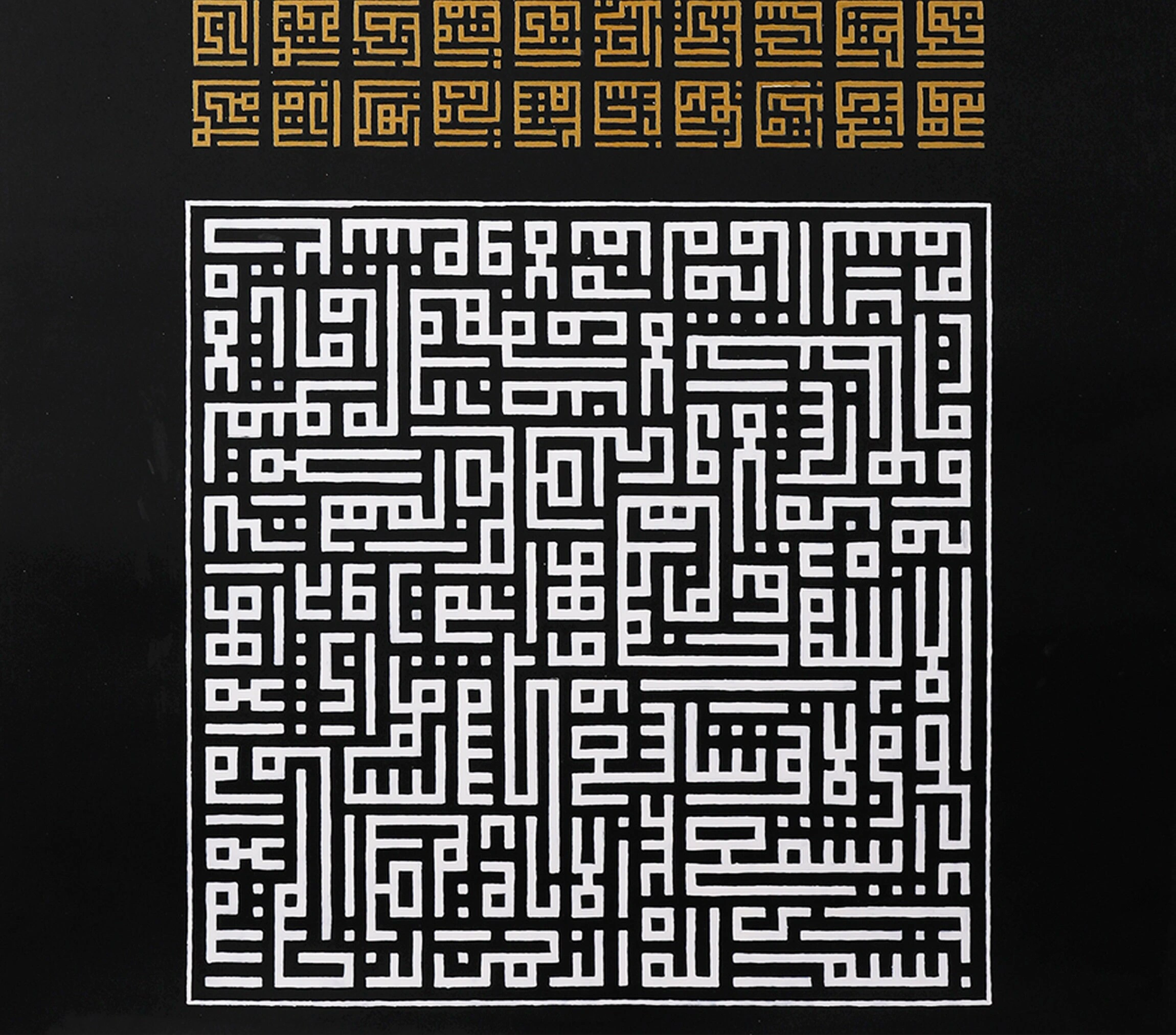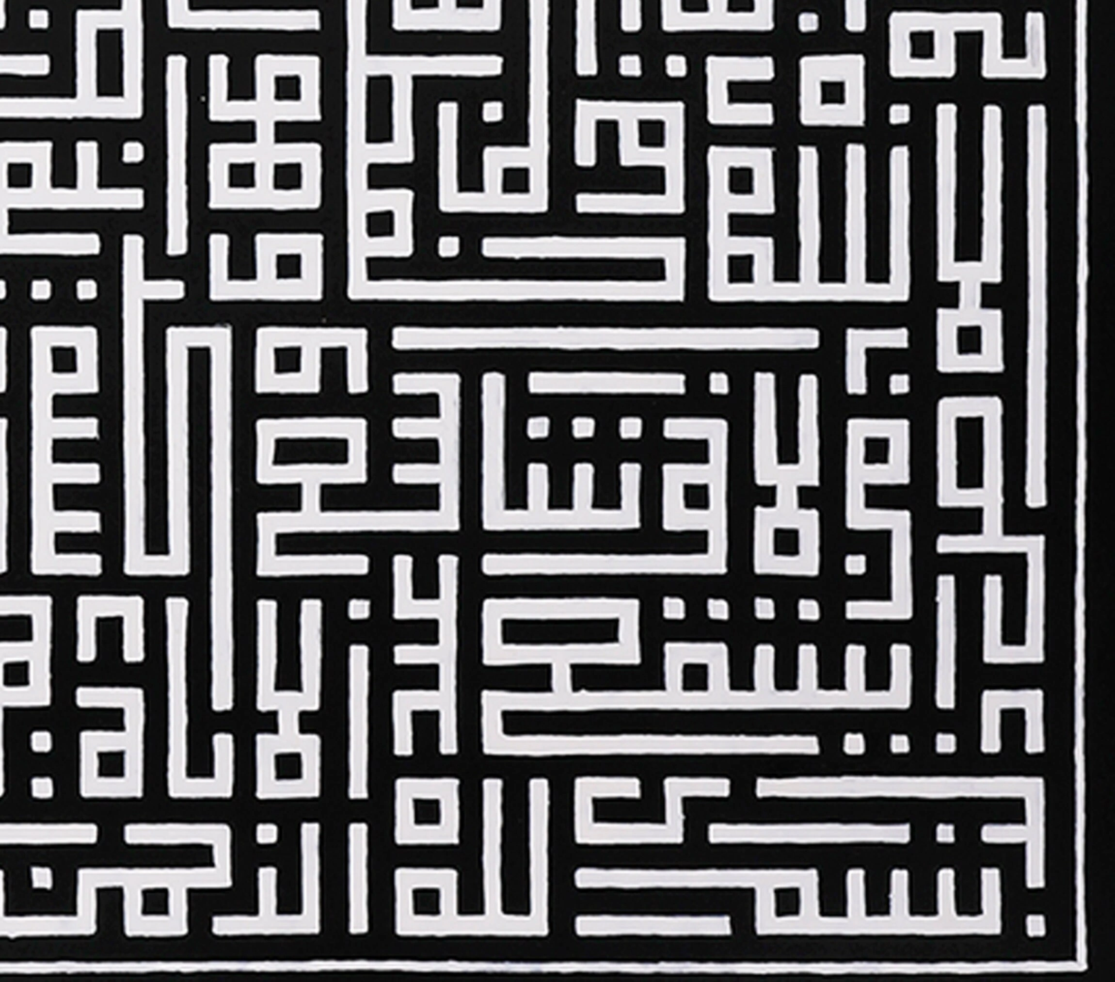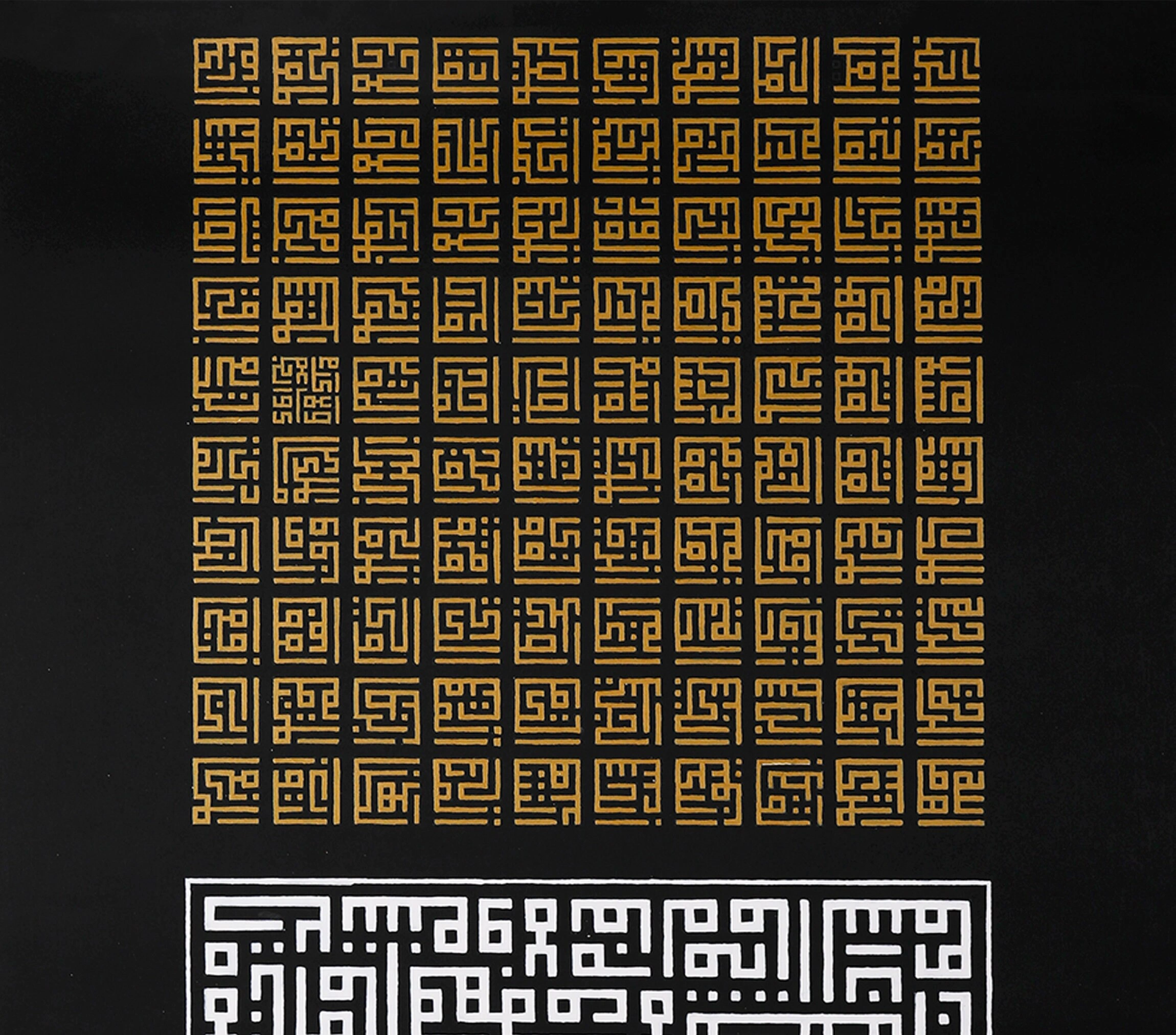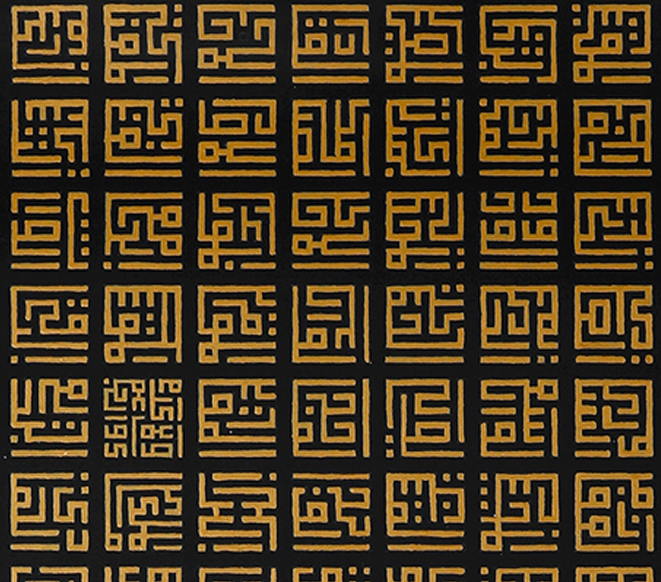 "Hic" Islamic wall art by Turkish calligraphy artist Selma Altiparmak. Thuluth calligraphy canvas art is navy blue inking over degraded paper. Handwritten Islamic wall decor measures 31 by 33 inches. Islamic calligraphy arts are great gift ideas for Ramadan Mubarek and Eid. Arabic calligraphy art style and Kufi wall arts can be used as a Muslim home and office decorations.