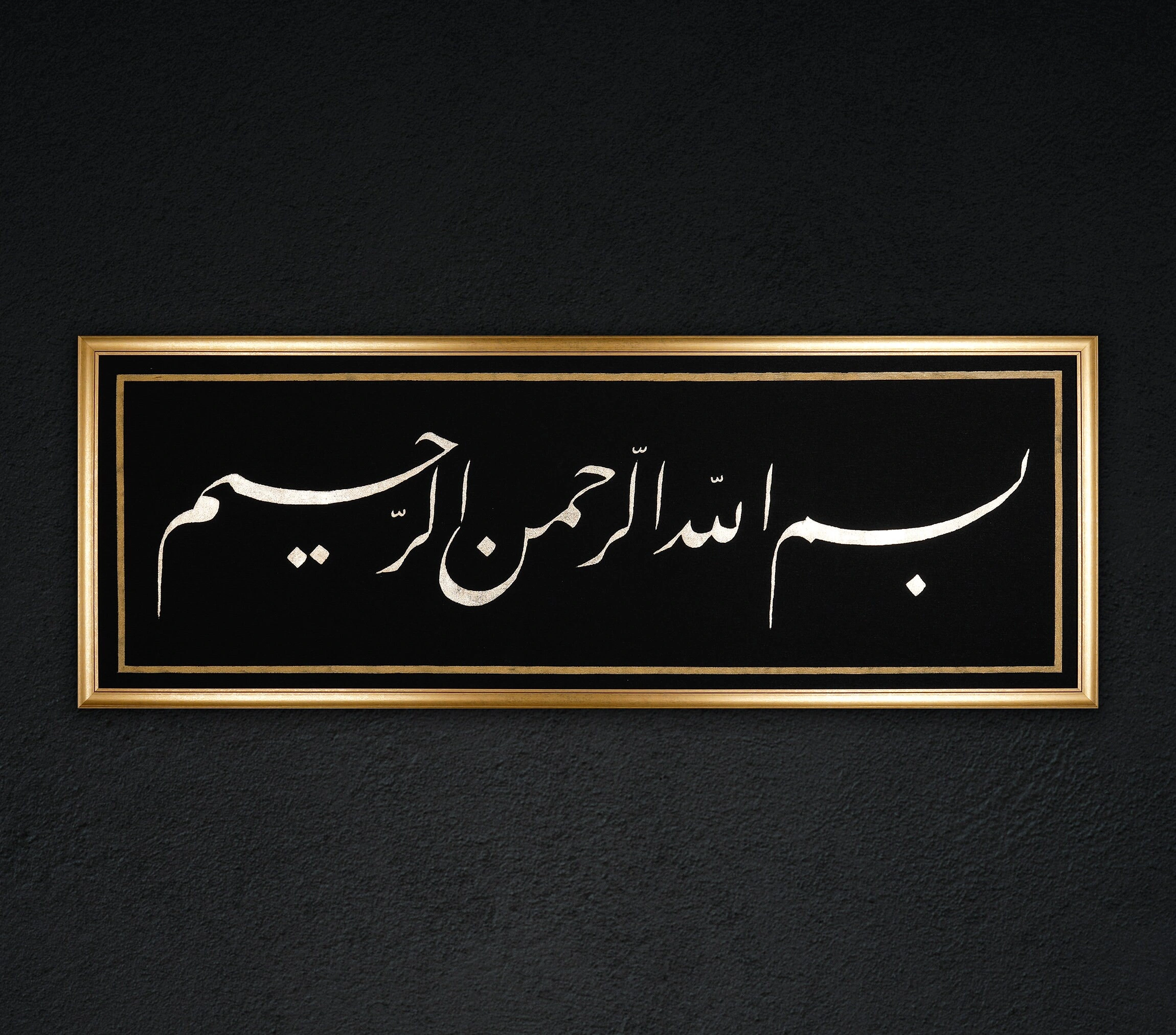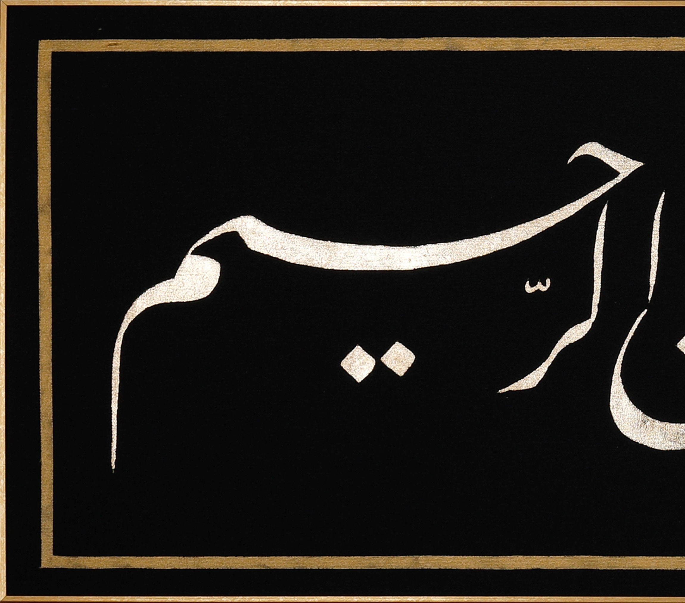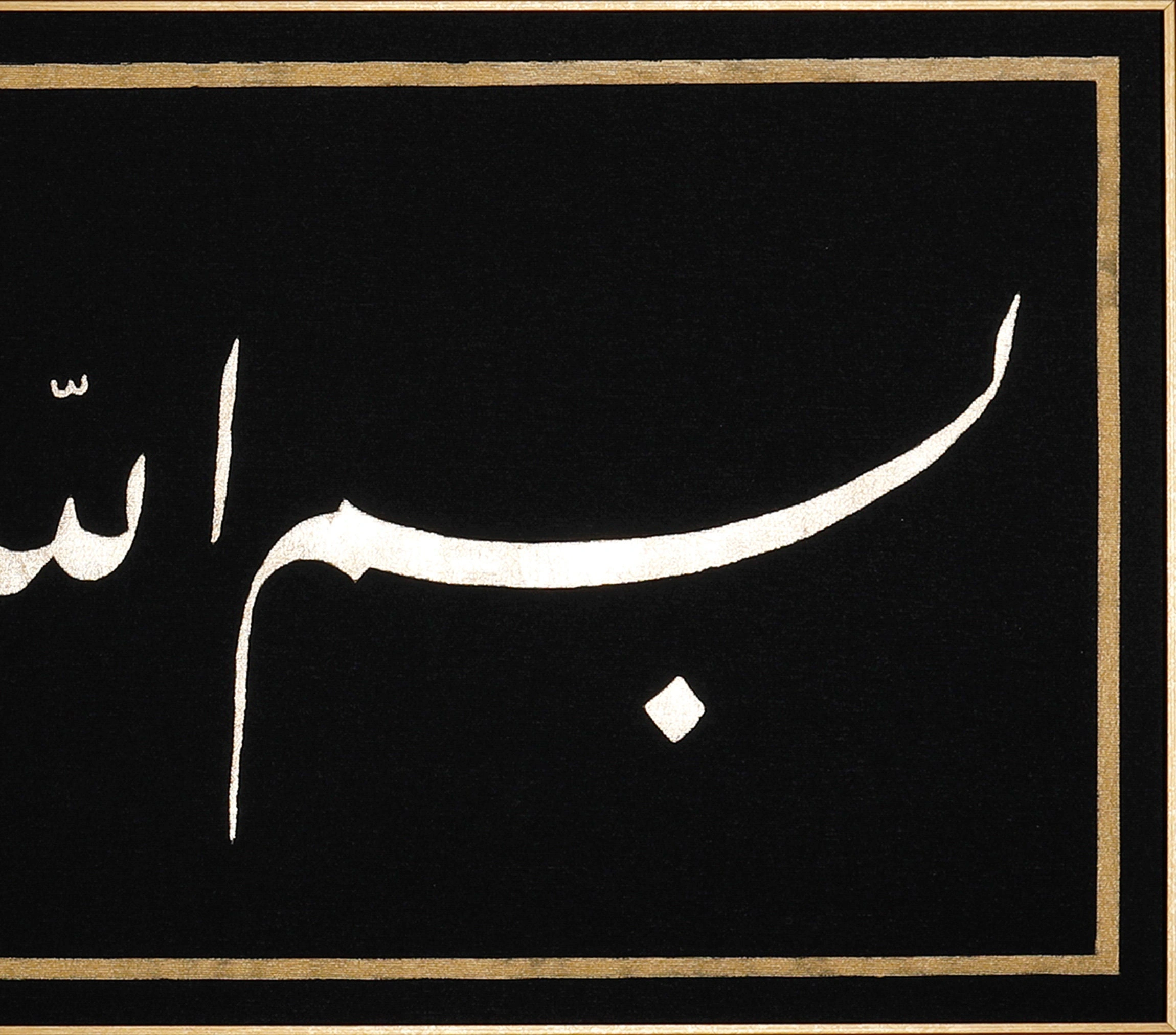• Besmele Siyah İslami Hat Kanvas Tablo Tuval Üzerine Altın Varak Akrilik El Yazması Bismillah Besmele Arapça Kaligrafi Tuval Hat Eser