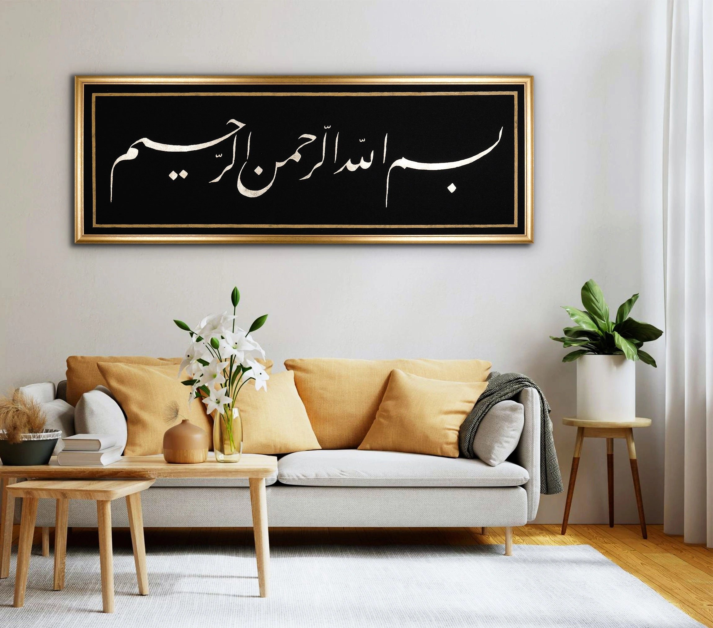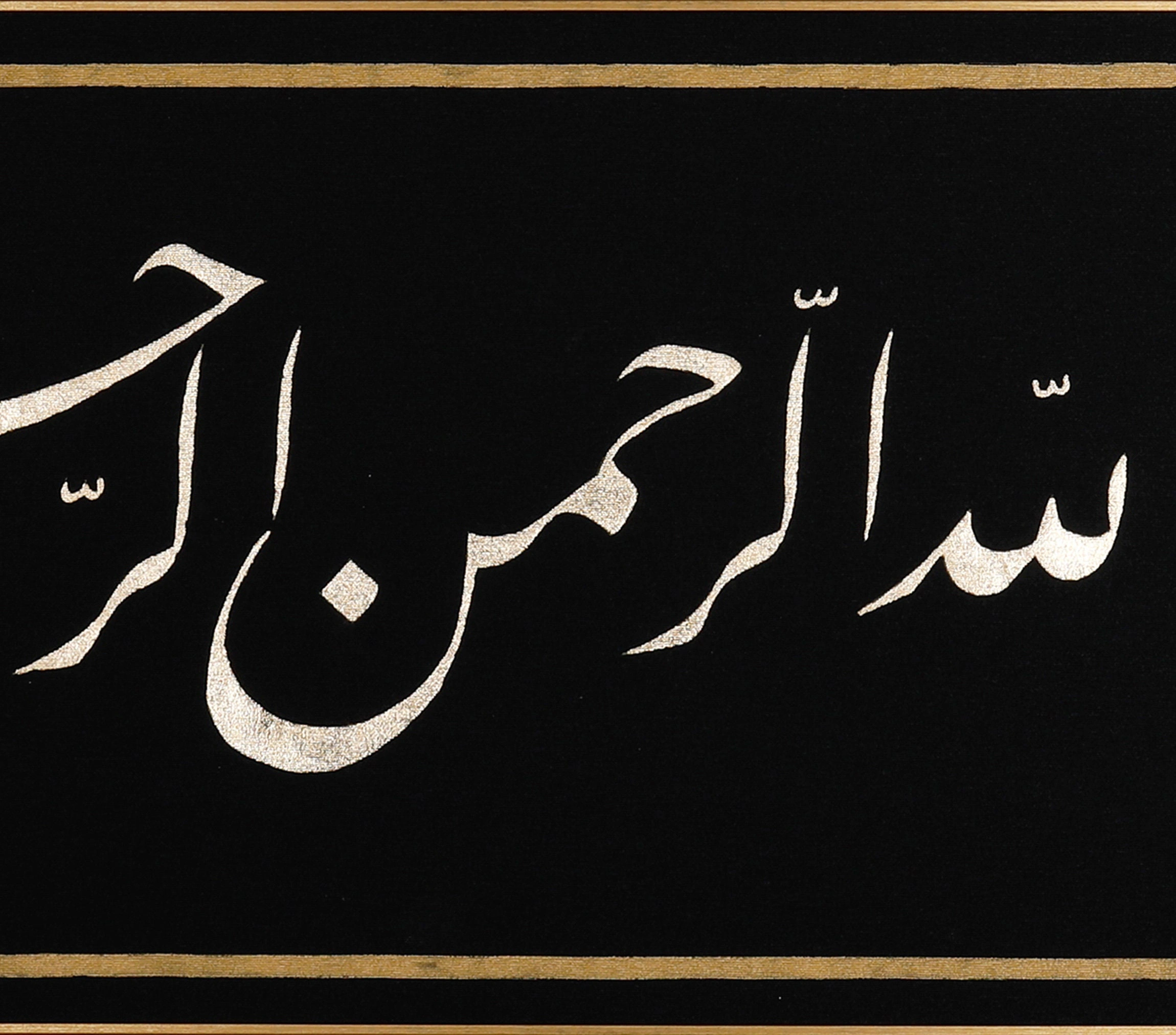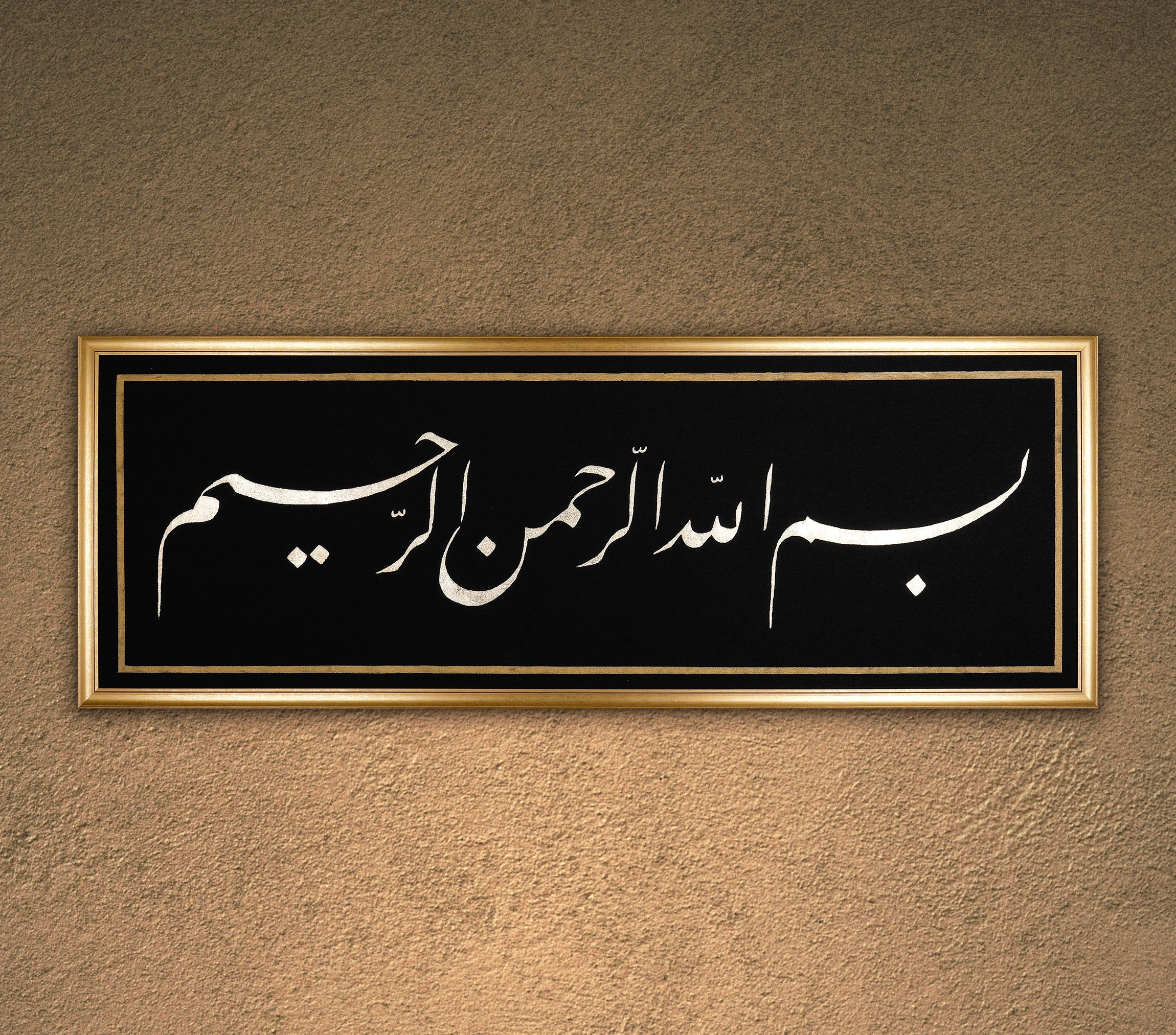 • Besmele Siyah İslami Hat Kanvas Tablo Tuval Üzerine Altın Varak Akrilik El Yazması Bismillah Besmele Arapça Kaligrafi Tuval Hat Eser