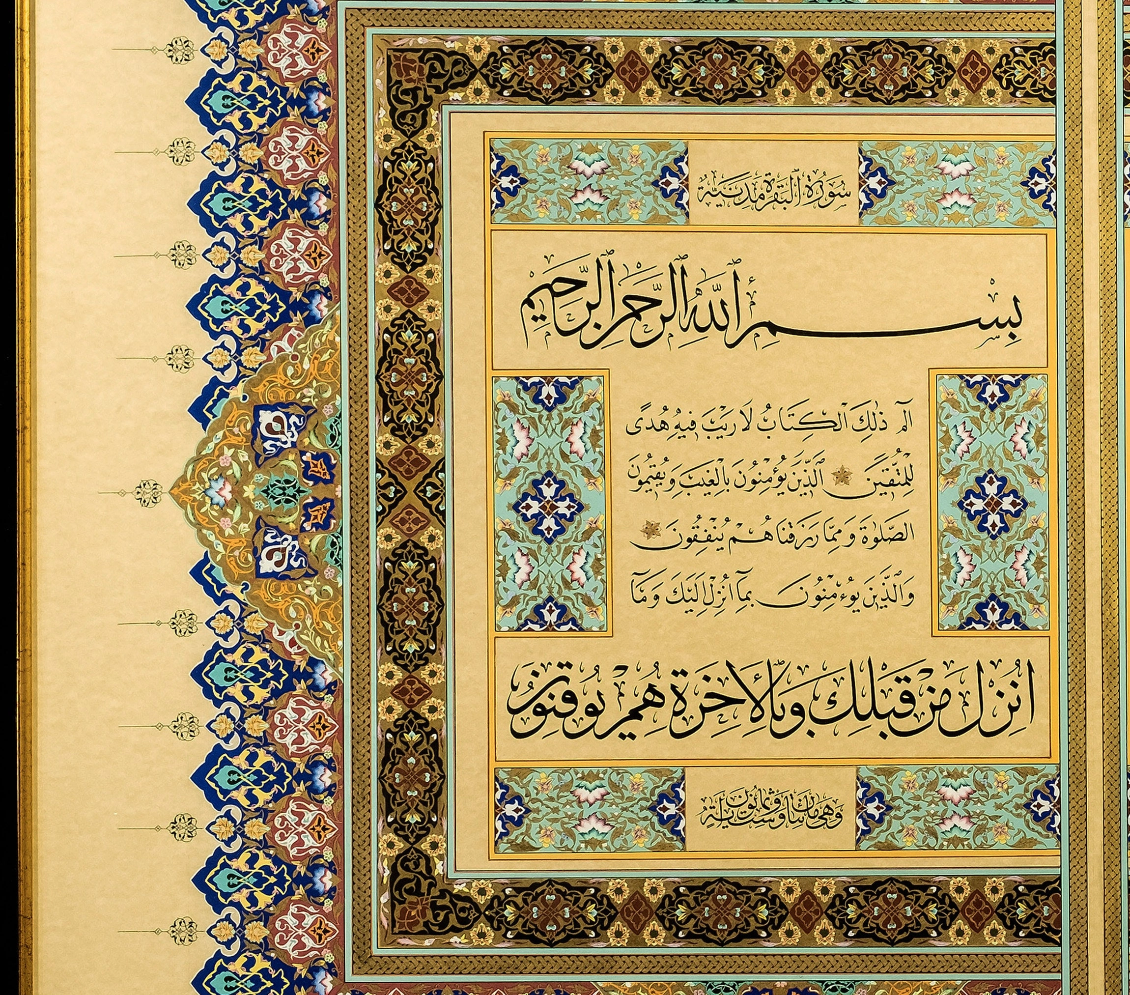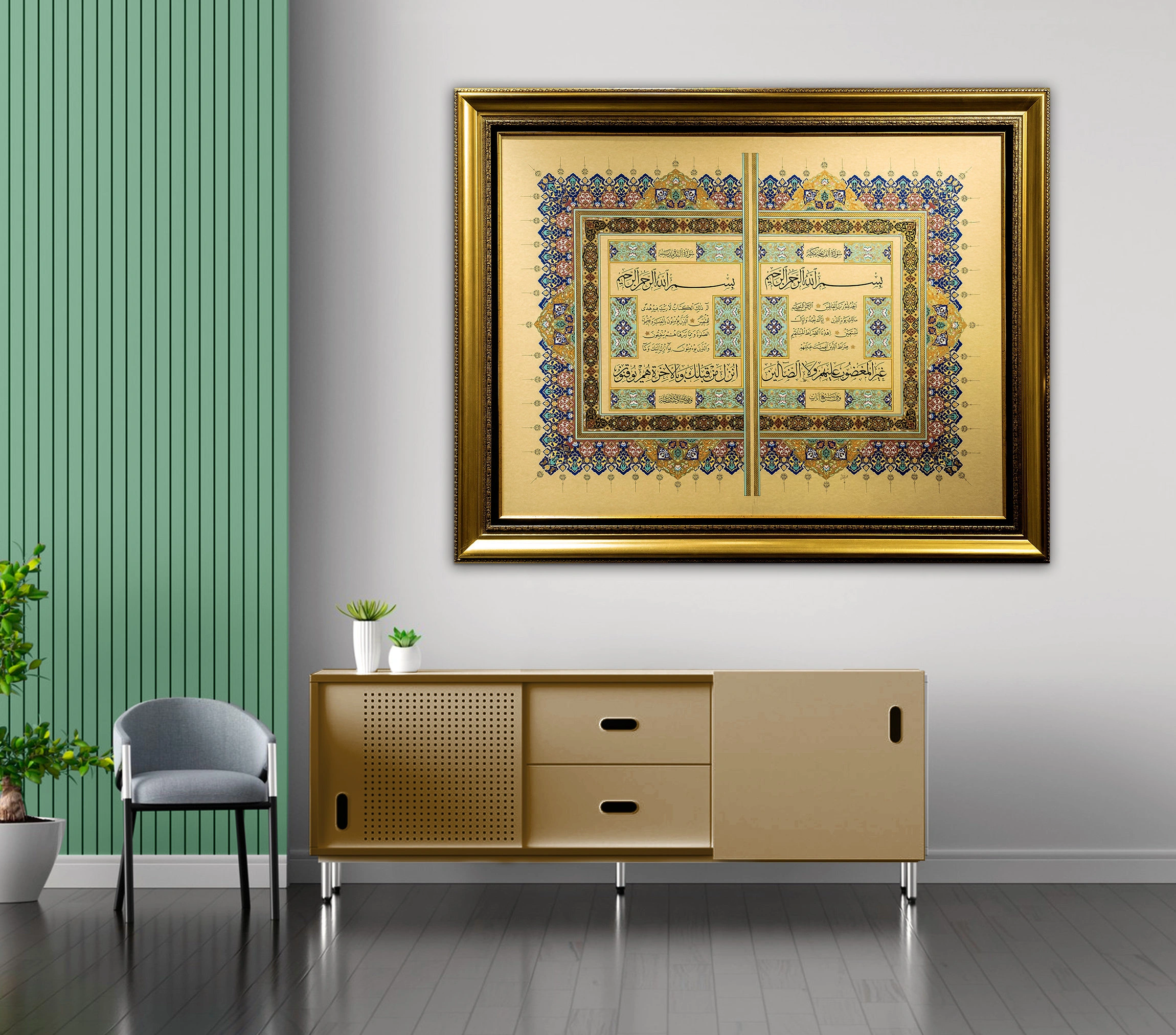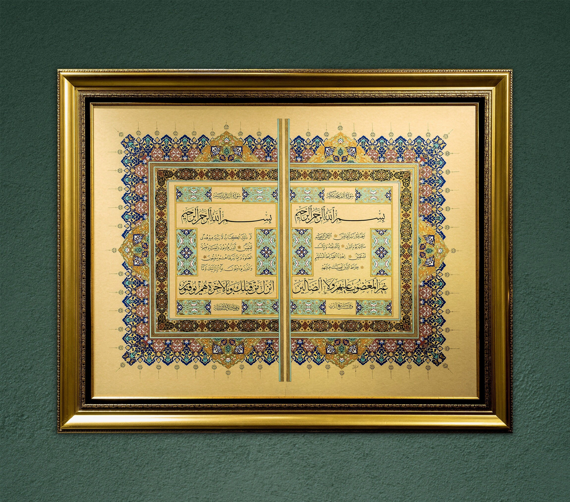 • Fatiha ve Bakara Sureleri Cam Çerçeveli İslami Hat Tablo Tezhip Sanatı İşlemeli 24 Ayar Gerçek Altın El Yazması Fatiha Suresi ve Bakara Suresi Lüks Tablo Hediyelik Duvar Dekoru