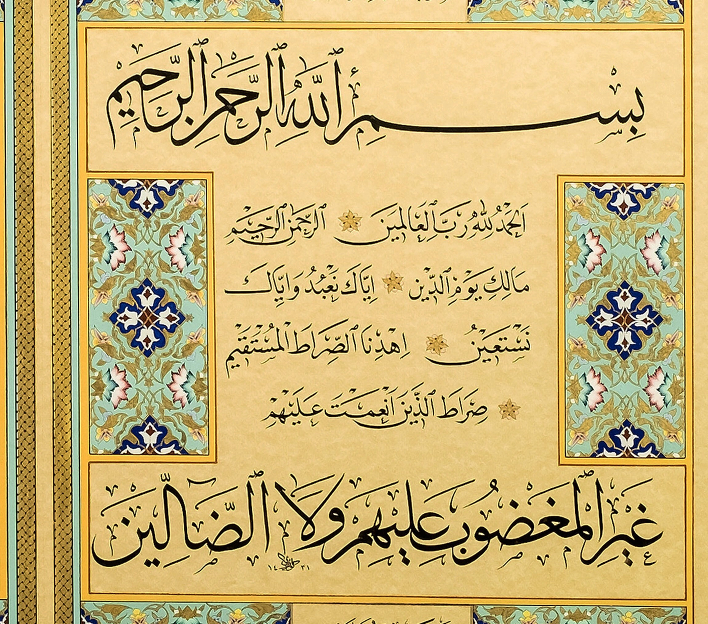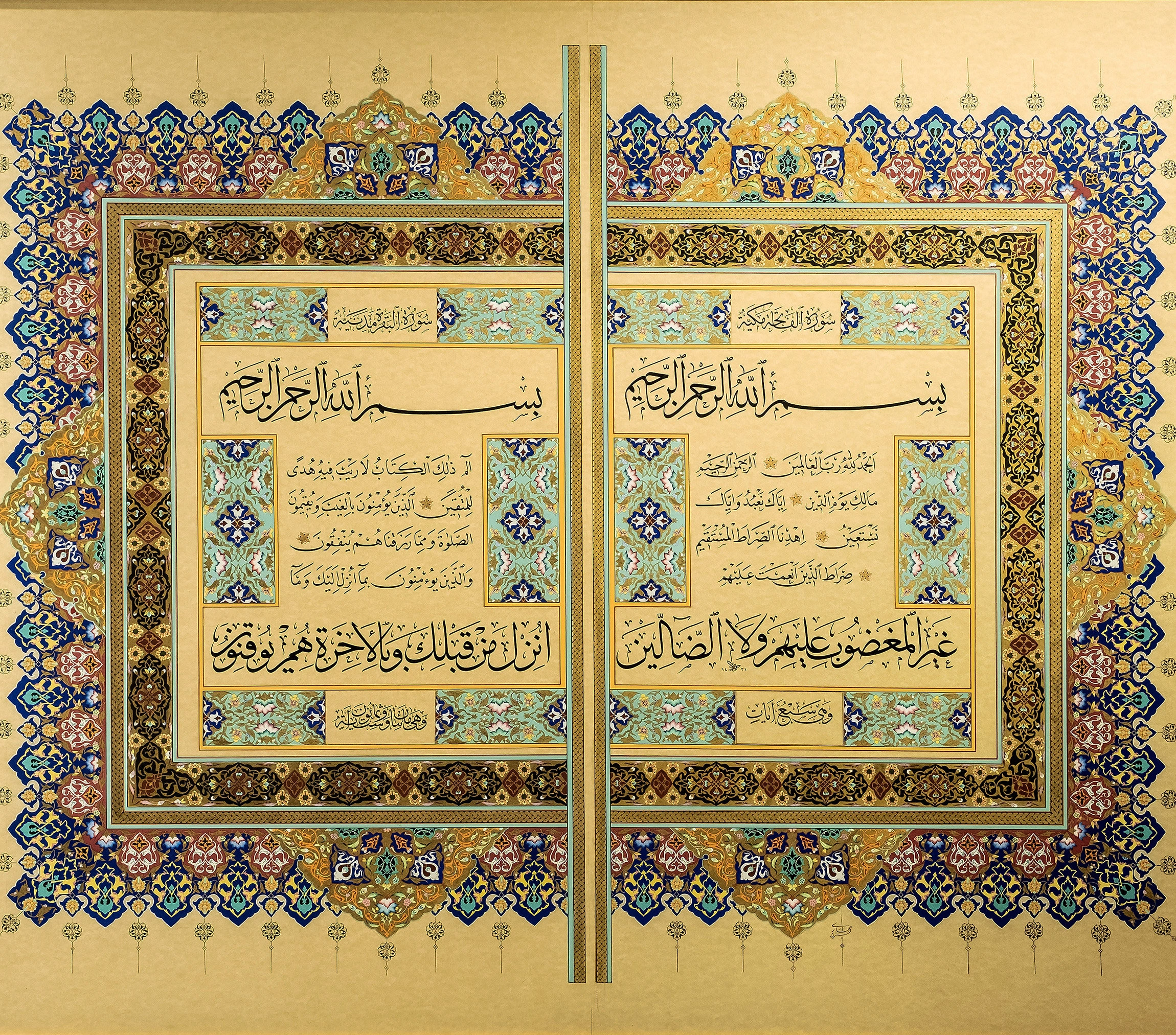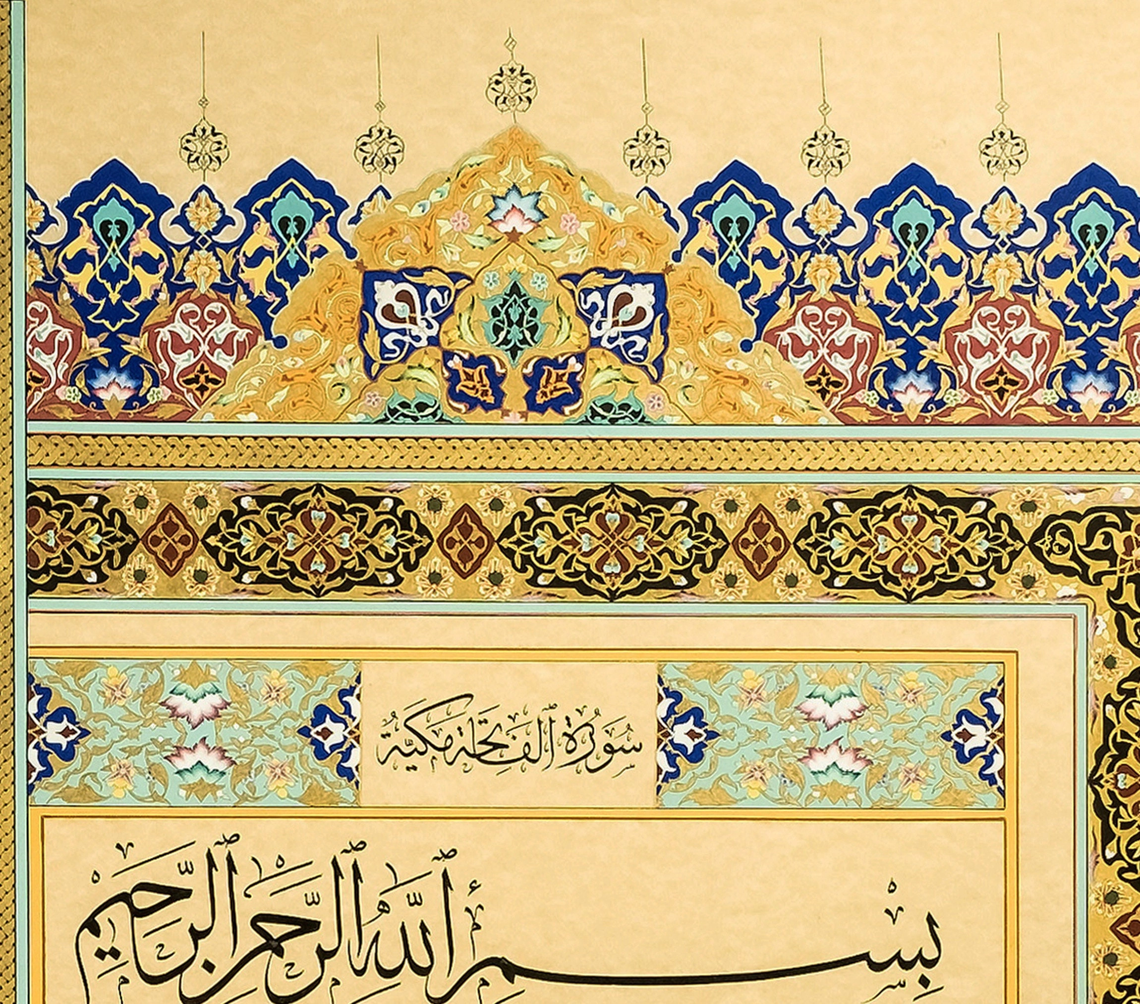 • Fatiha ve Bakara Sureleri Cam Çerçeveli İslami Hat Tablo Tezhip Sanatı İşlemeli 24 Ayar Gerçek Altın El Yazması Fatiha Suresi ve Bakara Suresi Lüks Tablo Hediyelik Duvar Dekoru