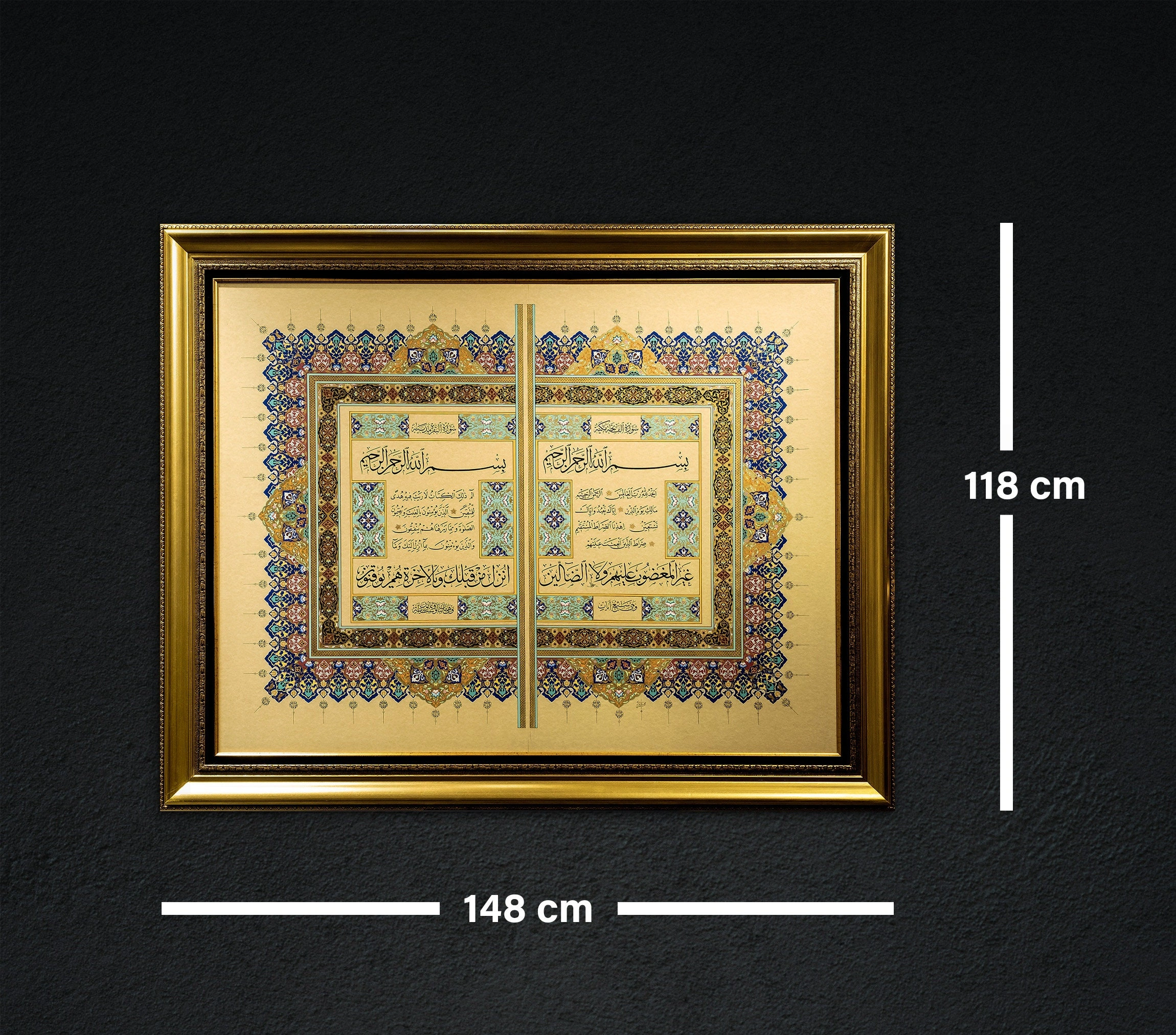 Fatiha ve Bakara Sureleri 24 Ayar Tezhip Süslemeli Cam Çerçeveli Hat Tablo 118x148 cm