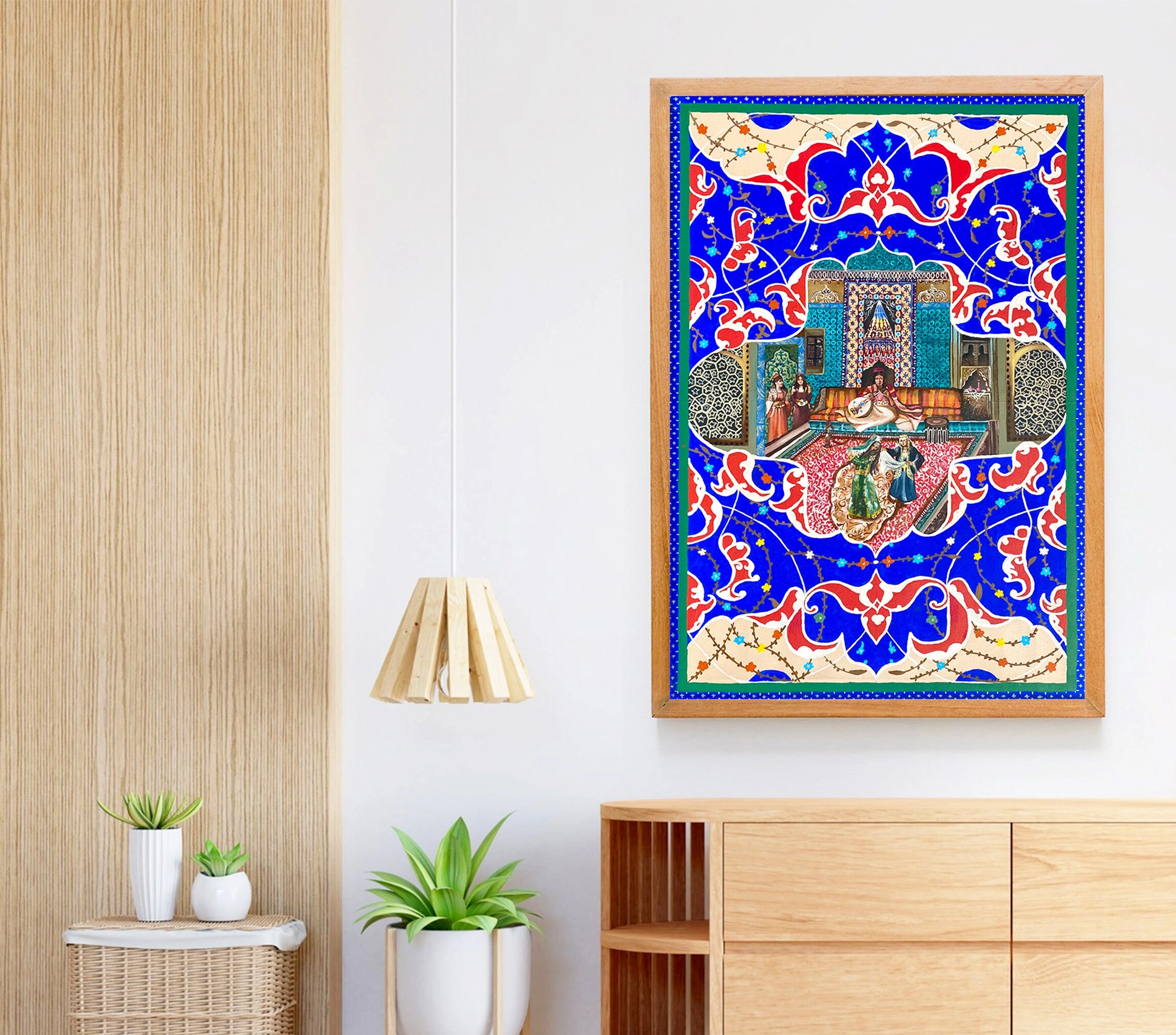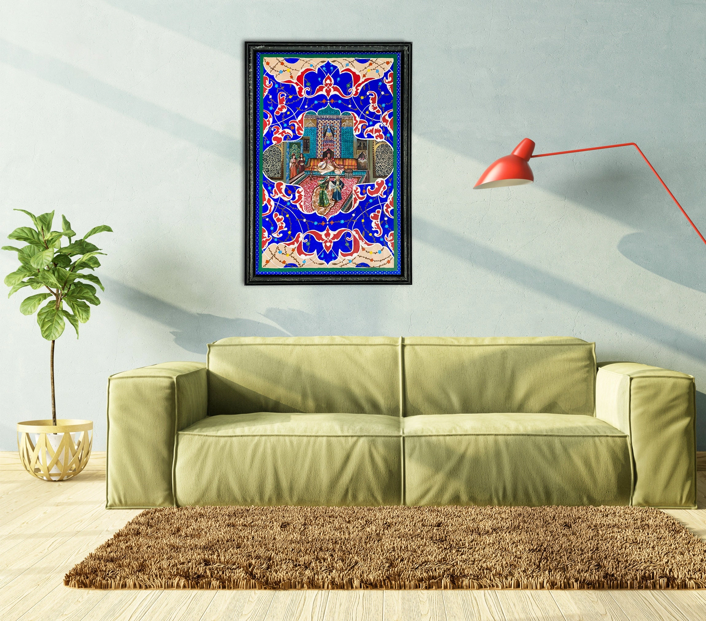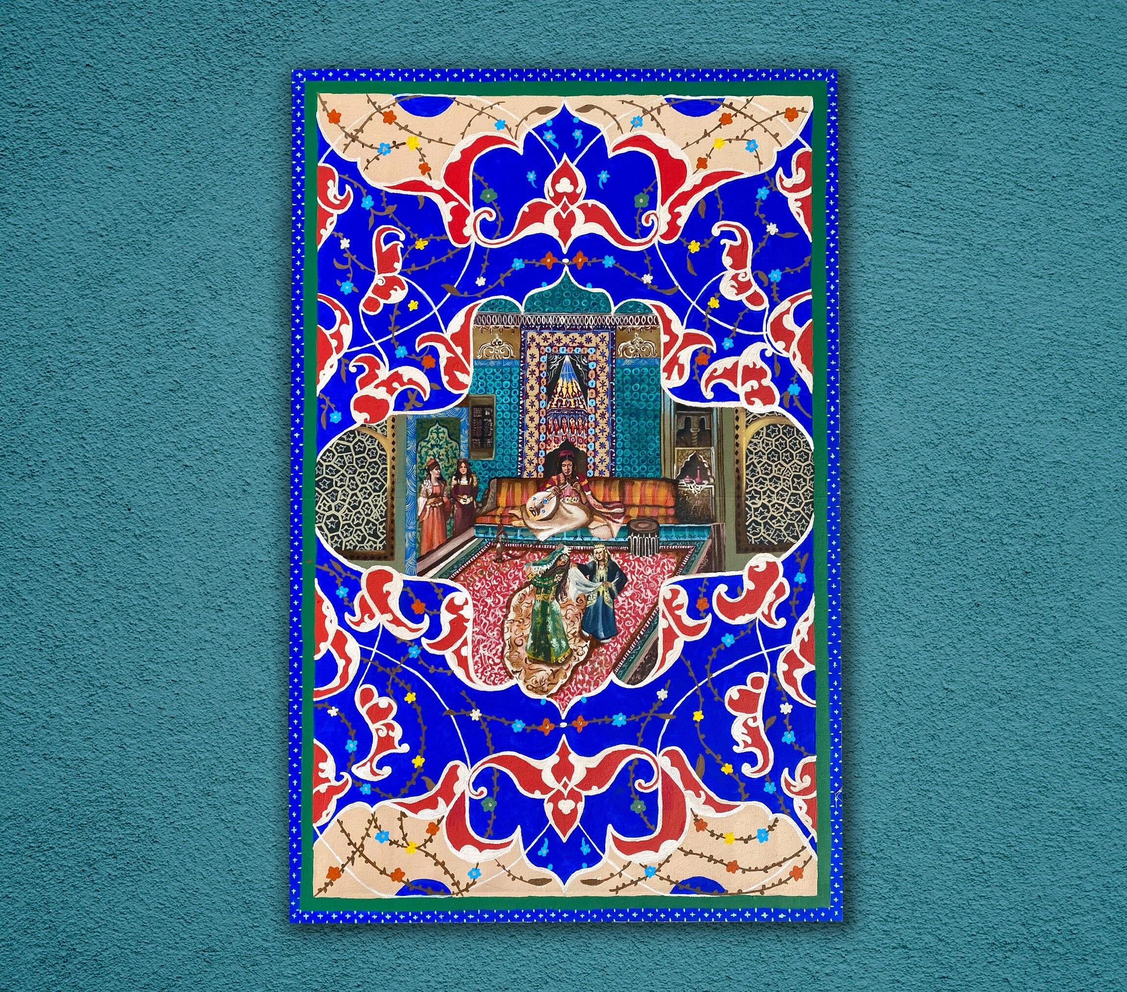 Hürrem Sultan ve cariyeler Osmanlı hareminden bir manzaranın resmedildiği yağlıboya tablo, zarif ve kendine has tarzıyla sizleri karşılıyor. Canlı renkleriyle bu Osmanlı temalı duvar sanatı, ambiyansınıza renk katmakla kalmayacak, aynı zamanda her zaman tadını çıkarabileceğiniz göz alıcı bir eseri de size sunacak. Osmanlı tablosunu diğerlerinden ayıran geleneksel Türk motifleriyle süslü parlak kırmızılar ve maviler içeren Osmanlı kilimi tasarımıdır. Mavi tonlardaki perdeler, geleneksel bir Osmanlı hareminin ayrıntılı ve renkli bir tasvirini yaparken bu yağlı boya eser, her köşesinden canlılık ve yaşam yayıyor. Osmanlı sarayından fırlamış gibi görünen bu tabloyu çok seveceksiniz. Eseri duvarlarınıza asın ve bu resmin evinize veya ofisinize incelik ve derinlik katmasını izleyerek keyfini çıkarın ve kalıcı anılar yaratın. Bu olağanüstü duvar resmini alarak Osmanlı kültürünün zenginliğini evinize getirin. Hürrem Sultan ve Osmanlı haremi, sergilendiği her duvarda unutulmaz bir etki bırakmayı vaat ediyor.