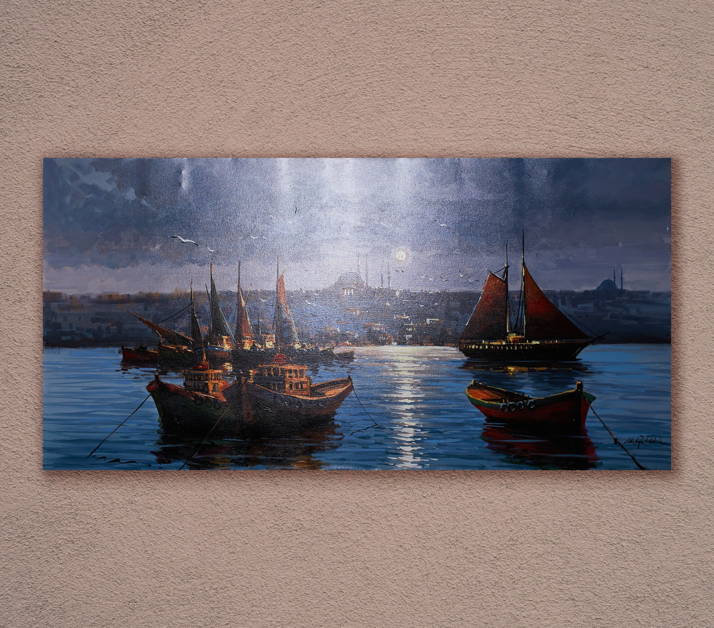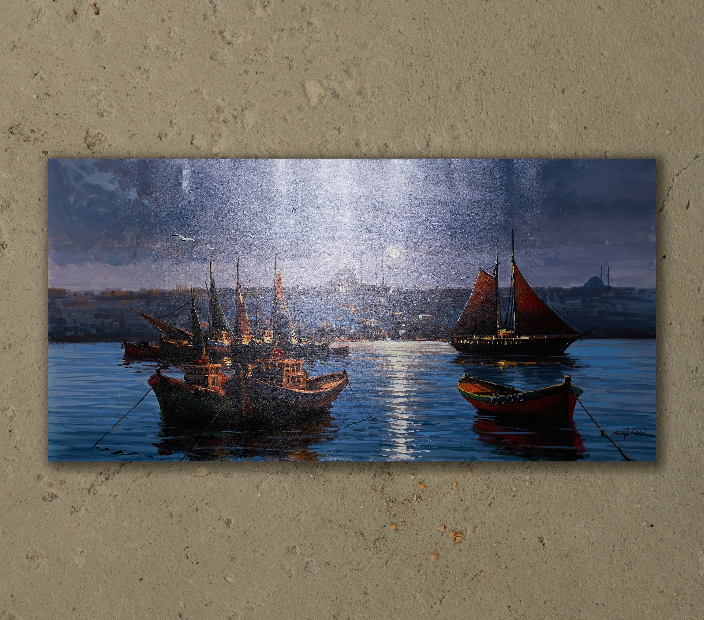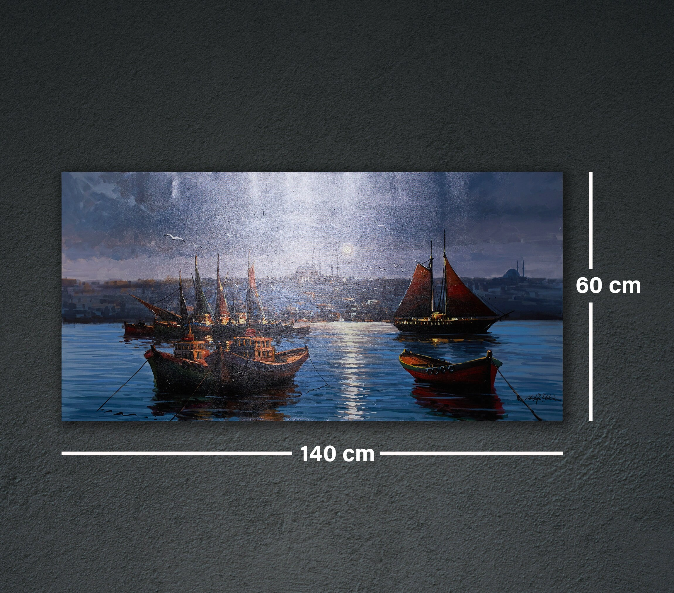 Muhteşem Boğaz manzarasını gecenin mavi tonlarındaki etkileyici detaylarıyla süsleyen, İstanbul Boğazı'nda kayıklar yağlıboya kanvas tablo, evinizi adeta bir vahaya dönüştürecek. Bu çarpıcı İstanbul gece manzarası, şehrin güzelliğini duvarlarınıza taşıyor. Gece gündüz hareketli kentin güzel kıyı manzarası ve etkileyici renk seçimi, İstanbul'un büyüsünü yakalayan diğer unsurlarla tamamlanıyor. Bu muhteşem İstanbul Boğaziçi tablosu ile İstanbul'un güzelliğini yaşayın. İster anlamlı bir ev hediyesi olarak, isterseniz kendi koleksiyonunuz için çarpıcı bir parça arıyor olun, bu İstanbul resminin sizi etkileyeceğinden emin olabilirsiniz.