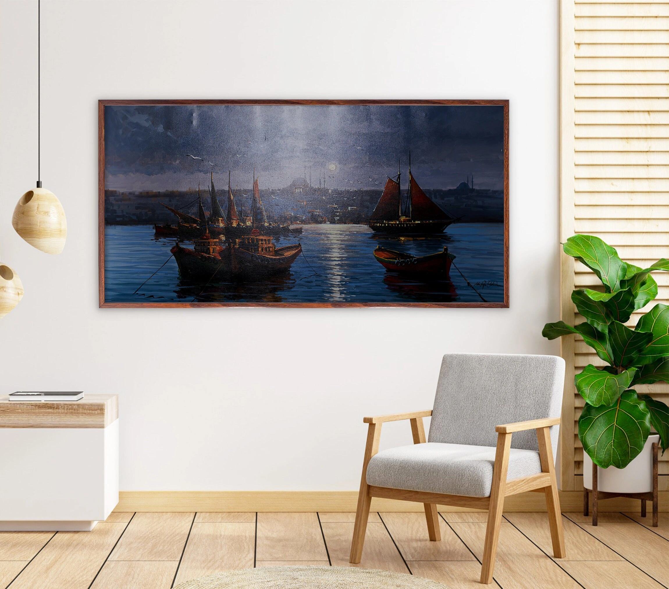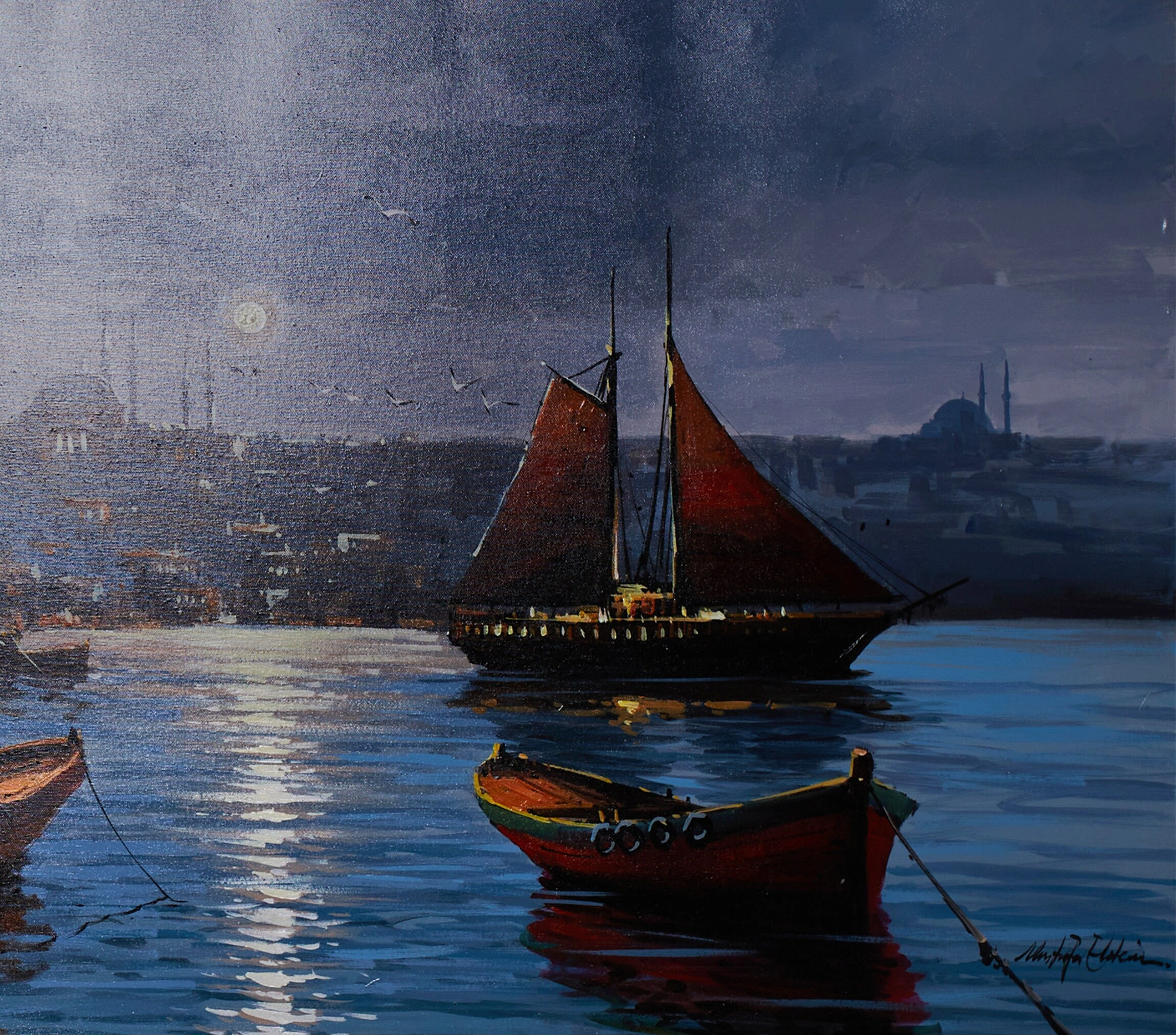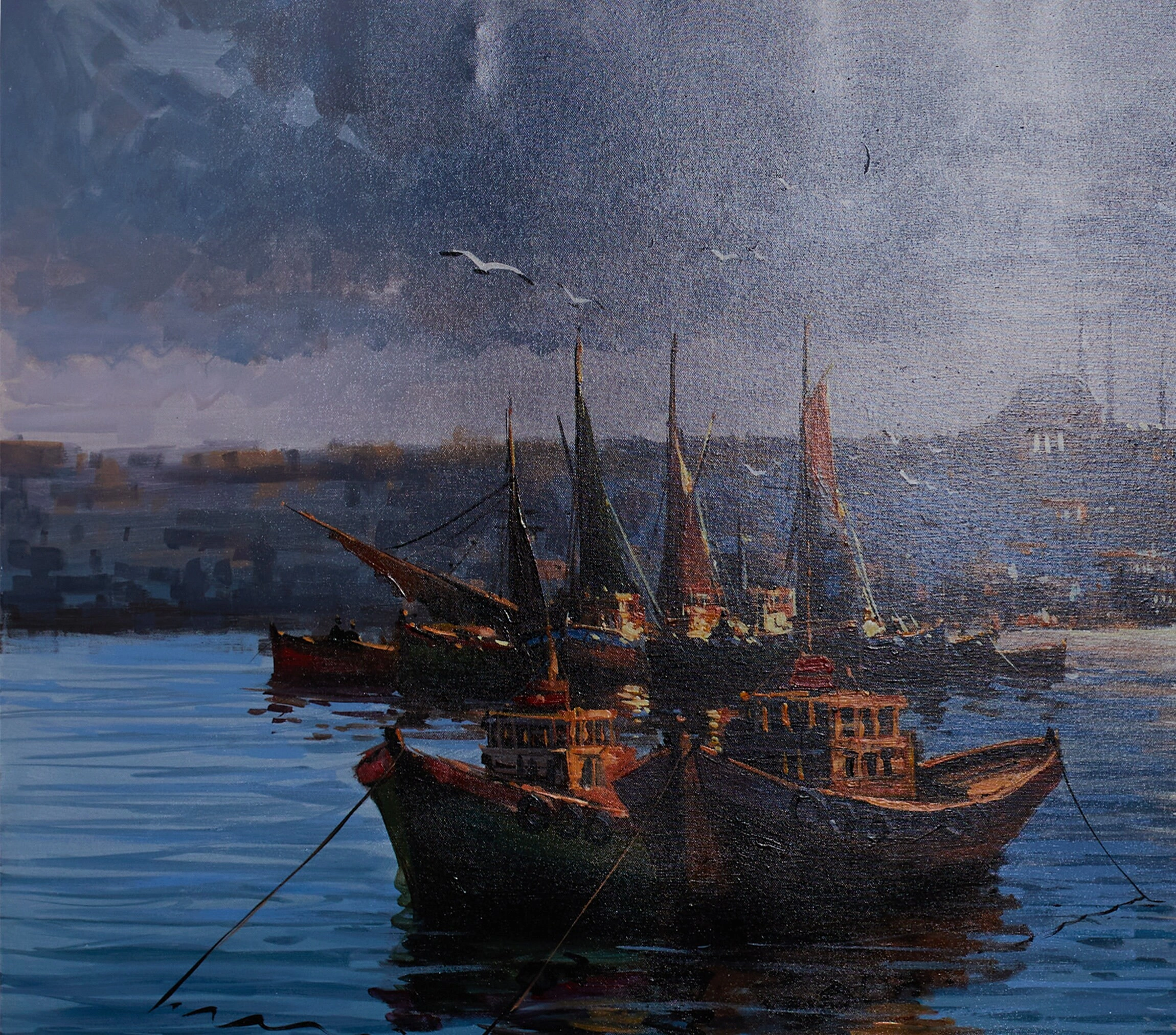 Muhteşem Boğaz manzarasını gecenin mavi tonlarındaki etkileyici detaylarıyla süsleyen, İstanbul Boğazı'nda kayıklar yağlıboya kanvas tablo, evinizi adeta bir vahaya dönüştürecek. Bu çarpıcı İstanbul gece manzarası, şehrin güzelliğini duvarlarınıza taşıyor. Gece gündüz hareketli kentin güzel kıyı manzarası ve etkileyici renk seçimi, İstanbul'un büyüsünü yakalayan diğer unsurlarla tamamlanıyor. Bu muhteşem İstanbul Boğaziçi tablosu ile İstanbul'un güzelliğini yaşayın. İster anlamlı bir ev hediyesi olarak, isterseniz kendi koleksiyonunuz için çarpıcı bir parça arıyor olun, bu İstanbul resminin sizi etkileyeceğinden emin olabilirsiniz.