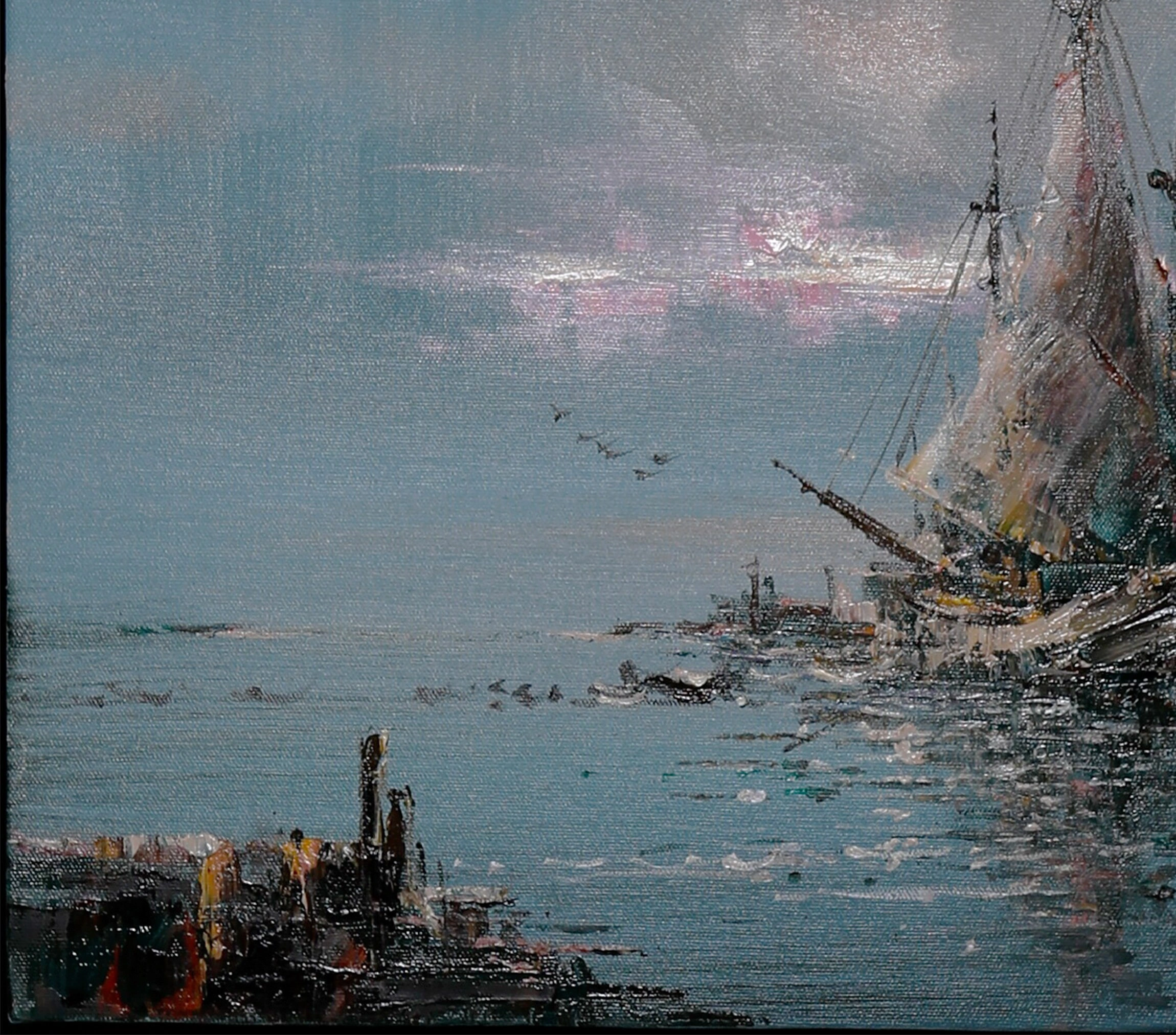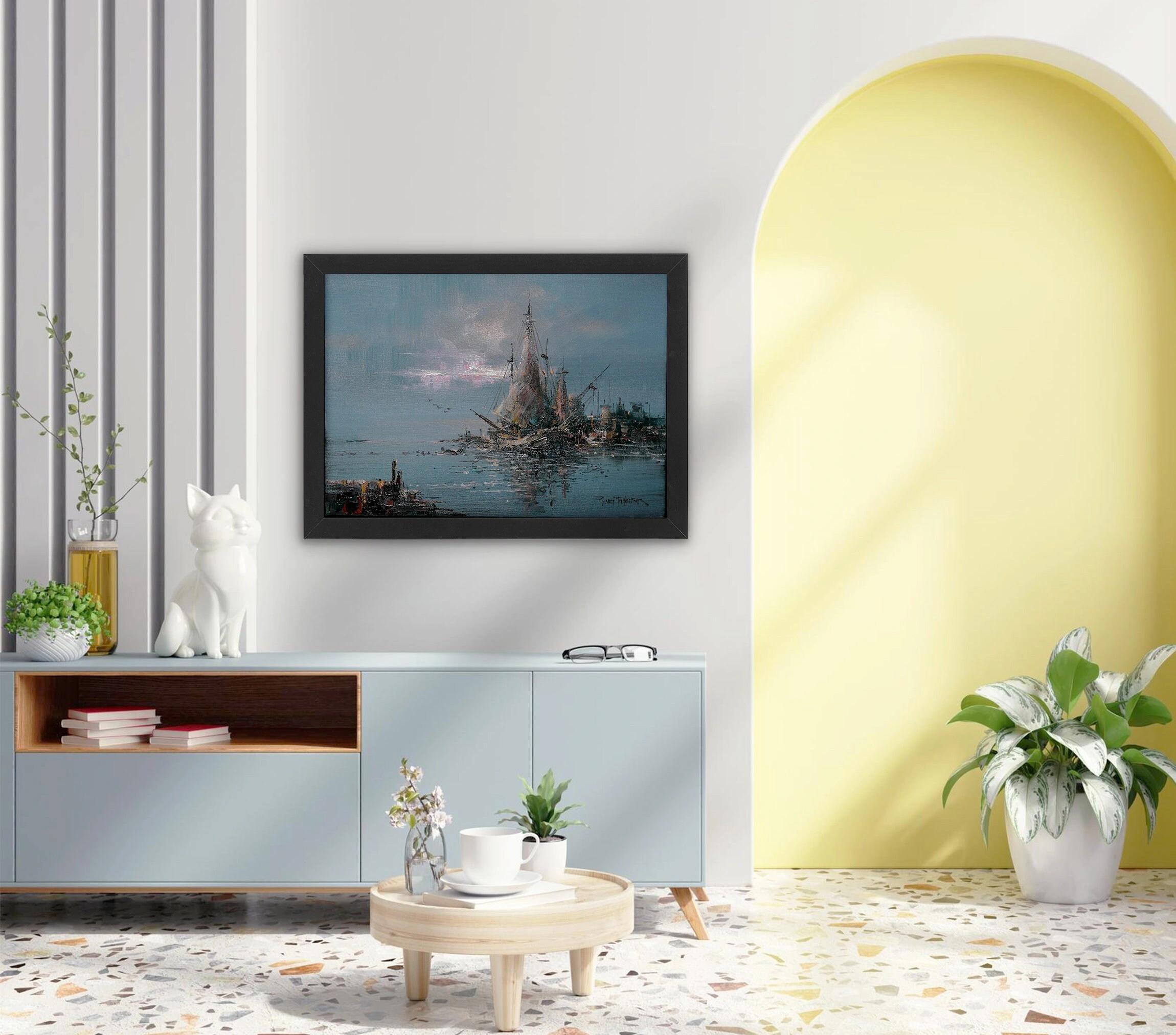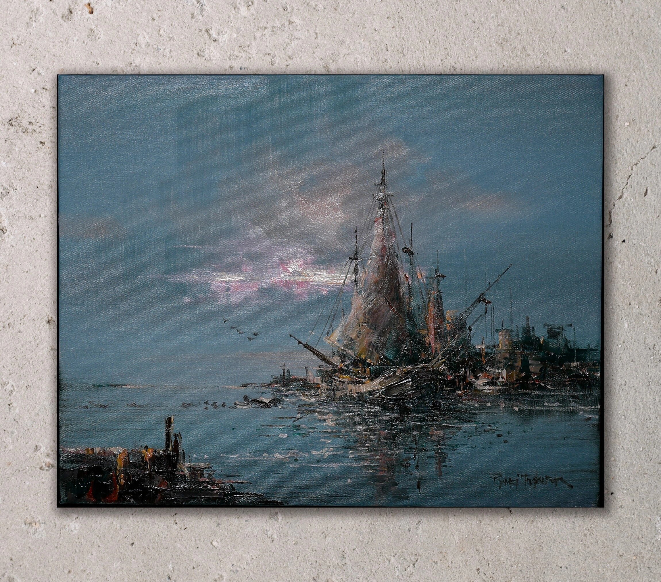 • İstanbul'da Tekneler Kanvas Tablo Tuval Üzeri Yağlıboya Deniz Manzarası Resmi Hediyelik Ev Eşyası Mavi Renkli Tablo