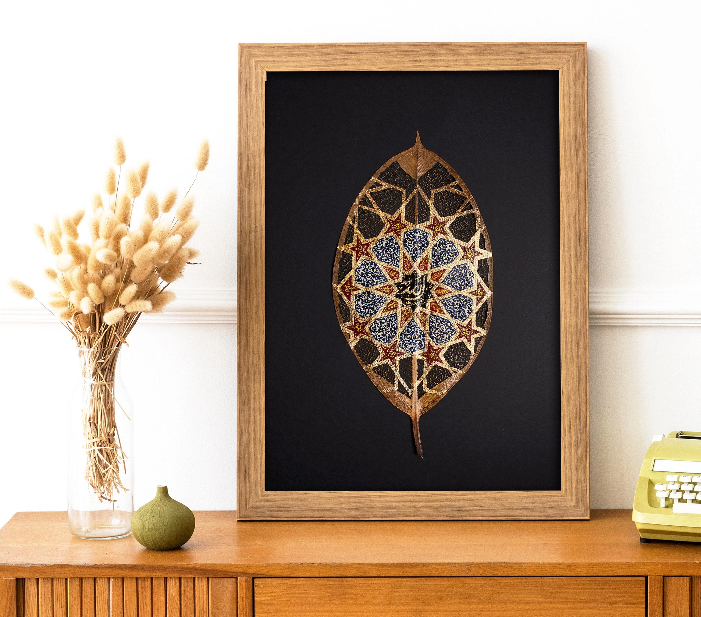 Kun Feyekun İslami yaprak sanatı, inancın ve sevginin büyüklüğünü aktaran güçlü bir mesaj veriyor. Eşsiz bir sanat eseri de arıyor olsanız, sadece evinizi anlamlı bir eserle de dekore etmek isteseniz, tezhip sanatıyla süslü bu Kun Feyekun yaprak sanatı doğru bir seçimdir. Altın varaklı el yapımı yaprak eser, İslami sanat tasarımlarında uzmanlaşmış yetenekli zanaatkarımız tarafından hazırlanmış olup benzersiz bir eserdir. İnce detaylı karmaşık tasarım sevgi ve inanç mesajlarını tasvir ederek evinize bir uyum duygusu verir. Tasarım, organik kauçuk ağacı yaprağı üzerine akriliklerle elde boyanmış olup renkler solmaya karşı dayanıklıdır. Canlı renkler ve keskin detaylar, tasarımı öne çıkartıyor. Kun Feyekun ev dekoru, her ortam için gerçekten çarpıcı bir eserdir. Kun Feyekun İslami ev dekorunu edierek evinize huzur ve sevgi getirin.