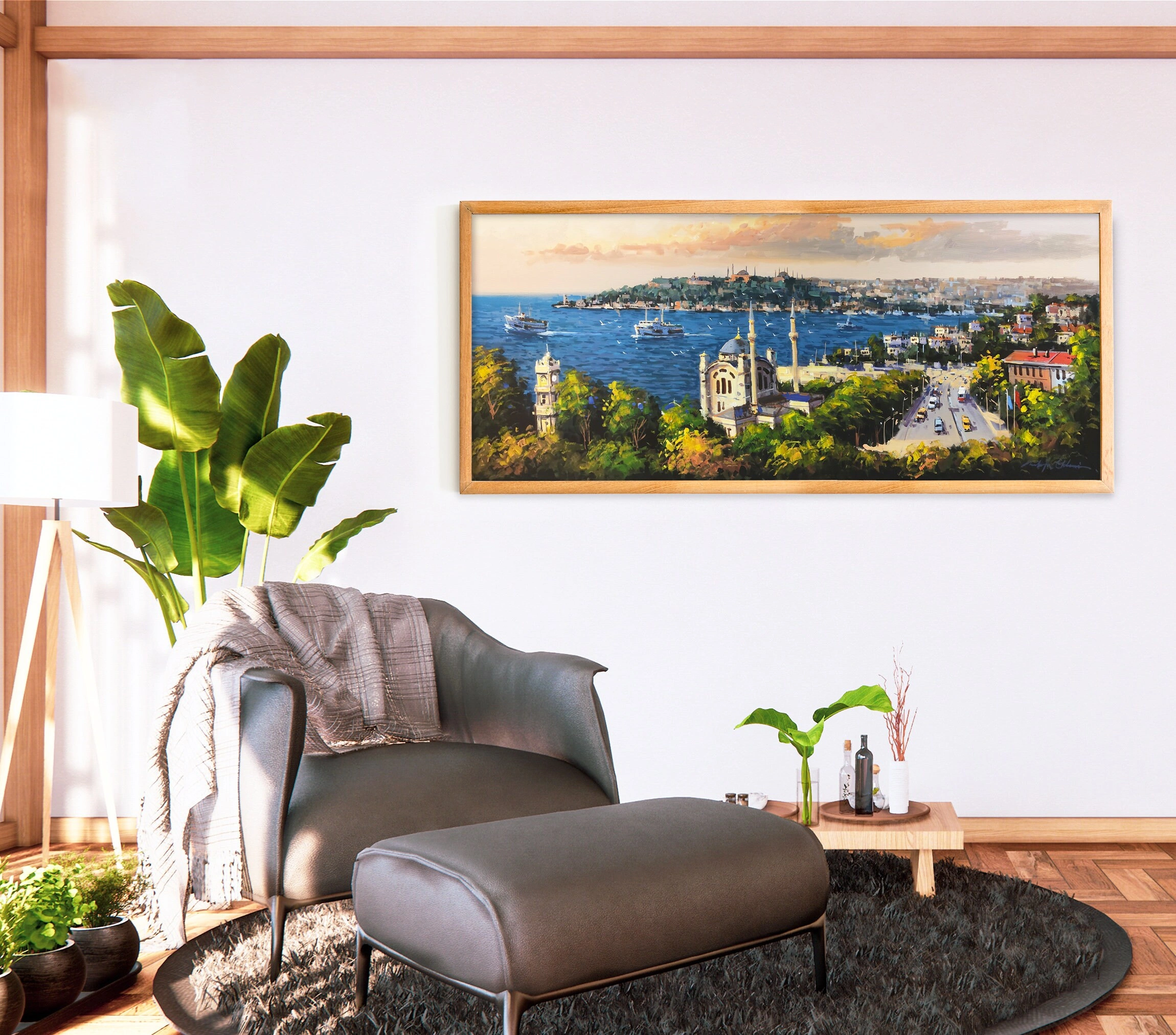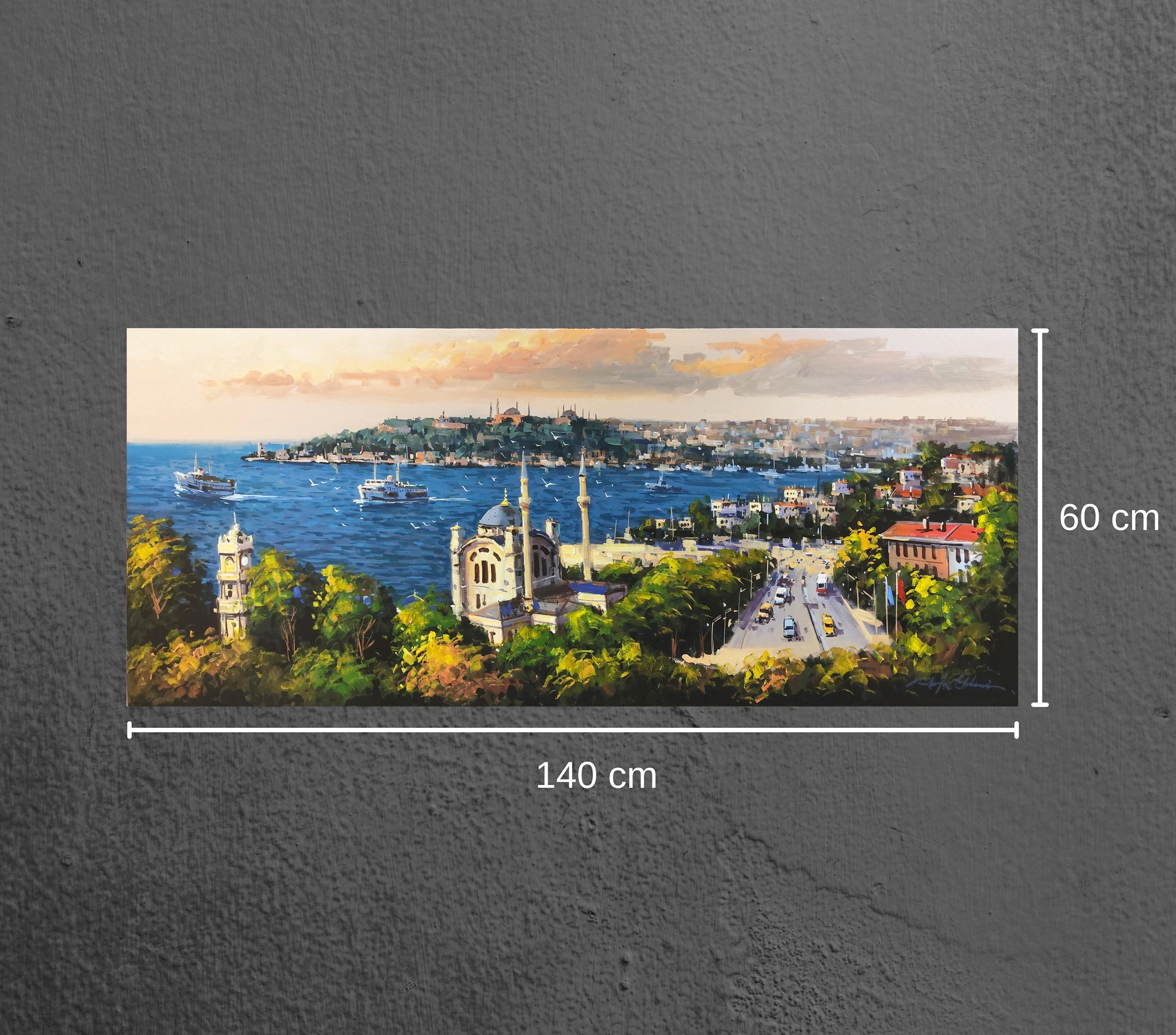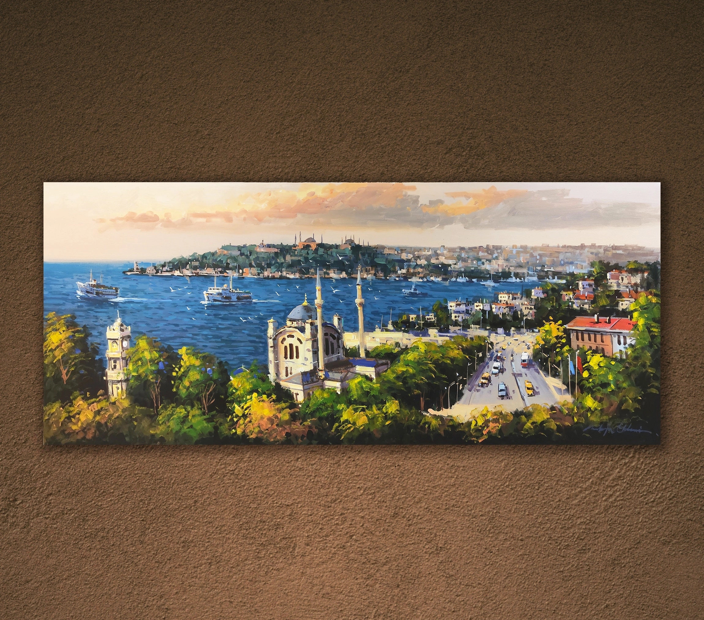 İstanbul manzaralı yağlı boya tablosu, dünyanın en güzel şehirlerinden biri olarak uzun ve zengin bir tarihe sahip İstanbul'un ikonik sembollerinin şık bir tasvirini yapıyor. Işıltılı görüntüsüyle İstanbul Boğaz manzarasının göz alıcı şekilde yorumlandığı bu kanvas tablo Ortaköy ve çevresine canlı renklerle görkemli bir bakış sunuyor. Canlı renklerle ve göz alıcı manzarasıyla her ortamda parıldayacak bu İstanbul Ortaköy Cami manzaralı kanvas tablo, koleksiyonunuza ekleyebileceğiniz sıcak bir eser olmakla beraber her dekora eşlik edecek mükemmel bir parçadır. Ofiste, oturma odasında, salonda ya da mutfakta sergileyin, gören herkesin hayran kalacağı bir parça olacak. Bu eşsiz İstanbul manzarasıyla, şehrin güzelliğini evinize getirin. Sevgiyle üretilmiş, el yapımı bu tuval sanatı, her odaya bir enerji ve zarafet kıvılcımı katacak.