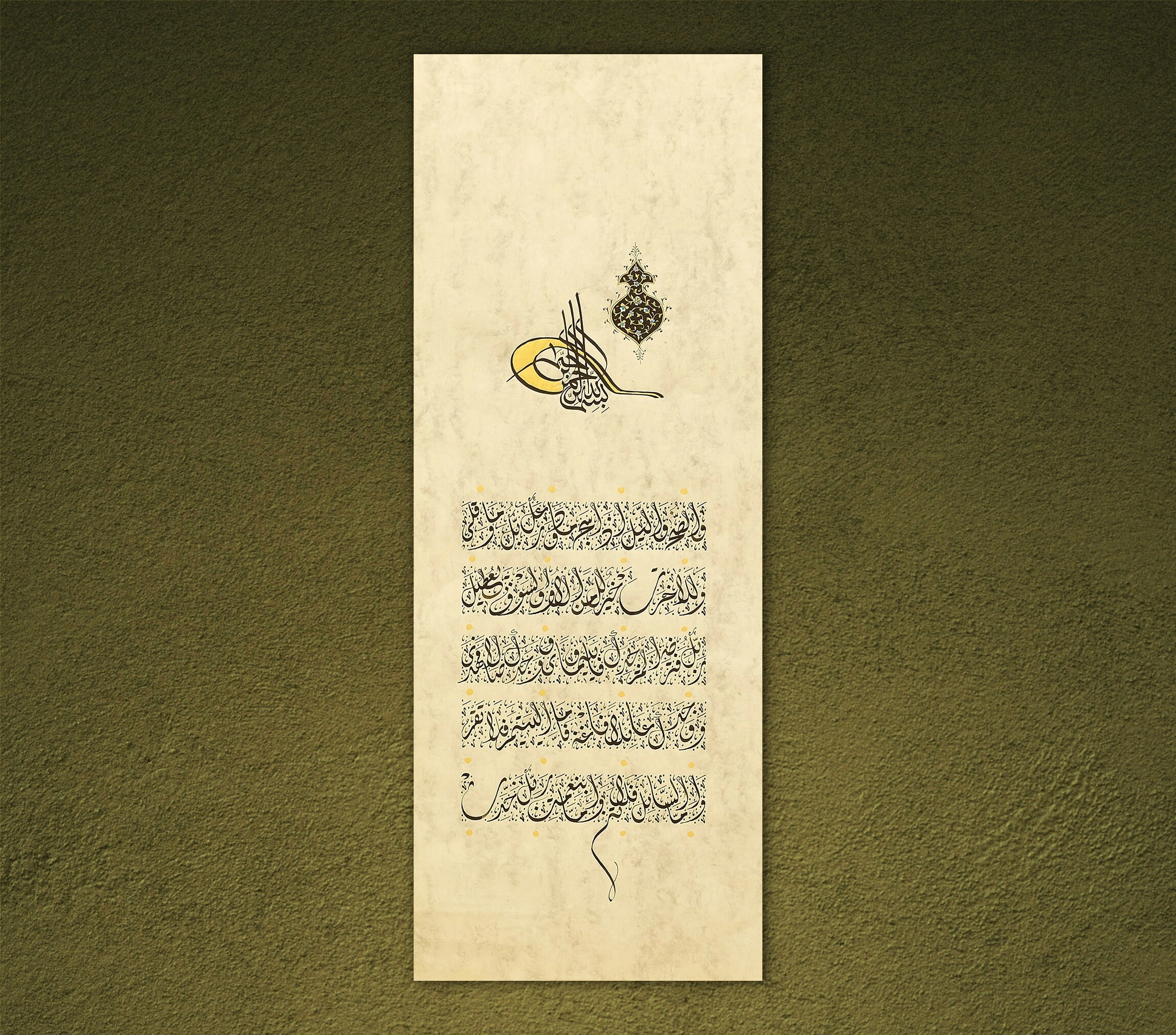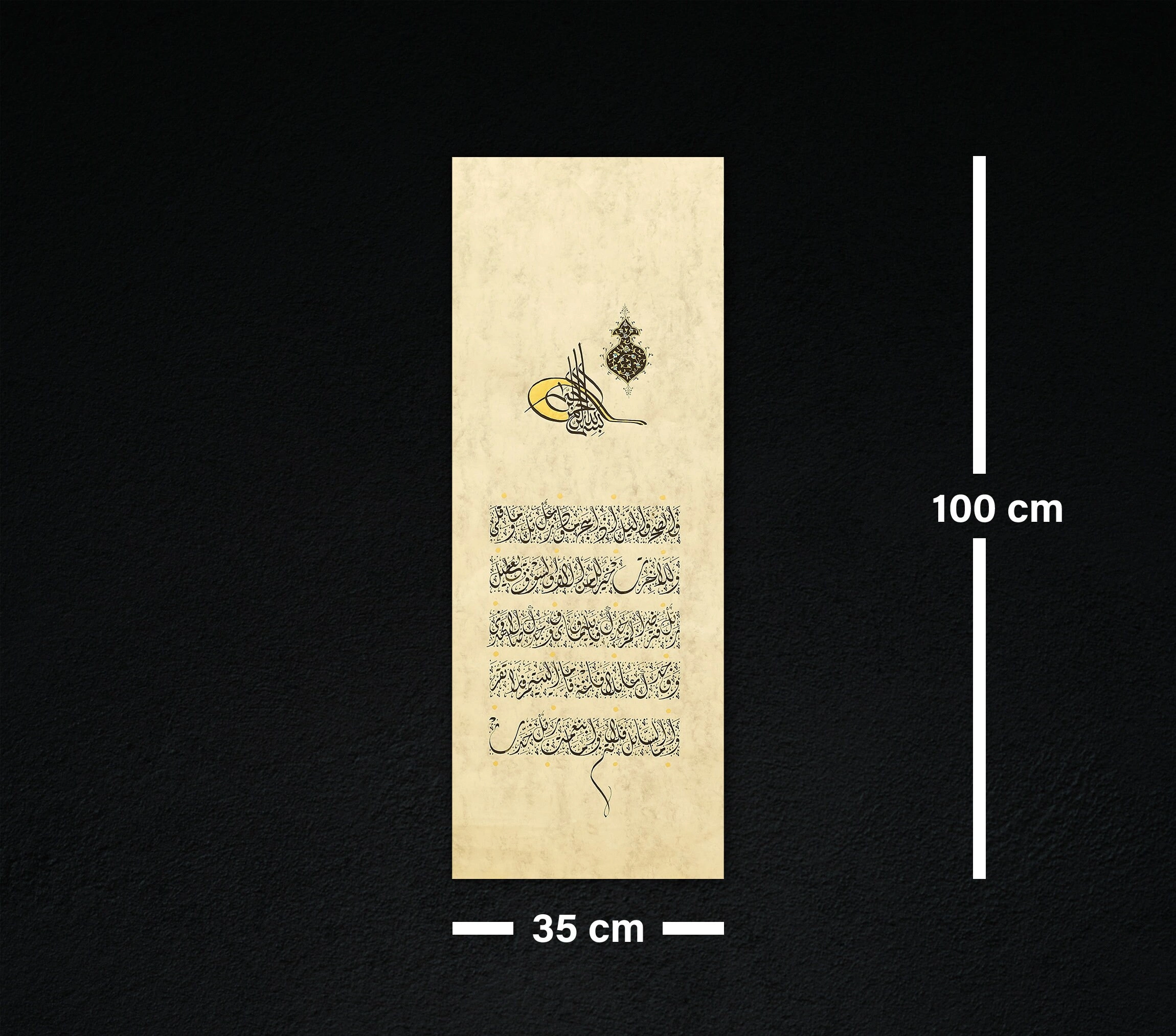The imagery of this Muslim wall art is inspired by Islamic and Ottoman culture, focusing on the beauty of Ottoman Arabic calligraphy which is an art form that has been passed down for centuries. This statement contains, intricate lines of script with quotes from the Quran and Hadiths, creating an aesthetic that is not only calming and peaceful, but also educational.