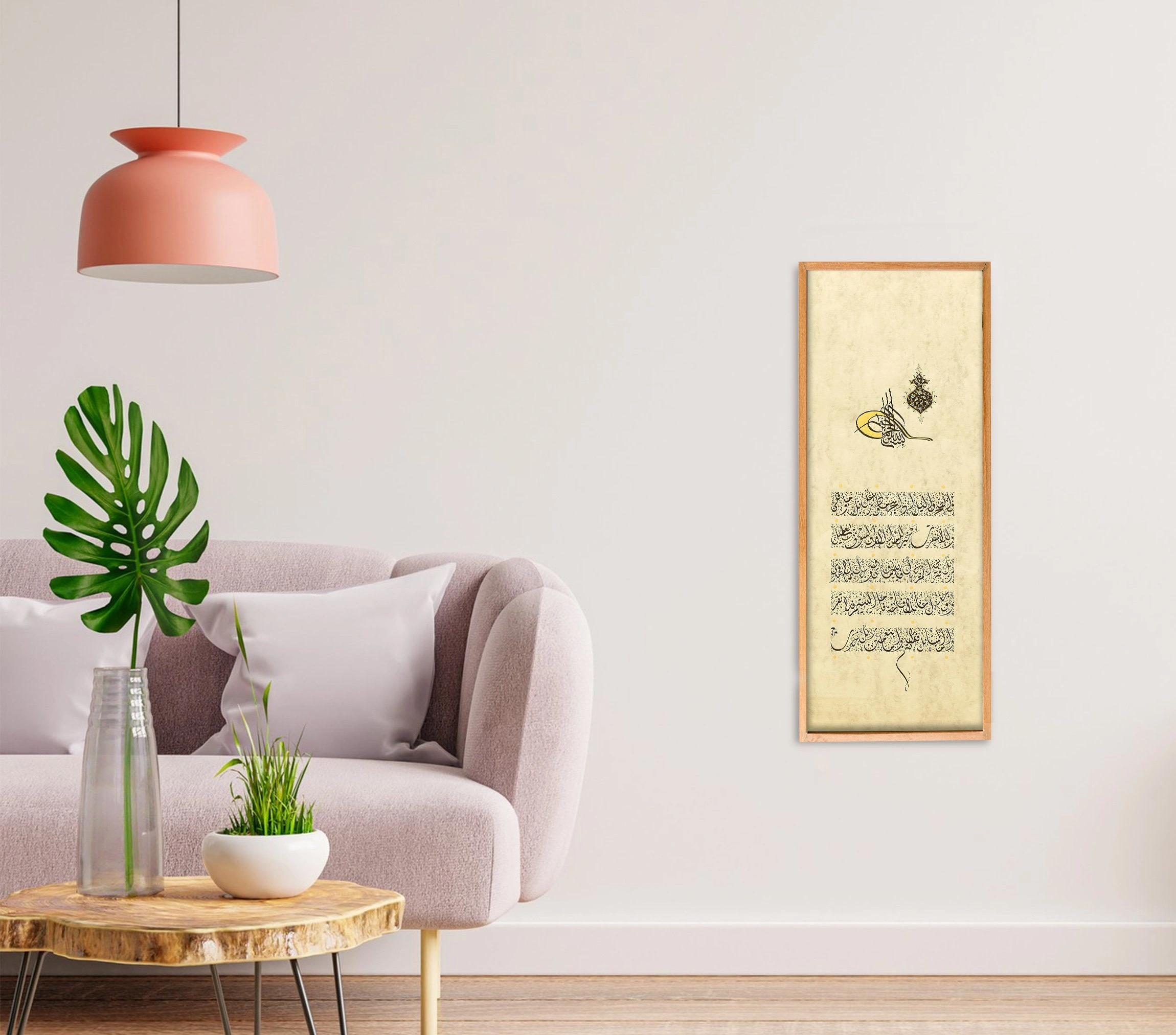 Stunning piece of Ottoman Arabic calligraphy is the perfect addition to any home decor. Create a unique atmosphere with this Arabic minimalist wall art, crafted from natural degraded paper. Ottoman style art offers a chic and powerful statement in any home.