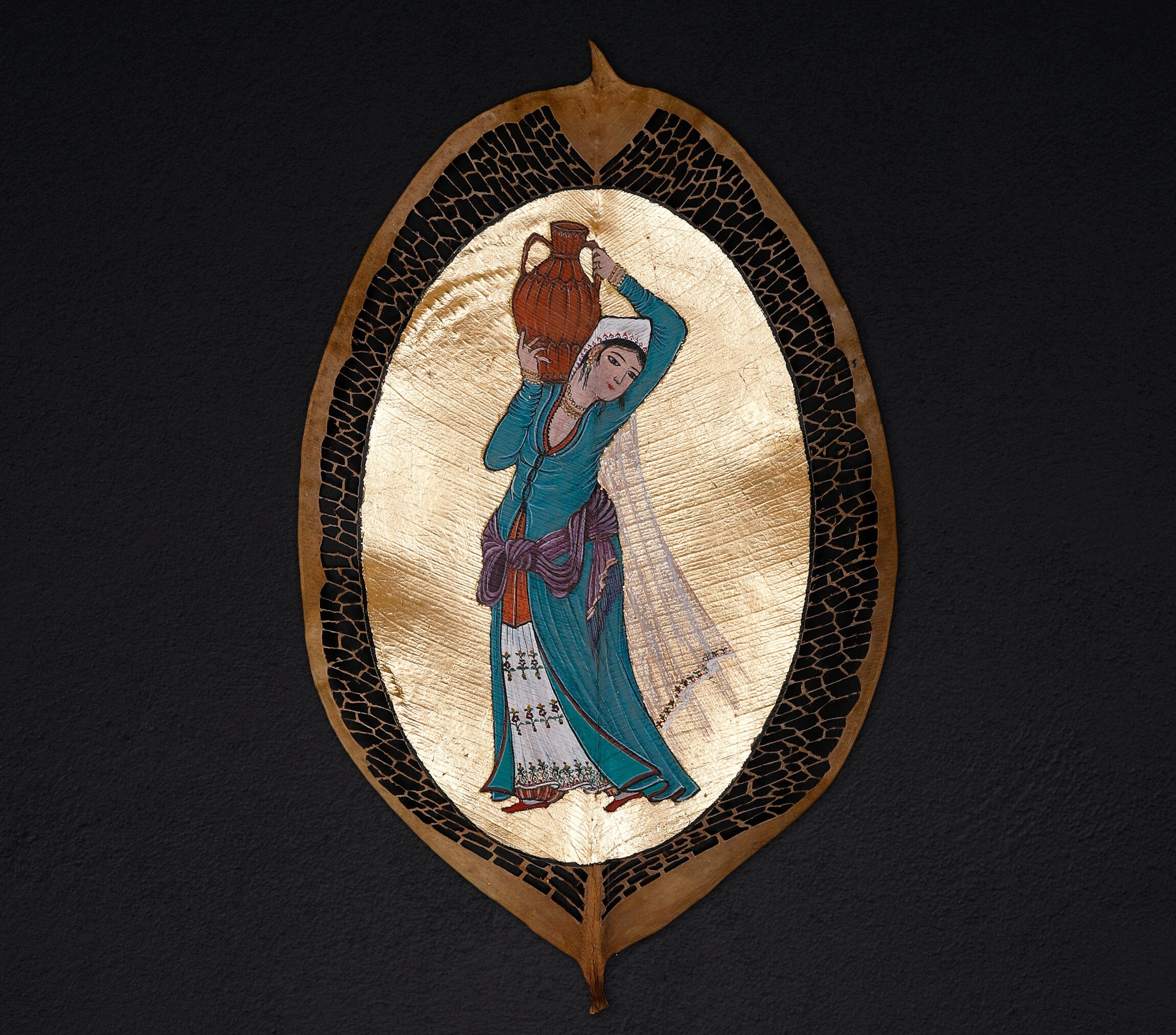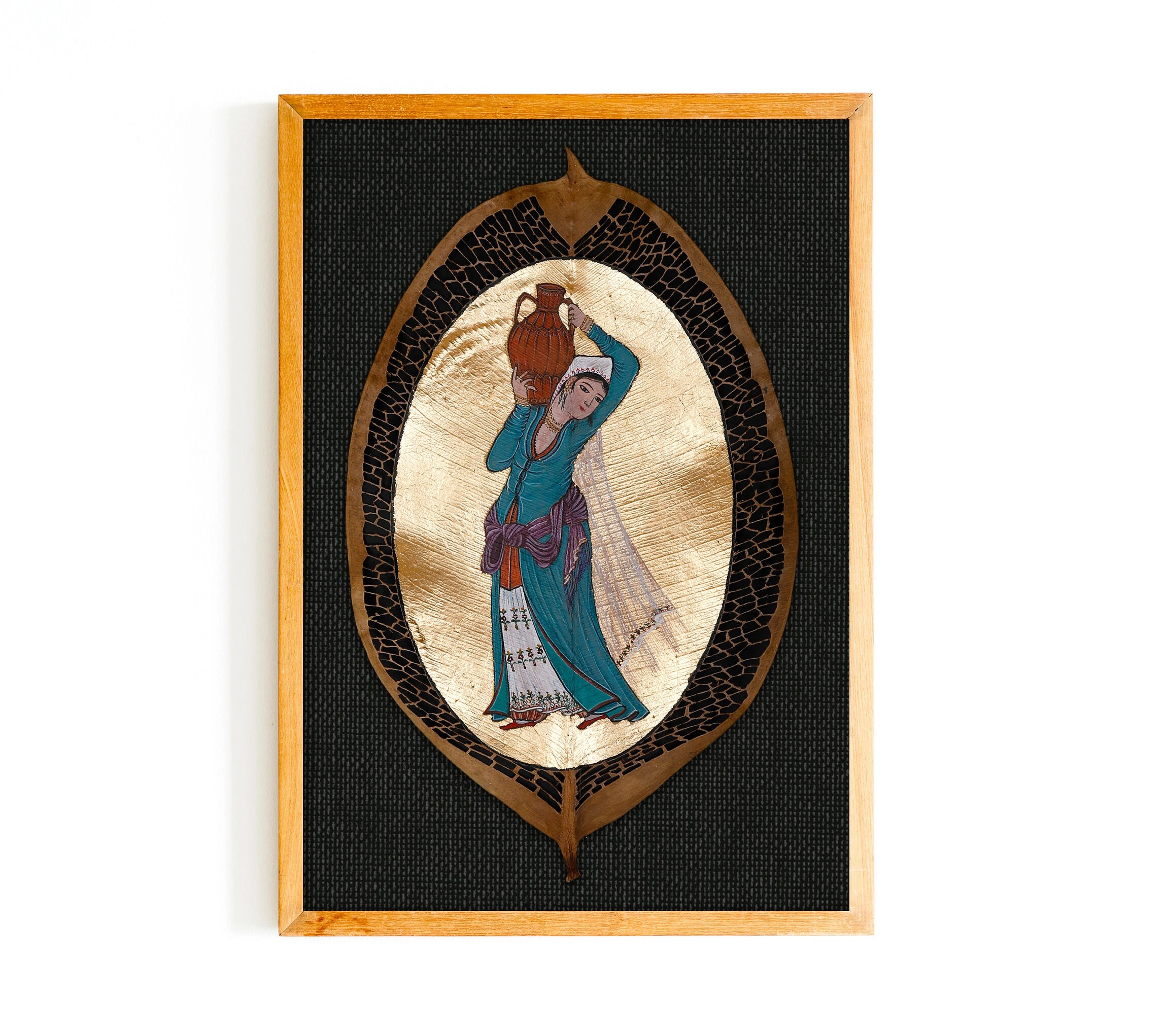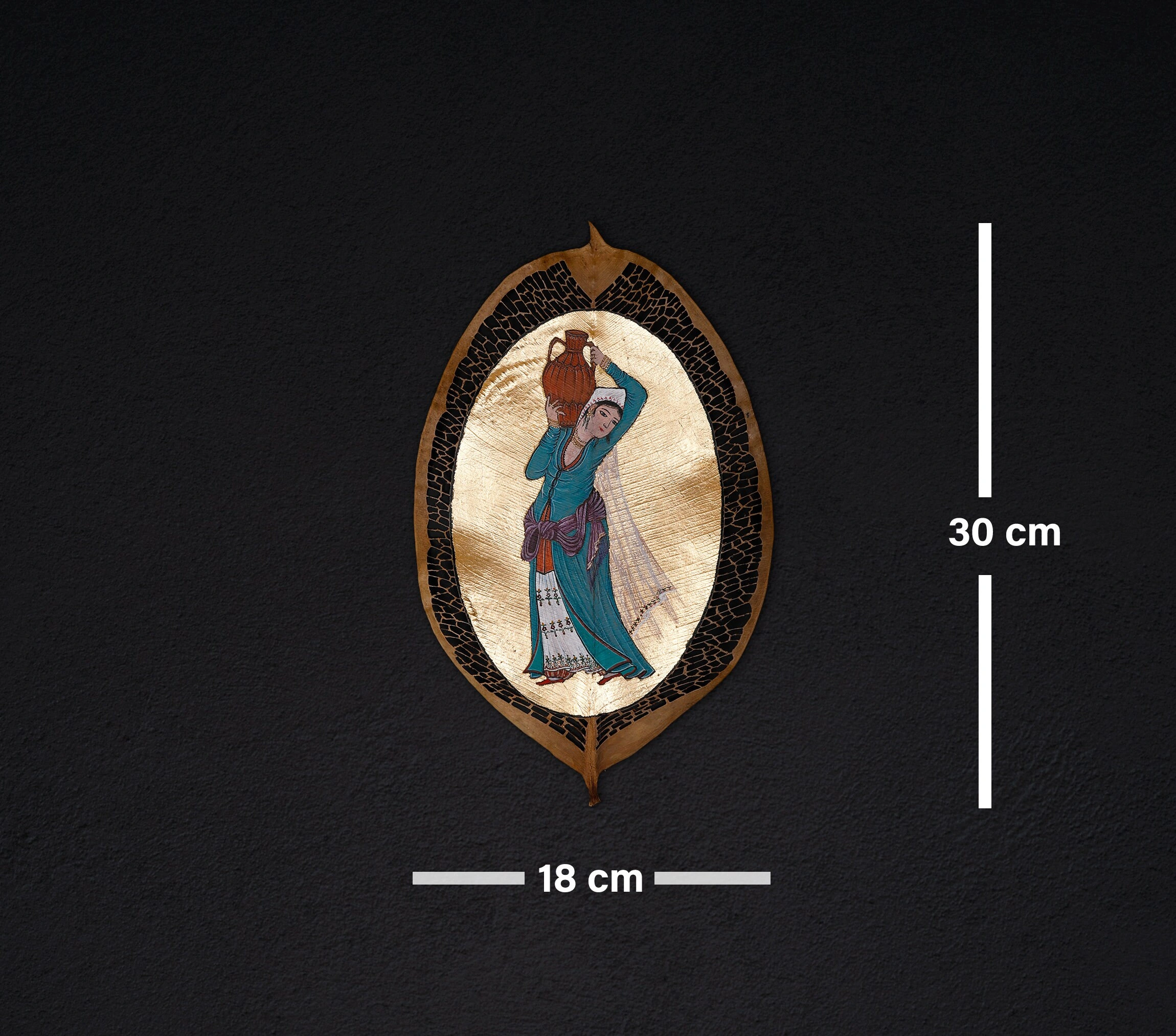Zarif ve göz alıcı tasarımıyla elindeki su testisini taşırken görülen bir Osmanlı cariyesi figürünün resmedildiği bu el yapımı yaprak sanatı her eve ilahi ve benzersiz hisler eklemek için mükemmel seçimdir. Bu güzel yaprak eser estetik görünümüyle evinizdeki her alana incelik ve tarz duygusu getirecek bir eserdir. Yeşil renklerdeki kıyafetiyle elindeki su testisini taşıyan utangaç bir kızı öne çıkaran tasarım göz alan altın varaklı parlak arka plana üzerine işlenmiştir. Bu nadir Ficus Elastica(kauçuk ağacı yaprağı) eseri tamamen el yapımıdır.