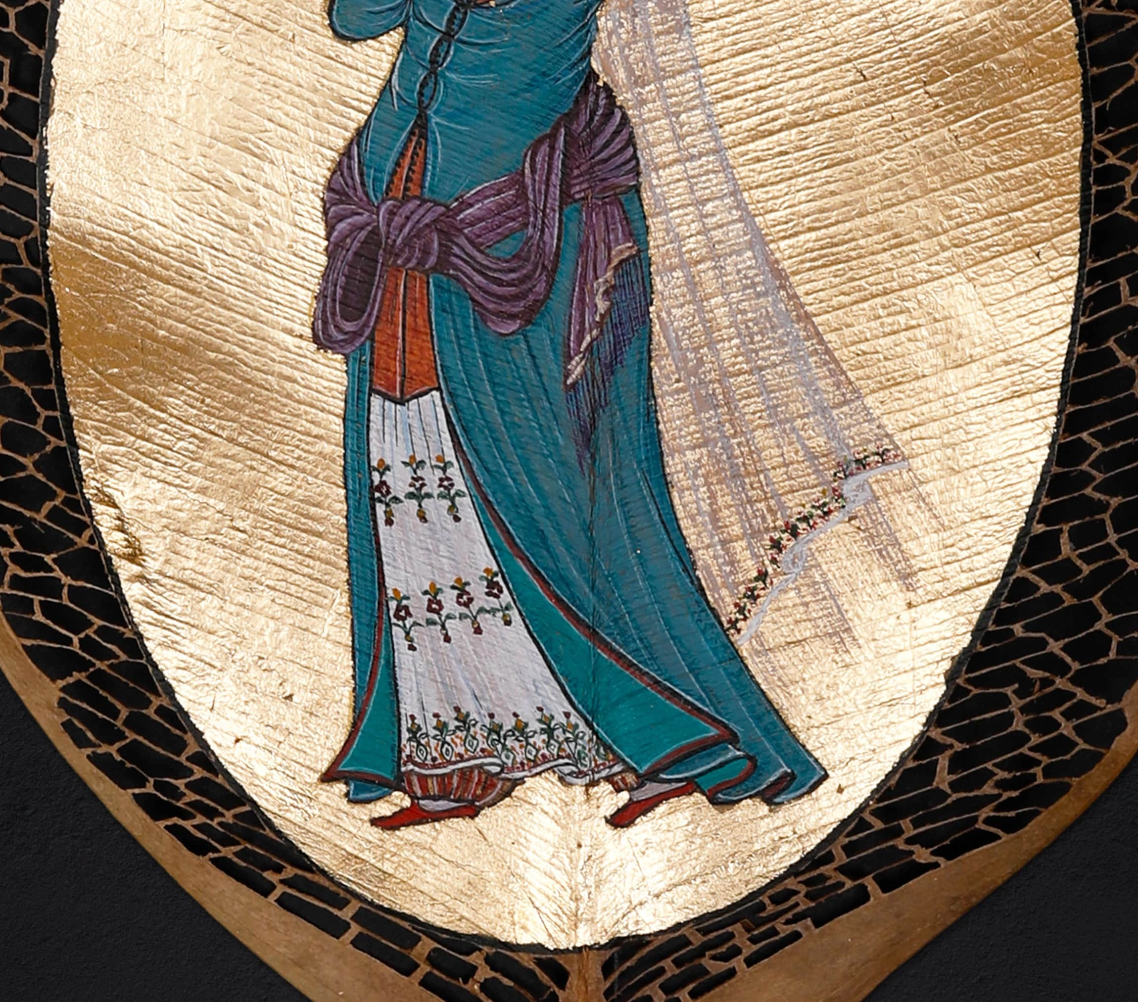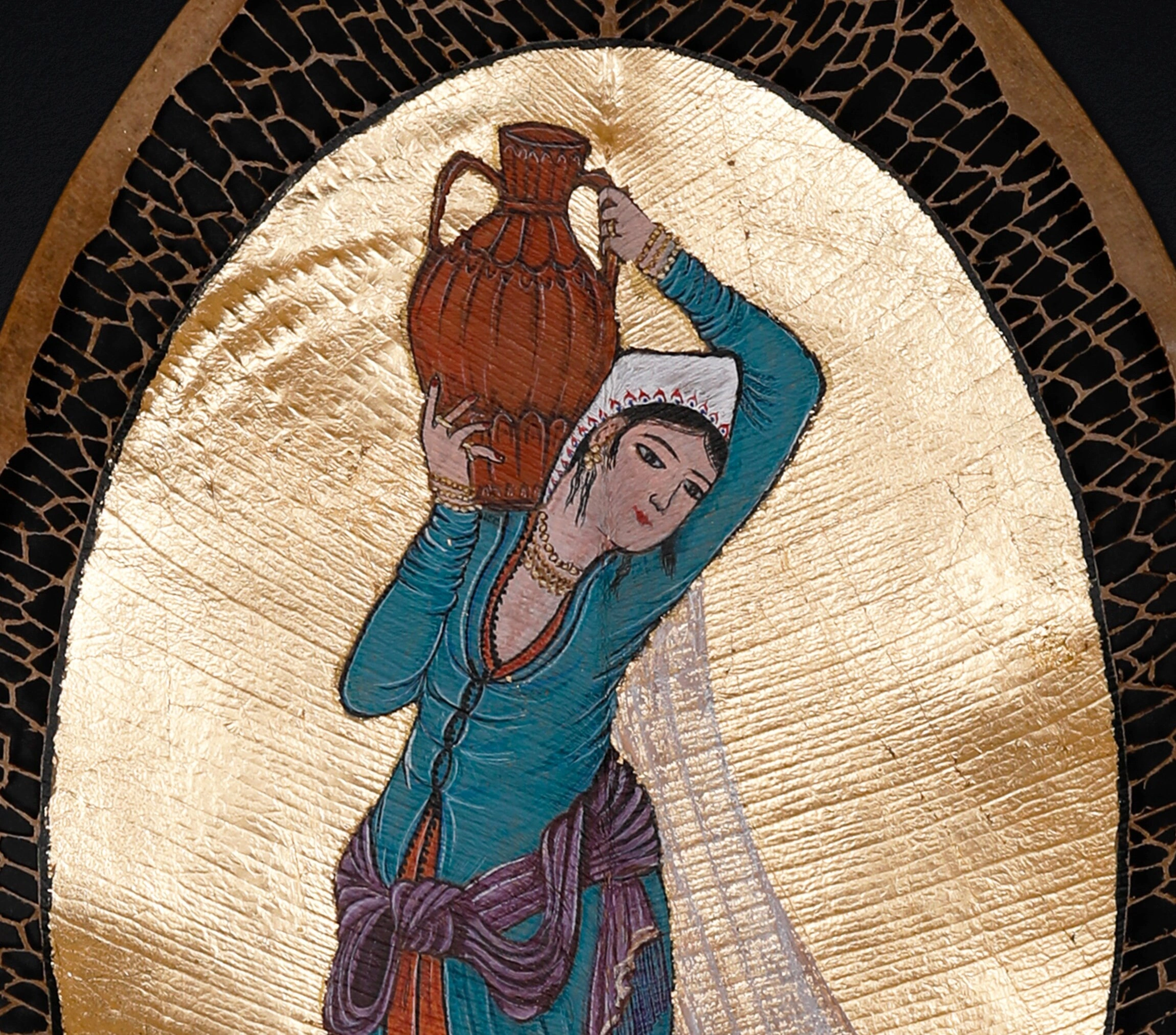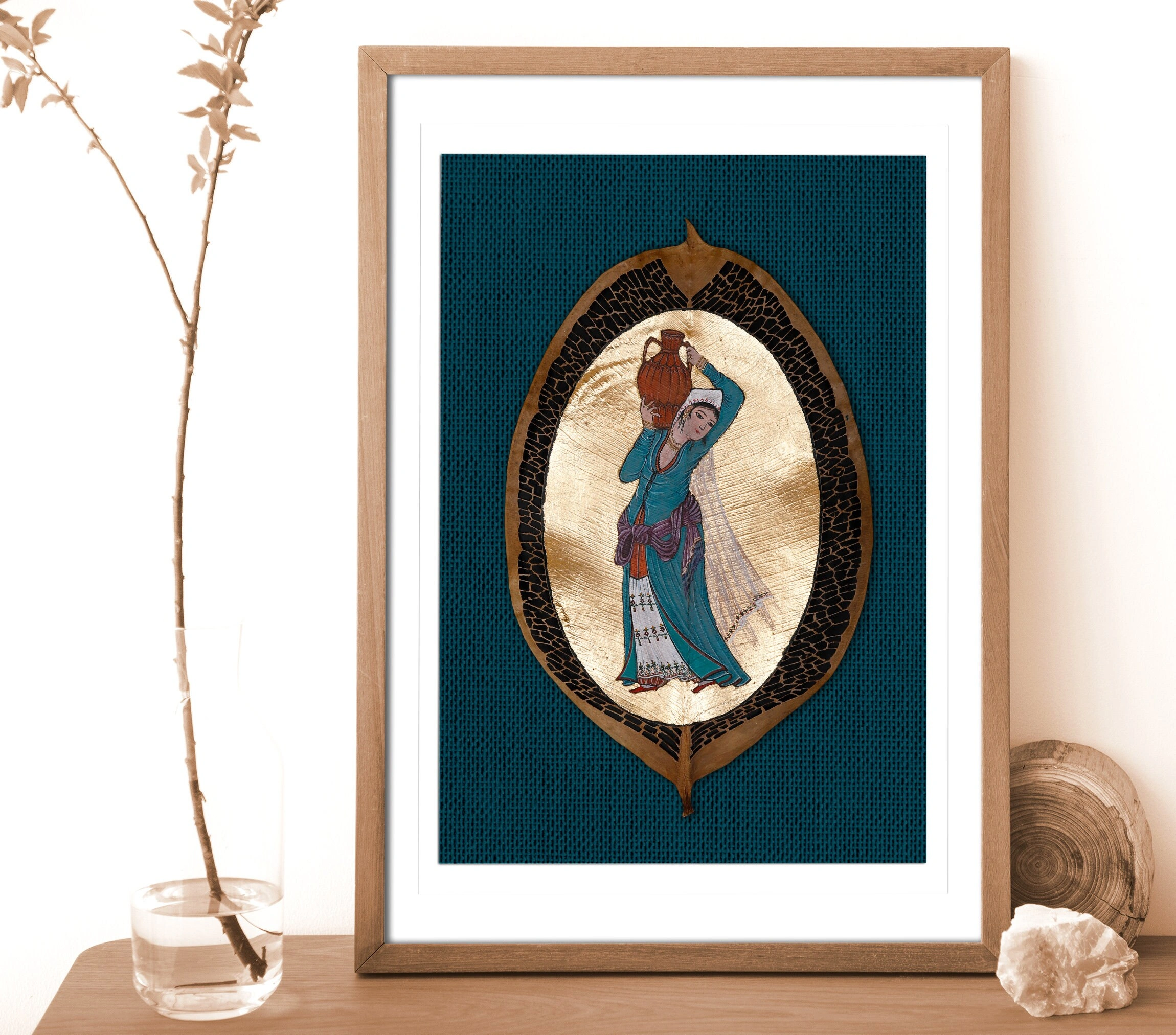 Zarif ve göz alıcı tasarımıyla elindeki su testisini taşırken görülen bir Osmanlı cariyesi figürünün resmedildiği bu el yapımı yaprak sanatı her eve ilahi ve benzersiz hisler eklemek için mükemmel seçimdir. Bu güzel yaprak eser estetik görünümüyle evinizdeki her alana incelik ve tarz duygusu getirecek bir eserdir. Yeşil renklerdeki kıyafetiyle elindeki su testisini taşıyan utangaç bir kızı öne çıkaran tasarım göz alan altın varaklı parlak arka plana üzerine işlenmiştir. Bu nadir Ficus Elastica(kauçuk ağacı yaprağı) eseri tamamen el yapımıdır.