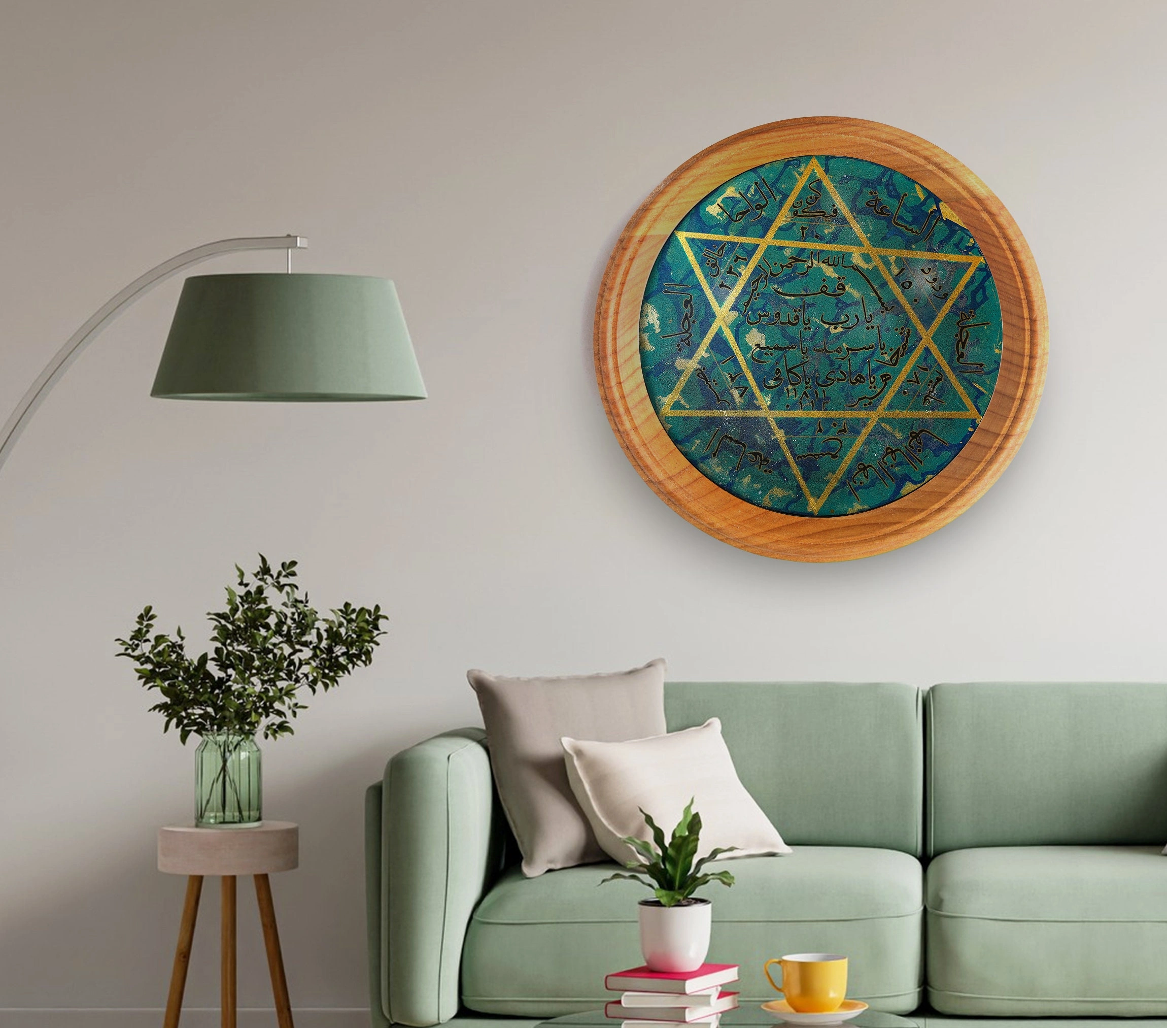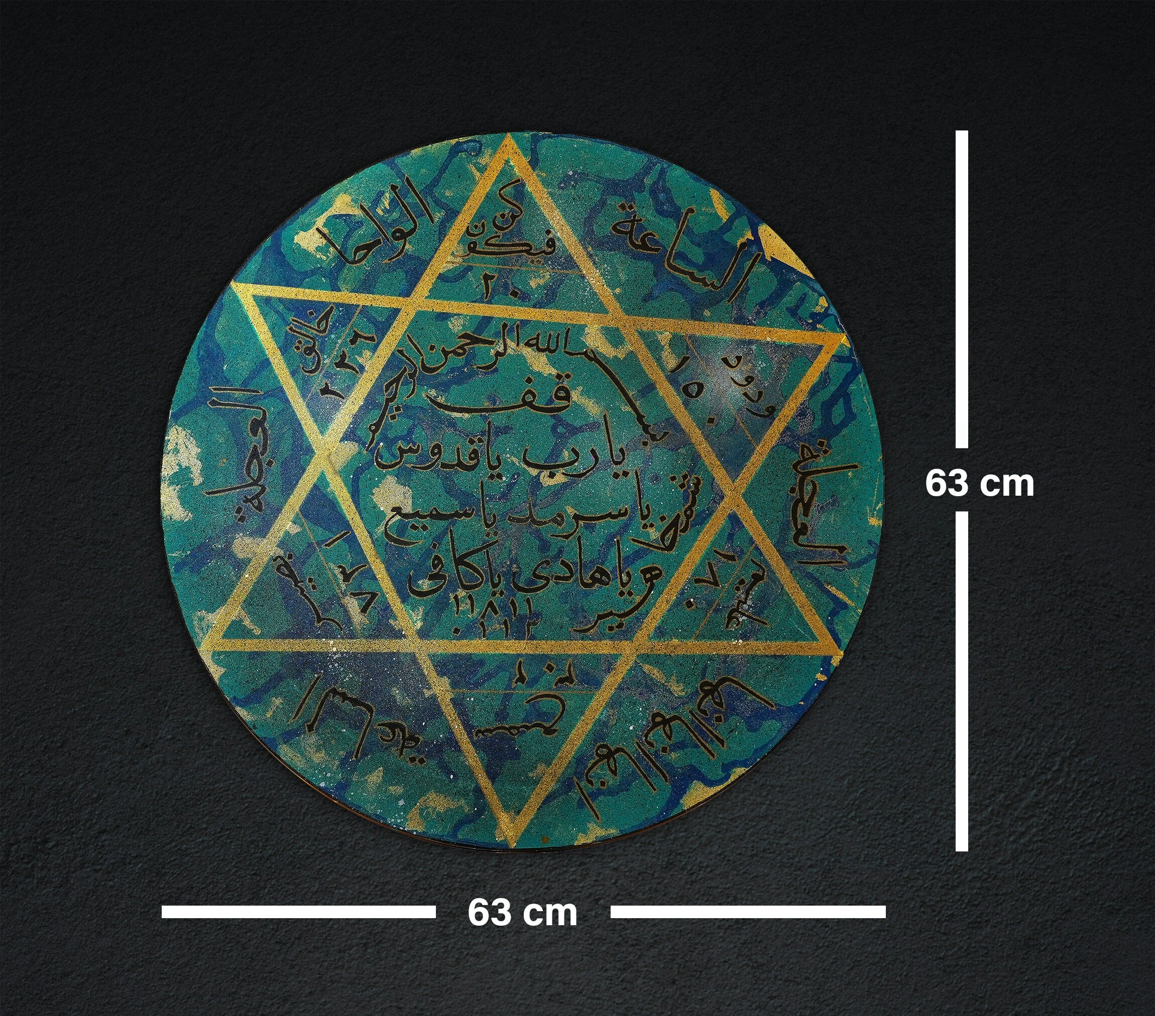 Yıldız formundaki Süleyman Mührü ile süslenmiş Allah'ın 99 ismi İslami hat sanatı, evinize veya çalışma alanınıza muhteşem bir hava katmanın gerçek yoludur. Klasik Arapça kaligrafi stili kullanılarak özenle işlenmiş yeşil hat eseri, her duvarda ve ofis dekorunda zarafetle öne çıkacak. İslami hat kaligrafisi, yıldız motifli Süleyman'ın Mührü'nden ve Esma Ül Hüsna'dan ilham alan tasarımıyla, eseri sergileyenlere koruma sağlayacaktır. Bu çekici İslami duvar sanatı eseri, Allah'ın hepimize karşı olan merhamet ve şefkatinin çarpıcı bir hatırlatıcısıdır. Allah'ın 99 İsmi olarak da bilinen Esma Ul Hüsna'yı içeren kanvas duvar dekoru, her sanat koleksiyonuna güçlü ve ilham verici bir ektir. İslami duvar sanatının zamansız bir parçası olan bu İslami hat tablo, ev dekorunuzun değerli bir parçası olacak. Aileniz ve dostlarınız için de Allah'ın lütuf ve korumasını hatırlatan ve gören herkesin hayran kalacağı bir hediye seçeneğidir. Bu muhteşem sanat eseri, ister evinizde ister ofisinizde sergilensin kesinlikle bir konuşma başlatıcı olacaktır. Bu Süleyman Mührü ve Allah'ın 99 ismi kanvas hat sanatıyla ambiyansınıza maneviyat ve kültür dokunuşu ekleyin.