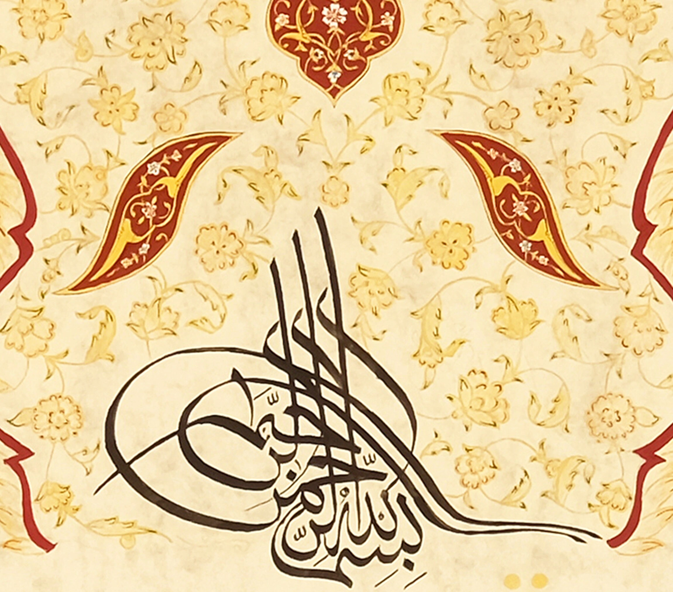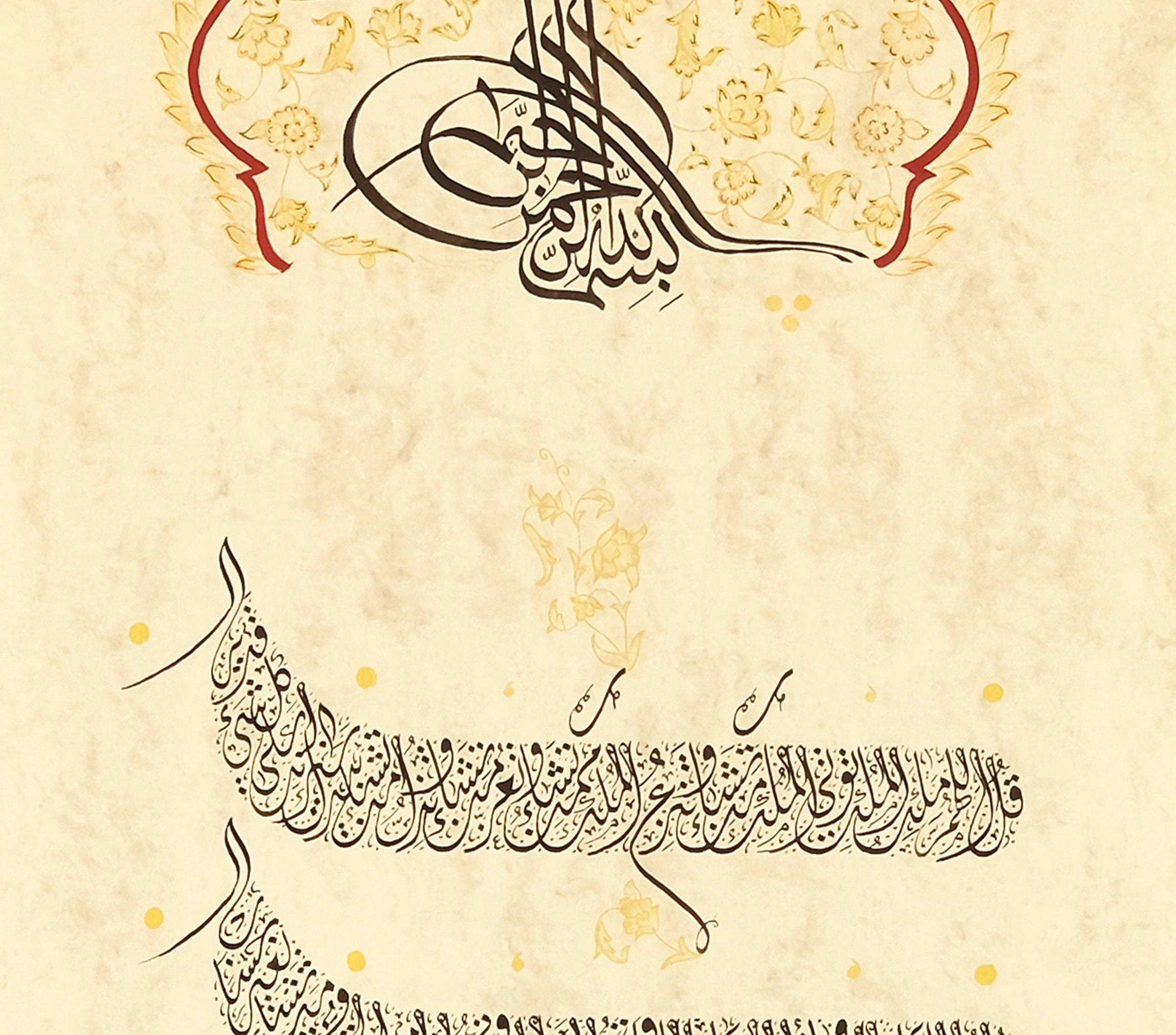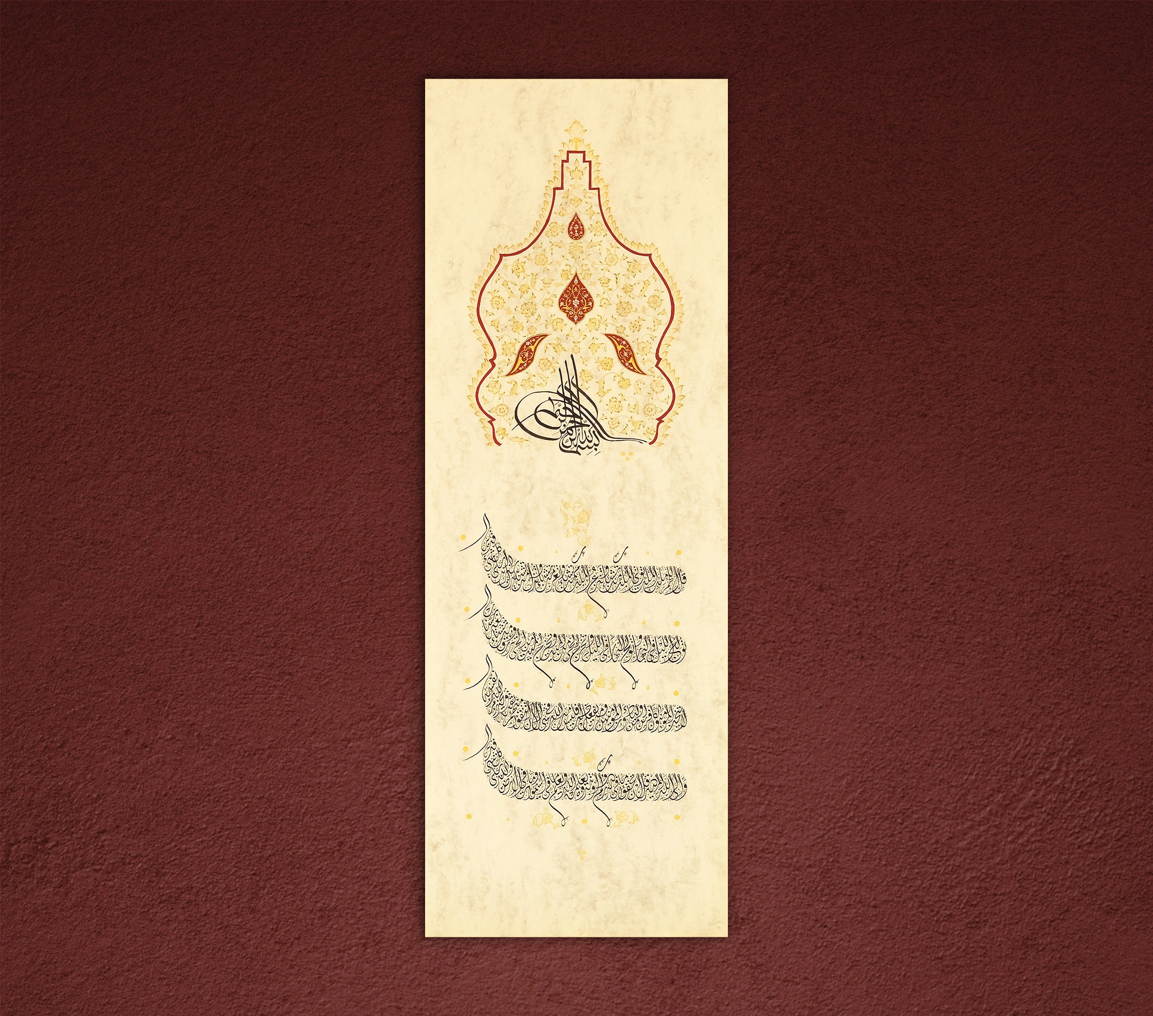 The design is crafted on natural handmade paper that is treated before writing called "ahar". Accentuating the antique look with the floral embroideries of the vintage Islamic art is eye catching. With it, you can bring a dynamic spiritual touch into your home while making a powerful statement about your faith.