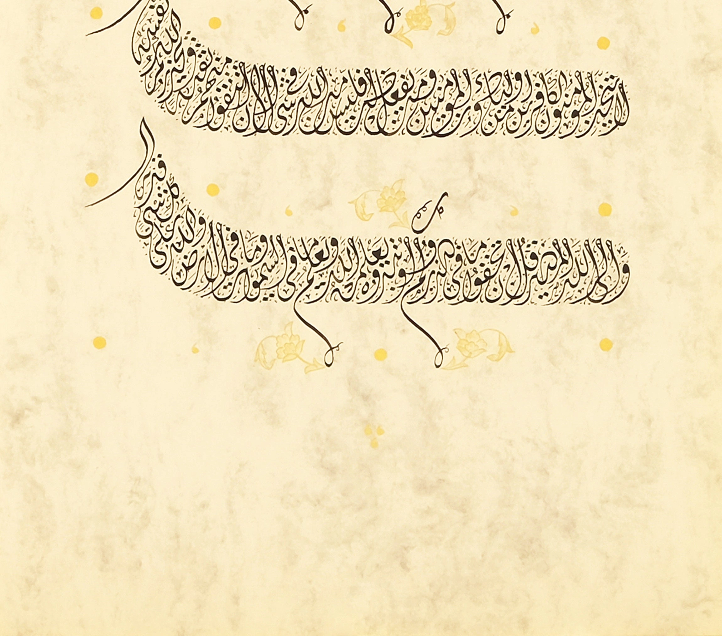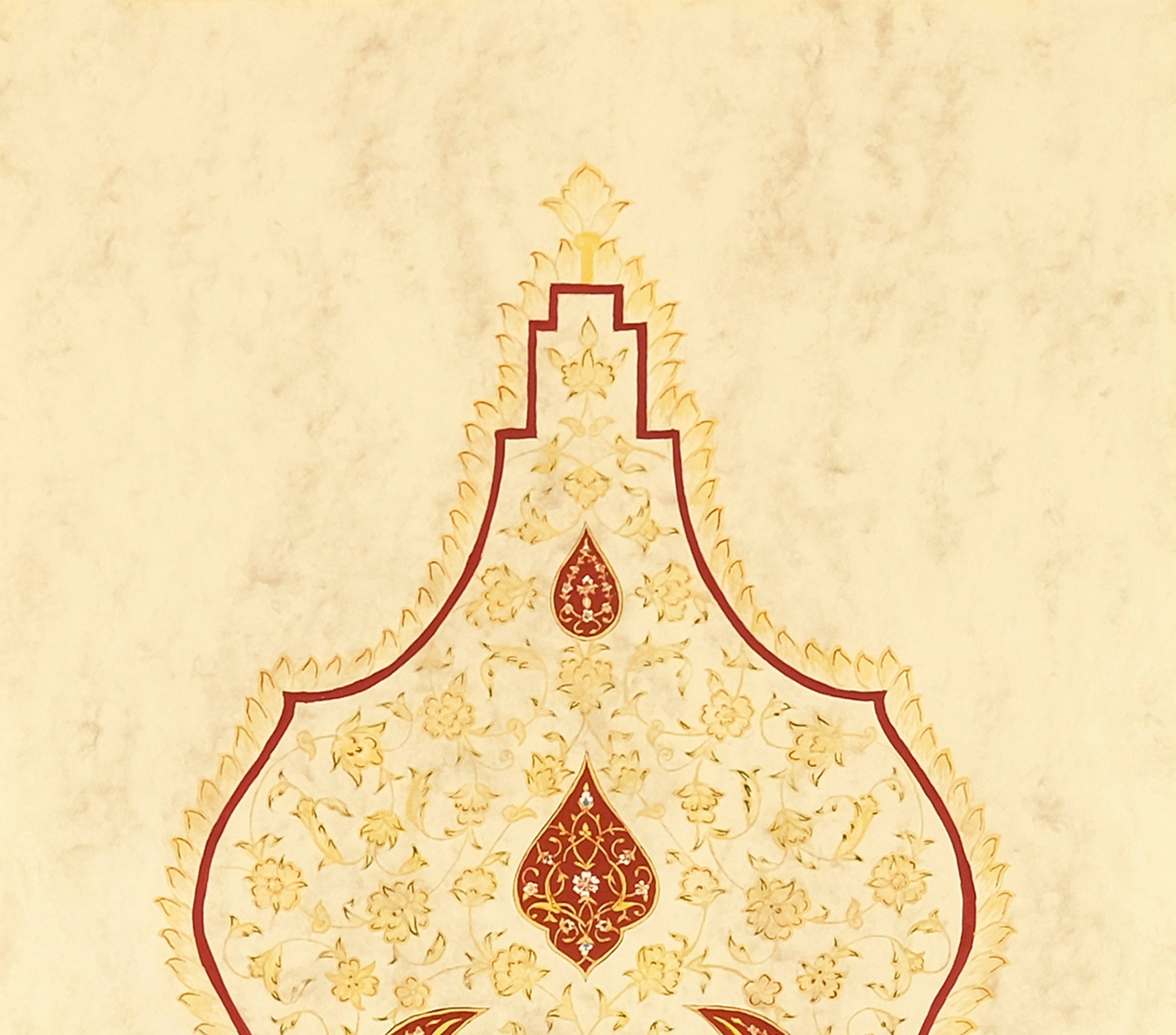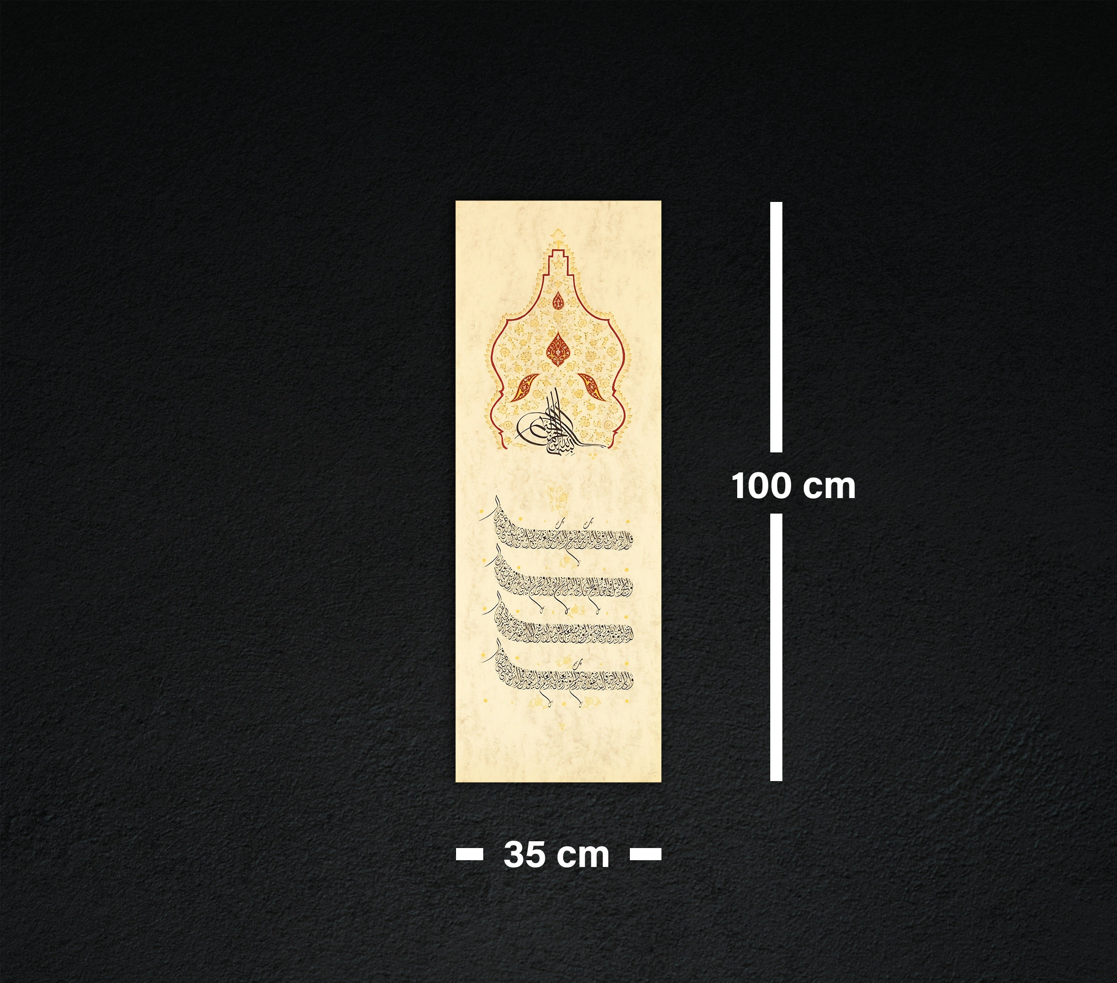 The design is crafted on natural handmade paper that is treated before writing called "ahar". Accentuating the antique look with the floral embroideries of the vintage Islamic art is eye catching. With it, you can bring a dynamic spiritual touch into your home while making a powerful statement about your faith.